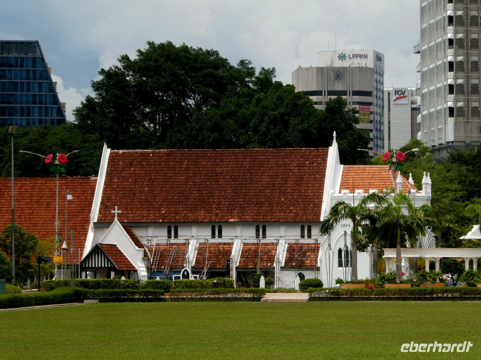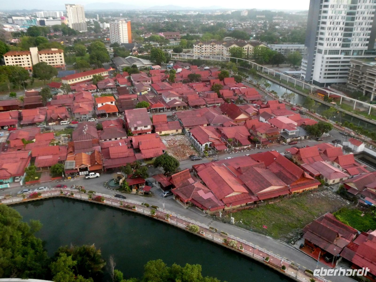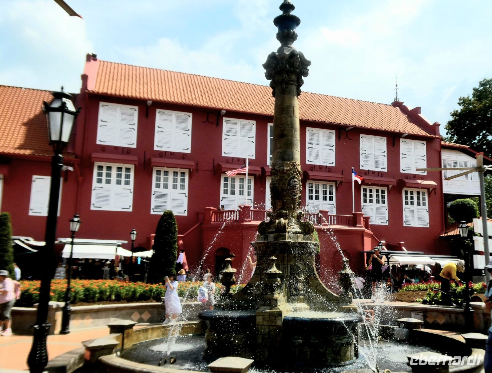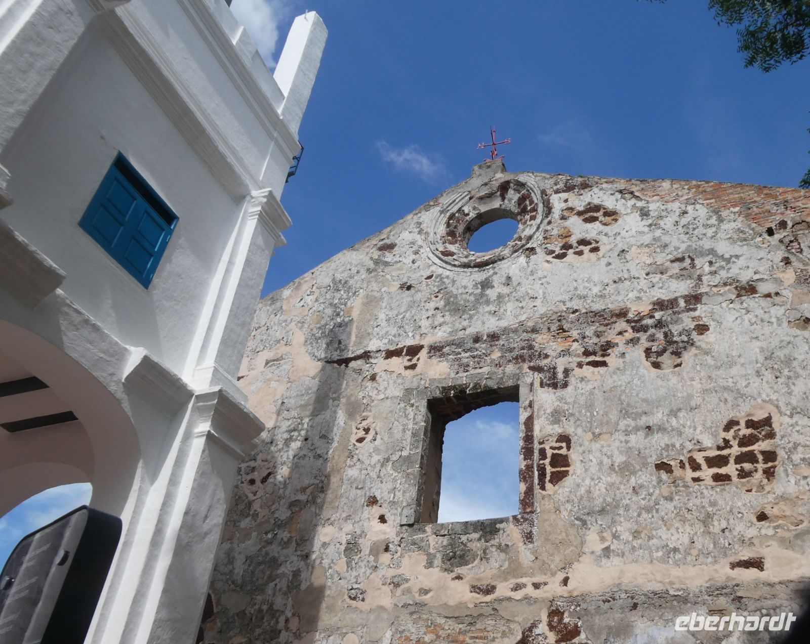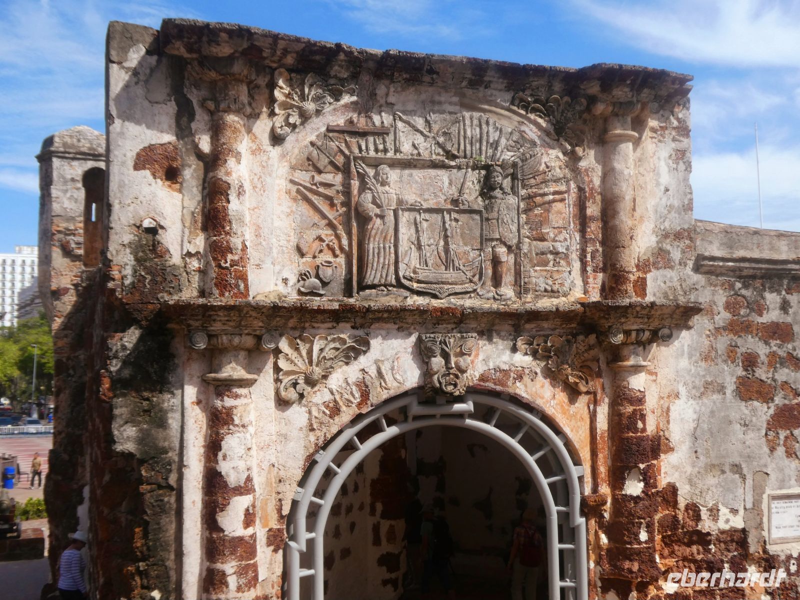 Der Stadtteil hier ist eine bunte Mischung aus den hier allerorts zu findenden Shop-Hauses, in denen Handel getrieben und gelebt wurde. Wir besuchen den sog. "Roten Platz" dessen Gebäude in einem speziellen roten Farbton gestrichen sind. Der Platz fällt als erstes auf wenn man die Brücke des Melaka-Rivers überquert hat. Zahlreiche Fahrradrikschas mit Kunden kommen uns entgegen. Wir besuchen die Christ Church, eine protestantische Kirche die von den Holländern errichtet und später als anglikanische Kirche weitergeführt wurde. Wir steigen den St.Paul's Hügel hinauf zur gleichnamigen von den Portugiesen errichtete Kirche, die nur noch als Ruine überlebt hat. An der Vorderseite der Kirche befindet sich die "Porta de Santiago", die als Rest der einstigen portugiesischen Festung erhalten ist. Man sieht hier freigelegte Grundmauern der einstigen Festung, die nach Übernahme durch die Holländer restauriert aber dann von den Briten zerstört wurde.