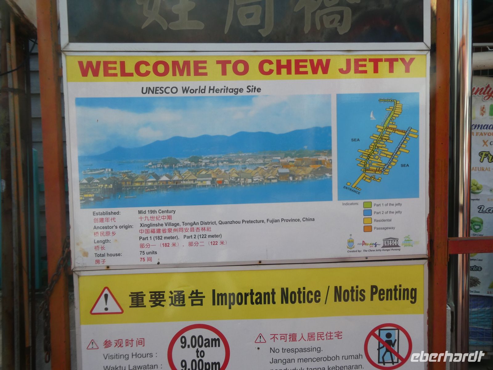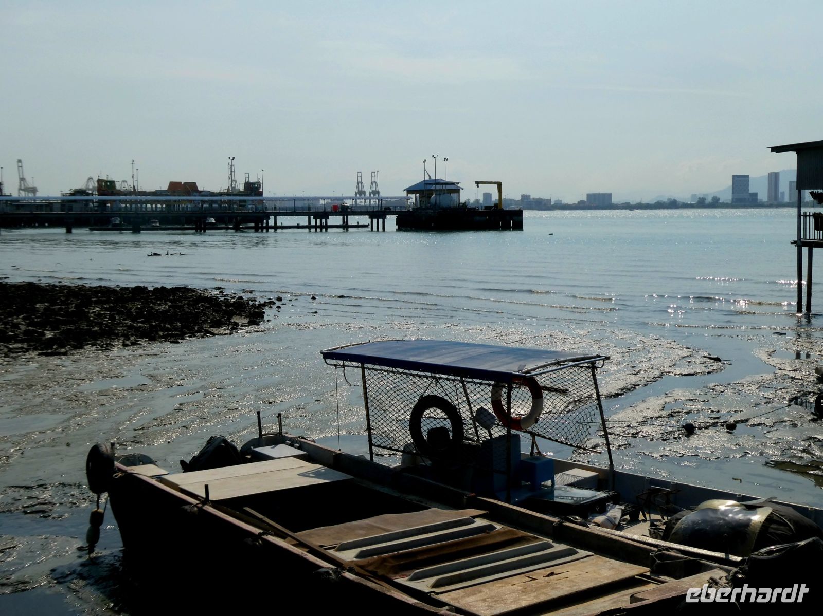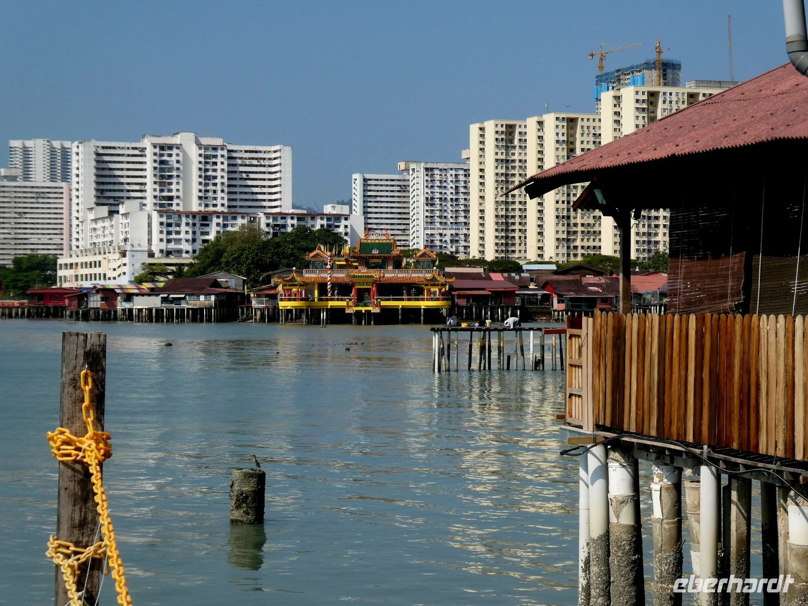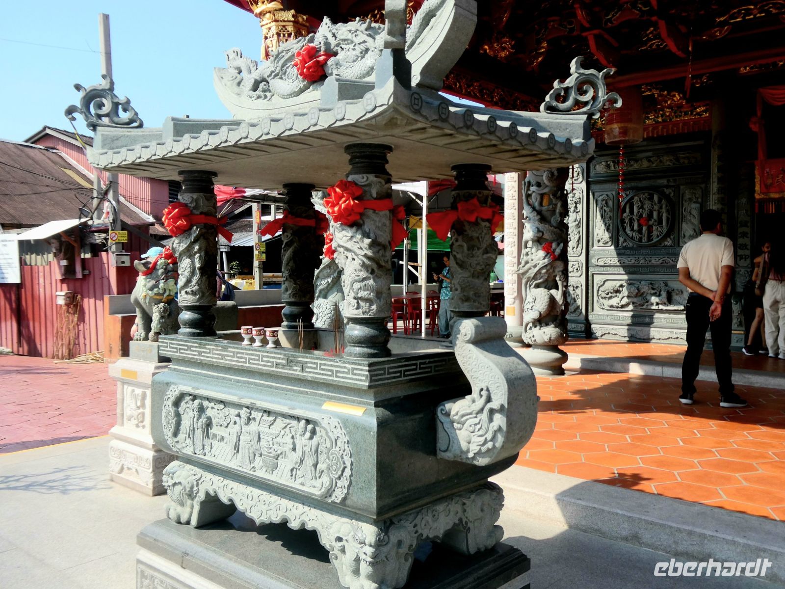 Weiter geht es zum Distrikt Chew Pier wo Menschen in Pfahlbauten leben. Das Gebiet ist geschützt und die Bewohner verdienen durch ein Geschäft auf ihrem Grundstück ein wenig für ihren Lebensunterhalt dazu. Der Wasserstand schwankt durch die Gezeiten bis zu ca. 1,50 Metern. Ein großer Tempel steht am Eingang. Wir laufen bis zum Ende wo natürlich auch eine Opferstelle zu finden ist. Früher lebte man hier ausschließlich vom Fischfang und die Menschen waren ärmer als heute.