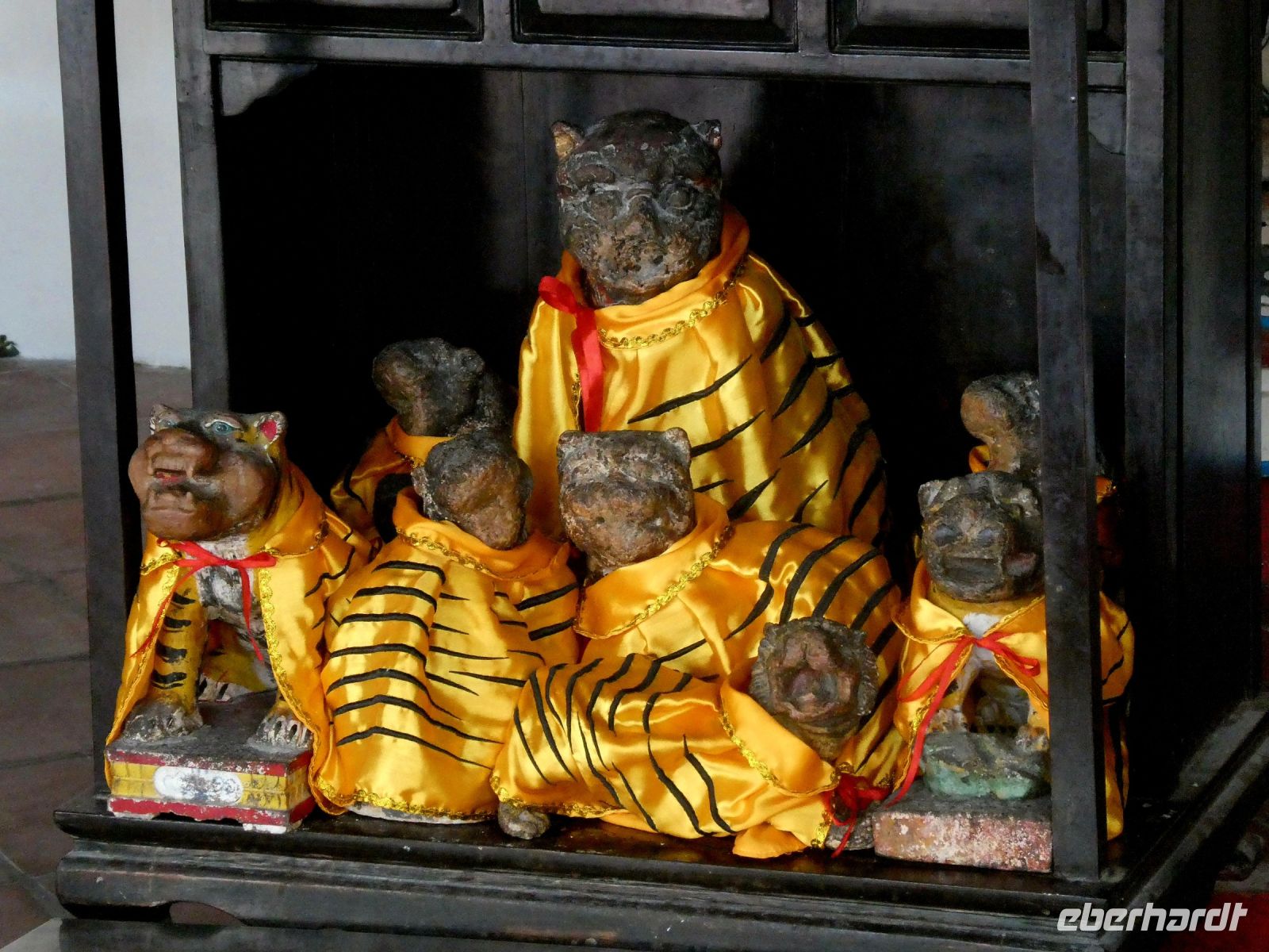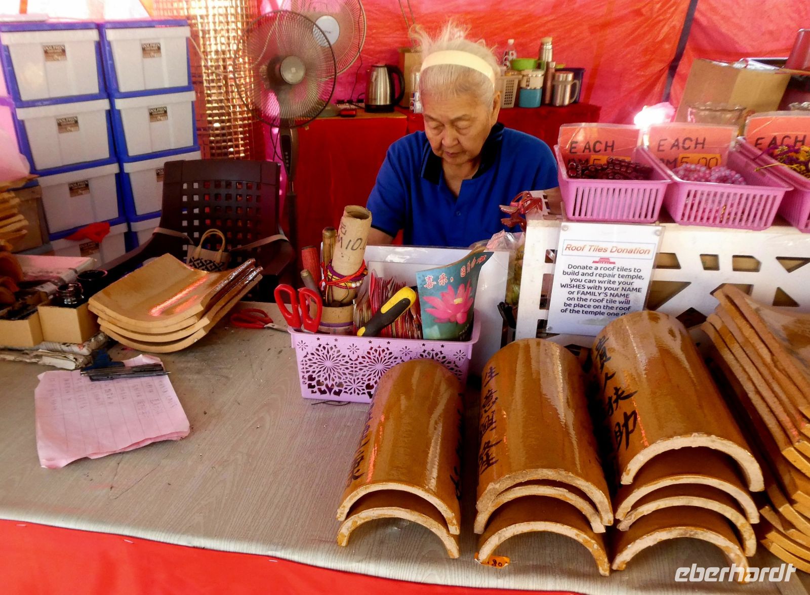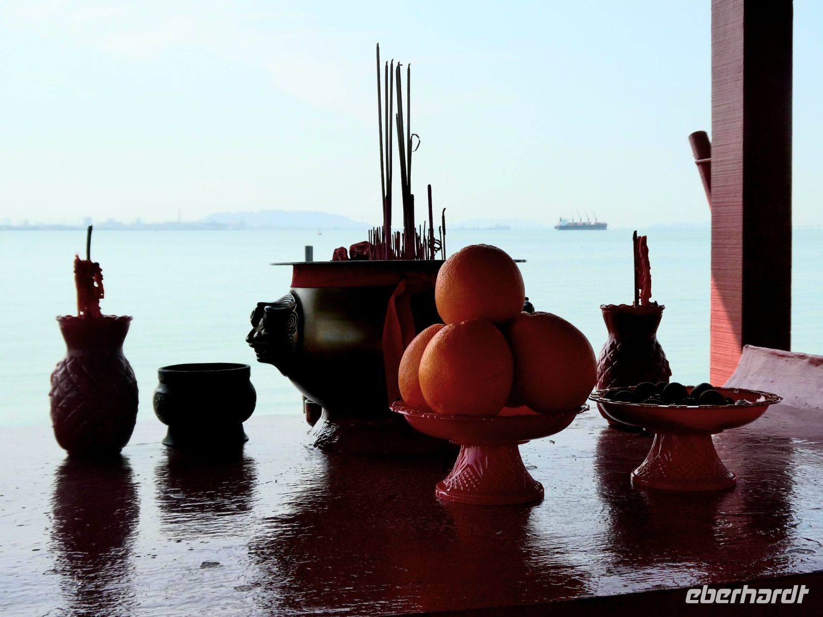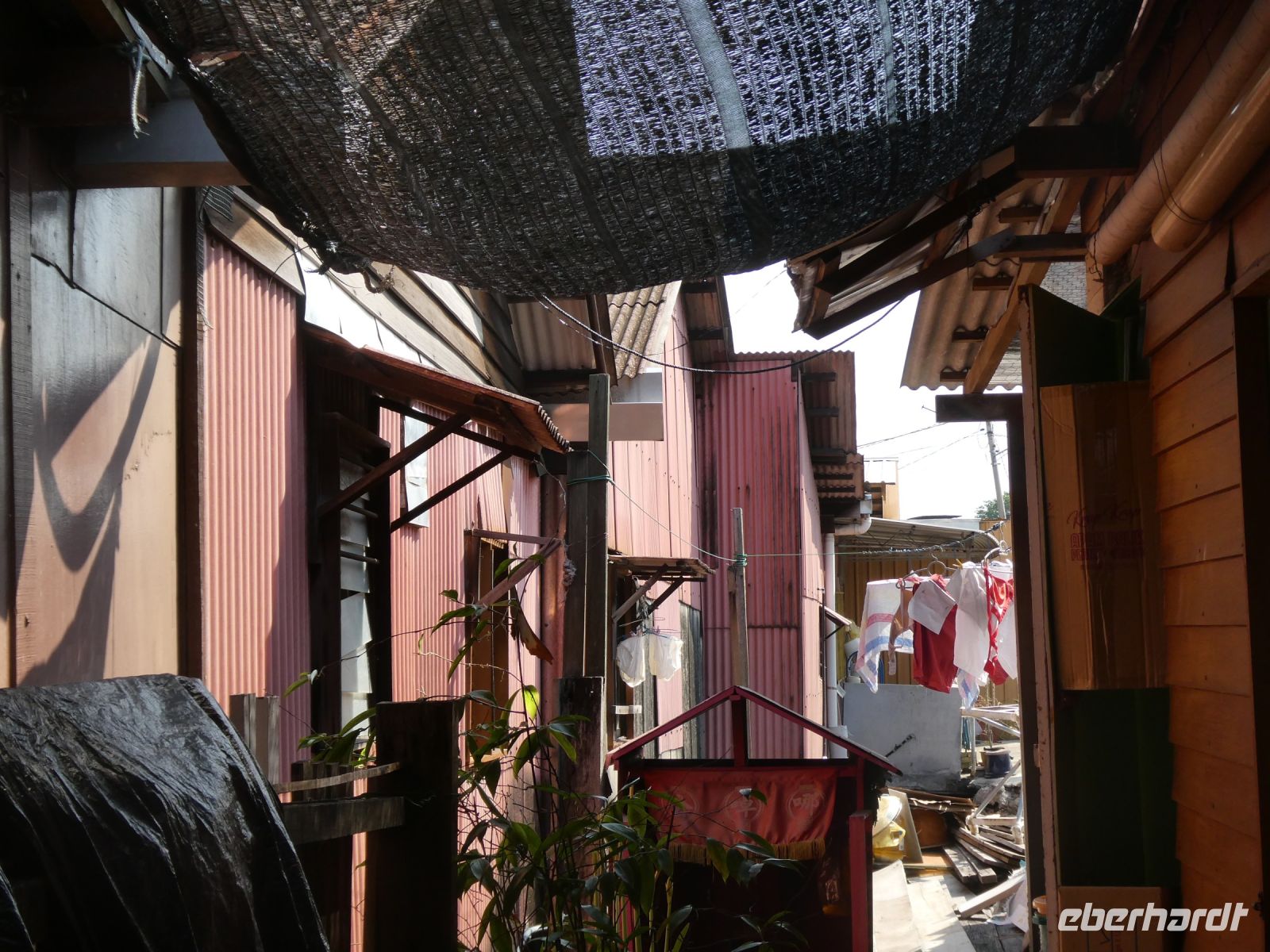 Weiter geht es zum Distrikt Chew Pier wo Menschen in Pfahlbauten leben. Das Gebiet ist geschützt und die Bewohner verdienen durch ein Geschäft auf ihrem Grundstück ein wenig für ihren Lebensunterhalt dazu. Der Wasserstand schwankt durch die Gezeiten bis zu ca. 1,50 Metern. Ein großer Tempel steht am Eingang. Wir laufen bis zum Ende wo natürlich auch eine Opferstelle zu finden ist. Früher lebte man hier ausschließlich vom Fischfang und die Menschen waren ärmer als heute.