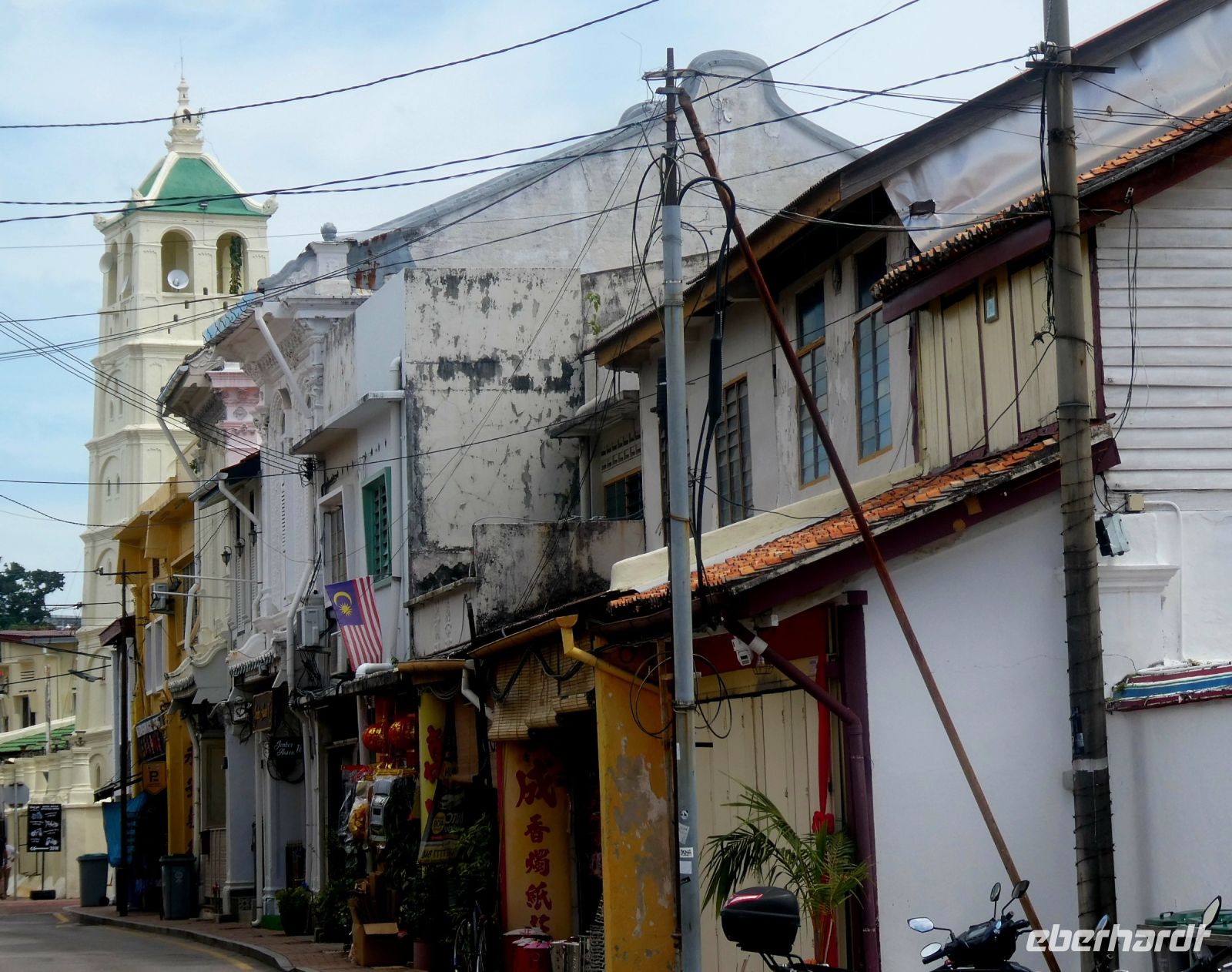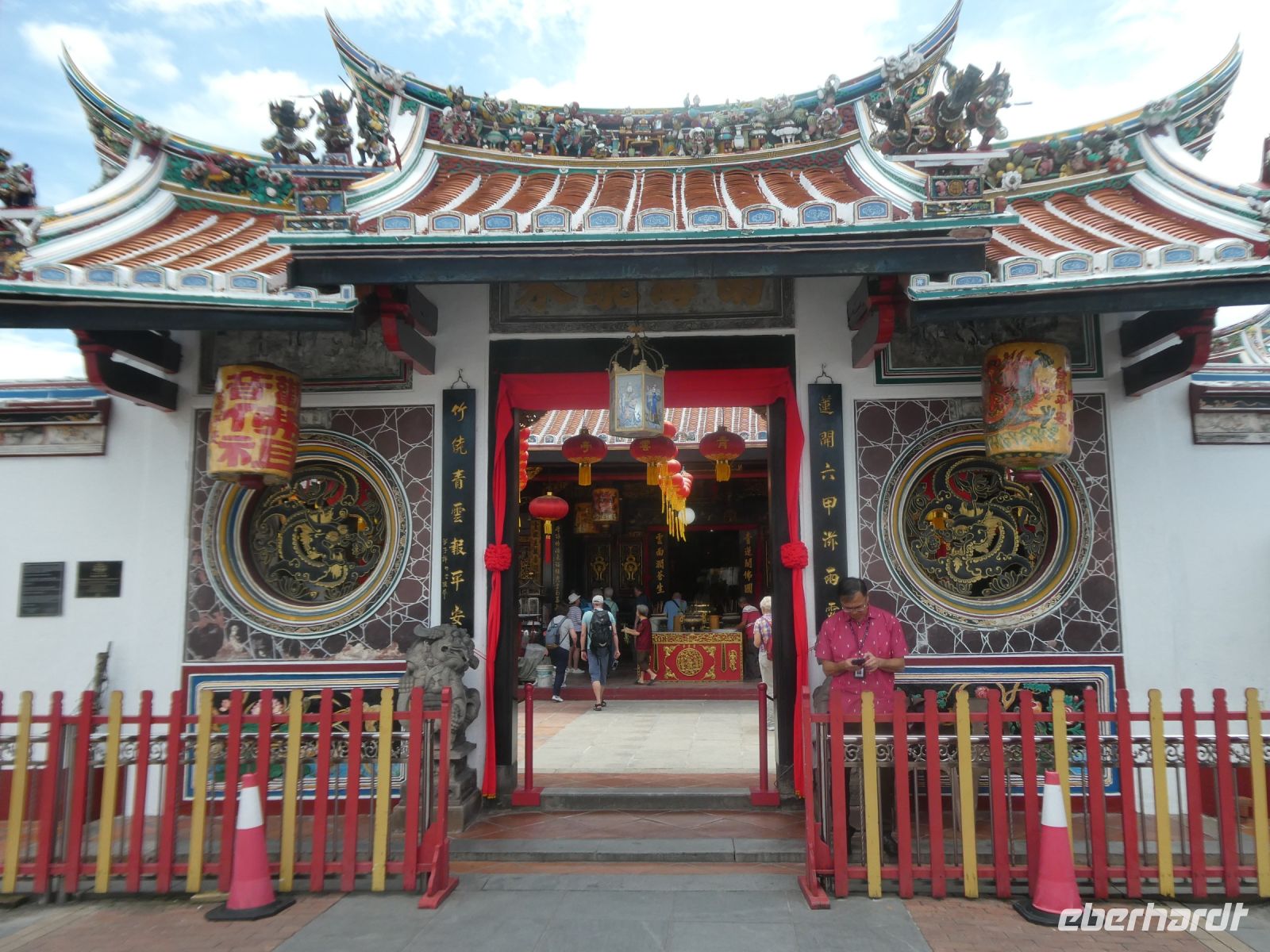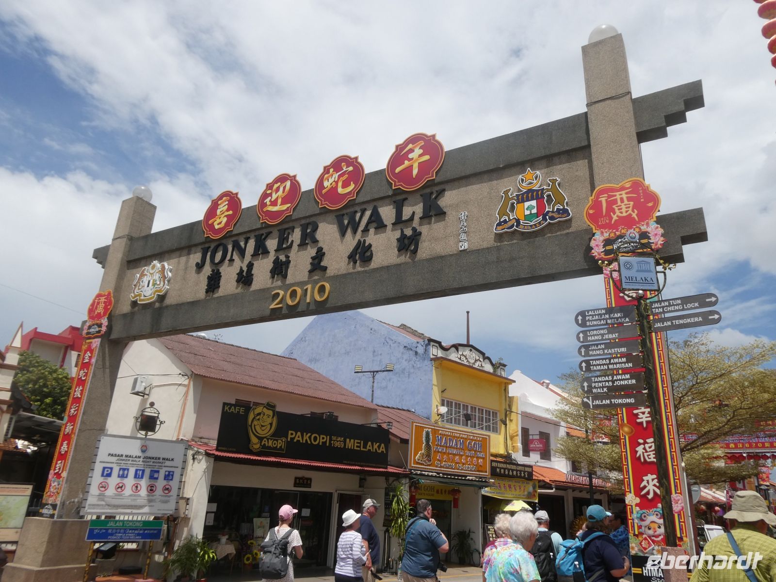 Wir werden an einem Ende der bekannten Flaniermeile, der Jonker-Street von unserem Fahrer abgesetzt und beginnen unsere Besichtigung mit einer Erkundung dieser lebhaften Straße. Viele chinesische Geschäfte befinden sich heute noch immer hier, wurde doch der Handel zu bestimmten Zeiten von chinesischen Kaufleuten dominiert. Später kamen dann in Folge die Portugiesen, die Niederländer und die Briten. Alle wollten von dem lukrativen Kuchen etwas abbekommen. So finden wir in Malakka auch ihre Spuren. Wir besuchen den "Cheng Hoon Teng Tempel" ein chinesischer Tempel aus dem 17.Jahrhundert, in dem 3 verschiedene Glaubensrichtungen ihren religiösen Bedürfnissen nachkommen: die Buddhisten, die Taoisten und die Anhänger der Lehre des Konfuzius. Enstprechend bunt und vielfältig ist die Ausstattung.