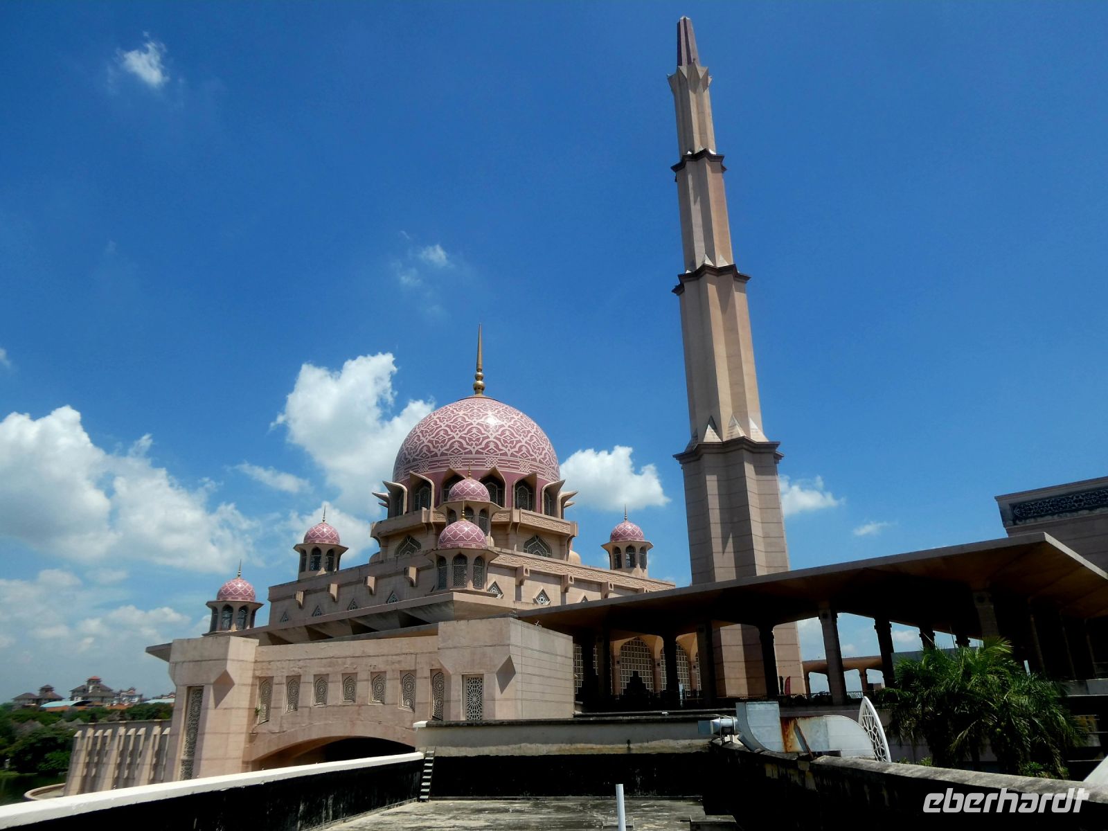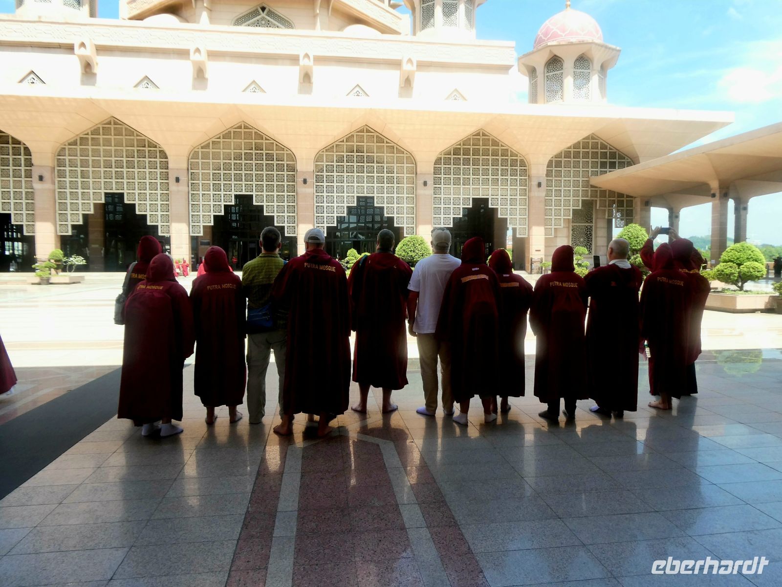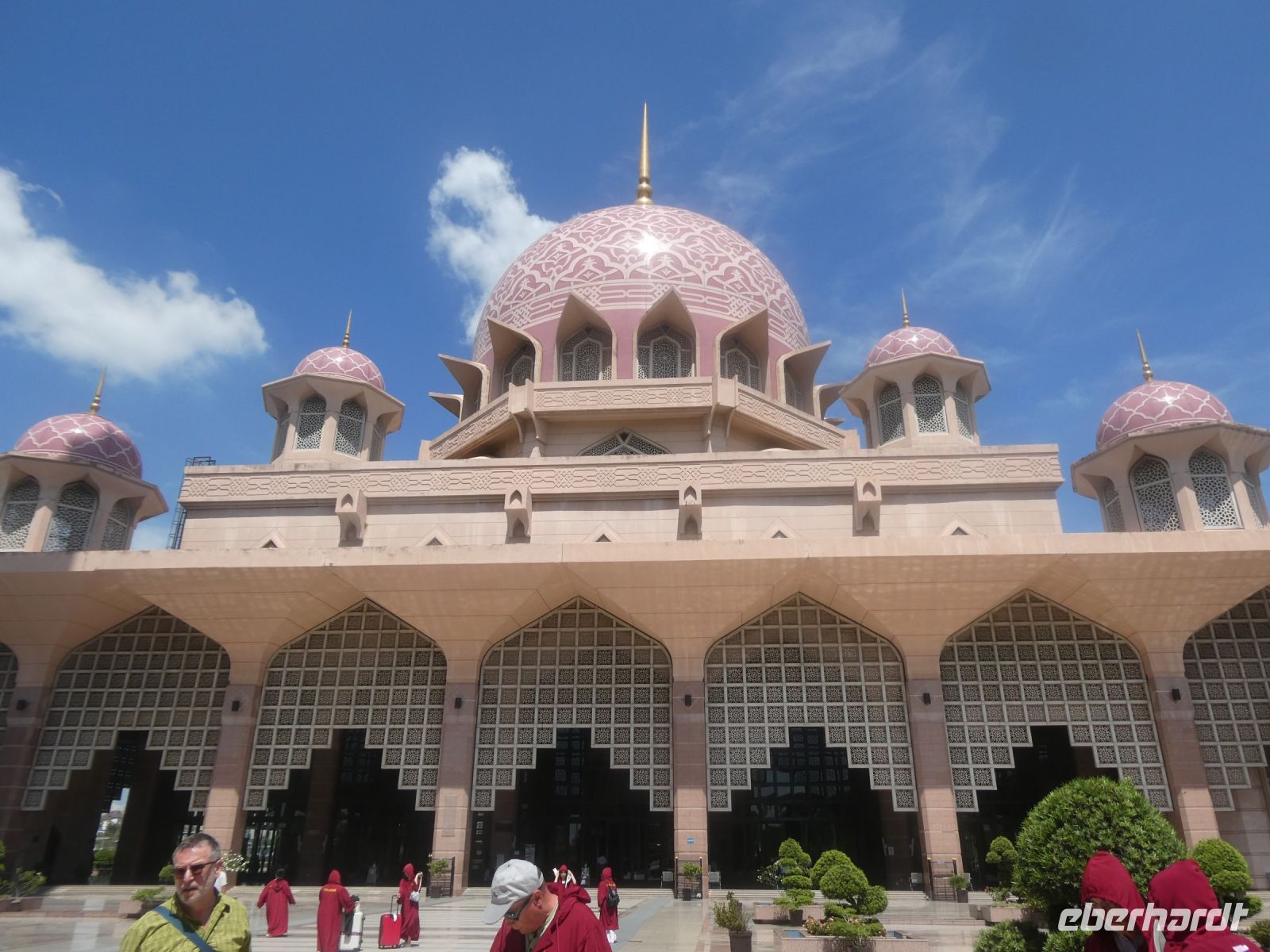 Unser erstes Ziel heute ist Putrajaya, das moderne auf dem Reissbrett entstandene Verwaltungszentrum Malaysias. Dort befinden sich alle Regierungsgebäude und Bothaften. Noch ist die Temperatur erträglich und die Sonne brennt noch nicht so heiß. Schon beim Hineinfahren in die Stadt fällt die Sauberkeit und die Modernität auf, oder sollte es Sterilität heißen? Es ist geschmackssache. Richard erzählt, dass hier nicht so viele wohnen wollen, da der Hausbesitz mit vielen Auflagen verbunden ist. Unser Ziel ist die "Putra Moschee" von Putrajaya, ein Bau im persisch islamischen Stil aus rosa Granit und mit einem 116 m hohem Minarett.