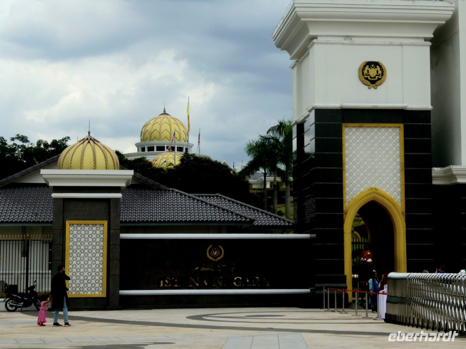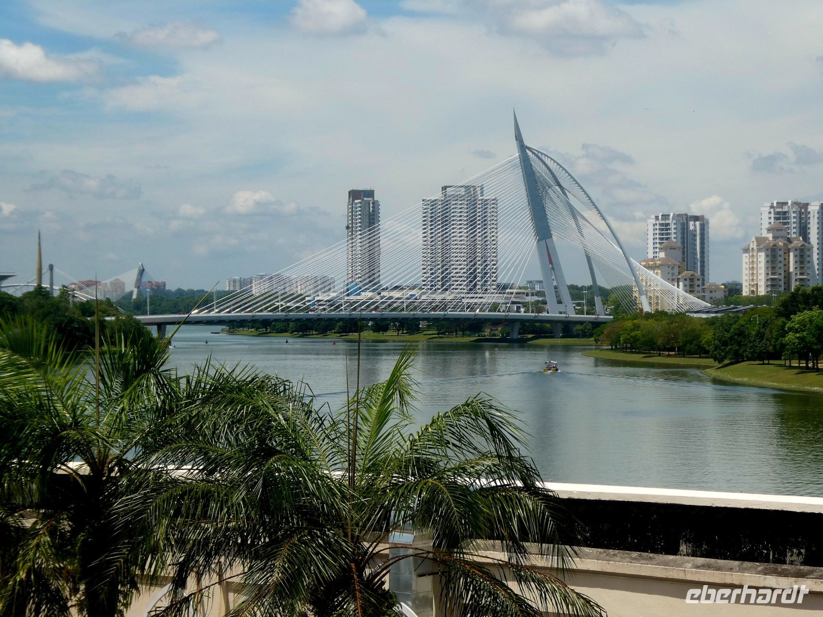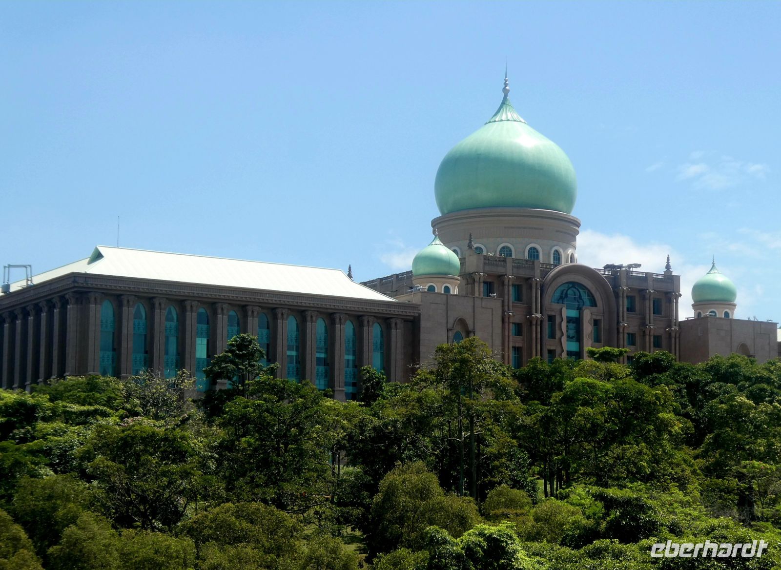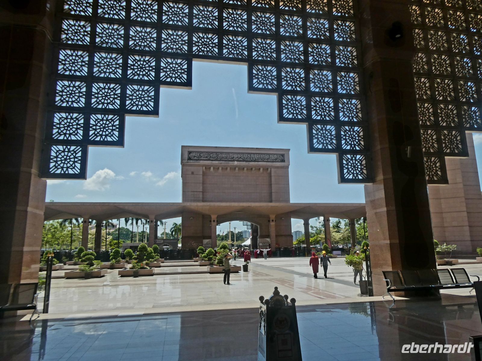Unser erstes Ziel heute ist Putrajaya, das moderne auf dem Reissbrett entstandene Verwaltungszentrum Malaysias. Dort befinden sich alle Regierungsgebäude und Bothaften. Noch ist die Temperatur erträglich und die Sonne brennt noch nicht so heiß. Schon beim Hineinfahren in die Stadt fällt die Sauberkeit und die Modernität auf, oder sollte es Sterilität heißen? Es ist geschmackssache. Richard erzählt, dass hier nicht so viele wohnen wollen, da der Hausbesitz mit vielen Auflagen verbunden ist. Unser Ziel ist die "Putra Moschee" von Putrajaya, ein Bau im persisch islamischen Stil aus rosa Granit und mit einem 116 m hohem Minarett.