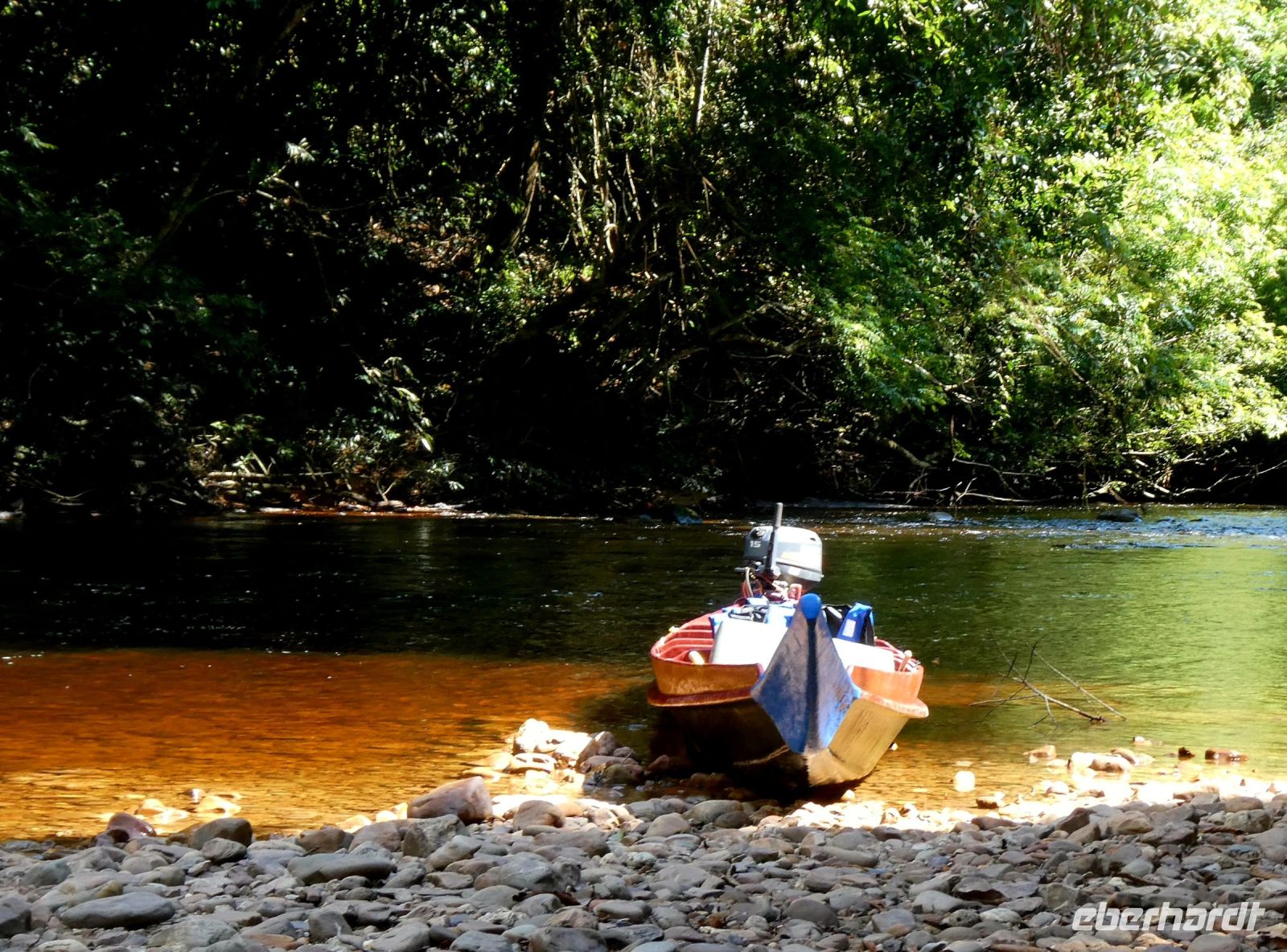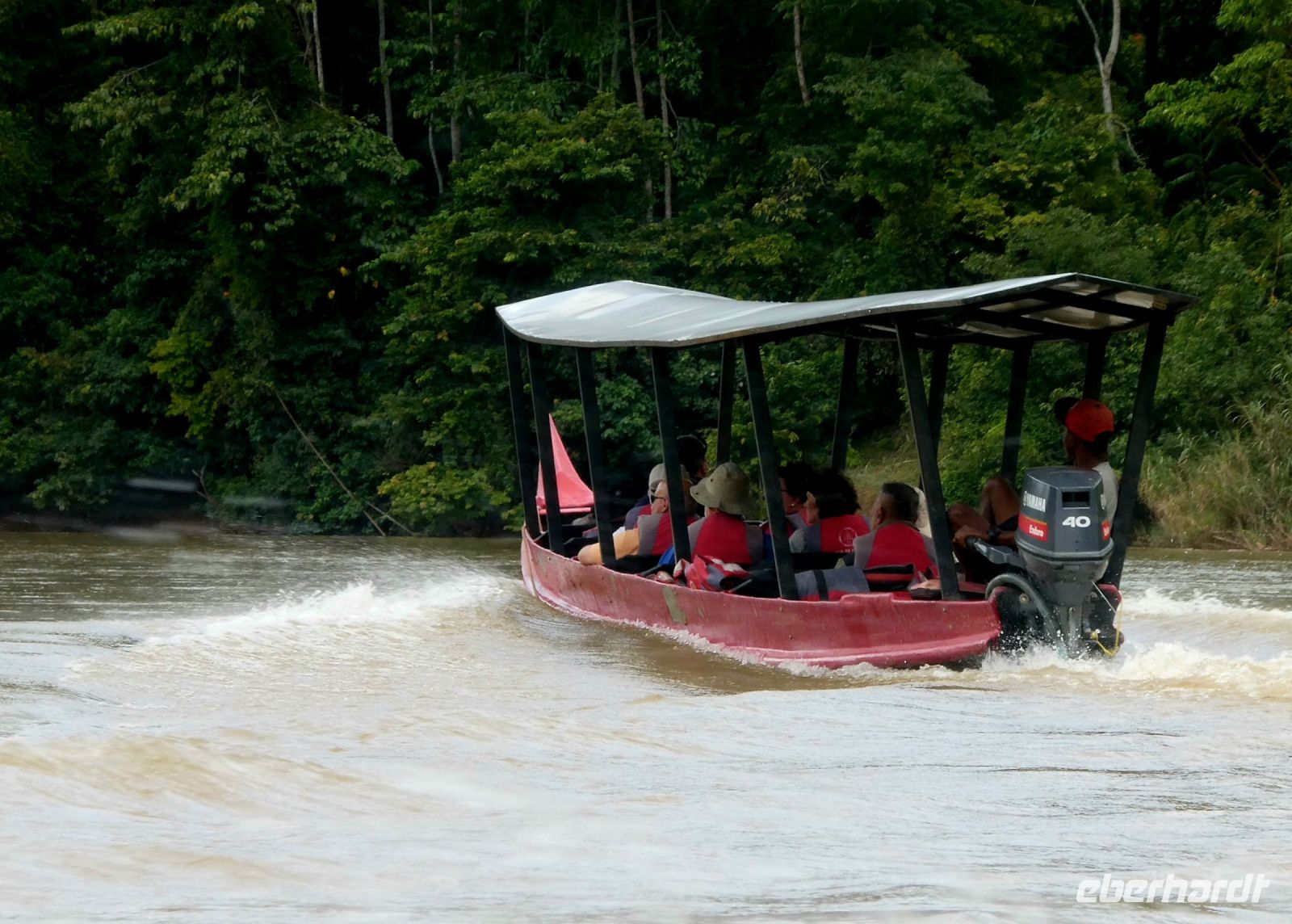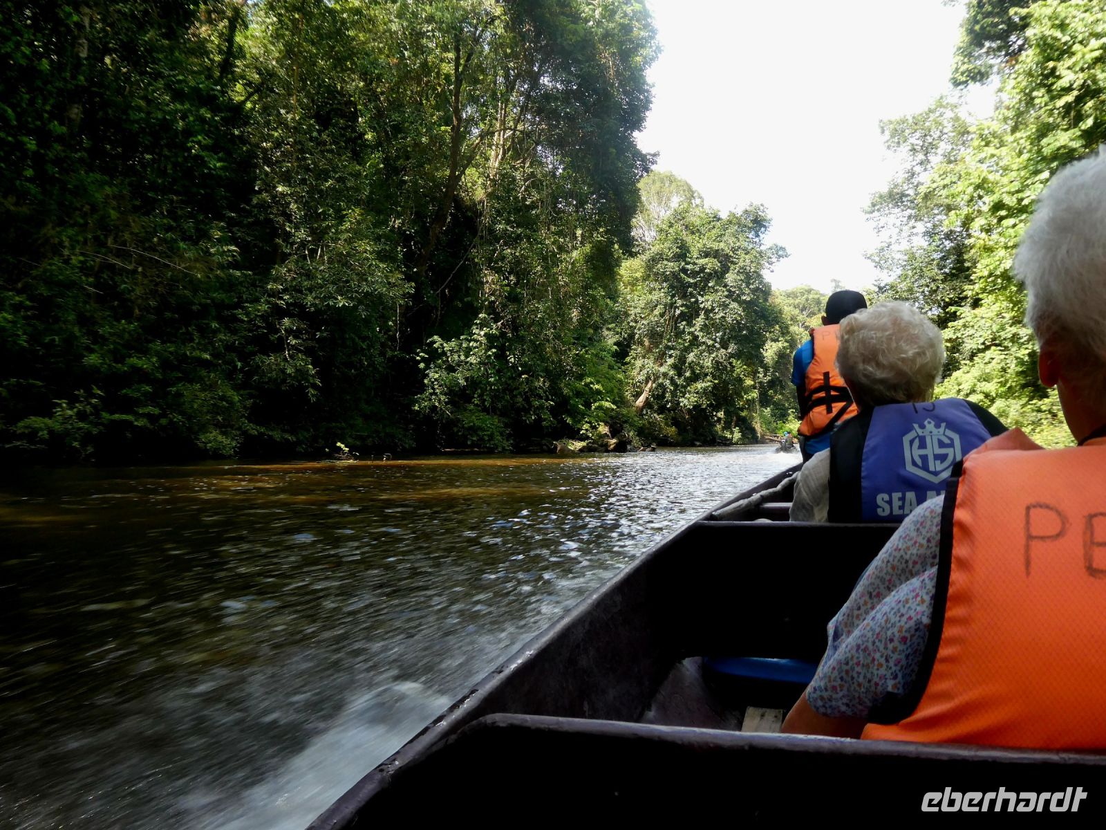 Nach dem Mittagessen beginnt ein weiteres Regenwaldabenteuer. Wir fahren in insgesamt 4 Holzbooten, die diesmal nicht überdacht sind und ein wenig kleiner als gestern einen Seitenarm des Flusses hinauf gegen die Strömung, also mit Motorkraft. Die Urwaldriesen rauschen an uns vorbei. An einem besonders betagtem Urwaldbaum halten wir für eine Fotopause. Er soll 300 Jahre alt sein. Weiter geht es und wir passieren sogar einige Stellen mit Weisswasser. Unsere Bootsführer meistern diese Stellen souverän und nach einer Stunde kommen wir an unserem Ziel an.