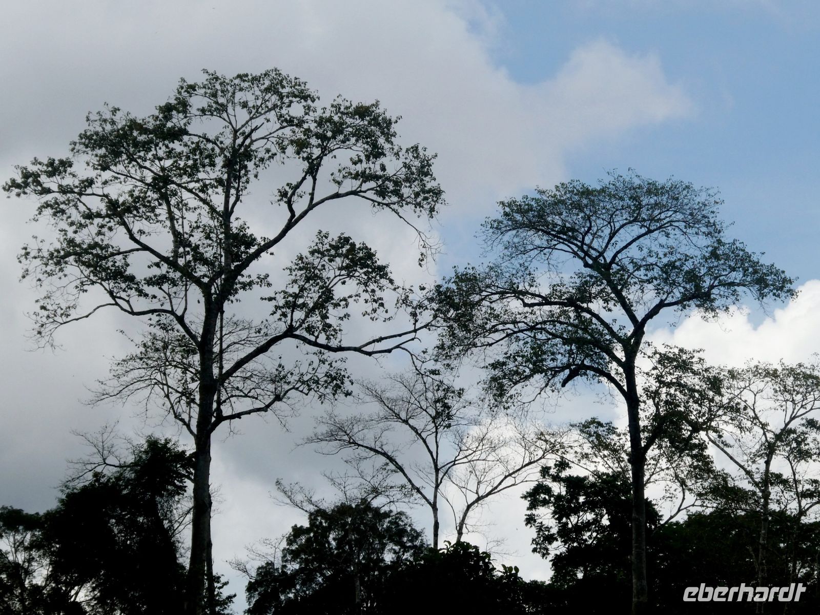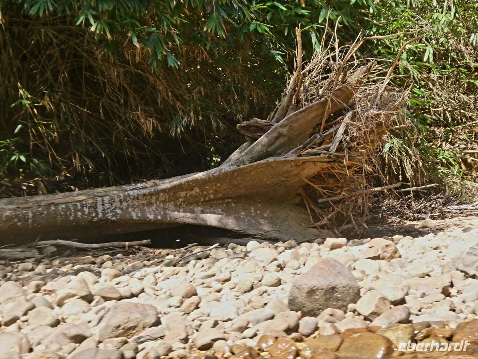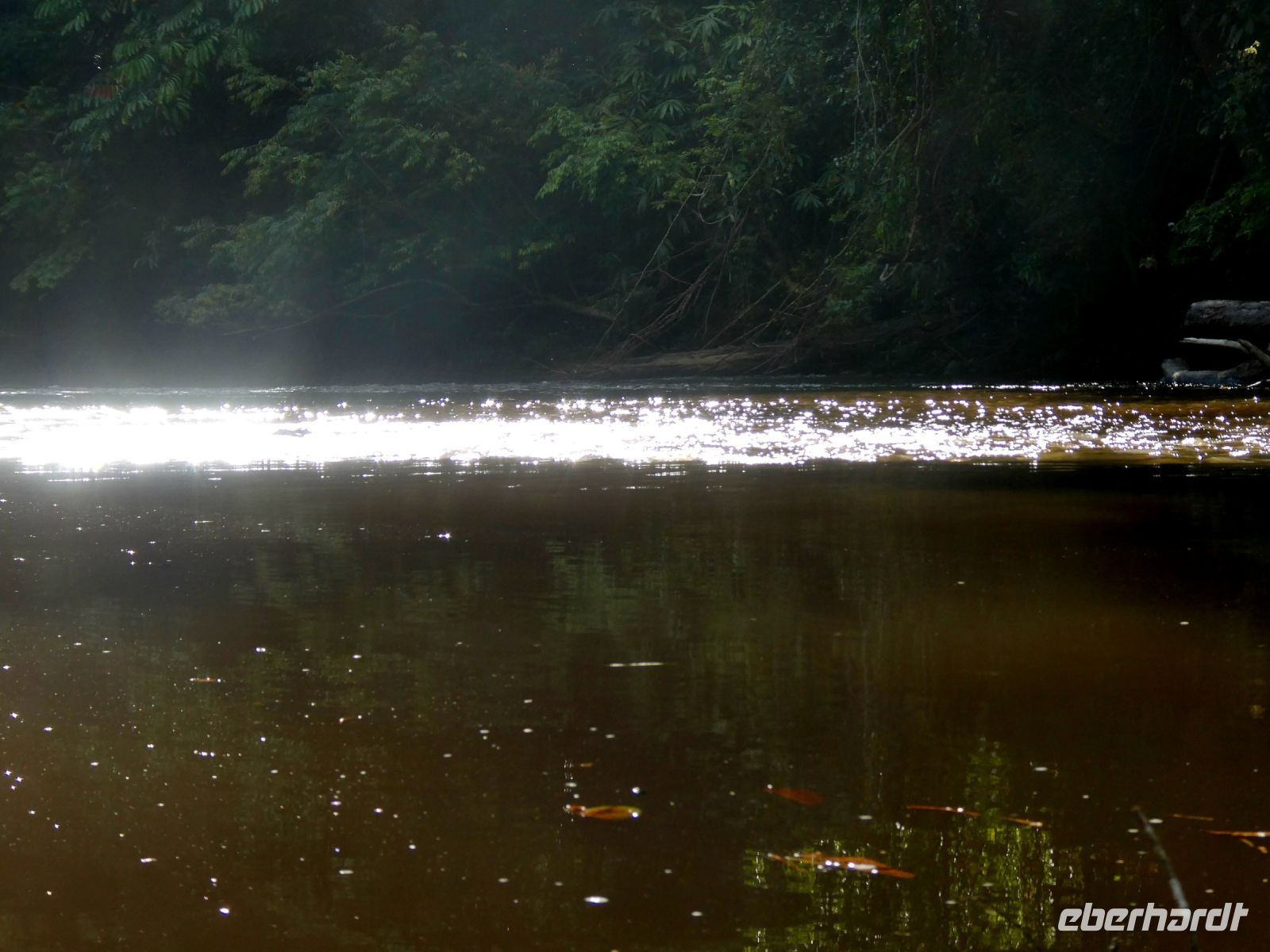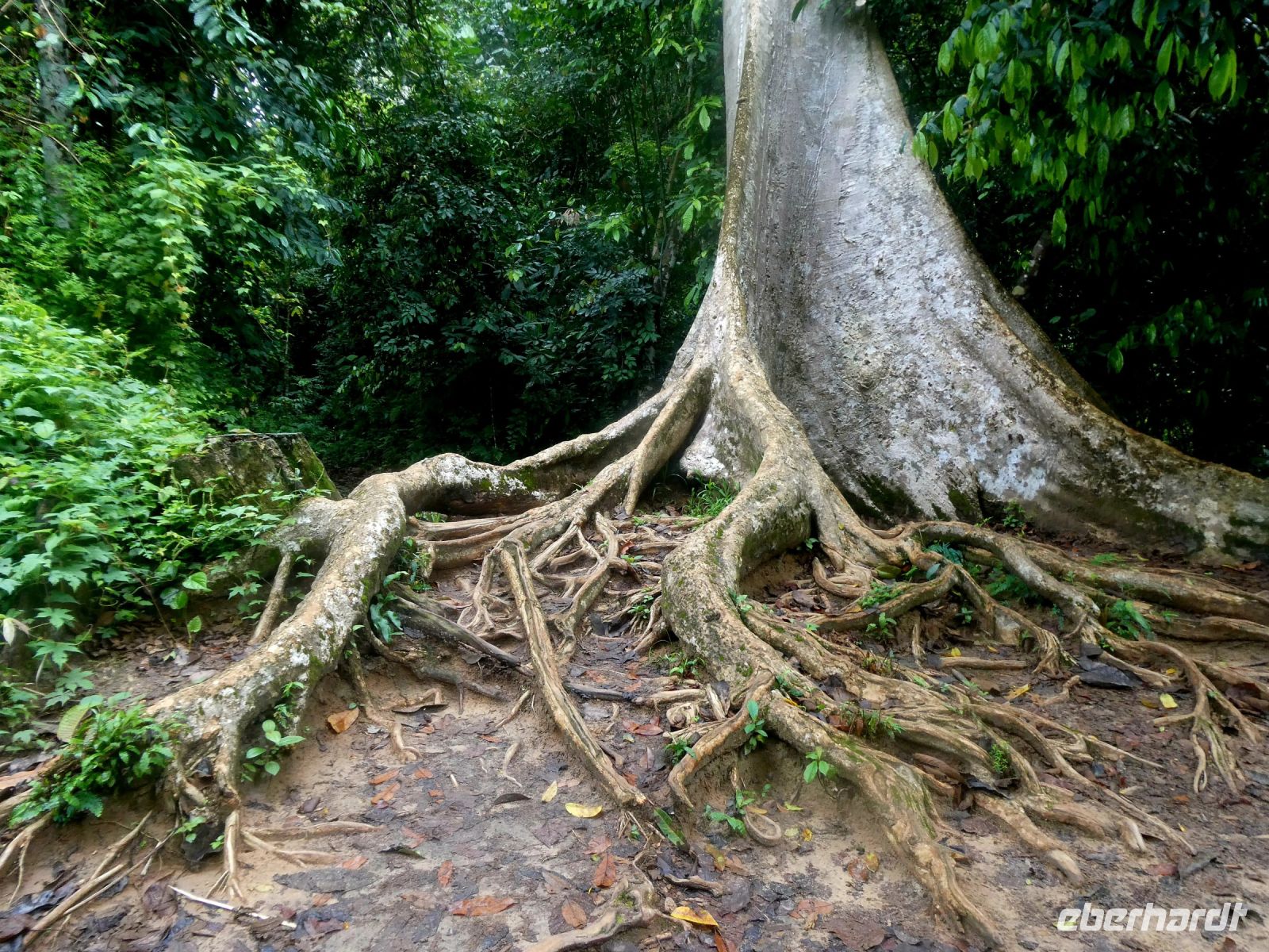 Nach dem Mittagessen beginnt ein weiteres Regenwaldabenteuer. Wir fahren in insgesamt 4 Holzbooten, die diesmal nicht überdacht sind und ein wenig kleiner als gestern einen Seitenarm des Flusses hinauf gegen die Strömung, also mit Motorkraft. Die Urwaldriesen rauschen an uns vorbei. An einem besonders betagtem Urwaldbaum halten wir für eine Fotopause. Er soll 300 Jahre alt sein. Weiter geht es und wir passieren sogar einige Stellen mit Weisswasser. Unsere Bootsführer meistern diese Stellen souverän und nach einer Stunde kommen wir an unserem Ziel an.