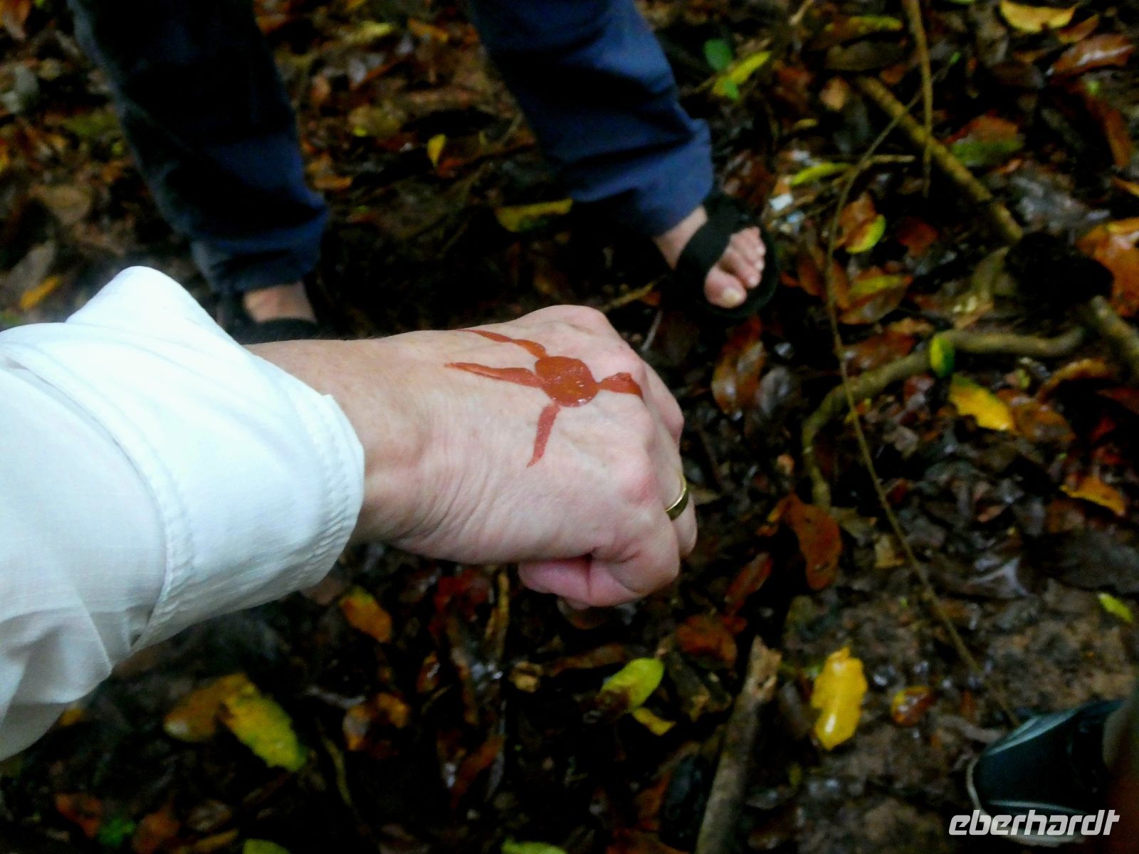 Ausgerüstet mit guten Schuhen und genügend Wasser starten wir mit unseren beiden Führern und unserem Reiseleiter Zul und der Reisebegleiterin Gina. Das Wetter ist heute besser. Es scheint sich sogar die Sonne blicken zu lassen. Nach einer Weile steigt der Weg stetig an mit auch steileren schweißtreibenden Passagen. Wir bekommen auch diesmal einige Geheimnisse des Dschungels erläutert, wie Blätter die als Sandpapier verwendet werden, Oker der als Schminke für die Frauen der Orang Asli oder als Insektenschutz dient.