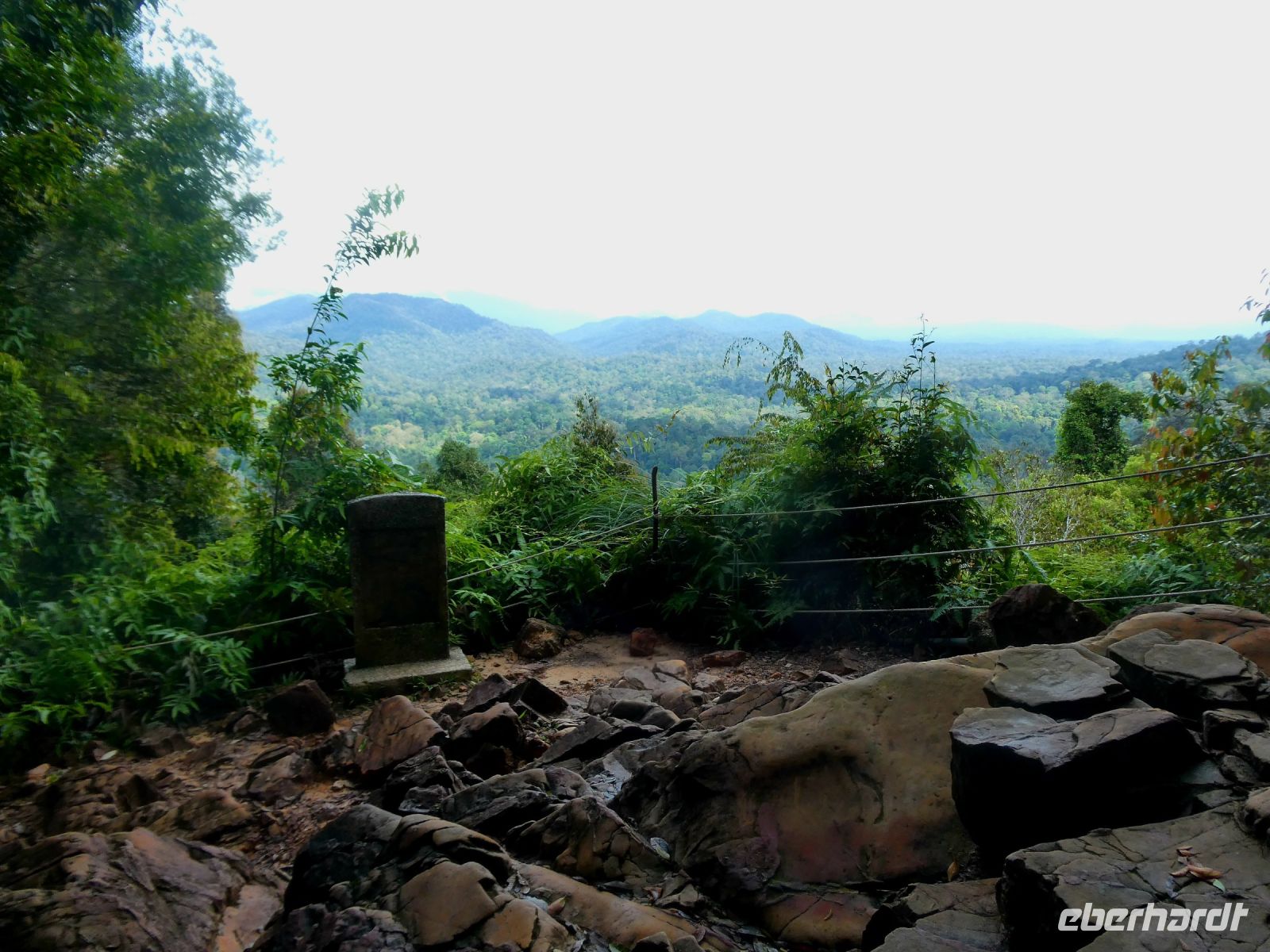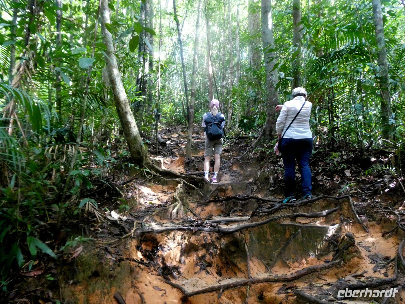 Nicht jedem von uns bekommt die hohe Luftfeuchtigkeit gepaart mit der Anstrengung. Und so verbleibt für den Restanstieg nur die Hälfte der Gruppe. Irgendwann endet der Treppenweg und wir steigen über Baumwurzeln auf einem ausgewaschenen Urwaldpfad nach oben. Wir erreichen zwei aufeinander folgende Aussichtspunkte, von denen wir die höchsten Gipfel der Berge sehen können.