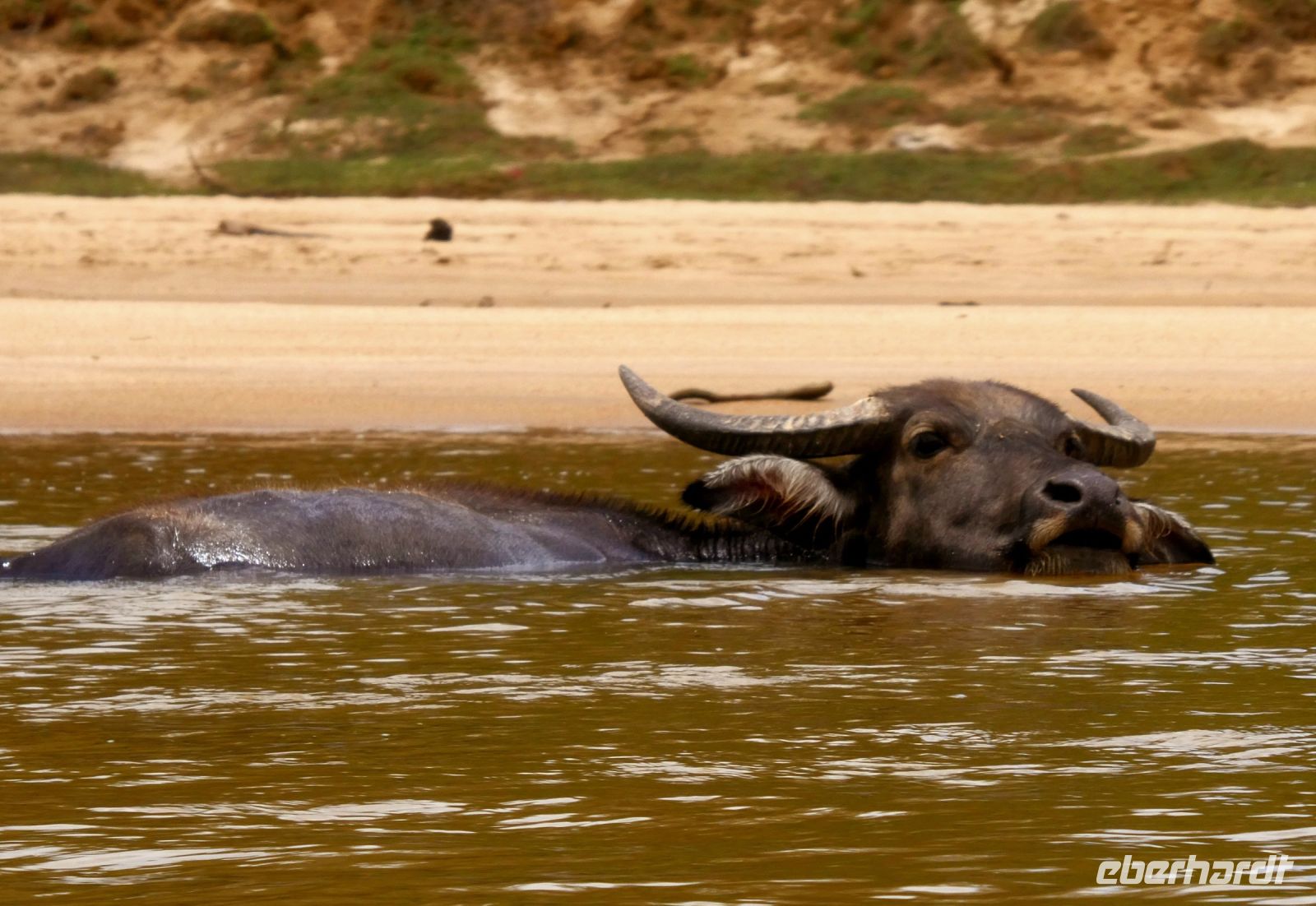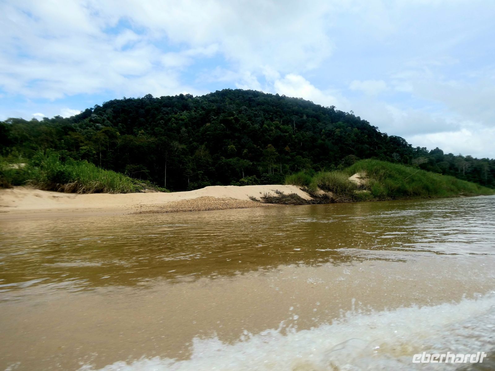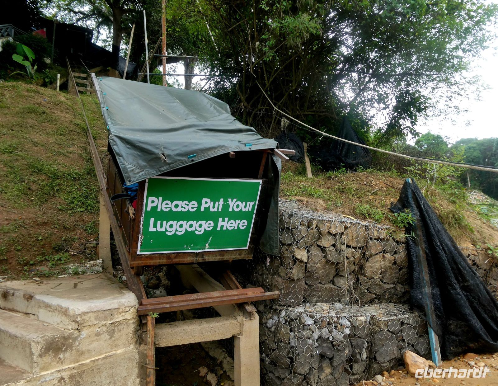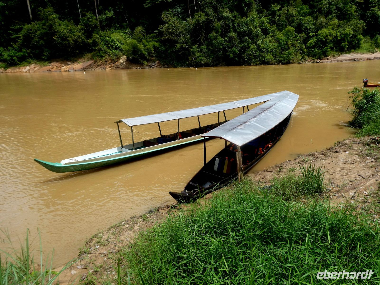 Unser Gepäck wird von helfenden jungen Männern zu den Booten gebracht, die uns an das andere Ufer bringen. Dort wartet unser Bus auf uns.