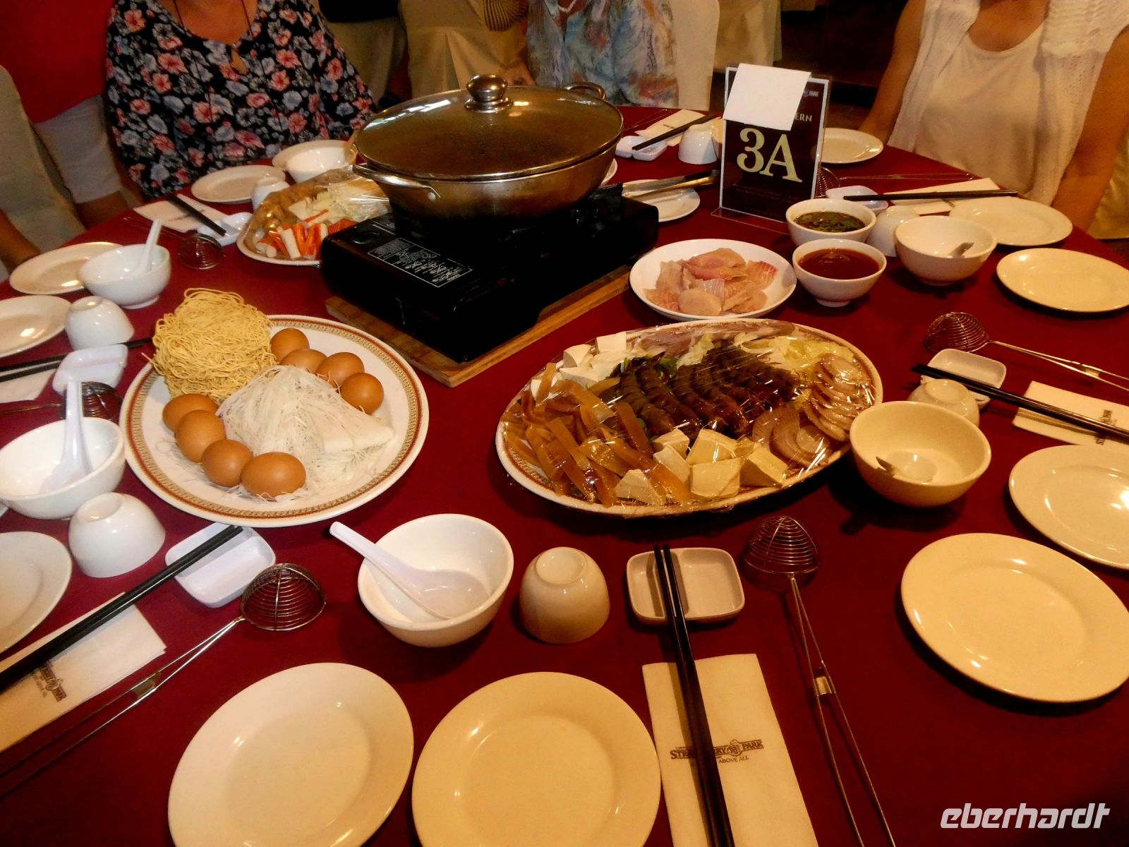 Wir dürfen selber den Kochlöffel bzw. die Stäbchen schwingen. Nach anfänglichem noch zögerlichem Kochverhalten entpuppen sich einige als wahre Kochenthusiasten. Fisch, Geflügel und Ei, andere Meerestiere, Kohl und Sprossen: rein in die Brühe. Dann wird mit einem kleinen Sieb geangelt. Der Tisch sieht hinterher entsprechend aus. Zur Belohnung bekommen wir anschließend doch noch unsere Scones mit Erdbeermarmelade und Sahne, was Zul im Hotel organisiert hat.