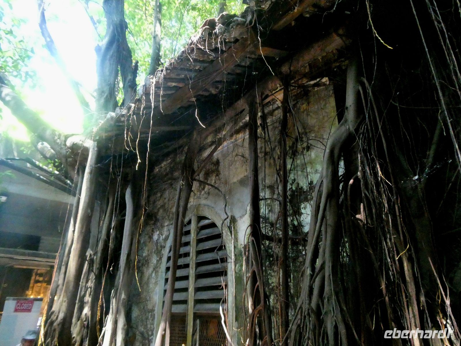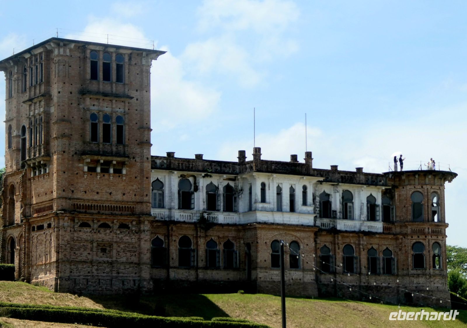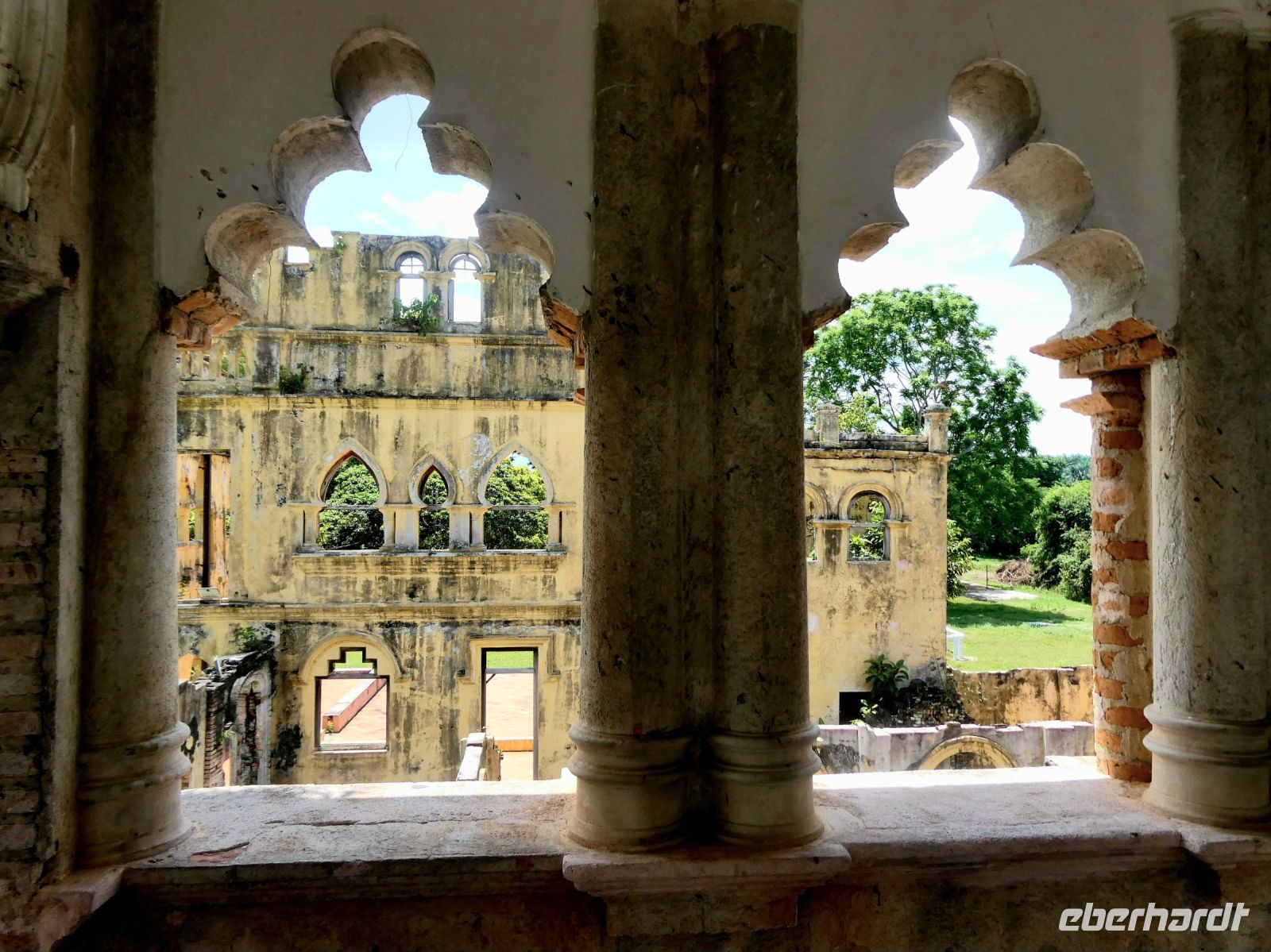 Es geht weiter mit unserem Bus, denn vor dem Mittagessen erwartet uns noch ein Besuch von Kellie's Castle. Der durch den Gummiboom zu Reichtum gekommene Schotte William Kellie-Smith wollte sich hier seinen Traum von einem Schloss erfüllen. Allerdings stand die Aktion unter keinem guten Stern. Seine Arbeiter starben vor Vollendung an der spanischen Grippe und er selber fiel bei der Überfahrt nach Portugal einer Lungenentzündung zum Opfer. Er wollte in Lissabon einen Fahrstuhl für das mehrstöckige Gebäude erwerben. Die Ruine erinnert eher an ein maurisches Schloss, denn während der Zeit der Errichtung war es eine Mode unter den Europäern, sich mit Exotik zu umgeben.