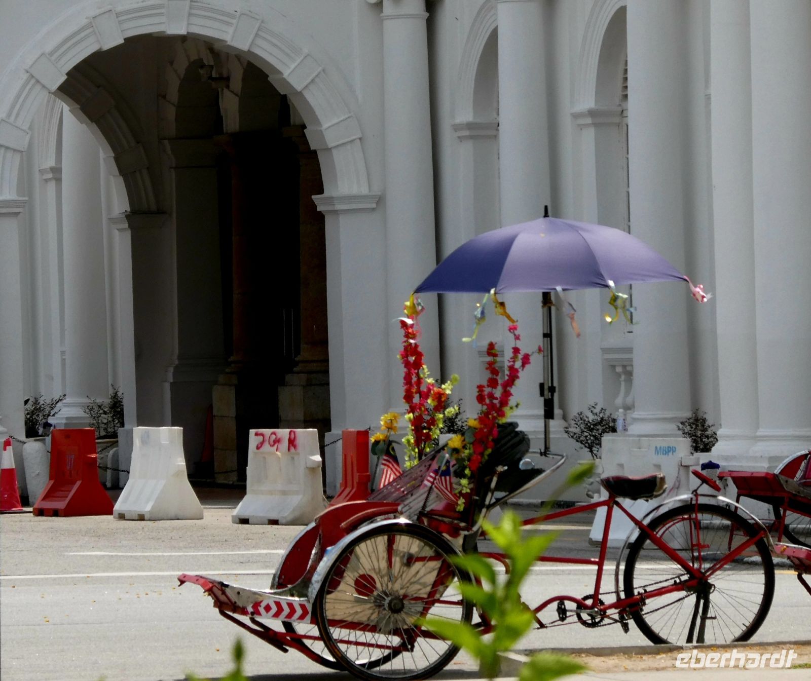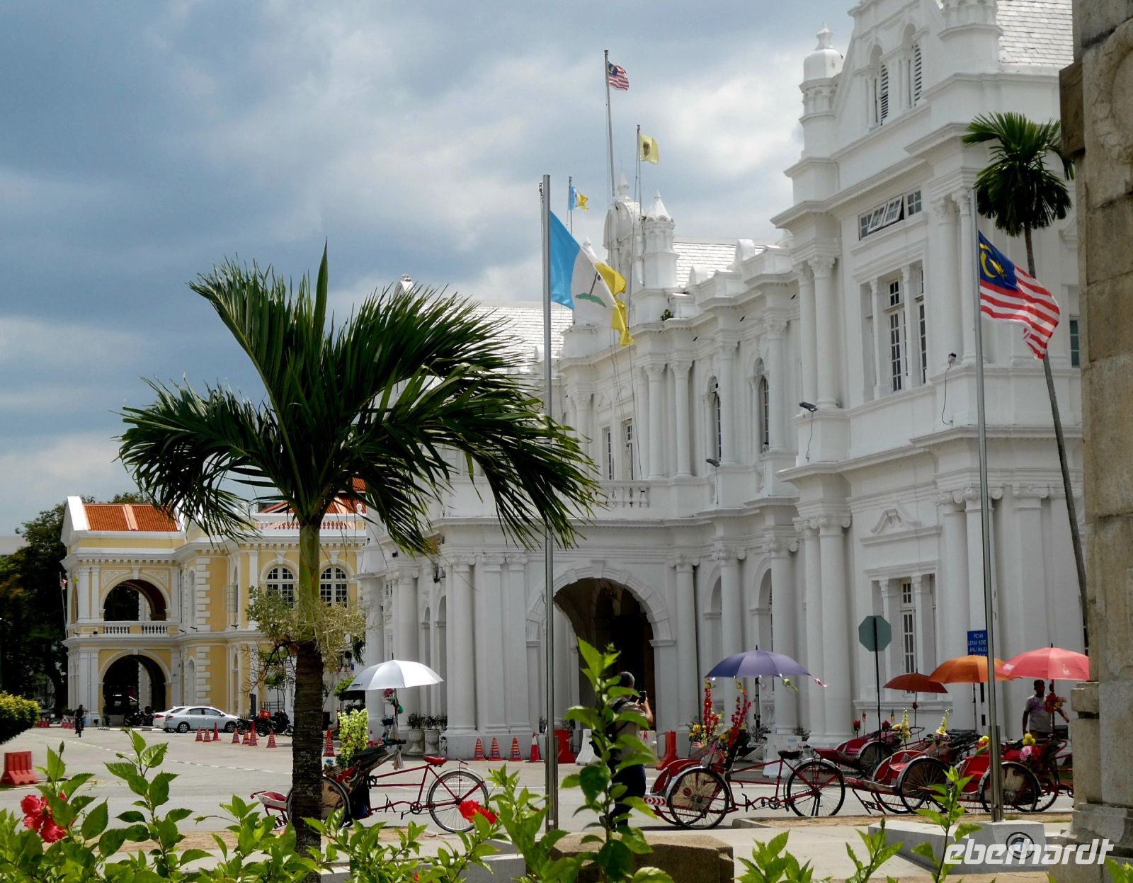 Danach geht es in das Hotel um vor der Fahrt mit der Fahrradrikscha ein wenig zu entspannen. Sie stehen bald vor dem Hotel parat und jeder sucht sich sein persönliches Gefährt nebst Fahrer aus, die alle stramme Waden haben. Sie bringen uns zu unserem ersten Stopp, der Esplanade, wo wir im Rücken das Rathaus und die Stadthalle finden. Wir blicken auf das Meer in Richtung Sumatra welches zu Indonesien gehört.