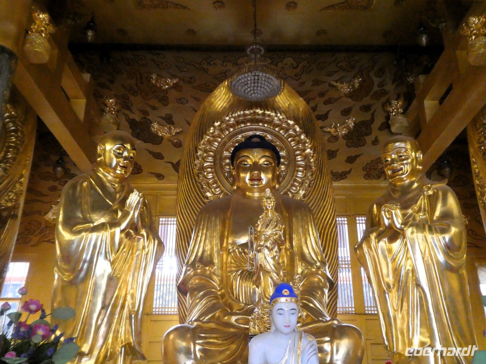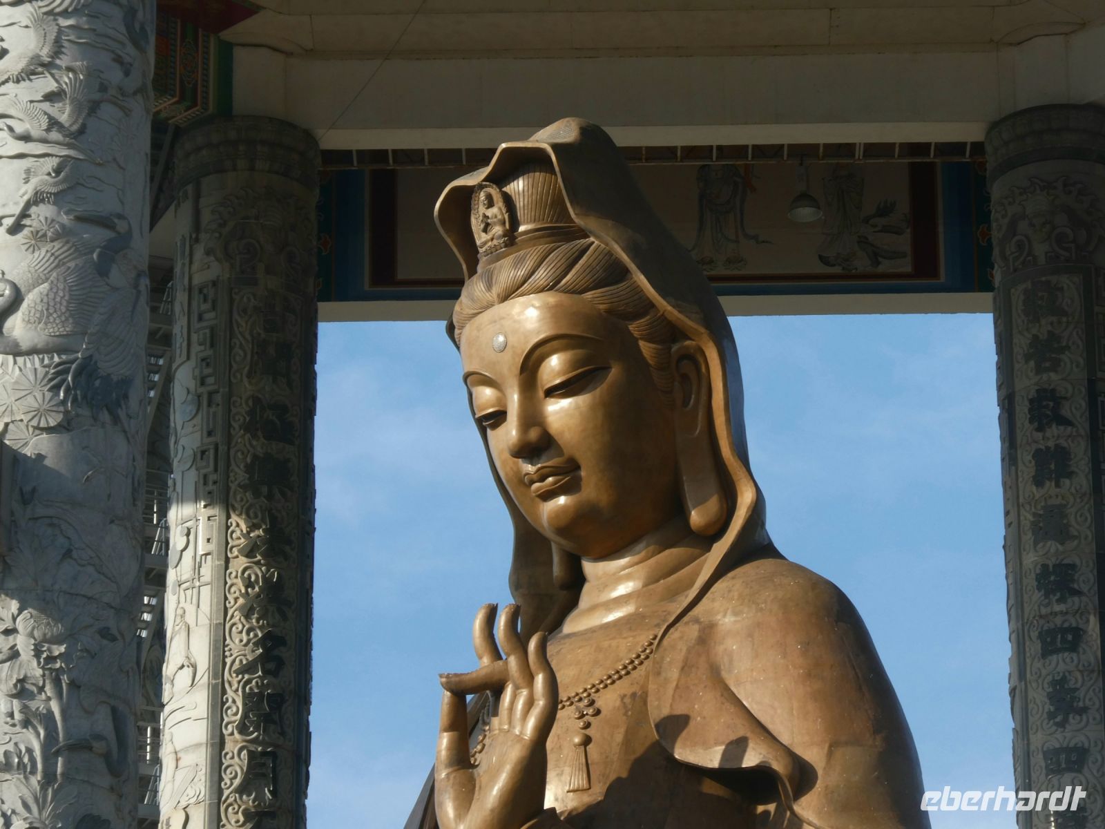 Auch hier am "Tempel der höchsten Glücksehligkeit" ist wieder Bahnfahren angesagt. Nach mehrfachem Fahrzeugwechsel sind wir oben. Majestätisch blickt die Statue der Göttin "Kuan Yin", die "Göttin der Gnade" auf uns herab.
