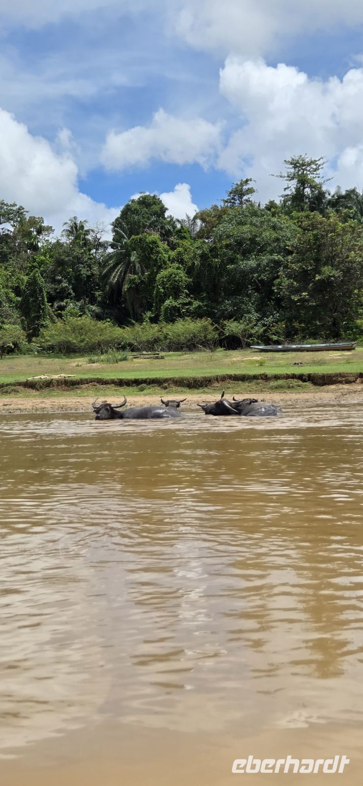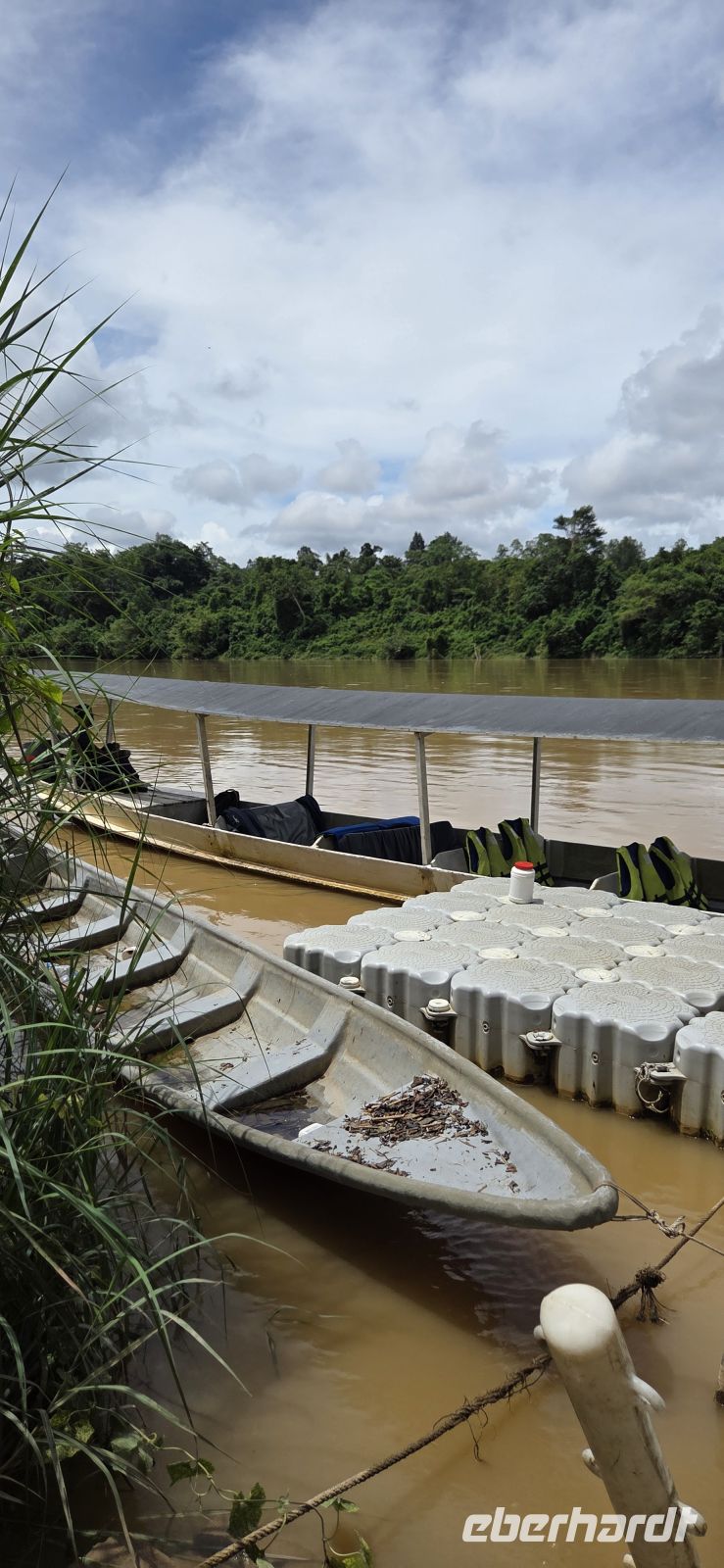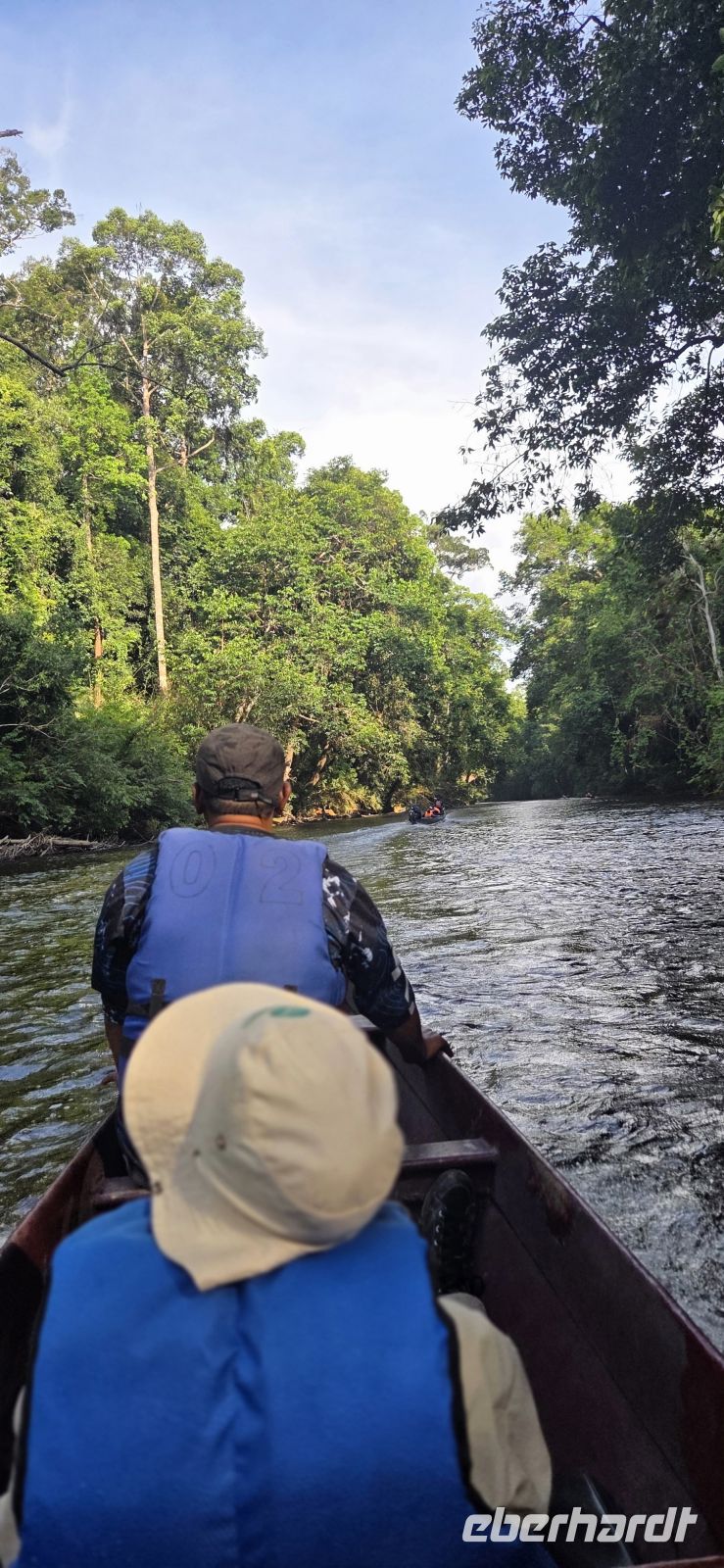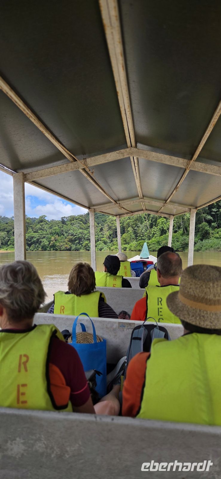 Nach dem Frühstück begann die Reise ins Herz der Natur. Schon die Bootsfahrt dorthin war ein Erlebnis: langsam glitt das überdachte Holzboot über den braunen Fluss, gesäumt von dichtem Dschungel. Kinder winkten von den Ufern, Vögel kreisten über den Baumkronen, und die Zeit schien sich zu verlangsamen.