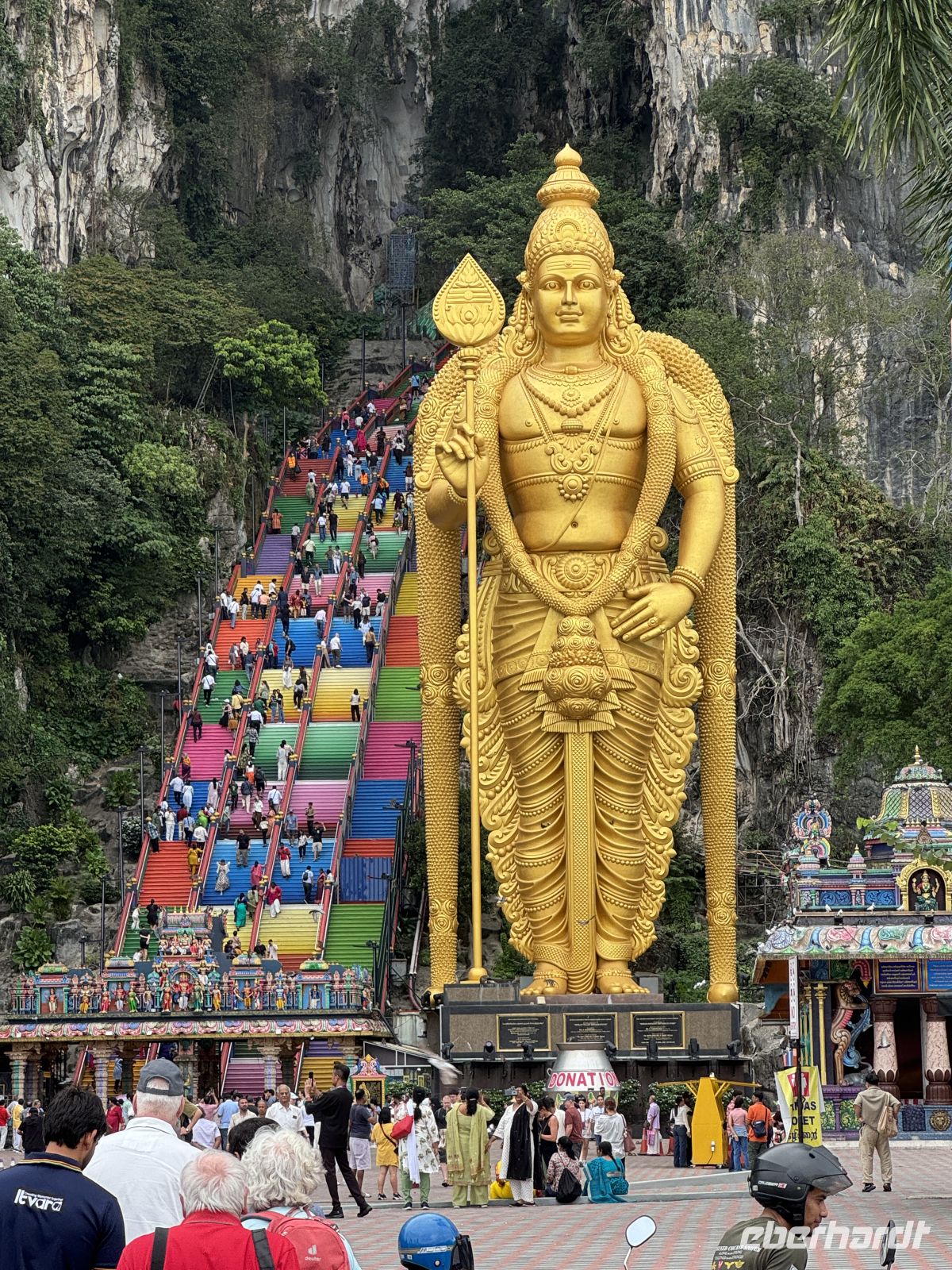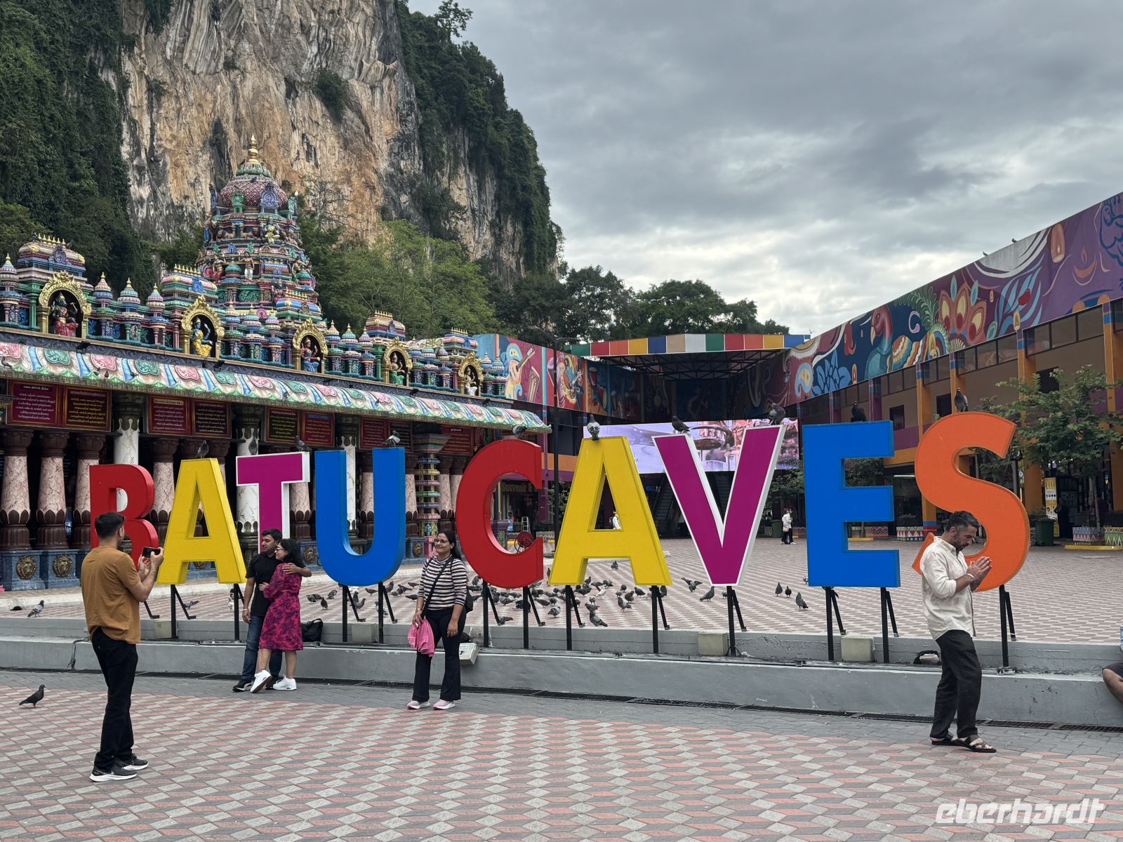 Unser erstes Ziel heute sind die Batu Caves. Die Batu Caves (zusammengesetzt aus malaiisch batu ‚Stein‘ und englisch caves ‚Höhlen‘) sind Kalksteinhöhlen rund 15 Kilometer nördlich der malaysischen Hauptstadt Kuala Lumpur und beherbergen mehrere Hindu-Tempel. Sie sind nicht nur ein bedeutendes religiöses und kulturelles Zentrum für die hinduistische Gemeinschaft des Landes, sondern auch für uns ein spirituelles Faszinosum. Ein wenig mühsam ist es allerdings, zu den “Batu Caves” zu gelangen. Denn es führt nur eine lange, steile Treppe an diesen einmaligen Pilgerort. Doch der Aufstieg lohnt sich unbedingt!