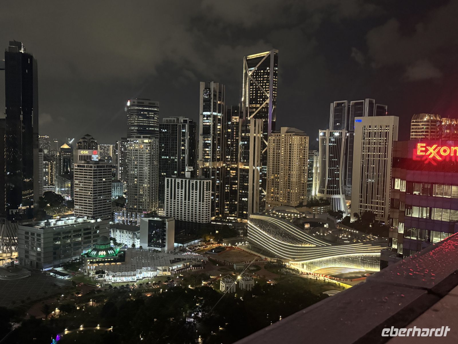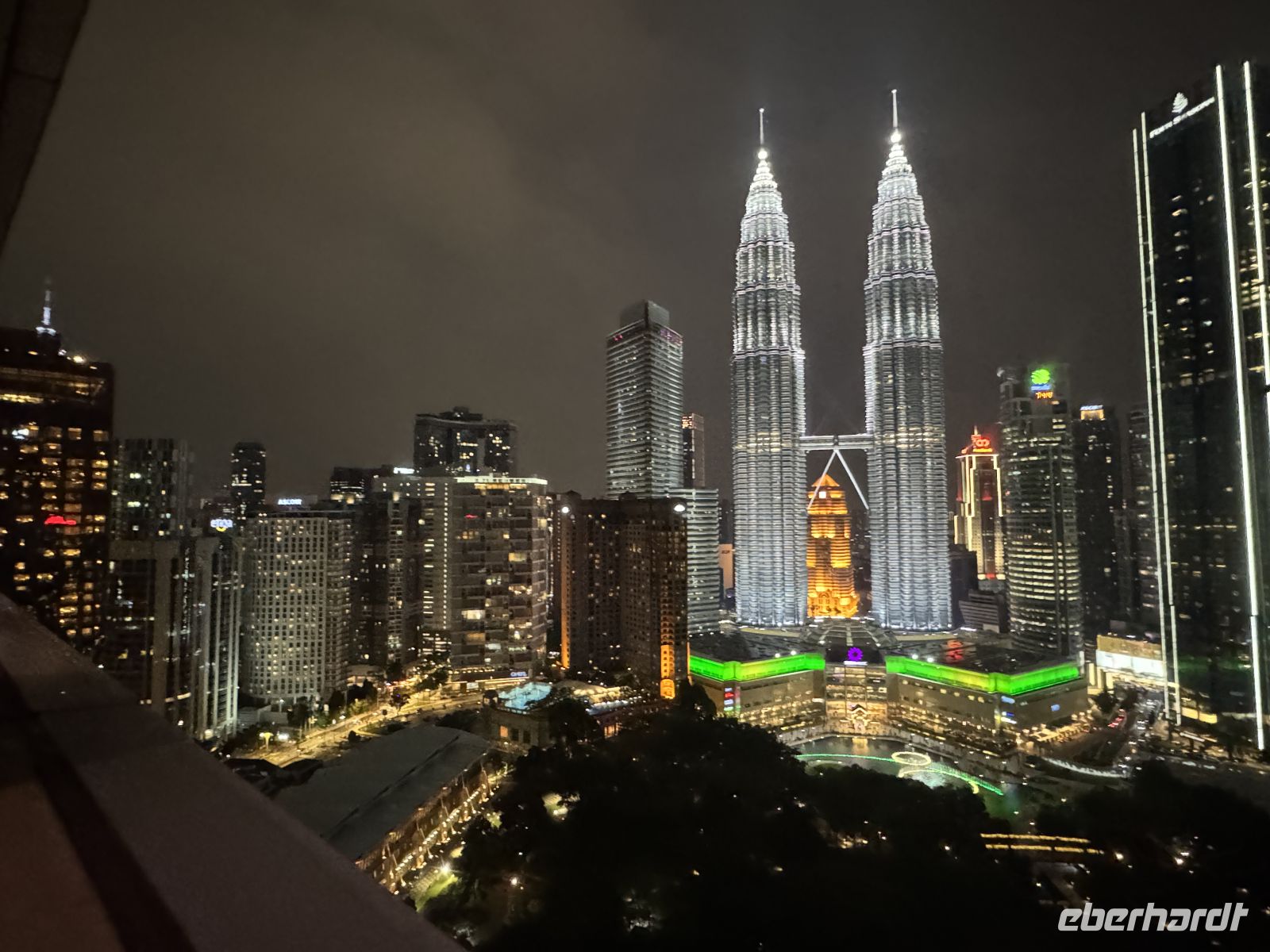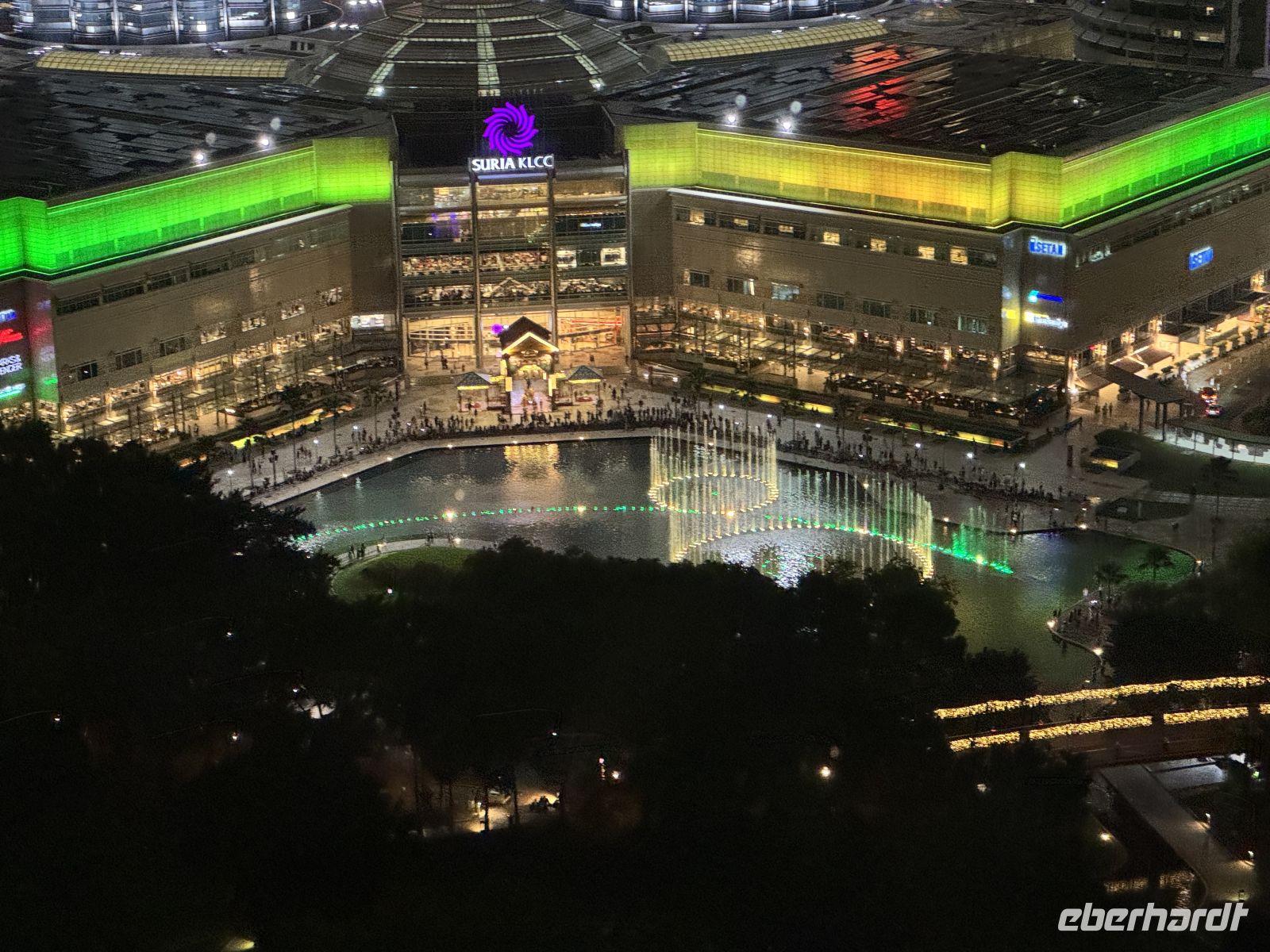 Nach dem Abendessen spazieren wir zum Traders Hotel von dessen Bar auf dem Dachgeschoss wir die imposante KLCC Lake Symphony Water Fountain Show an den Petronas Twin Towers bestaunen.