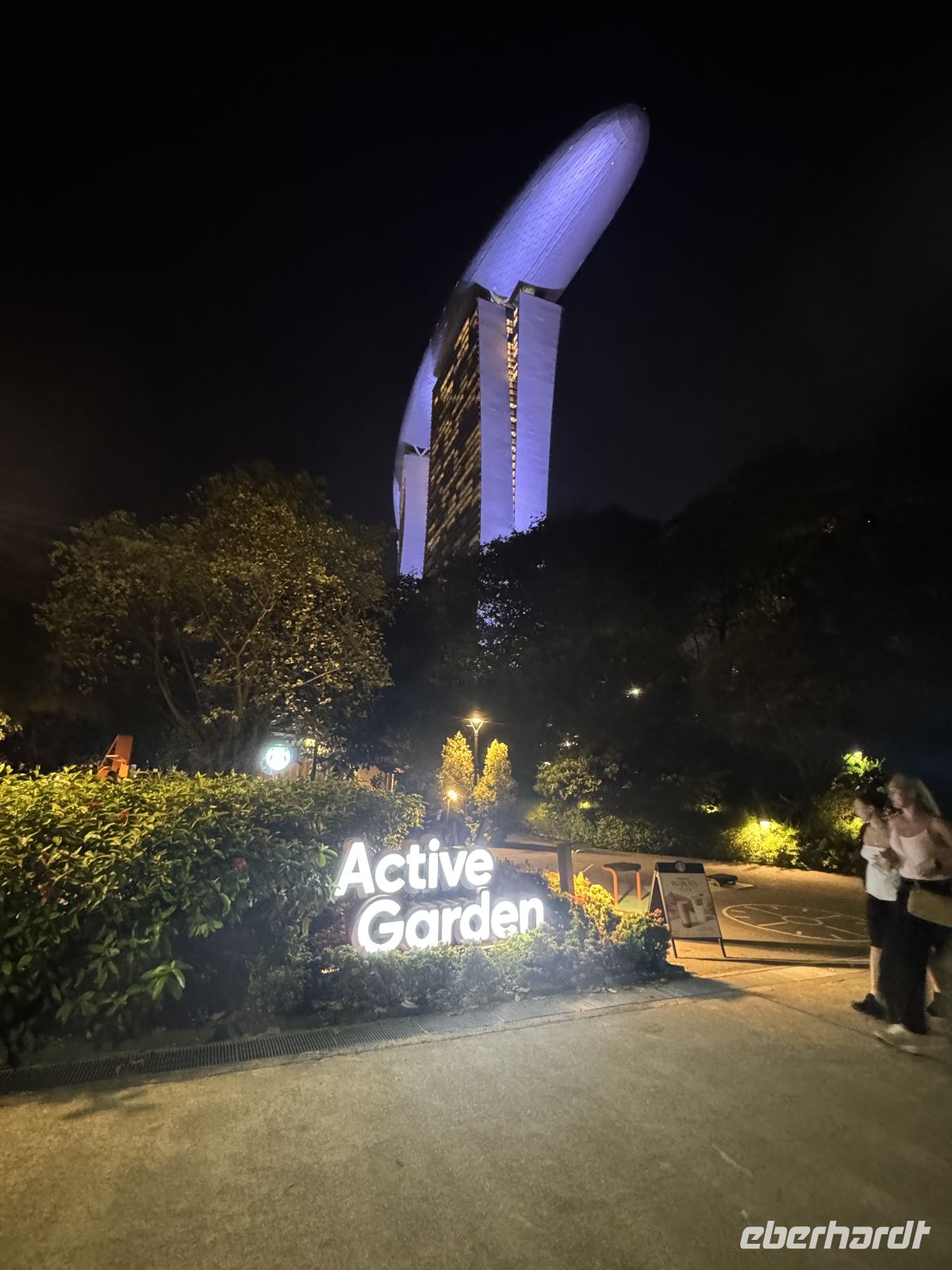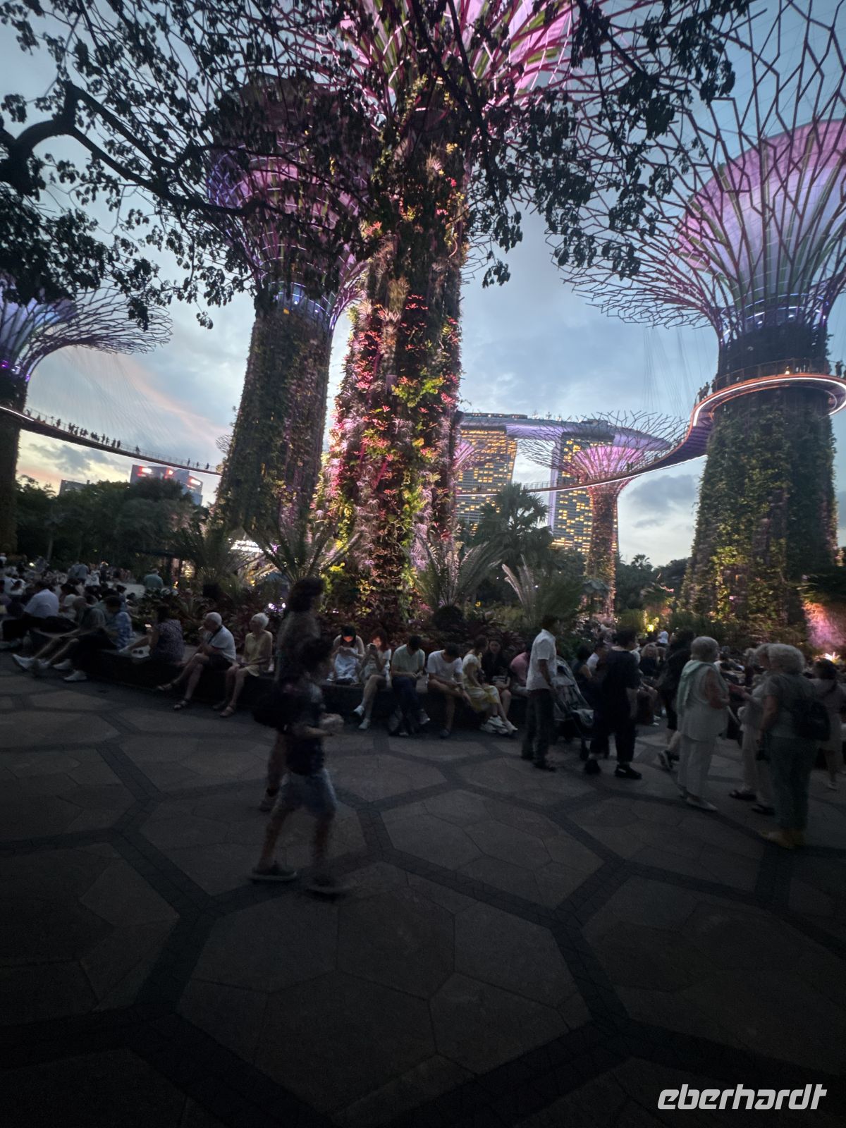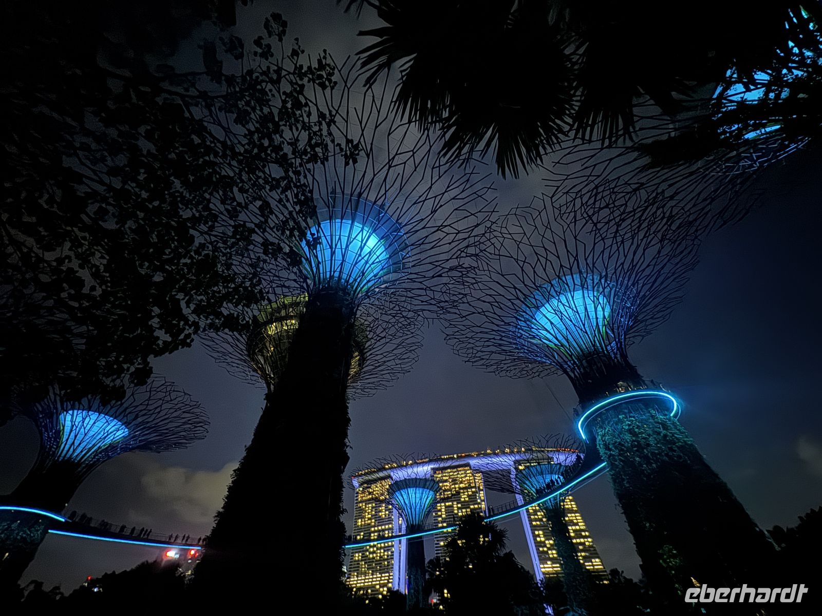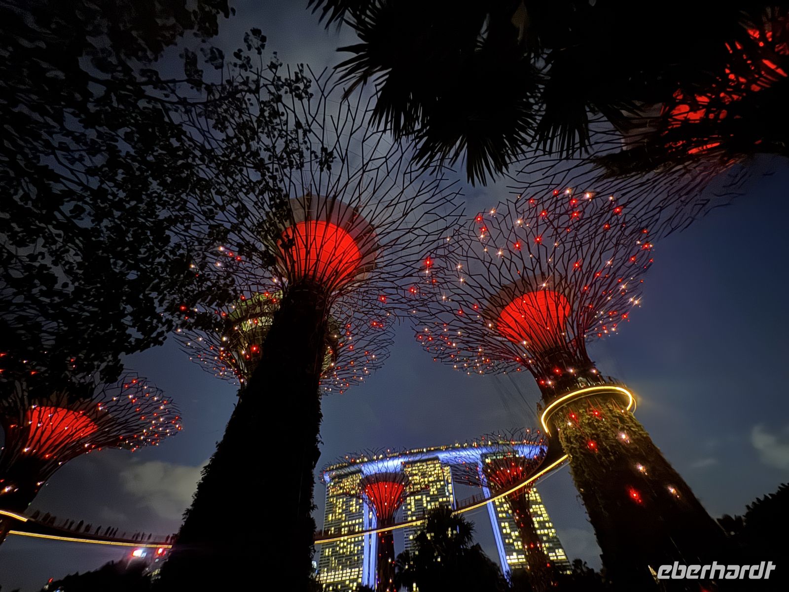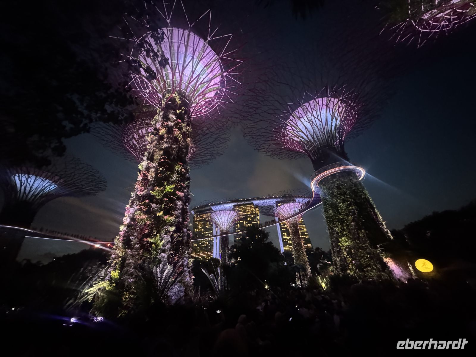 Mit mehreren Taxis fahren wir zu den Supertrees. Das sind 25 bis 50 Meter hohe, vertikale Gärten in den Gardens by the Bay, die als nachhaltige Wahrzeichen dienen. Die 18 futuristischen Stahlkonstruktionen beheimaten tausende Pflanzenarten, erzeugen Solarstrom, sammeln Regenwasser und kühlen die Gewächshäuser. Hier bestaunen wir die imposante Lichtshow mit den Klängen von klassischer Musik. Bevor wir zu Fuß zum Marina Bay Sands Hotel gehen bewundern wir noch die Lichtshow Borealis, eine sehr realistische Nachempfindung der Polarlichter.