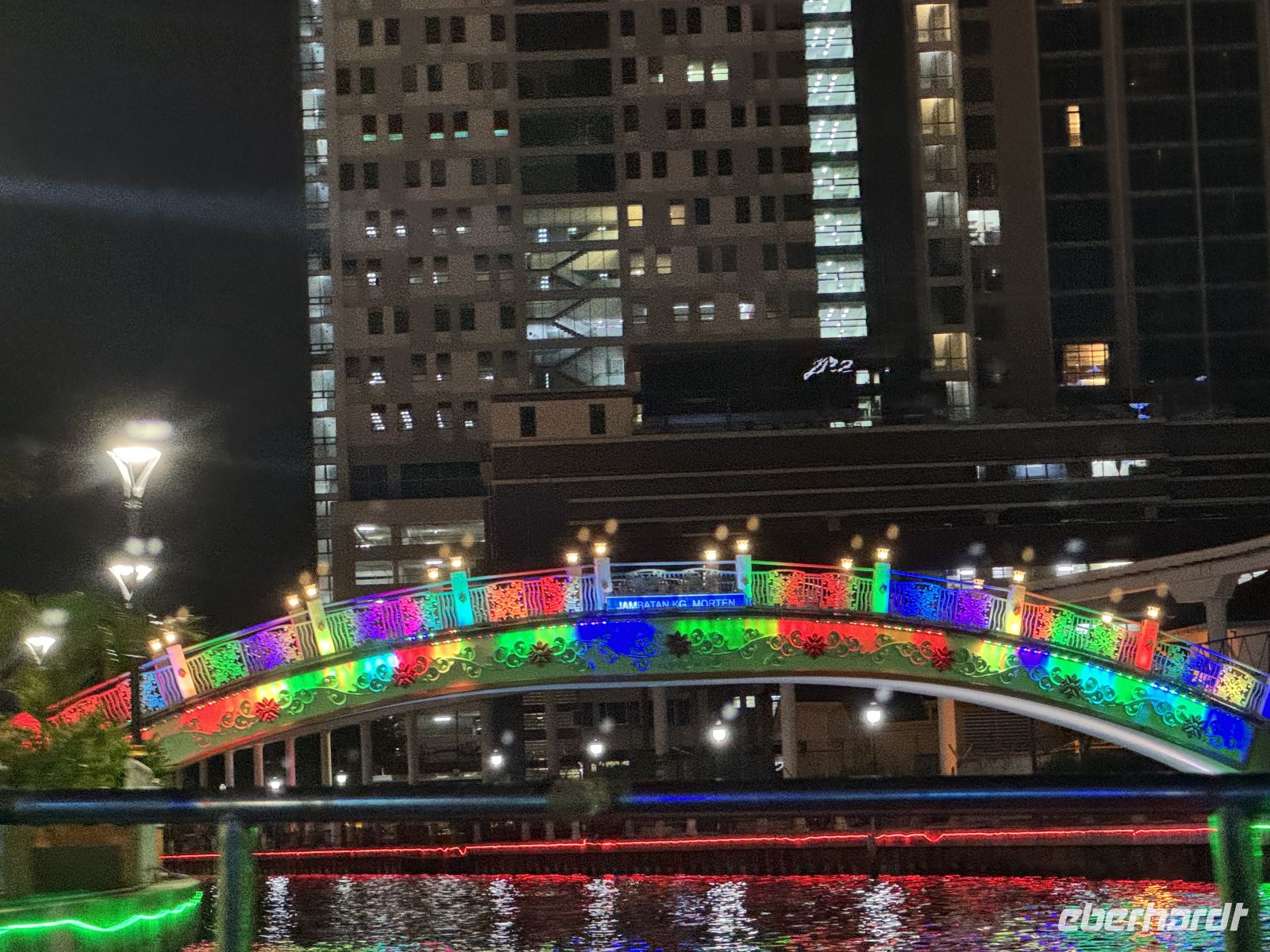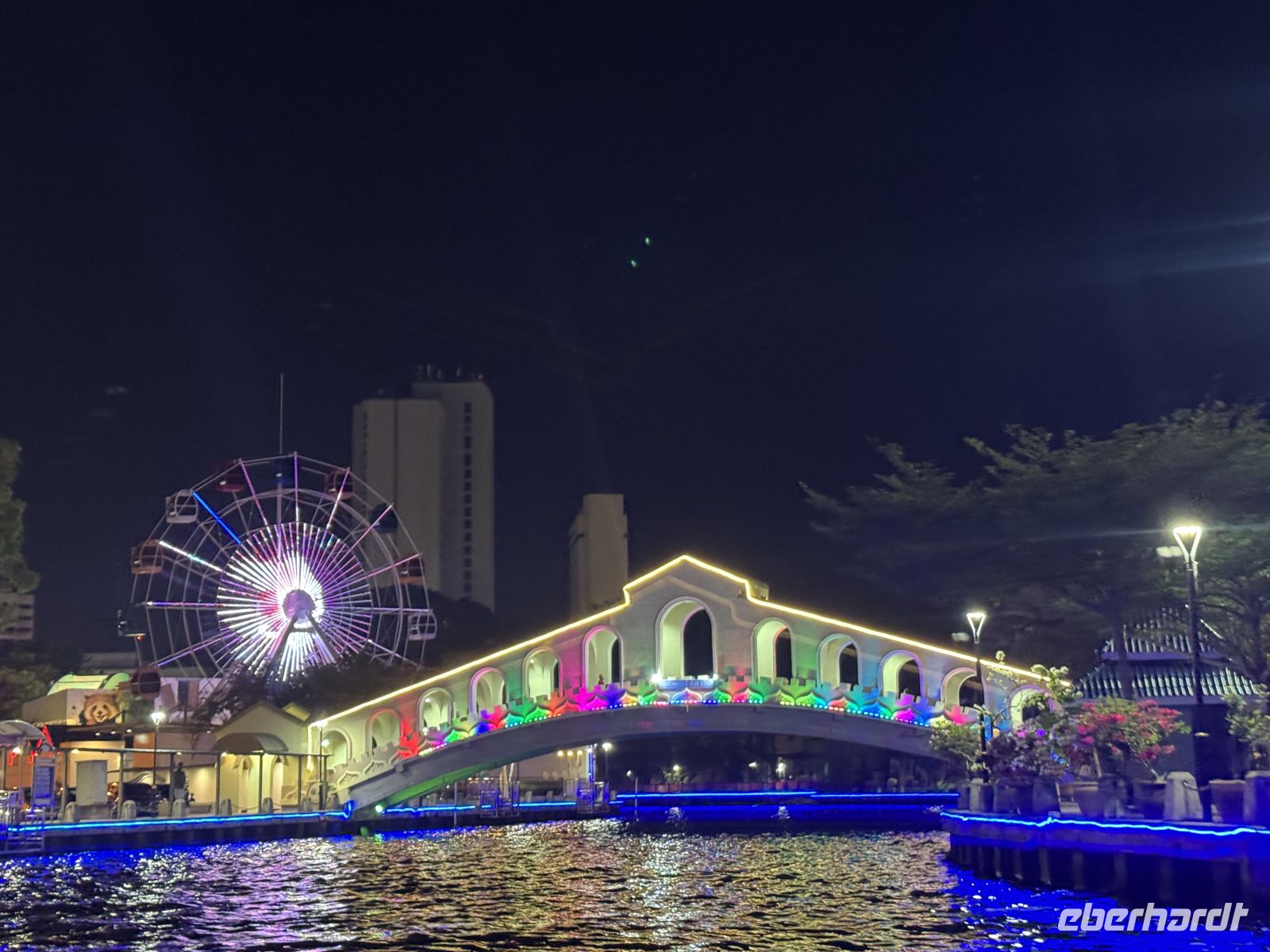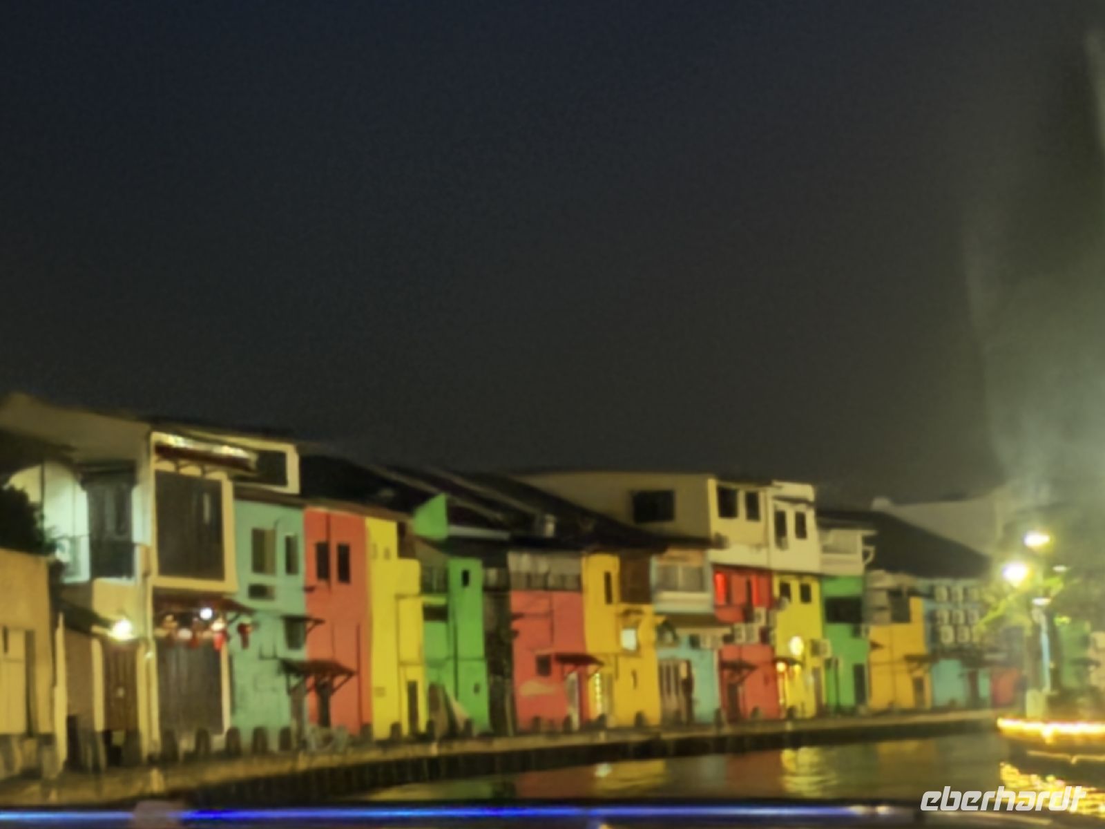 Nach dem typisch malaysischen Abendessen in der Altstadt setzt uns Raj in der Nähe des Bootsanlegers ab, von von wo aus wir uns auf eine knapp einstündige Bootstour durch die wunderschön illuminierte Stadt begeben.