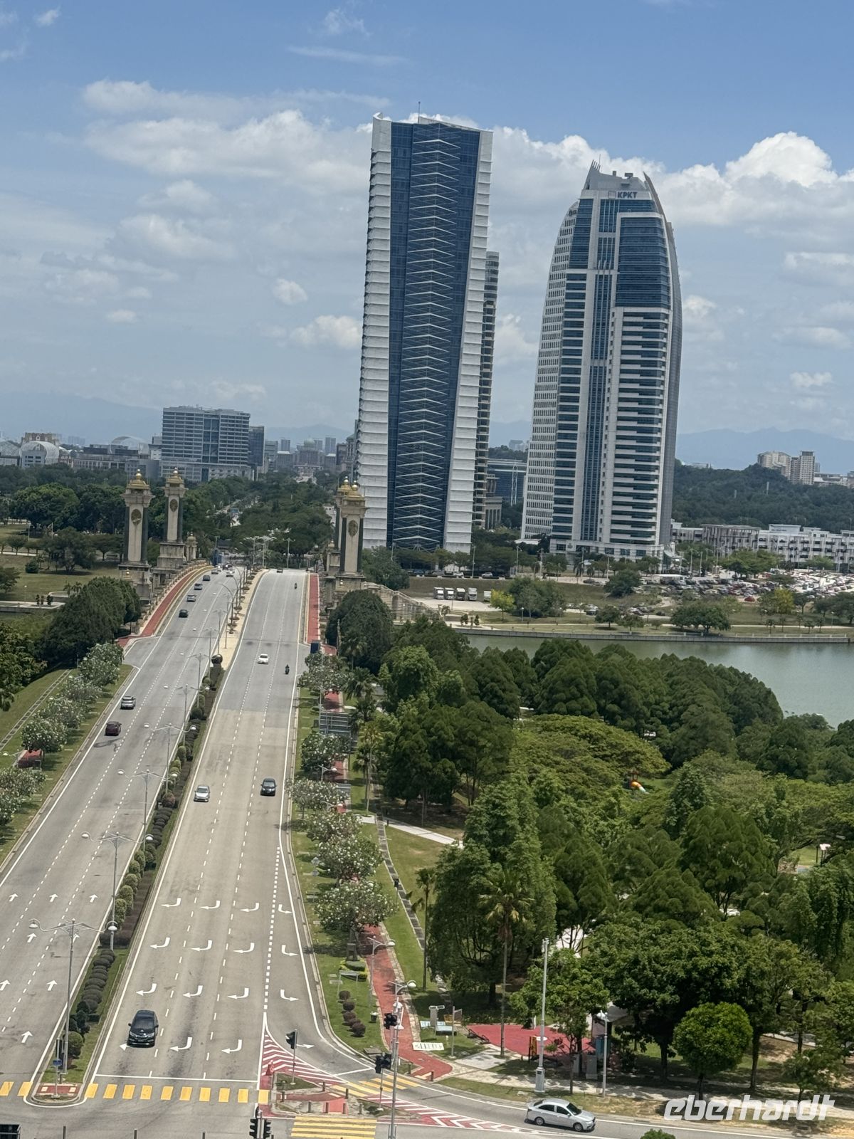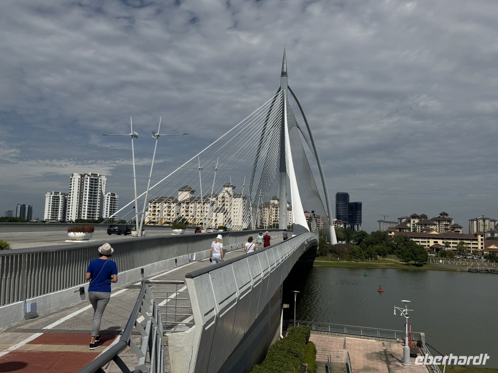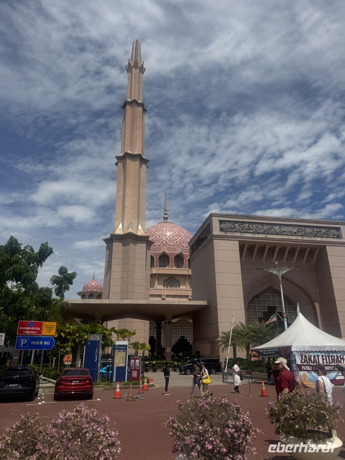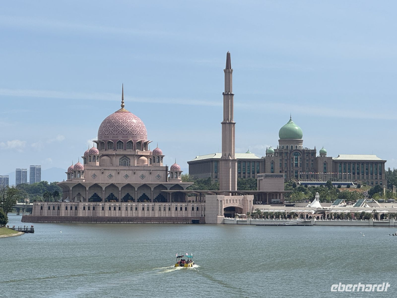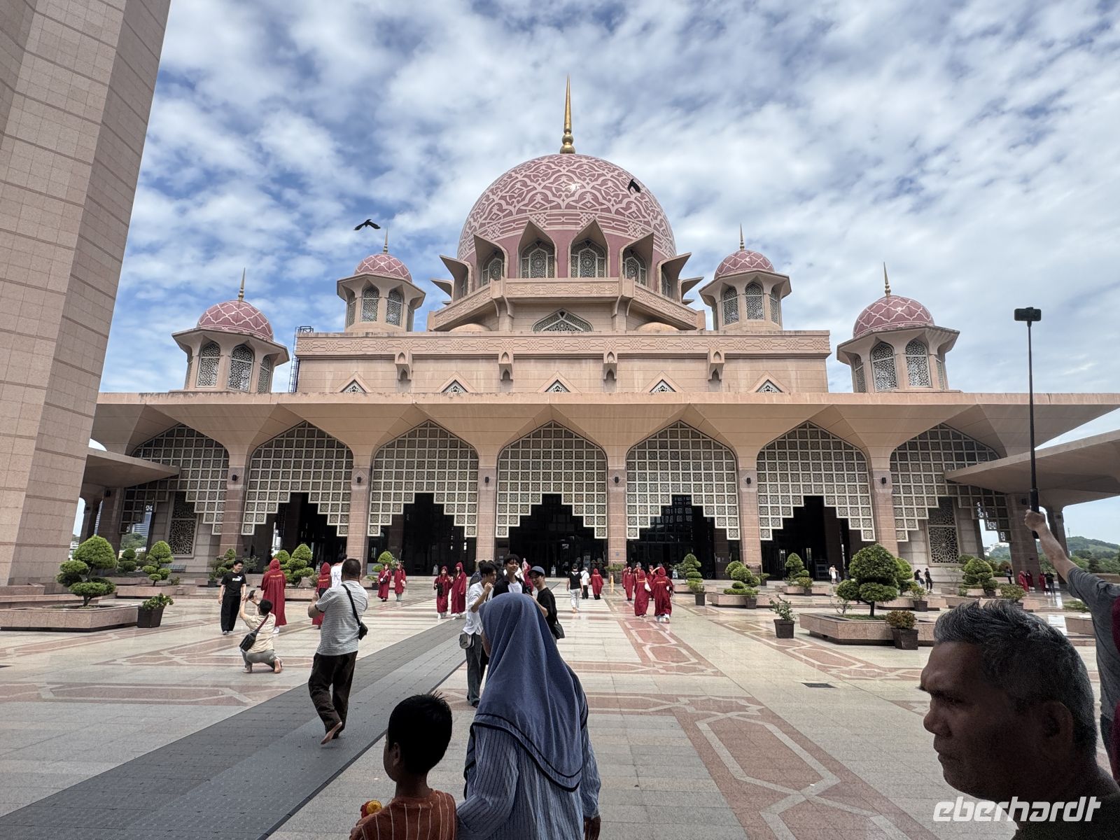 Erster Halt ist an der Seri Wawasan Brücke. Die 2003 fertiggestellte Brücke ist eine der Hauptbrücken von Putrajaya. Sie ist eine Schrägseilbrücke, die schon von weitem beeindruckend aussieht. Von hier haben wir eine schöne Aussicht auf die gesamte Umgebung der Stadt. Wir besuchen die beeindruckende Masjid Putra oder Putra Moschee, die Hauptmoschee von Putrajaya. Sie wurde 1997 erbaut und hat Platz für 15.000 Gläubige während des Gebets. Besonders beeindruckend ist die große rosa Kuppel aus Granit und das 116 Meter hohe Minarett, welches eines der größten der Umgebung ist. Um in die Moschee eintreten zu dürfen ziehen wir alle einen tiefroten Umhang an. Weitere Ziele unserer Städtetour sind das Putrajaya Convention Center, das Putrajaya Schild und zahlreiche andere Gebäude der Stadt.