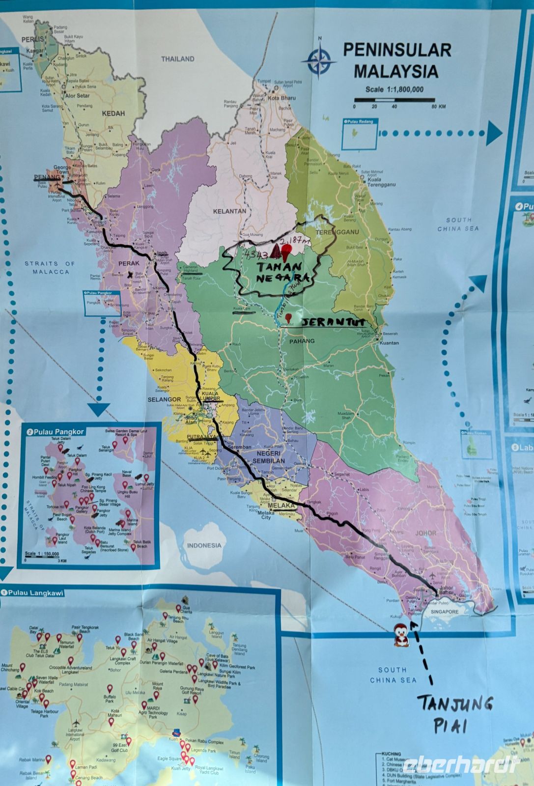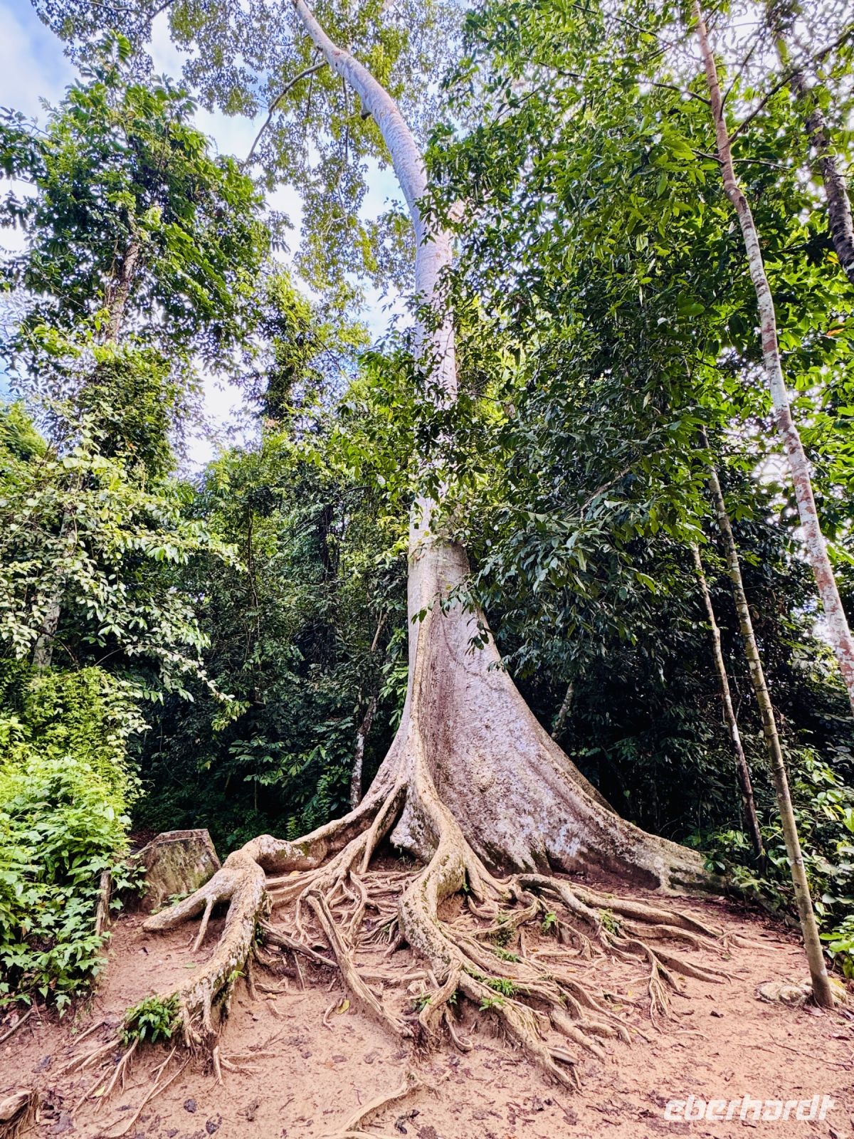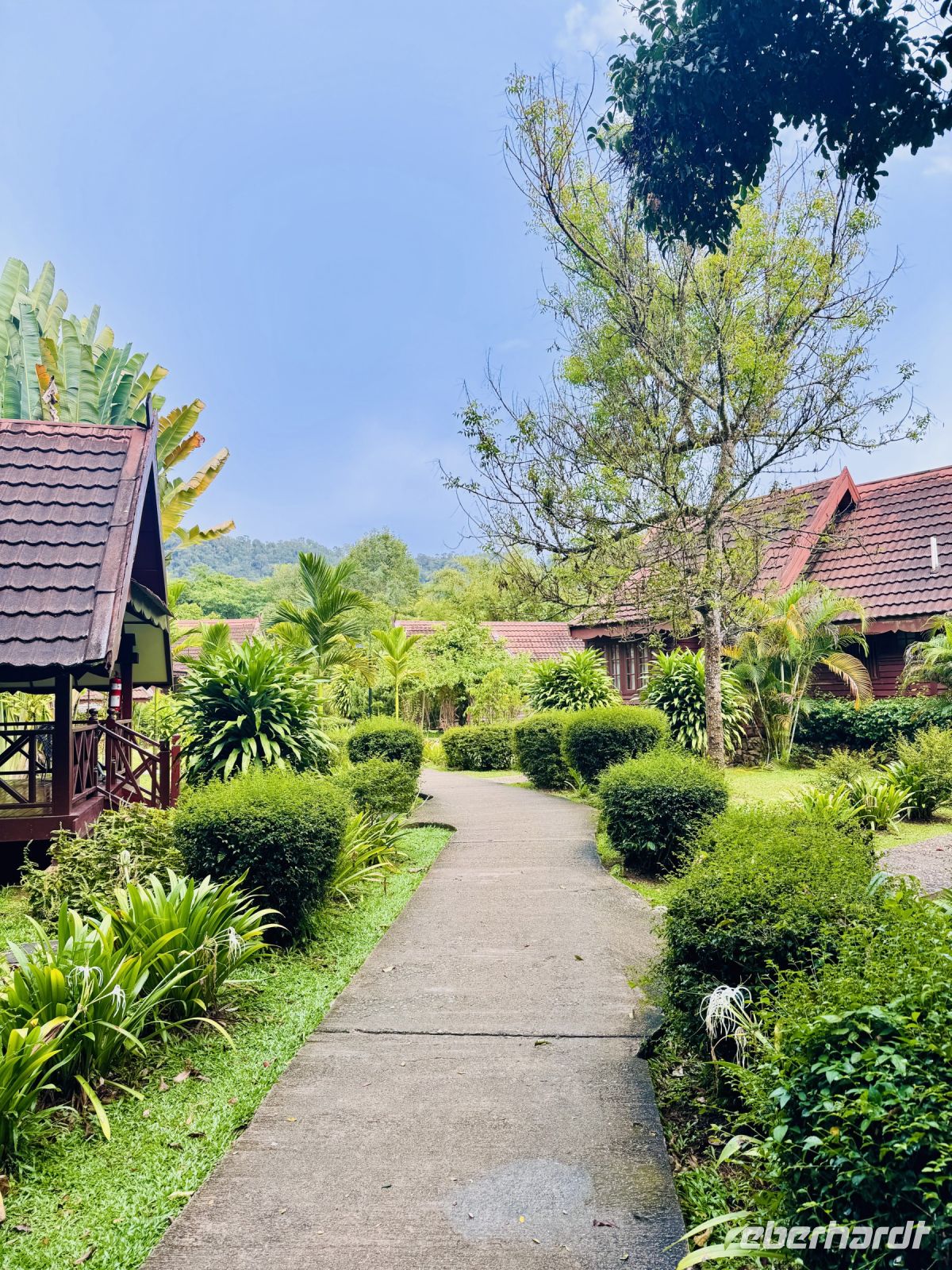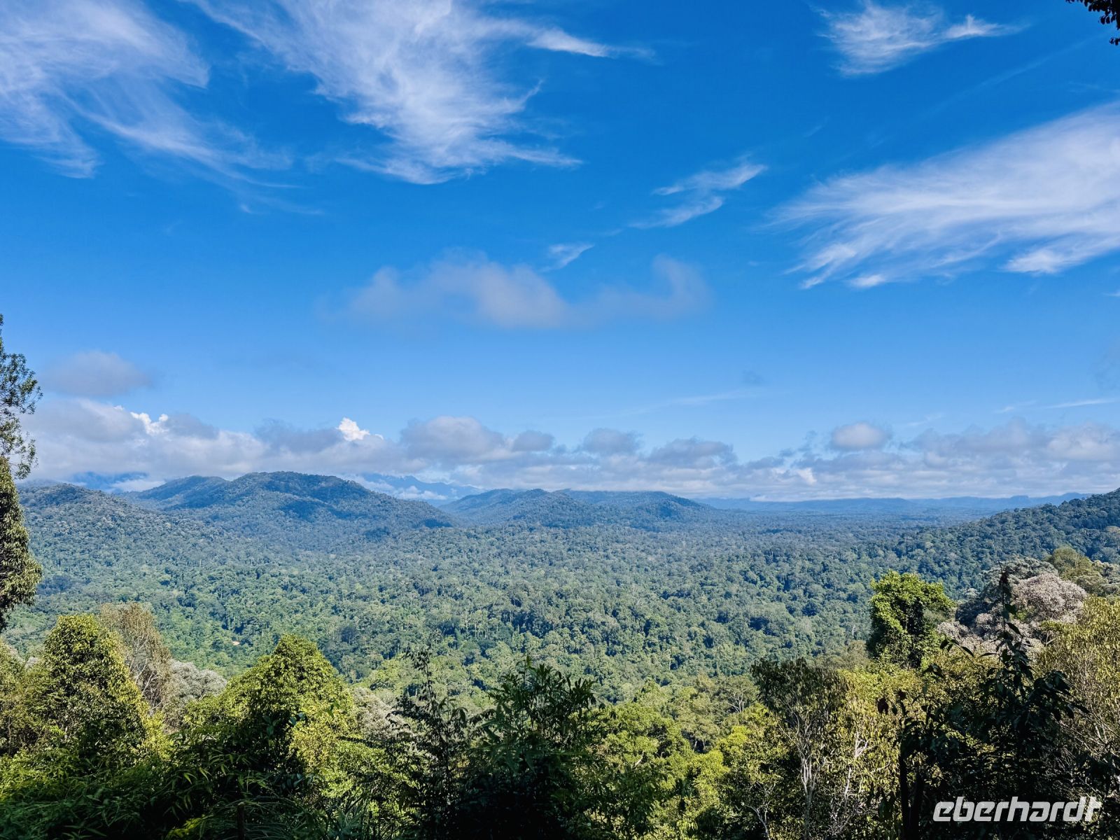 Heute nehmen wir den Tag entspannt in Angriff, lassen den hektischen Alltag hinter uns und genießen unser Frühstück inmitten des Dschungels. Das Konzert der Natur bildet den perfekten Hintergrund – exotische Vogelrufe und das Summen der Insekten mischen sich mit dem sanften Rascheln der Blätter. Es ist ein Moment purer Harmonie, der uns bereits auf das einstimmt, was uns heute erwartet. Nach dem Frühstück trifft sich unsere kleine Gruppe mit dem Naturguide, einem erfahrenen Dschungelkenner, der uns durch die verborgenen Schätze dieses Regenwaldes führen wird. Bereits auf den ersten Metern tauchen wir tief in die grüne Wildnis ein, und die Vielfalt der Pflanzen ist überwältigend. Wilde Ingwerpflanzen mit ihren leuchtenden roten Blüten ziehen sofort unseren Blick auf sich, während Meranti-Bäume in ihrer imposanten Höhe über uns aufragen. Sie gehören zu den Giganten des Dschungels, und ihr Holz ist im Handel heiß begehrt – doch hier stehen sie, unberührt und majestätisch. Überall schlingen sich Lianen um die Bäume und schwingen wie natürliche Seile zwischen den Ästen. Farne und dichte Sträucher säumen unseren Weg und lassen den Wald wie ein riesiges grünes Gewölbe erscheinen. Es geht stetig bergauf, und die feuchte, schwüle Luft macht den Anstieg anstrengend. Doch unser Guide weiß, wie man in dieser Umgebung zurechtkommt, und sein Wissen gibt uns neuen Antrieb. Nach etwa anderthalb Stunden und 344 Höhenmetern erreichen wir unser Ziel: den Aussichtspunkt auf dem Bukit Terisek. Hier oben lichtet sich die Baumdecke, und vor uns breitet sich eine endlose Dschungellandschaft aus – grün in allen nur vorstellbaren Nuancen. Die Weite und Stille sind beeindruckend, und wir nutzen den Moment, um einmal tief durchzuatmen und diese unglaubliche Aussicht zu genießen. Auf dem Rückweg wartet die nächste Überraschung: In der Nähe unseres Pfades entdecken wir eine Goliath-Vogelspinne. Regungslos verharrt sie in ihrem Bau und scheint unsere Anwesenheit kaum zu registrieren – ein faszinierender, aber auch leicht schauriger Anblick. Wenig später hören wir in den Baumwipfeln das aufgeregte Kreischen von Gibbon-Affen. Wir folgen ihren Bewegungen hoch oben und beobachten, wie sie sich mühelos von Ast zu Ast schwingen. Zurück im Resort gönnen wir uns eine Pause und eine Kleinigkeit zu Mittag, bevor wir uns am Nachmittag zu einer Bootstour aufmachen. Die 1,5-stündige Fahrt auf dem Tahan Fluss bringt uns noch tiefer in den Dschungel hinein. Das Boot gleitet sanft über das Wasser und wir treiben durch eine Welt, die von dichtem, undurchdringlichem Grün umgeben ist. Der Fluss ist eine Lebensader für die Tierwelt hier – und wir werden reich belohnt. Ein schimmernder Eisvogel huscht über die Wasseroberfläche, sein buntes Gefieder leuchtet wie ein kleiner Edelstein im Licht. Ein Stück weiter entdecken wir Languren, die ruhig in den Baumkronen sitzen und uns aus neugierigen Augen beobachten. Kurz bevor ein heftiger Regenschauer einsetzt, kehren wir ins Resort zurück. Der Tag klingt gemütlich aus, während wir die Erlebnisse Revue passieren lassen und die Abendstimmung genießen. Morgen setzen wir unsere Reise fort, auf in die Cameron Highlands – doch die Magie des Dschungels wird uns sicher noch lange begleiten.
