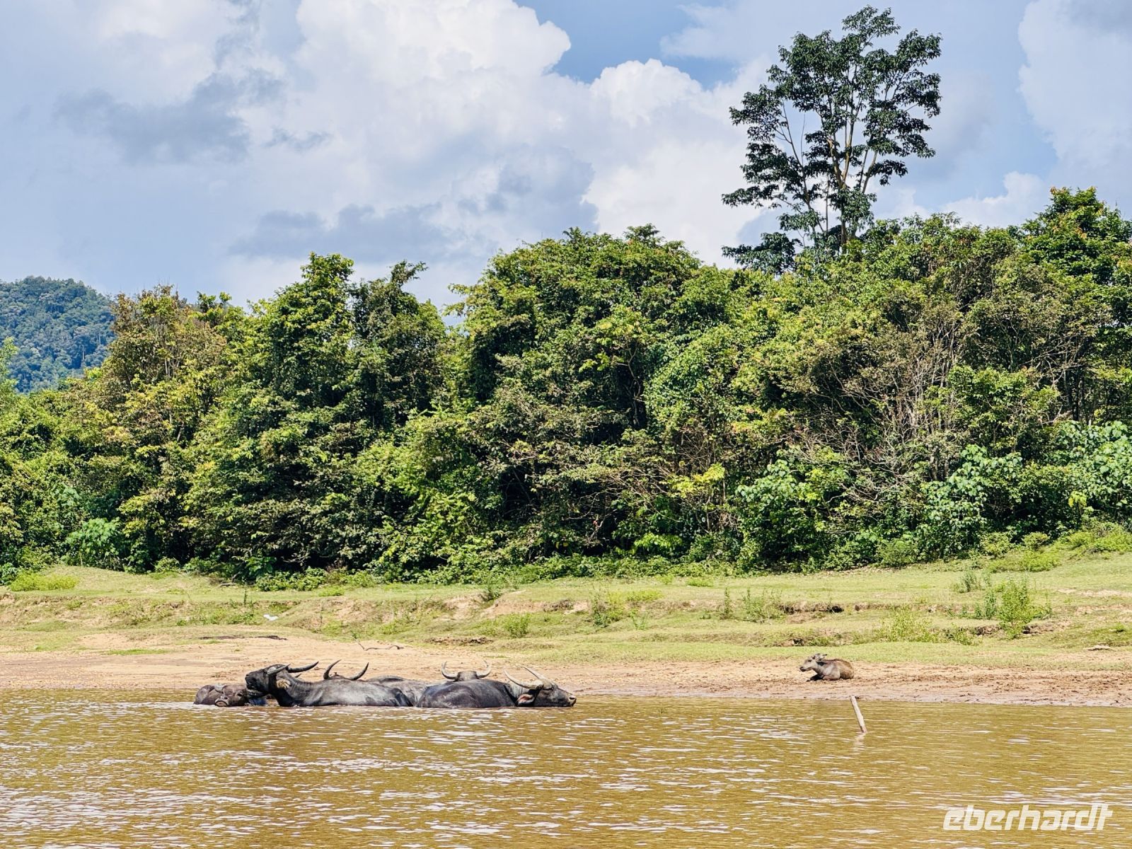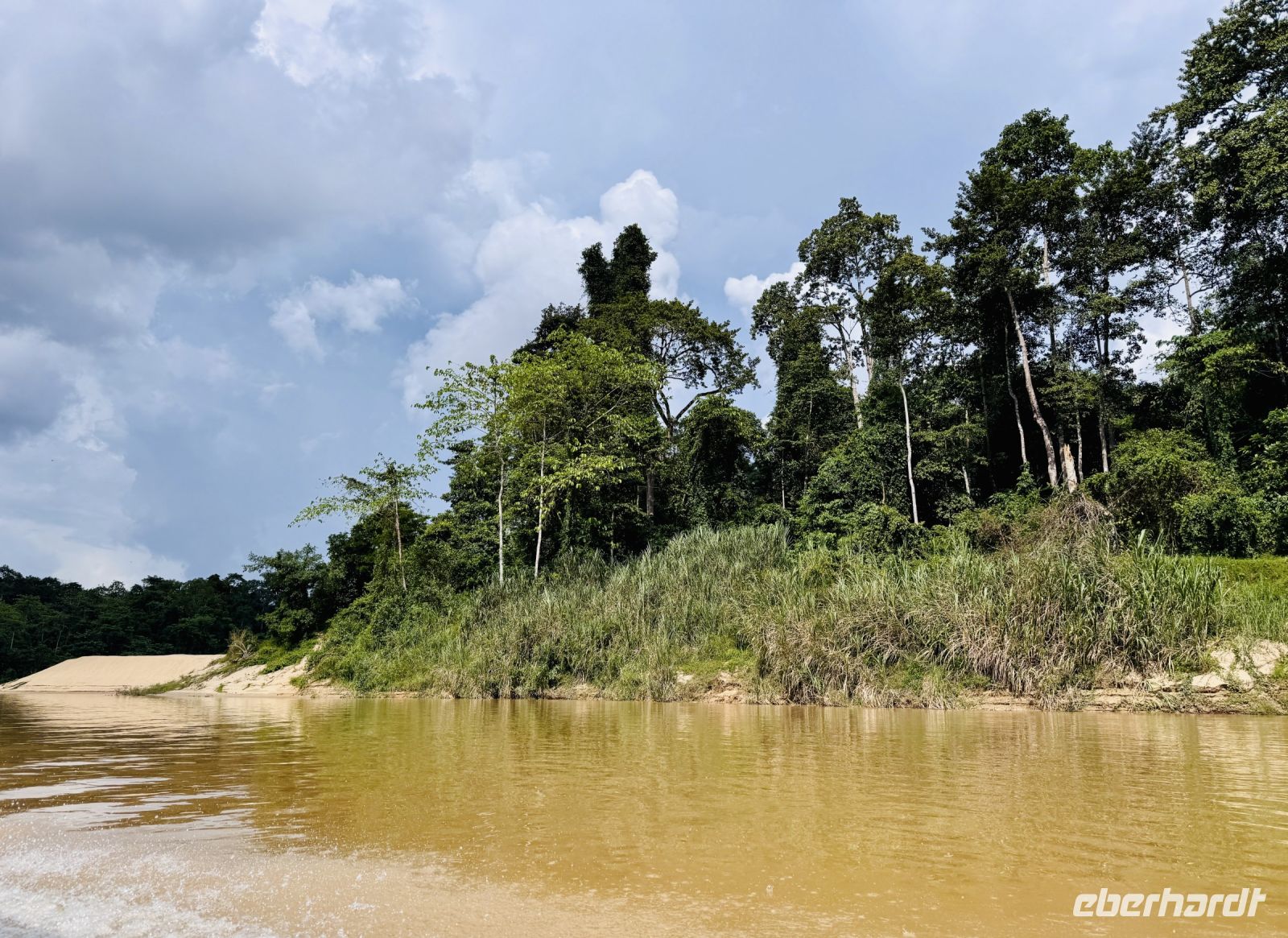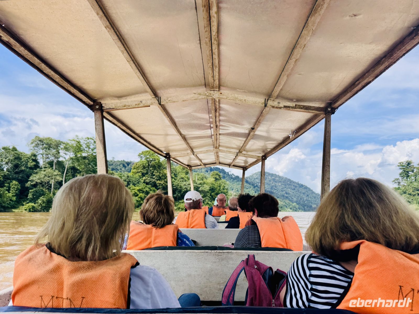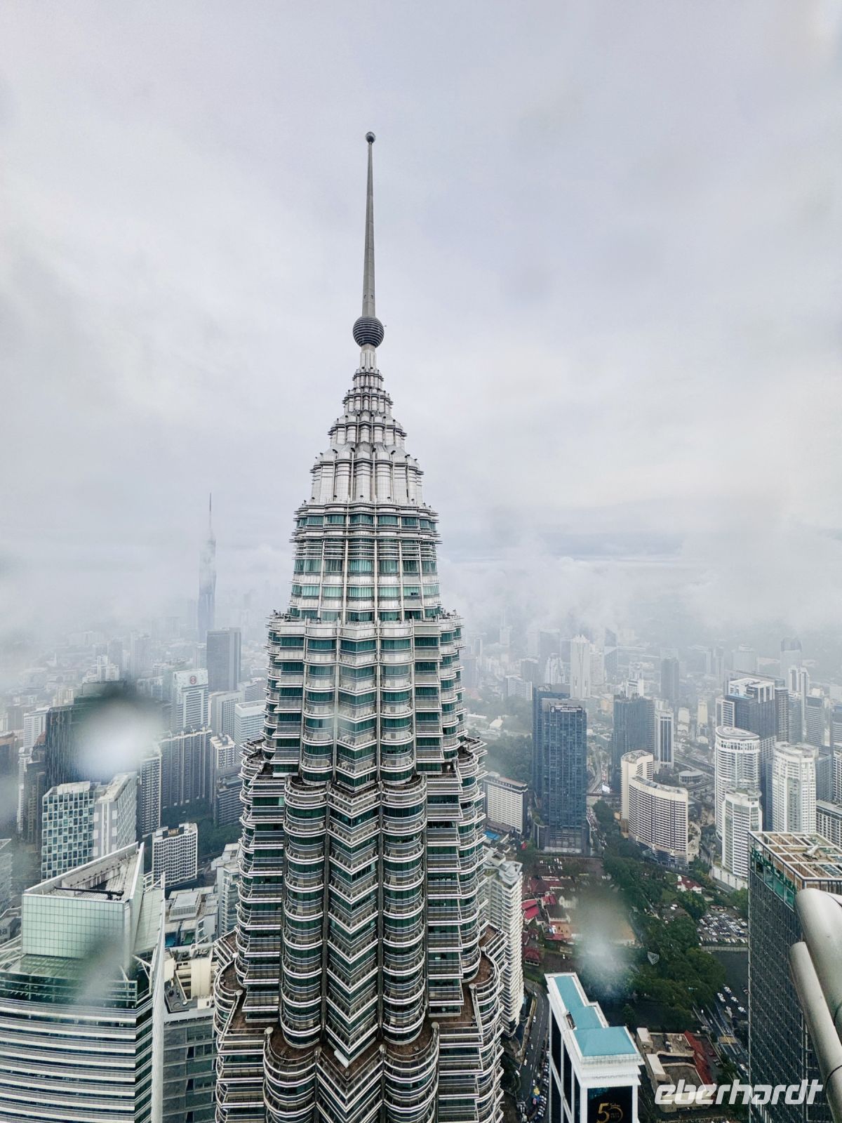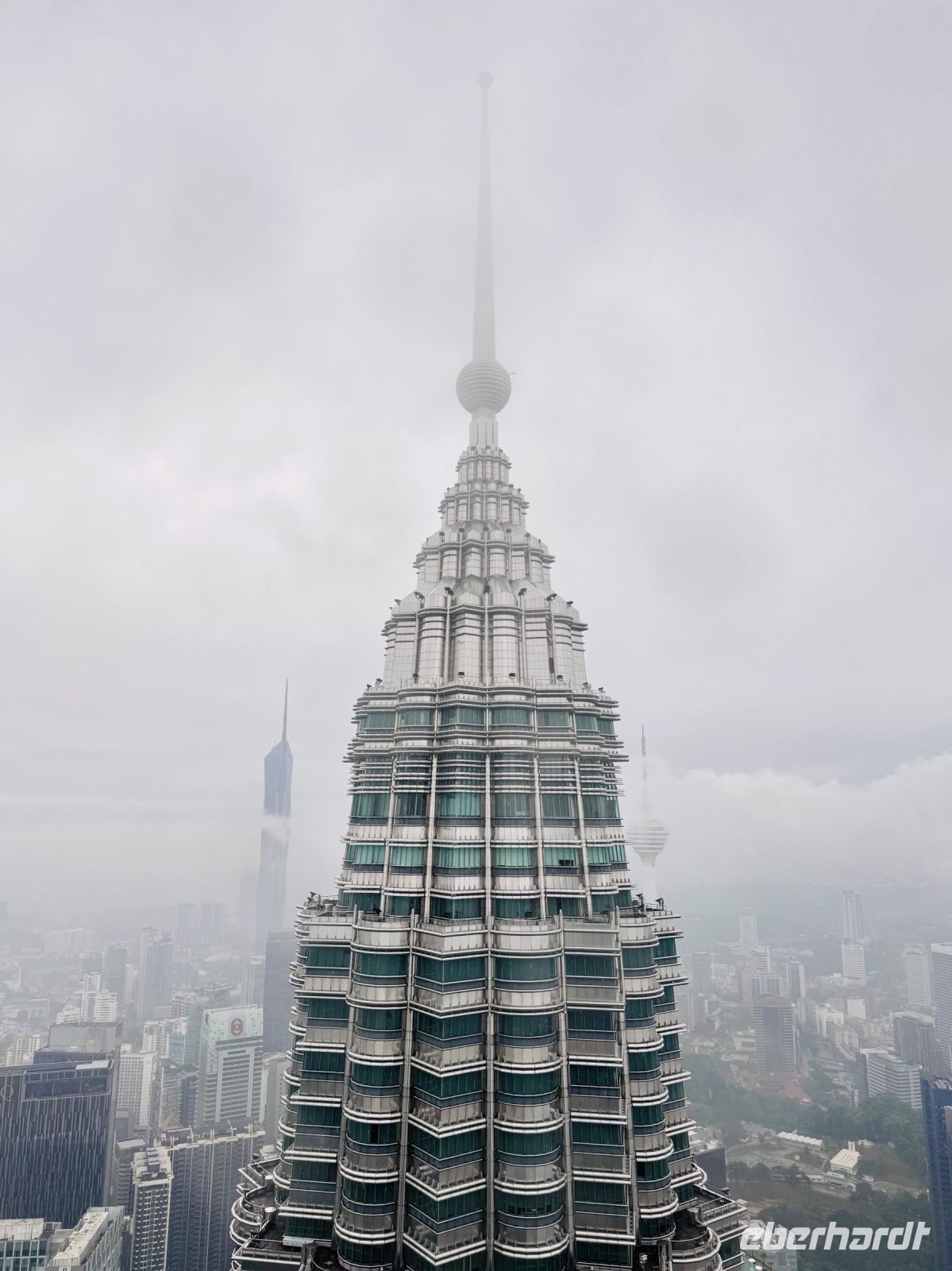 Der Tag beginnt mit einem heftigen tropischen Regenschauer, der die Straßen Kuala Lumpurs in ein undurchdringliches Grau taucht. Dicke Tropfen prasseln auf die Stadt herab, und die Fenster unserer Unterkunft beschlagen von der feuchten Wärme draußen. Heute verabschieden wir uns von der malaysischen Hauptstadt, aber ein letztes Highlight steht noch an: die Petronas Towers. Trotz des Regenvorhangs wagen wir uns zu den imposanten Zwillingstürmen. Schon vom Boden aus ragen sie kaum sichtbar in den wolkenverhangenen Himmel, und der Regen lässt die Glasfassade wie ein riesiges, mystisches Spiegelbild der grauen Wolken erscheinen. Nachdem wir die Sicherheitskontrolle passiert haben, bringt uns der Aufzug zunächst auf die 41. Etage – zur Skybridge, die die beiden Türme verbindet. Die Aussicht ist durch die dichten Wolken begrenzt, doch das Gefühl, auf der Verbindungsbrücke in dieser Höhe zu stehen, ist trotzdem beeindruckend. Anschließend geht es weiter in den 86. Stock. Die Fenster sind von kleinen Wasserperlen bedeckt und trotz des regnerischen Wetters draußen haben wir aus unserer hohen Position eine überraschend klare Sicht: Der Regenvorhang gibt den Blick auf den Fernsehturm und sogar den Merdeka 118 frei, das zweithöchste Gebäude der Welt. Beide Türme ragen aus dem grauen Nebel heraus und lassen die Stadt wie eine Kulisse wirken. Selbst bei diesem trüben Wetter ist die Aussicht auf die Stadt von hier oben atemberaubend und surreal, ein letzter Gruß aus Kuala Lumpur, bevor wir uns wieder nach unten begeben. Unser nächstes Ziel führt uns ins Landesinnere, zum Taman Negara, Malaysias ältestem Nationalpark. Der Weg dorthin verläuft entlang scheinbar endloser Palmölplantagen, die sich wie grüne Wellen in alle Richtungen erstrecken. Hin und wieder tauchen Gummibäume und Maniokpflanzen am Wegesrand auf, und wir fahren an kleinen Ortschaften und vereinzelten Häusern vorbei. Nach rund drei Stunden erreichen wir schließlich den Tembeling-Fluss, wo unser Bus hält. Den letzten Teil der Strecke legen wir per Boot zurück, das uns tief in den Dschungel bringt. Die Bootsfahrt durch den Regenwald ist ein Erlebnis für sich. Während das Boot ruhig über das Wasser gleitet, tauchen rechts und links die dichten Baumkronen des Dschungels auf. Das Grün wirkt endlos und undurchdringlich, und am Flussufer erspähen wir Wasserbüffel, die sich im Fluss abkühlen – ein faszinierender Einblick in die Natur dieser Region. Nach anderthalb Stunden auf dem Wasser erreichen wir das Mutiara Taman Negara Resort, das uns die nächsten zwei Nächte beherbergen wird. Am Abend treffen wir uns zum Essen, bevor noch eine Überraschung wartet: eine Nachtwanderung durch den dichten Dschungel. Im Licht unserer Taschenlampen begeben wir uns auf die Suche nach den nachtaktiven Bewohnern des Waldes. Wir entdecken Schnecken, Geckos, Frösche, Schlange, Spinnen, Riesenameisen und sogar Skorpione. Jeder Schritt raschelt leise durch das Unterholz, während der Klang der Nacht um uns herumflüstert und den Tag mit einem letzten Abenteuer abrundet. Ein Tag voller Kontraste endet – von den imposanten Höhen der Stadt bis zu den stillen, geheimnisvollen Pfaden des Dschungels. Ein unvergessliches Erlebnis zwischen Wolkenkratzern und Wildnis.