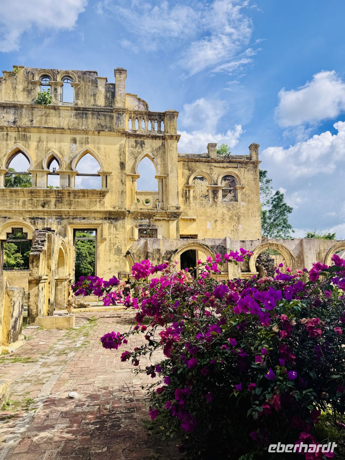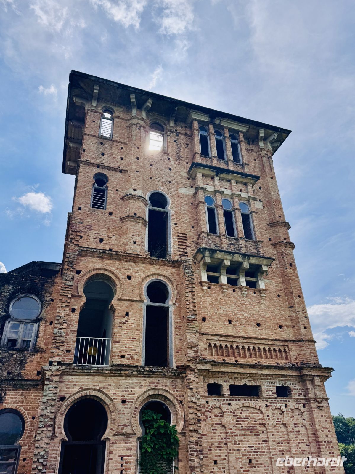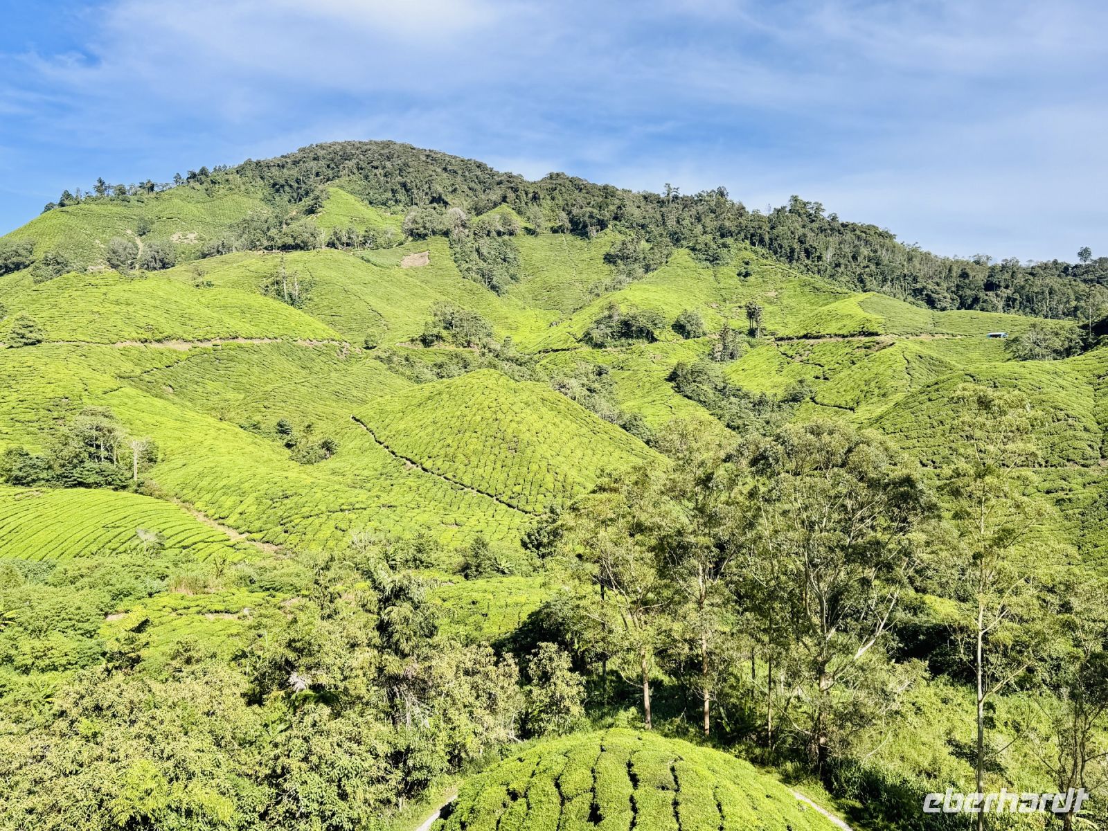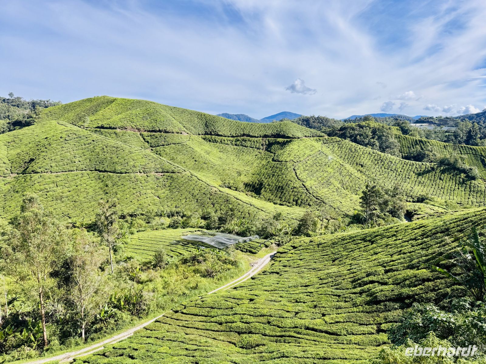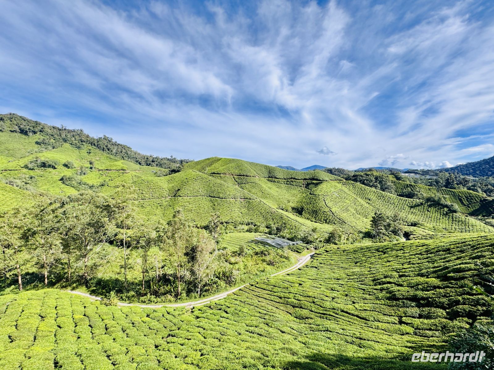 Nach einer ruhigen Nacht in den Bergen beginnt unser Tag mit einem üppigen Frühstück in klarer, frischer Bergluft. Die morgendliche Aussicht ist atemberaubend und macht es schwer, sich von der friedlichen Umgebung zu lösen. Doch wir sind bereit, uns auf den Weg zu machen. Unser heutiges Ziel: die Insel Penang, wo wir die letzten zwei Nächte unserer Reise verbringen werden. Doch bevor wir uns auf die Fahrt begeben, erwartet uns noch ein ganz besonderes Erlebnis – ein Besuch der berühmten BOH-Teeplantage. Wir wechseln kurz den Bus und steigen in einen alten, charmanten Schulbus um, der uns sicher den kurvigen Weg zum BOH Tea Centre hinaufbringt. Die BOH Plantage, eine der bekanntesten Malaysias, wurde bereits 1929 gegründet und erstreckt sich über satte, grüne Hügel. Die Luft ist hier erfüllt vom frischen Duft der Teeblätter, die in präzisen Reihen das Gelände bedecken. Wir erfahren, dass der Tee in einem sorgfältigen Prozess hergestellt wird – vom Pflücken der Blätter über das Welken, Rollen und Fermentieren bis hin zum Trocknen. Dieser traditionelle Prozess und das besondere Bergklima verleihen dem Tee einen einzigartigen Geschmack, der weit über Malaysias Grenzen hinaus beliebt ist. Im Tea Centre erhalten wir eine Führung durch die Fabrik und können zusehen, wie die Teeblätter in modernen Maschinen verarbeitet werden, während unsere Reiseleiterin Suzie jeden Schritt erklärt. Von der Terrasse des Zentrums genießen wir einen weiten Blick über die endlosen Hügel der Teeplantage – ein Meer aus Grün, das sich in die Ferne zieht. Nach einer kleinen Teeprobe und dem Kauf einiger aromatischer Teesouvenirs setzen wir unsere Fahrt fort. Unser nächstes Ziel auf dem Weg nach Penang ist die Stadt Ipoh. Die Straße windet sich in engen Serpentinen bergab ins Tal, und die Ausblicke auf die Bergwelt verschwinden langsam hinter uns. In Ipoh legen wir eine Mittagspause ein und stärken uns in einem Restaurant mit köstlichen lokalen Gerichten. Nicht weit von Ipoh entfernt machen wir einen letzten Stopp bei einer kuriosen Attraktion: Kellie’s Castle. Das imposante, halb fertiggestellte Herrenhaus, erbaut vom schottischen Plantagenbesitzer William Kellie-Smith im frühen 20. Jahrhundert, wirkt mit seinen geheimnisvollen, unvollendeten Gängen und versteckten Treppen wie ein Überbleibsel einer anderen Zeit. Die Legende besagt, dass das Gebäude verflucht ist, da sein Bau nach dem plötzlichen Tod von Kellie nie vollendet wurde. Heute lockt das verwitterte Schloss Besucher an, die in die Geschichte und Mysterien des Herrenhauses eintauchen wollen. Am späten Nachmittag setzen wir unsere Reise fort und erreichen schließlich die Insel Penang. Hier herrscht ein ganz anderes Klima und ein lebendiges Treiben, das uns sofort in seinen Bann zieht. Im warmen Licht des Abends beziehen wir unser Hotel und lassen den Tag bei einem ersten Streifzug durch die Straßen ausklingen – bereit für die letzten Abenteuer unserer Reise.