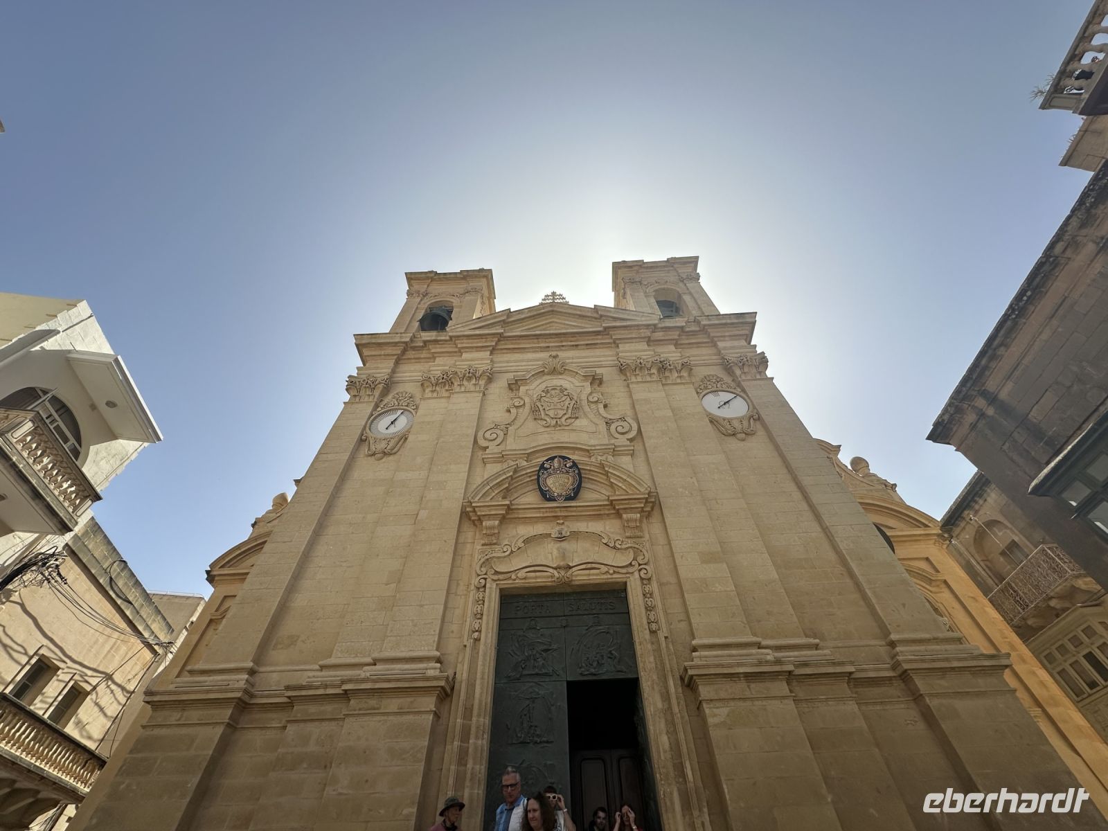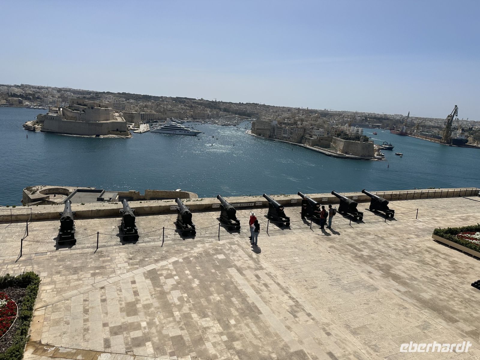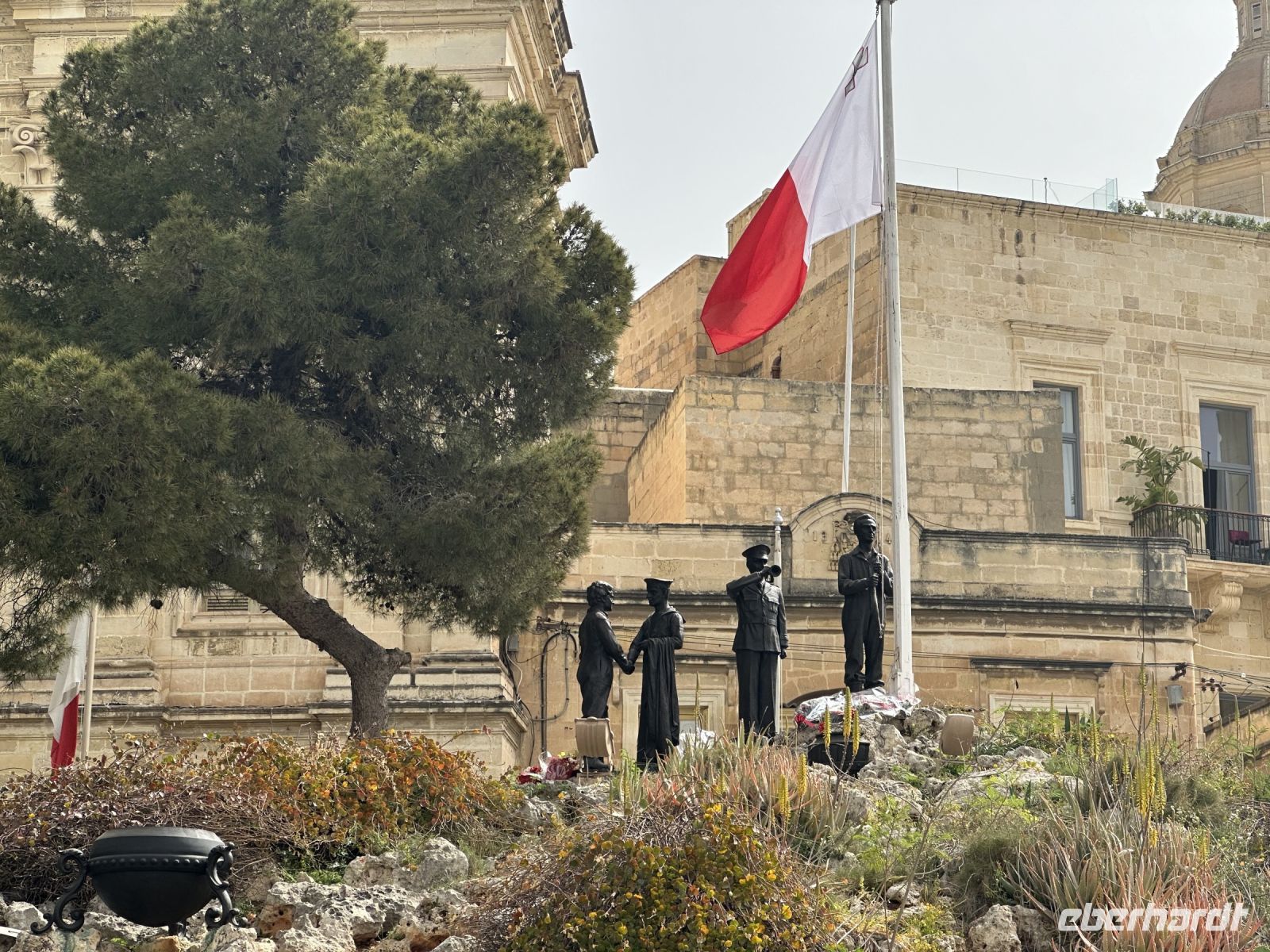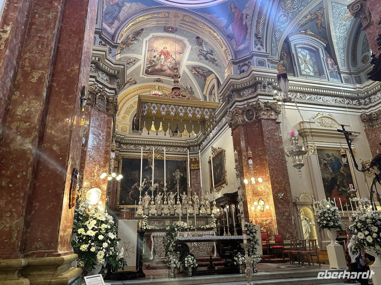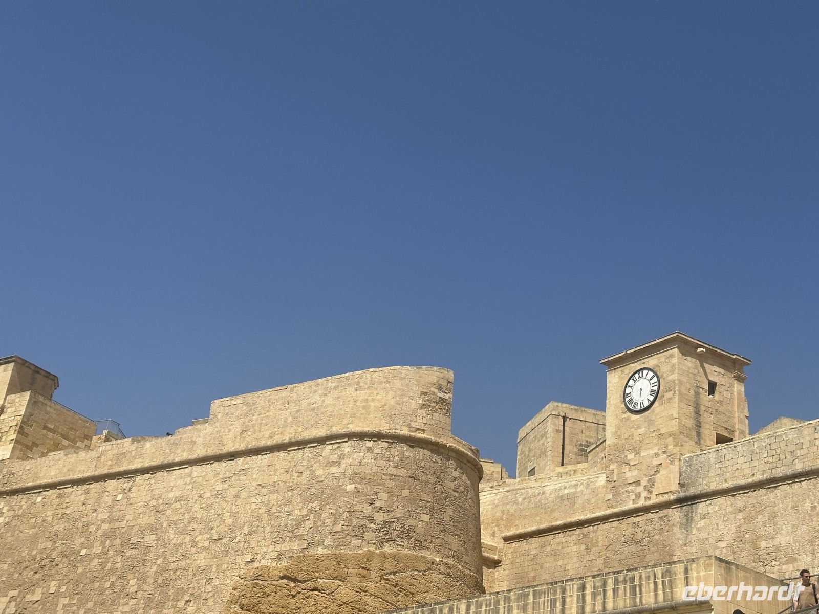 Um nach Valetta zu gelangen, spazieren wir zunächst ein Stück durch Floriana. Hier begrüßt uns als erstes ein Denkmal, das an die Unabhängigkeit Maltas 1964 erinnert. Am Tritonenbrunnen erreichen wir dann die Stadtgrenze zu Valetta. Wir spazieren durch eine der Hauptstraßen der Stadt, links und rechts gesäumt von modernen und historischen Gebäuden. 2011 bis 2015 wurde das heutige Parlamentsgebäude errichtet. Voll ist es hier. Viele Besucher scheint es nach Valetta zu ziehen. Sie flanieren wie wir die Straßen entlang und bevölkern die Restaurants und Cafés. Hanne besucht mit uns die Schiffswrack Kathedrale, die dem heiligen Paulus gewidmet ist. Hier ist ein Teil der Säule zu sehen, auf der er später von den Römern geköpft wurde sowie ein Teil von seinem Handgelenk, das als Reliquie verehrt wird. Apostel Paulus soll im Jahr 60 mit fast dreihundert Gefährten auf dem Weg nach Rom gewesen sein, als sie ein Sturm an der Küste Maltas scheitern ließ. Drei Monate hielt sich Paulus auf Malta auf und Missioniert seine Bewohner. Noch heute ist die Mehrheit der Bewohner Maltas römisch-katholisch und stolz darauf, von Paulus bekehrt worden zu sein. Wir besuchen nun die Upper Barakka Gärten, wo pünktlich um zwölf eine Kanone abgefeuert wird, so dass alle ihre Uhren danach abgleichen können. Fast unser letzter Besuch gilt nun einer der prächtigsten Kathedralen auf Malta – der St. Johannes Kathedrale. Der prächtige Marmorfußboden ist mit vierhundert farbigen Grabplatten bedeckt, wo Persönlichkeiten, die zur Zeit der Ritter lebten, ihre letzte Ruhe fanden. Denkmäler erinnern an die vielen Großmeister des Ordens, prachtvolle Seitenaltäre sind den verschiedenen Zungen gewidmet. Überall glänzen die Wände in Gold, sind kunstvoll und reich dekoriert.