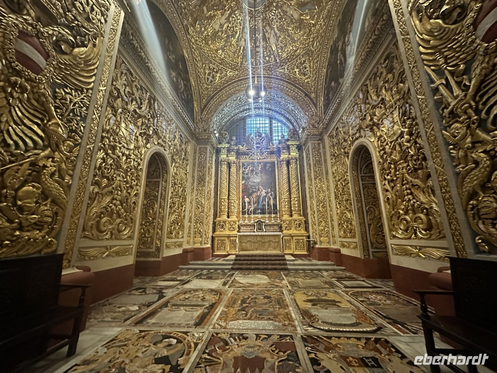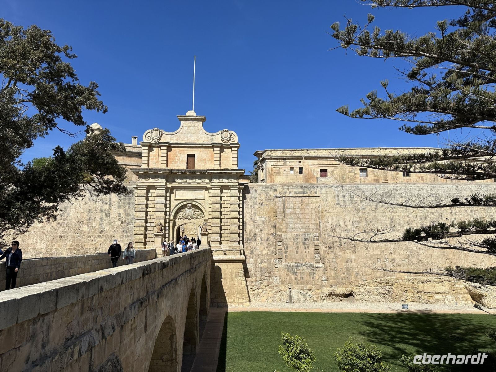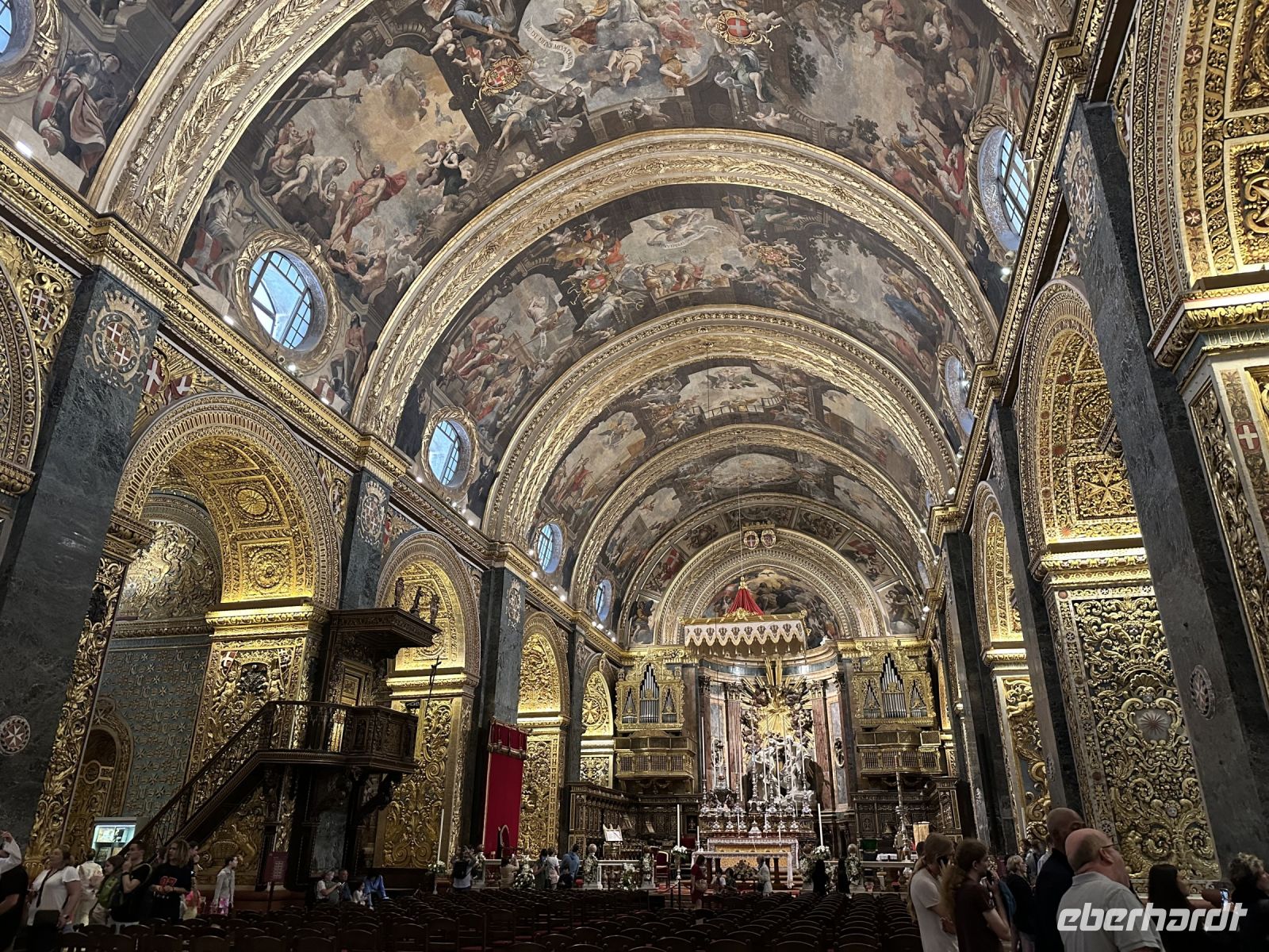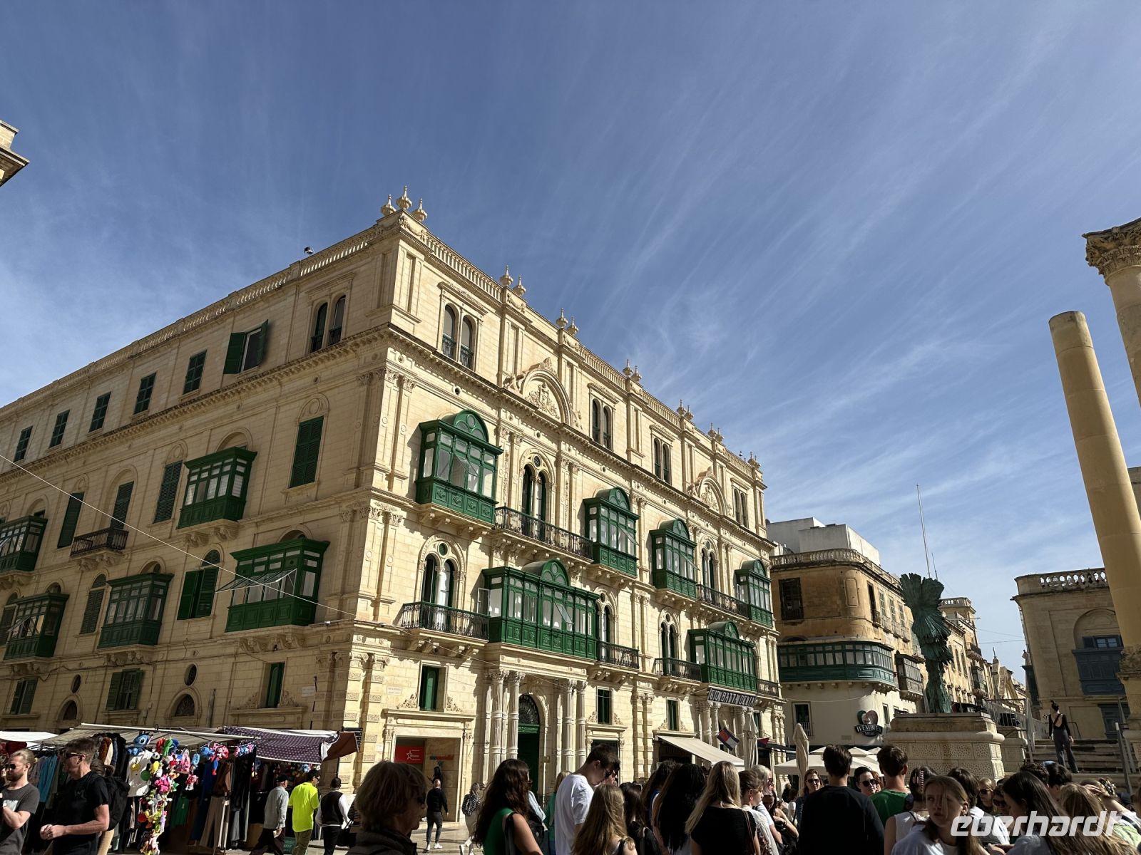 Um nach Valetta zu gelangen, spazieren wir zunächst ein Stück durch Floriana. Hier begrüßt uns als erstes ein Denkmal, das an die Unabhängigkeit Maltas 1964 erinnert. Am Tritonenbrunnen erreichen wir dann die Stadtgrenze zu Valetta. Wir spazieren durch eine der Hauptstraßen der Stadt, links und rechts gesäumt von modernen und historischen Gebäuden. 2011 bis 2015 wurde das heutige Parlamentsgebäude errichtet. Voll ist es hier. Viele Besucher scheint es nach Valetta zu ziehen. Sie flanieren wie wir die Straßen entlang und bevölkern die Restaurants und Cafés. Hanne besucht mit uns die Schiffswrack Kathedrale, die dem heiligen Paulus gewidmet ist. Hier ist ein Teil der Säule zu sehen, auf der er später von den Römern geköpft wurde sowie ein Teil von seinem Handgelenk, das als Reliquie verehrt wird. Apostel Paulus soll im Jahr 60 mit fast dreihundert Gefährten auf dem Weg nach Rom gewesen sein, als sie ein Sturm an der Küste Maltas scheitern ließ. Drei Monate hielt sich Paulus auf Malta auf und Missioniert seine Bewohner. Noch heute ist die Mehrheit der Bewohner Maltas römisch-katholisch und stolz darauf, von Paulus bekehrt worden zu sein. Wir besuchen nun die Upper Barakka Gärten, wo pünktlich um zwölf eine Kanone abgefeuert wird, so dass alle ihre Uhren danach abgleichen können. Fast unser letzter Besuch gilt nun einer der prächtigsten Kathedralen auf Malta – der St. Johannes Kathedrale. Der prächtige Marmorfußboden ist mit vierhundert farbigen Grabplatten bedeckt, wo Persönlichkeiten, die zur Zeit der Ritter lebten, ihre letzte Ruhe fanden. Denkmäler erinnern an die vielen Großmeister des Ordens, prachtvolle Seitenaltäre sind den verschiedenen Zungen gewidmet. Überall glänzen die Wände in Gold, sind kunstvoll und reich dekoriert.