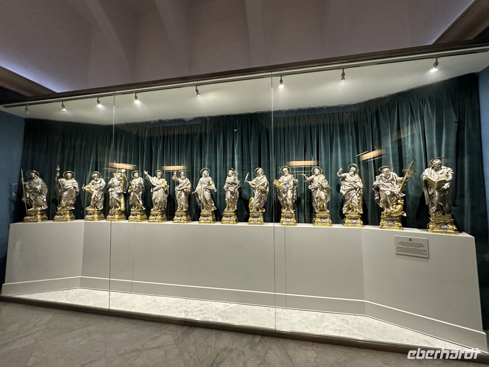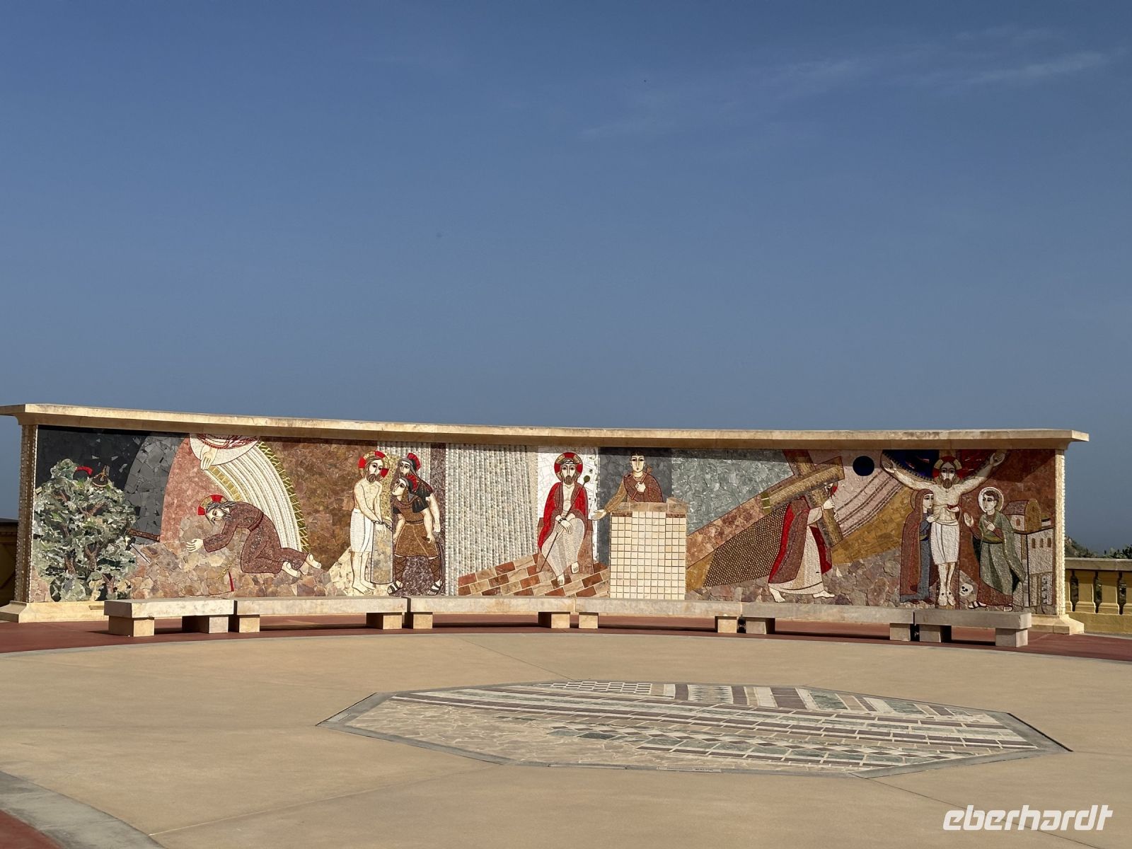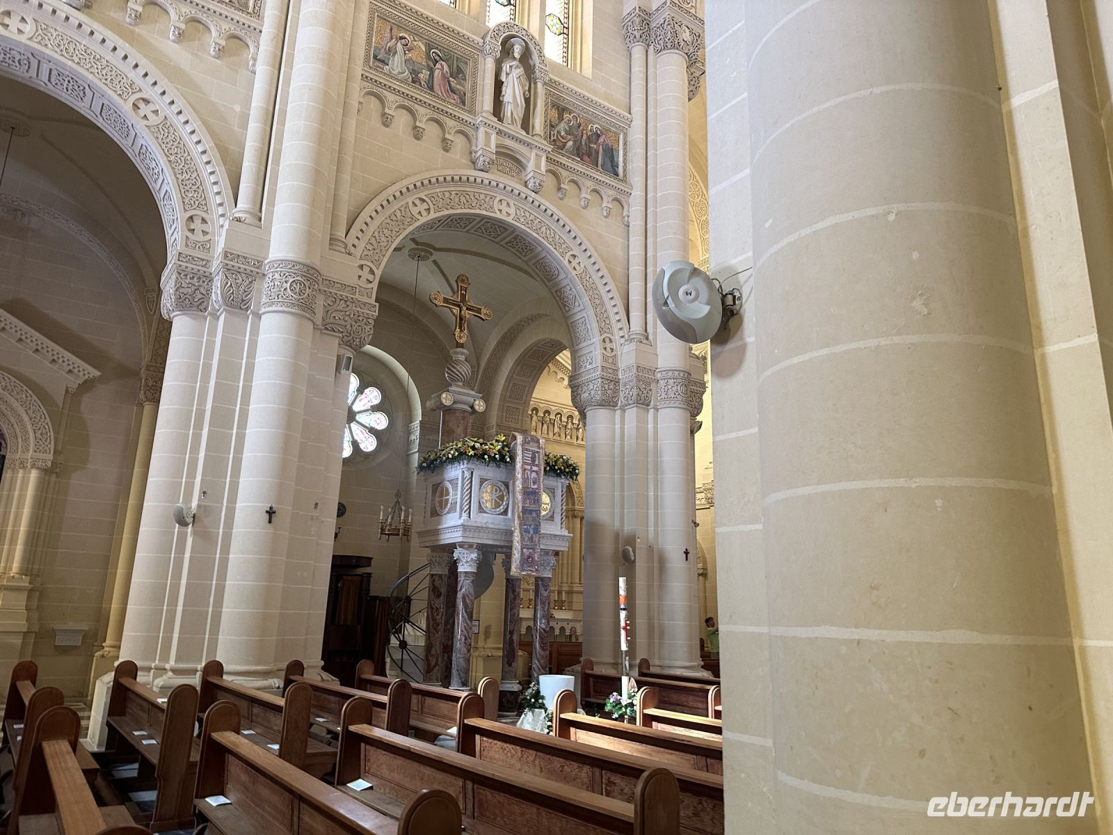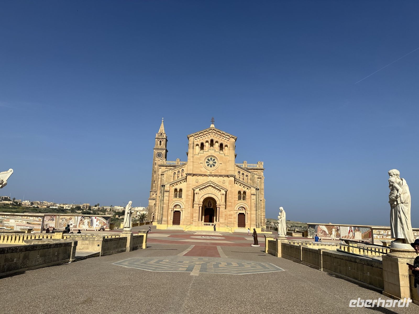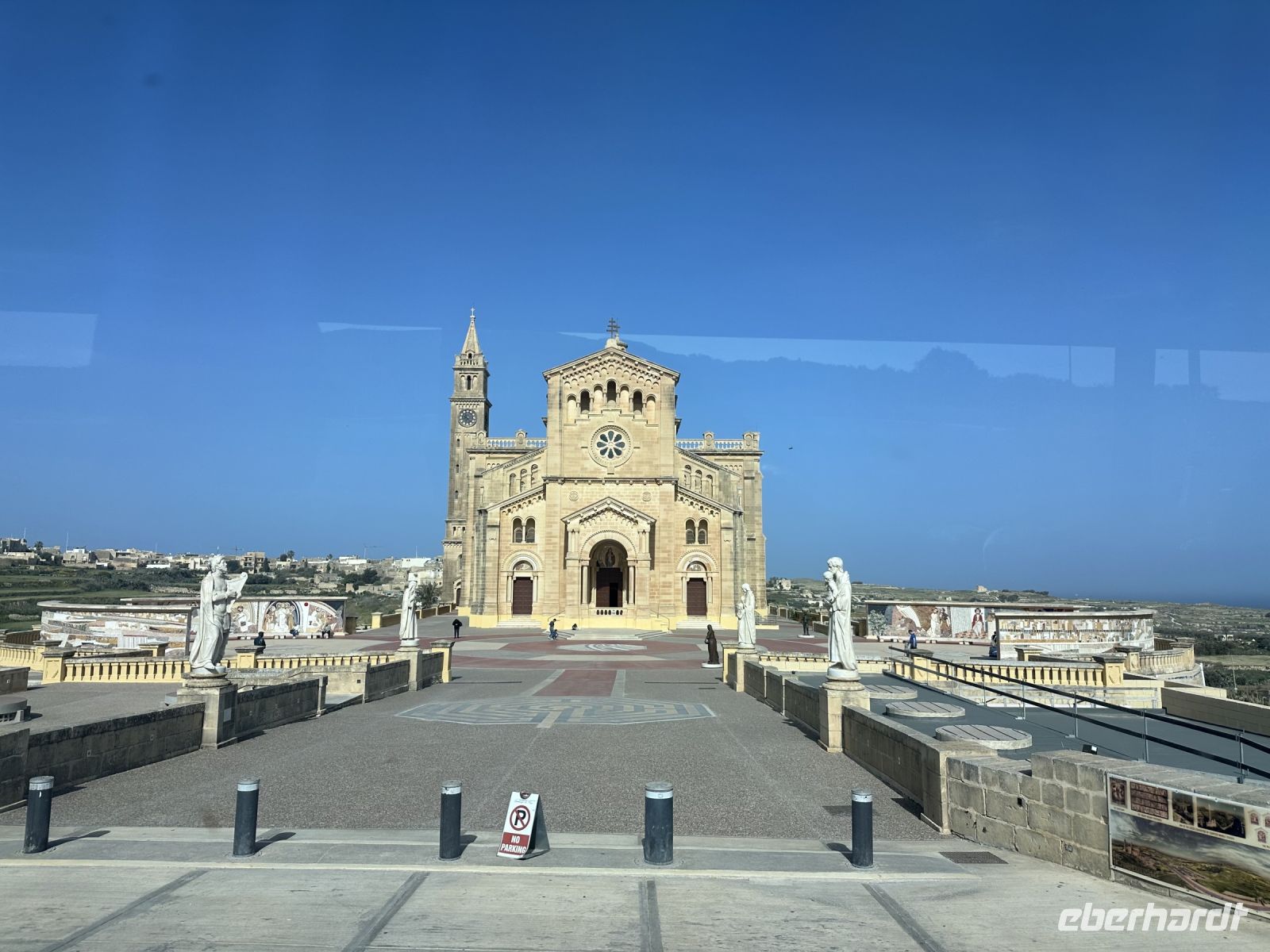 Mit der Fähre setzen wir nach Gozo über. Unseren Bus nehmen wir nicht mit, auf Gozo erwartet uns ein anderer Bus mit einem anderen Fahrer. Diesem müssen wir auch noch im Nachhinein Respekt zollen, wie geschickt er den Bus durch die wirklich sehr schmalen Gassen von Gozo gelenkt hat. Laut unserer Reiseleiterin Hanne sind nur die Straßen von Gozo in Ordnung, auf denen der Papst bei seinem Besuch gefahren ist, alle anderen gleichen Huckelpisten. Uns macht das nichts aus, unsere gute Laune bleibt erhalten. Wir besuchen die Kirche der heiligen Madonna ta‘ Pinu, die 1932 geweiht und von Papst Pius XI. zur Basilika erhoben wurde. Die Kirche umgibt ein Halbkreis von kostbaren Mosaiken, hinter dem Altar im Innenraum der Kirche gibt es einen Raum mit vielen Votivgaben von Menschen, die sich Hilfe der heiligen Madonna erhofften. Jedes Jahr gibt es eine Wallfahrt, die an eine Marienerscheinung erinnert. 1883 kam Karmni Grima, eine Frau aus Gharb, an der Kapelle vorbei, die damals anstelle der heutigen Basilika stand. Aus dem Inneren vernahm sie eine Stimme, die sie aufforderte drei Ave Maria zu sprechen. Nachdem sie das tat, wurde ihre schwer kranke Mutter wie durch ein Wunder gesund. 1990 besuchte Papst Johannes Paul II. auf seiner Malta-Rundreise das Heiligtum.