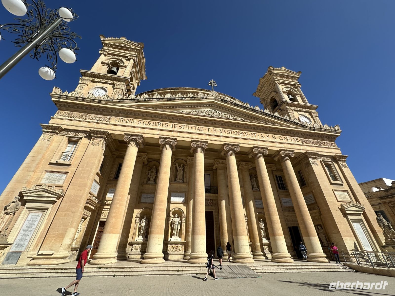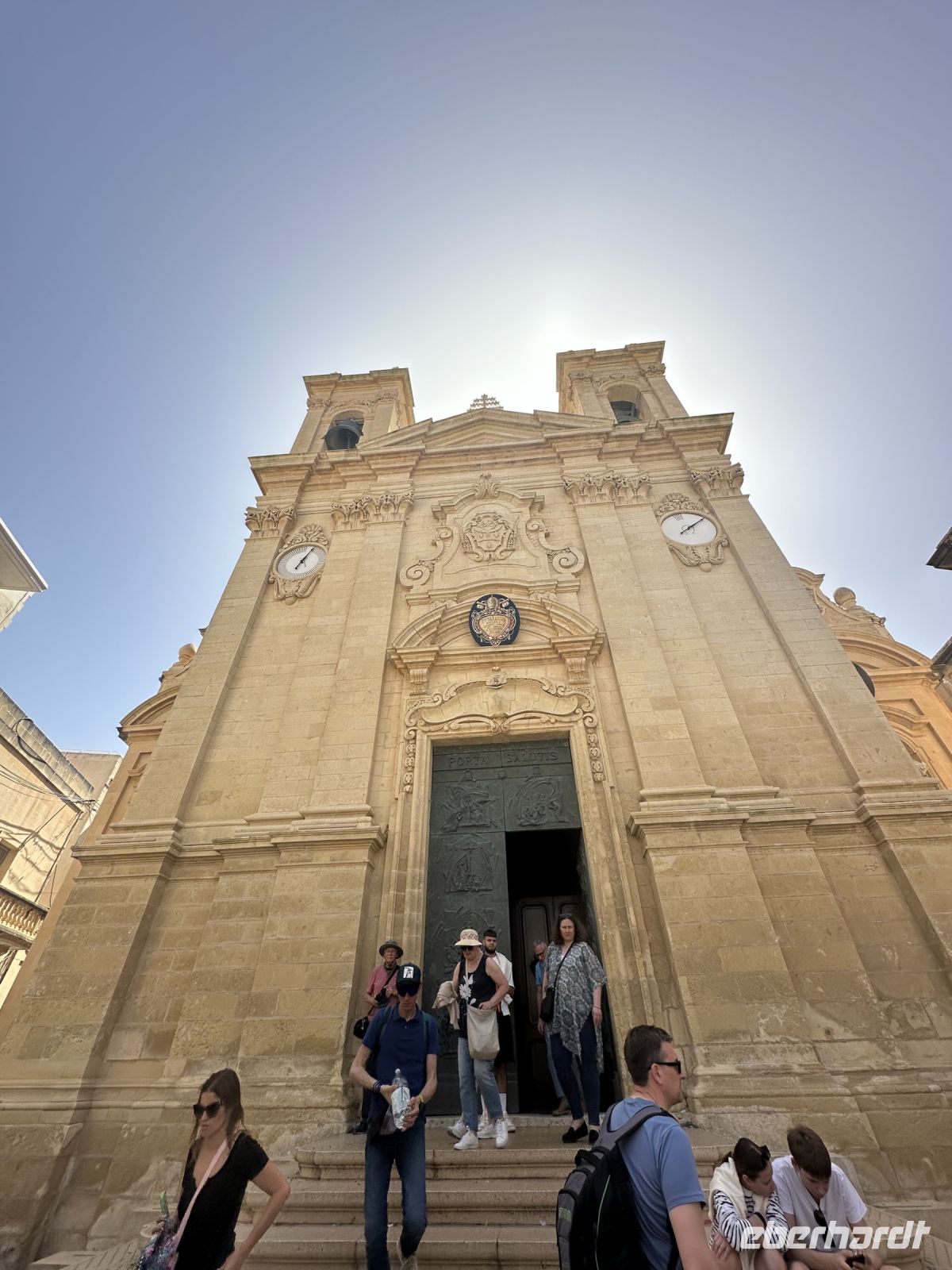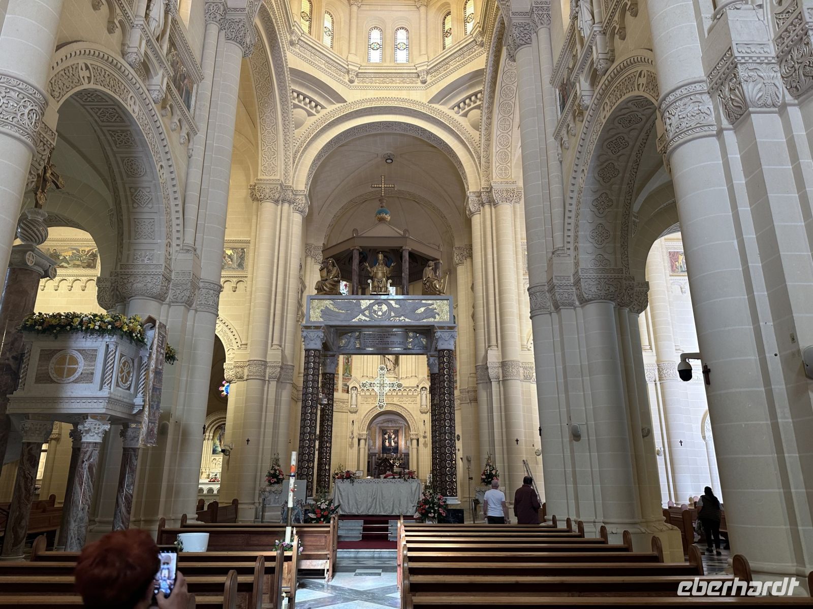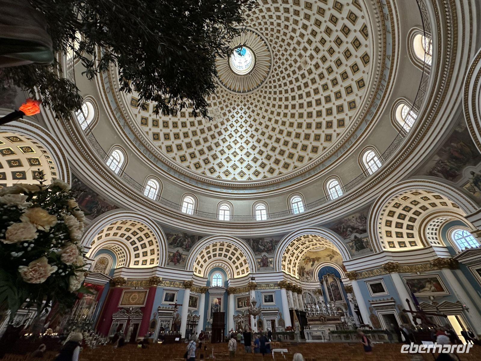 Zum Frühstück bedienen wir uns am reichhaltigen und abwechslungsreichen Buffet und einige Gäste trauen sich schon heute, auf der Terrasse zu frühstücken. Kurz vor neun treffen wir unsere örtliche Reiseleiterin Hanne, die uns in den nächsten Tagen begleiten wird. Auch der Bus ist pünktlich und so beginnt unser erster Tagesausflug auf Malta. Zunächst fahren wir nach Mosta, einer Stadt die sich im Herzen der Insel, nordwestlich von Valetta befindet. Bevor wir die Rotunda, den Mosta-Dom besuchen, kommen wir an einem Backwarenhändler vorbei. Dieser verkauft neben seinem täglichen Brot auch besondere Osterspezialitäten. Hanne erklärt, dass es für die Einwohner auch möglich ist, Brot zu kaufen, wenn sie in der Woche auf der Arbeit und nicht zu Hause sind. Der Händler hängt das Brot in einem Beutel an die Haustür und abgerechnet wird am nächsten Sonnabend, wenn alle wieder frei haben. Wir spazieren weiter zur Rotunda. Diese römisch-katholische Kirche ist vor allem für ihre große freistehende Kuppel bekannt, die mit einem Durchmesser von 37 Metern und einer Höhe von 61 Metern zu den größten Kuppeln Europas gehört. Im zweiten Weltkrieg wurde die Kuppel von einer Bombe getroffen, die aber nicht explodierte, was seitdem als Wunder von Mosta bekannt ist. Im Dom zeigt uns Hanna die vielen kunstvollen Details, Fresken, Altäre und Skulpturen. Alles steht bereit für das kommende Osterwochenende. Eine weitere Besonderheit sind die Uhren an der Außenfassade. Eine Uhr zeigt, wie für Uhren üblich die Zeit an, während die andere aber das aktuelle Datum anzeigt (nicht digital).