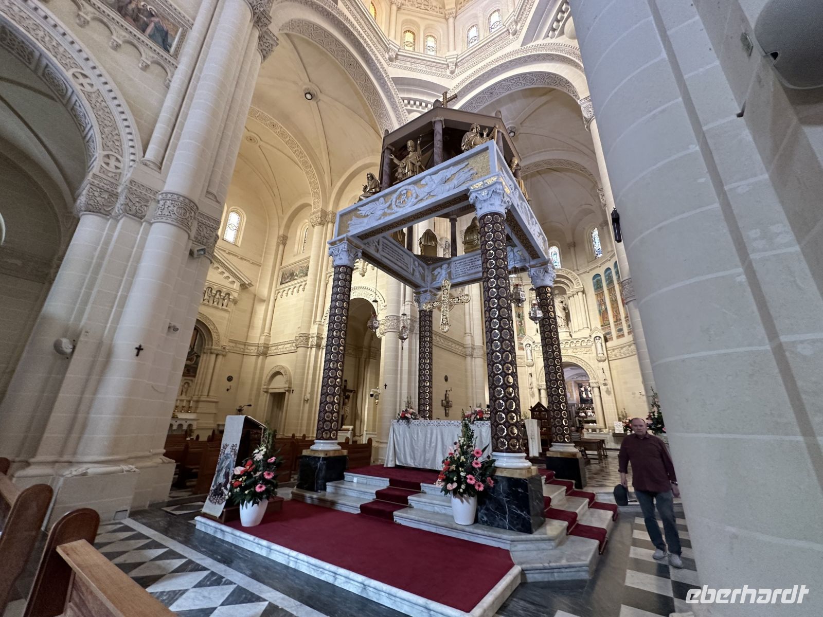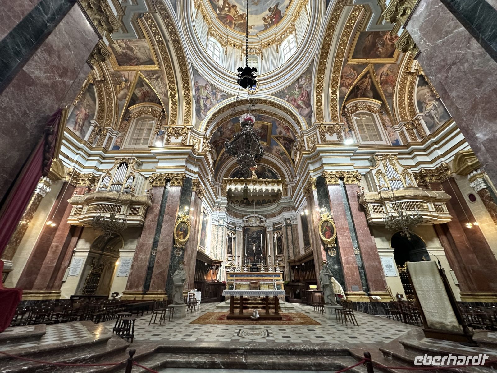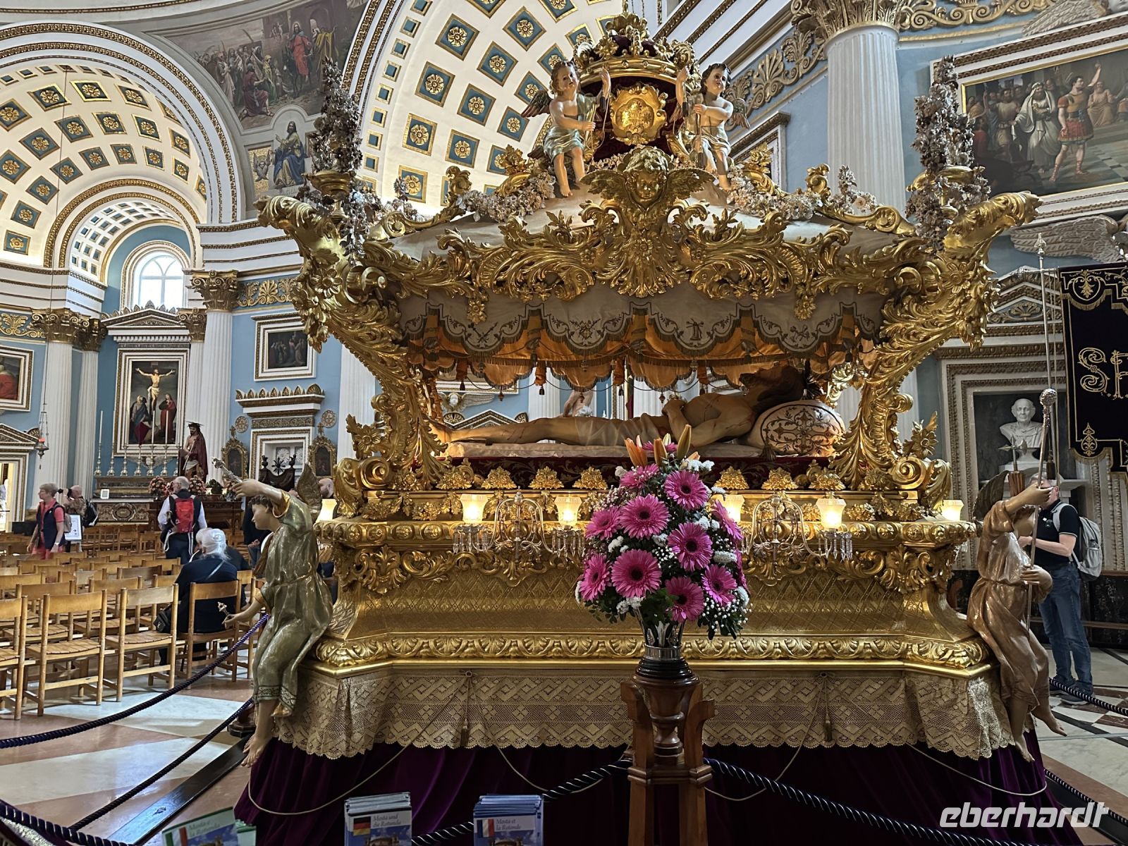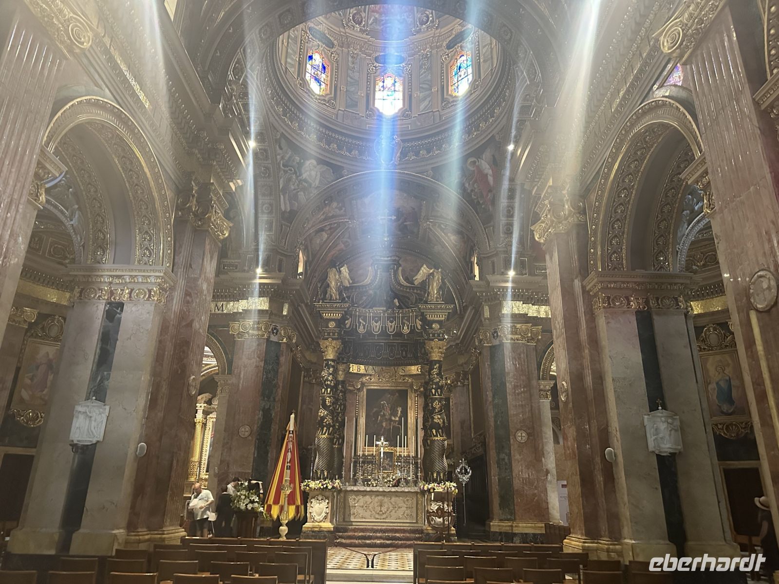 Zum Frühstück bedienen wir uns am reichhaltigen und abwechslungsreichen Buffet und einige Gäste trauen sich schon heute, auf der Terrasse zu frühstücken. Kurz vor neun treffen wir unsere örtliche Reiseleiterin Hanne, die uns in den nächsten Tagen begleiten wird. Auch der Bus ist pünktlich und so beginnt unser erster Tagesausflug auf Malta. Zunächst fahren wir nach Mosta, einer Stadt die sich im Herzen der Insel, nordwestlich von Valetta befindet. Bevor wir die Rotunda, den Mosta-Dom besuchen, kommen wir an einem Backwarenhändler vorbei. Dieser verkauft neben seinem täglichen Brot auch besondere Osterspezialitäten. Hanne erklärt, dass es für die Einwohner auch möglich ist, Brot zu kaufen, wenn sie in der Woche auf der Arbeit und nicht zu Hause sind. Der Händler hängt das Brot in einem Beutel an die Haustür und abgerechnet wird am nächsten Sonnabend, wenn alle wieder frei haben. Wir spazieren weiter zur Rotunda. Diese römisch-katholische Kirche ist vor allem für ihre große freistehende Kuppel bekannt, die mit einem Durchmesser von 37 Metern und einer Höhe von 61 Metern zu den größten Kuppeln Europas gehört. Im zweiten Weltkrieg wurde die Kuppel von einer Bombe getroffen, die aber nicht explodierte, was seitdem als Wunder von Mosta bekannt ist. Im Dom zeigt uns Hanna die vielen kunstvollen Details, Fresken, Altäre und Skulpturen. Alles steht bereit für das kommende Osterwochenende. Eine weitere Besonderheit sind die Uhren an der Außenfassade. Eine Uhr zeigt, wie für Uhren üblich die Zeit an, während die andere aber das aktuelle Datum anzeigt (nicht digital).