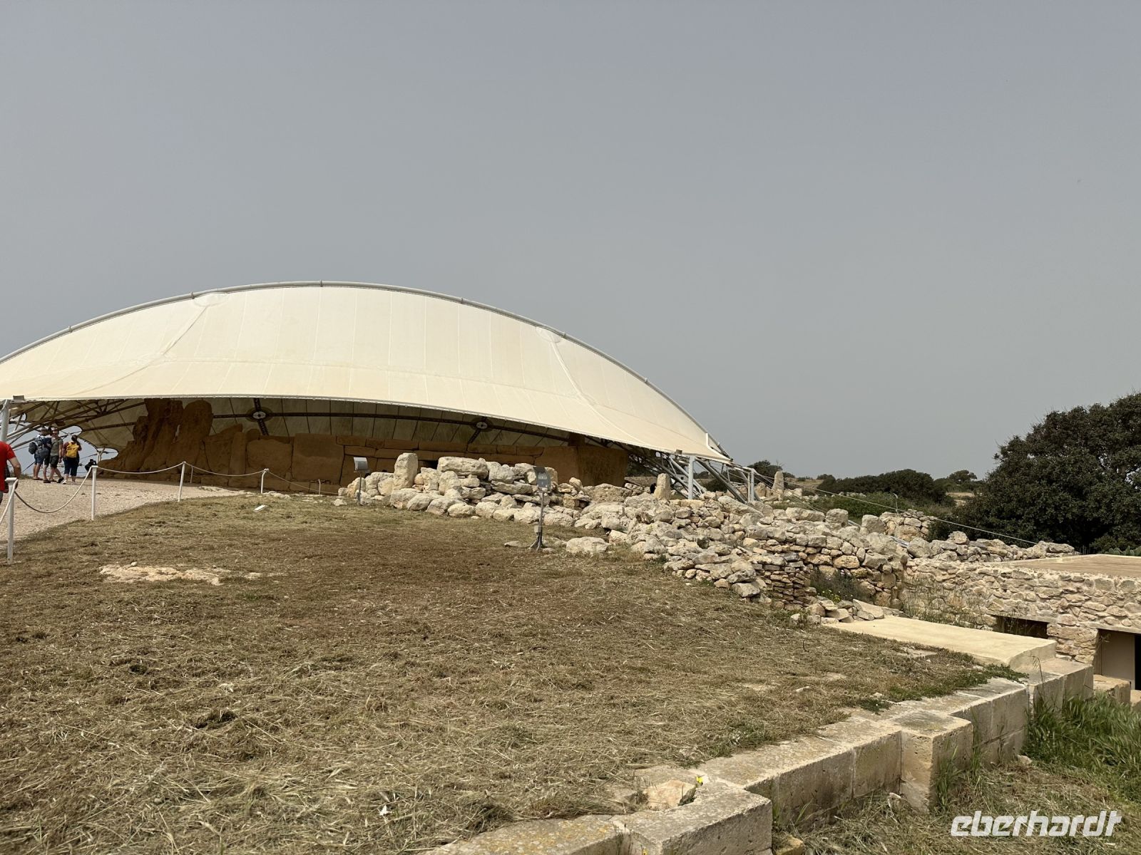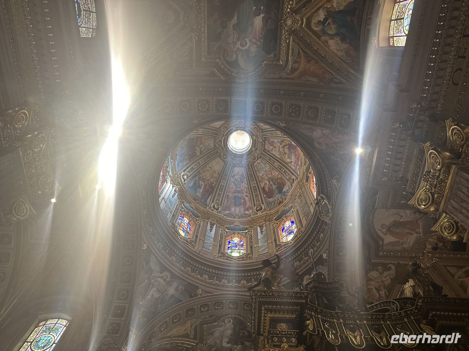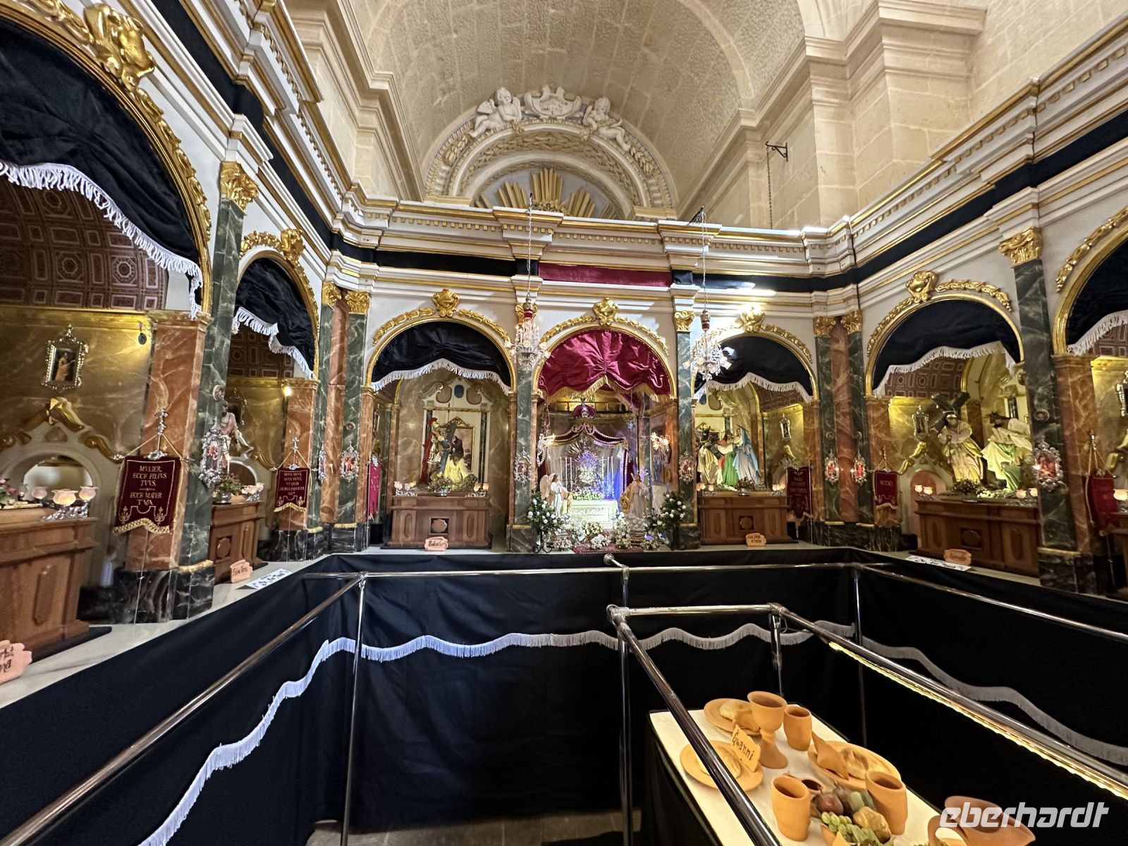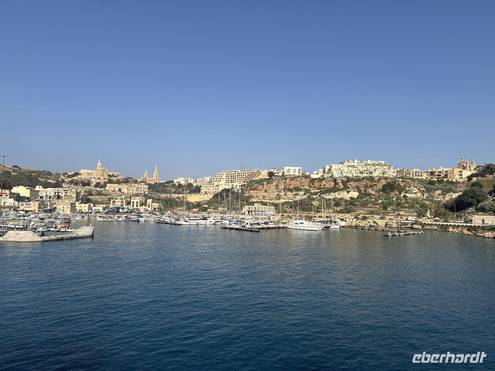 Zum Frühstück bedienen wir uns am reichhaltigen und abwechslungsreichen Buffet und einige Gäste trauen sich schon heute, auf der Terrasse zu frühstücken. Kurz vor neun treffen wir unsere örtliche Reiseleiterin Hanne, die uns in den nächsten Tagen begleiten wird. Auch der Bus ist pünktlich und so beginnt unser erster Tagesausflug auf Malta. Zunächst fahren wir nach Mosta, einer Stadt die sich im Herzen der Insel, nordwestlich von Valetta befindet. Bevor wir die Rotunda, den Mosta-Dom besuchen, kommen wir an einem Backwarenhändler vorbei. Dieser verkauft neben seinem täglichen Brot auch besondere Osterspezialitäten. Hanne erklärt, dass es für die Einwohner auch möglich ist, Brot zu kaufen, wenn sie in der Woche auf der Arbeit und nicht zu Hause sind. Der Händler hängt das Brot in einem Beutel an die Haustür und abgerechnet wird am nächsten Sonnabend, wenn alle wieder frei haben. Wir spazieren weiter zur Rotunda. Diese römisch-katholische Kirche ist vor allem für ihre große freistehende Kuppel bekannt, die mit einem Durchmesser von 37 Metern und einer Höhe von 61 Metern zu den größten Kuppeln Europas gehört. Im zweiten Weltkrieg wurde die Kuppel von einer Bombe getroffen, die aber nicht explodierte, was seitdem als Wunder von Mosta bekannt ist. Im Dom zeigt uns Hanna die vielen kunstvollen Details, Fresken, Altäre und Skulpturen. Alles steht bereit für das kommende Osterwochenende. Eine weitere Besonderheit sind die Uhren an der Außenfassade. Eine Uhr zeigt, wie für Uhren üblich die Zeit an, während die andere aber das aktuelle Datum anzeigt (nicht digital).