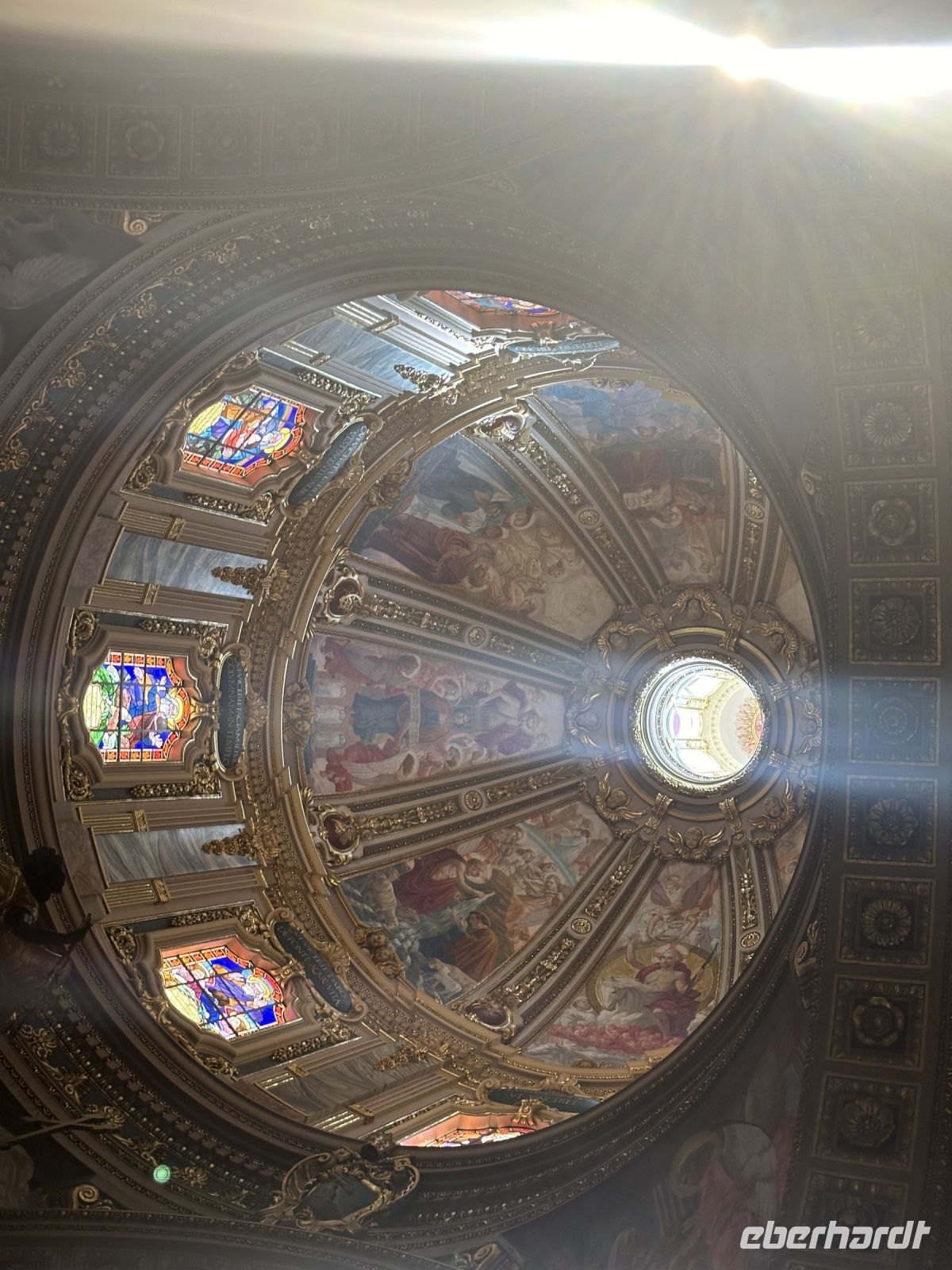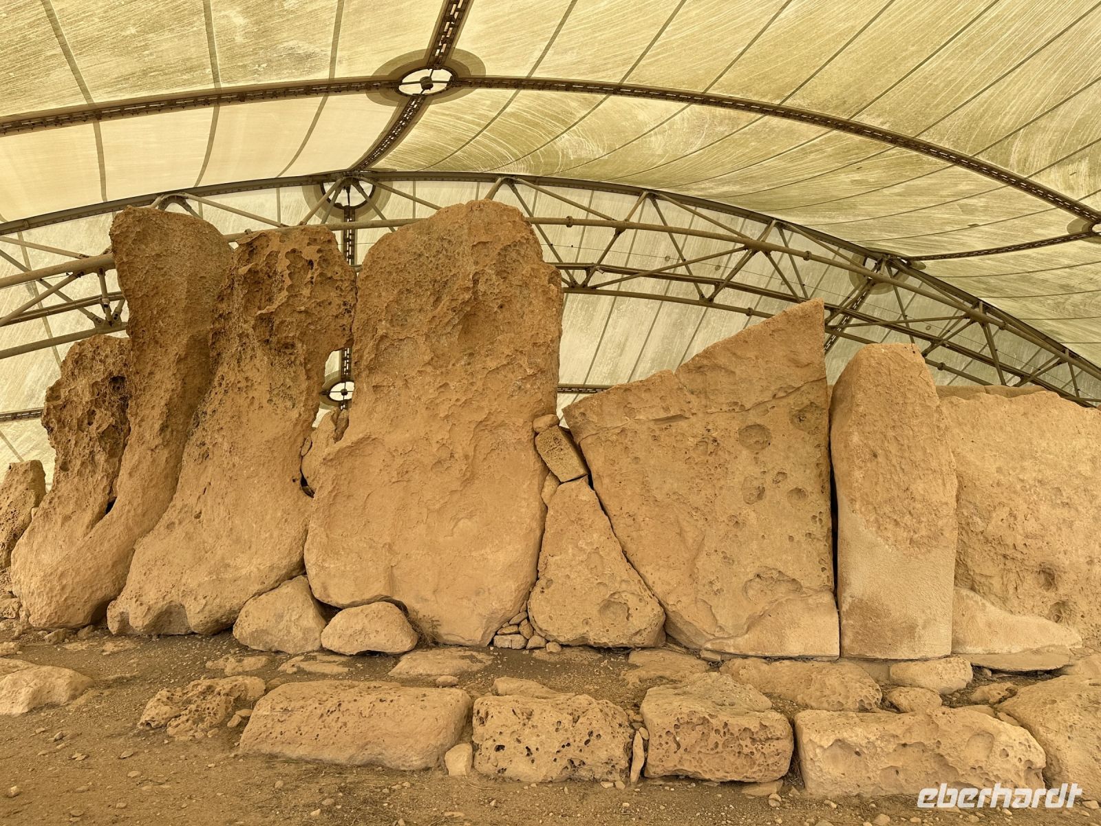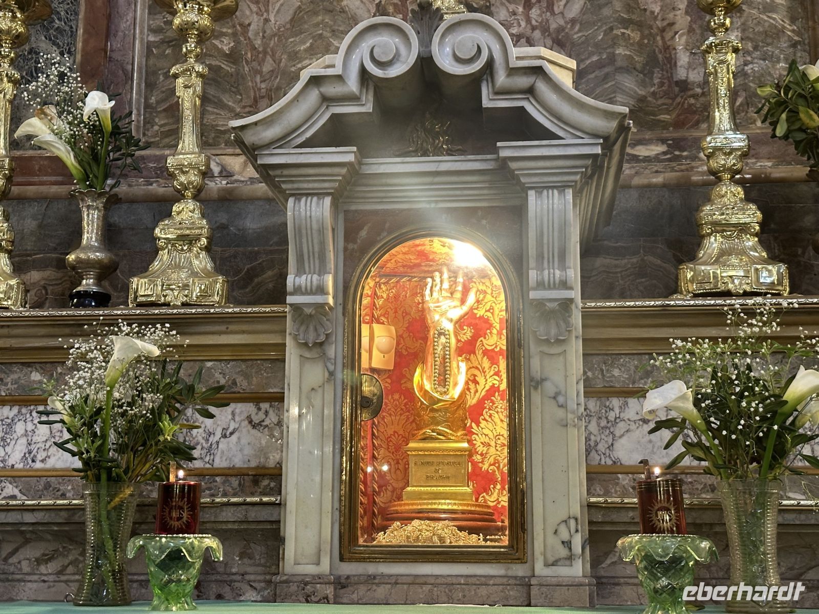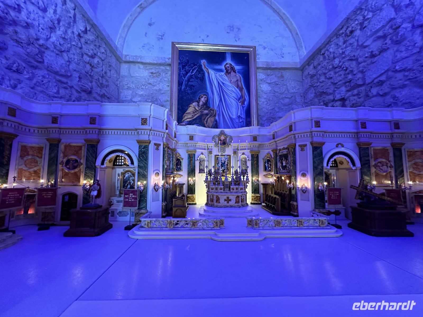 Zum Frühstück bedienen wir uns am reichhaltigen und abwechslungsreichen Buffet und einige Gäste trauen sich schon heute, auf der Terrasse zu frühstücken. Kurz vor neun treffen wir unsere örtliche Reiseleiterin Hanne, die uns in den nächsten Tagen begleiten wird. Auch der Bus ist pünktlich und so beginnt unser erster Tagesausflug auf Malta. Zunächst fahren wir nach Mosta, einer Stadt die sich im Herzen der Insel, nordwestlich von Valetta befindet. Bevor wir die Rotunda, den Mosta-Dom besuchen, kommen wir an einem Backwarenhändler vorbei. Dieser verkauft neben seinem täglichen Brot auch besondere Osterspezialitäten. Hanne erklärt, dass es für die Einwohner auch möglich ist, Brot zu kaufen, wenn sie in der Woche auf der Arbeit und nicht zu Hause sind. Der Händler hängt das Brot in einem Beutel an die Haustür und abgerechnet wird am nächsten Sonnabend, wenn alle wieder frei haben. Wir spazieren weiter zur Rotunda. Diese römisch-katholische Kirche ist vor allem für ihre große freistehende Kuppel bekannt, die mit einem Durchmesser von 37 Metern und einer Höhe von 61 Metern zu den größten Kuppeln Europas gehört. Im zweiten Weltkrieg wurde die Kuppel von einer Bombe getroffen, die aber nicht explodierte, was seitdem als Wunder von Mosta bekannt ist. Im Dom zeigt uns Hanna die vielen kunstvollen Details, Fresken, Altäre und Skulpturen. Alles steht bereit für das kommende Osterwochenende. Eine weitere Besonderheit sind die Uhren an der Außenfassade. Eine Uhr zeigt, wie für Uhren üblich die Zeit an, während die andere aber das aktuelle Datum anzeigt (nicht digital).