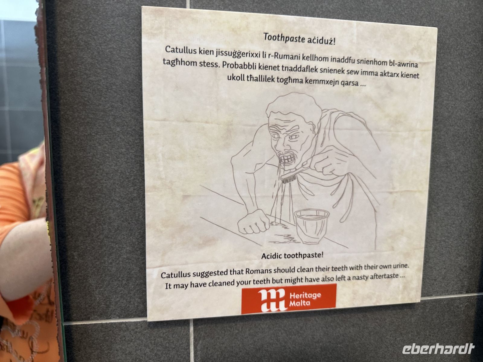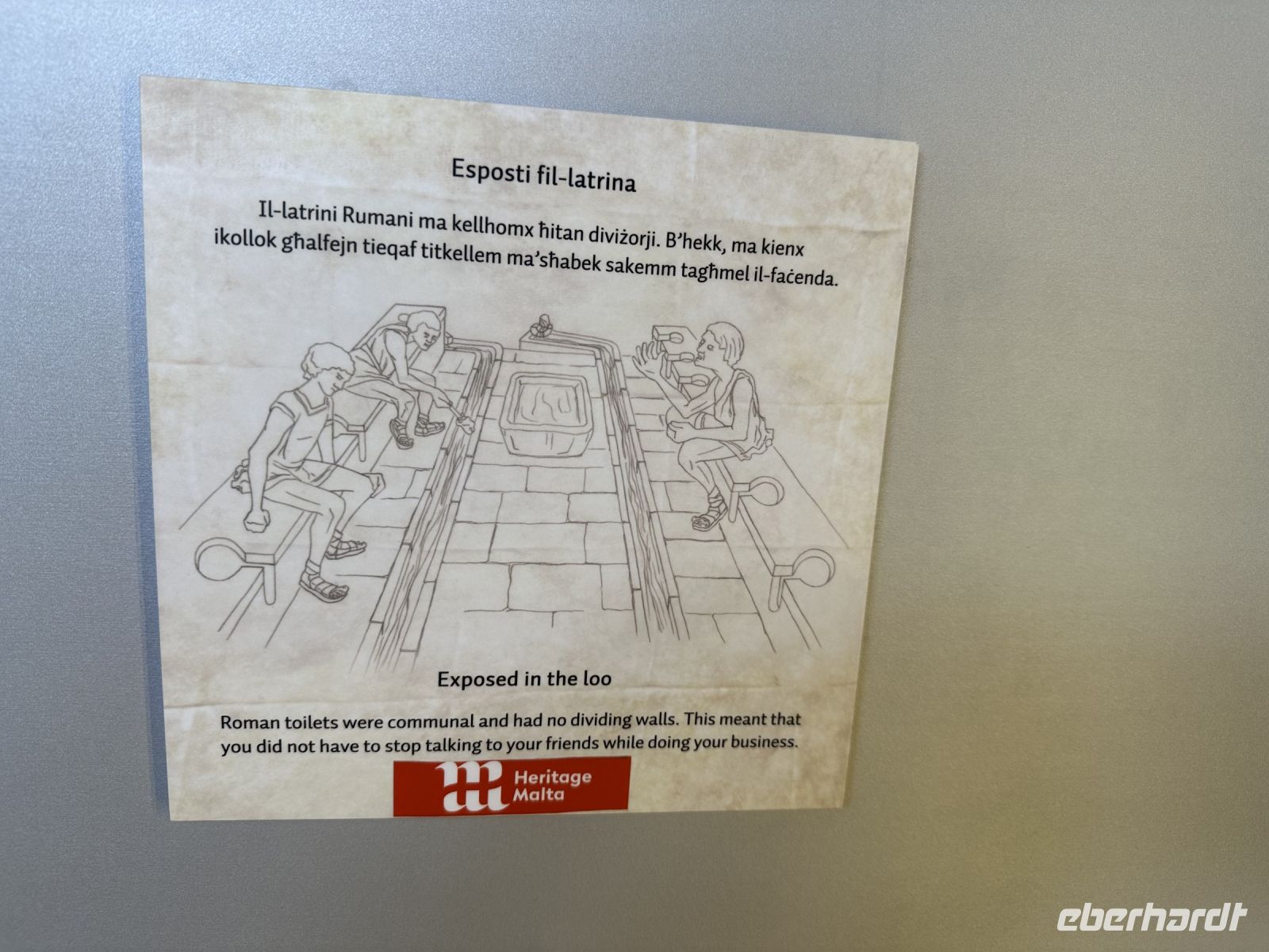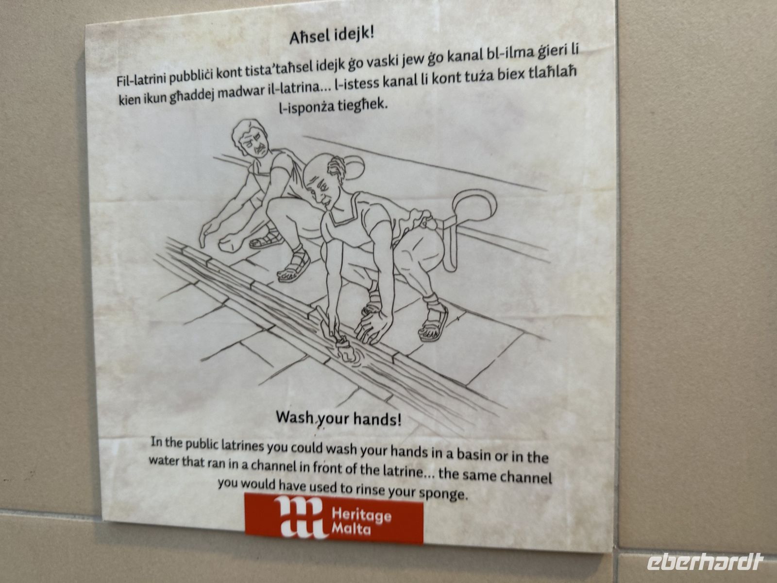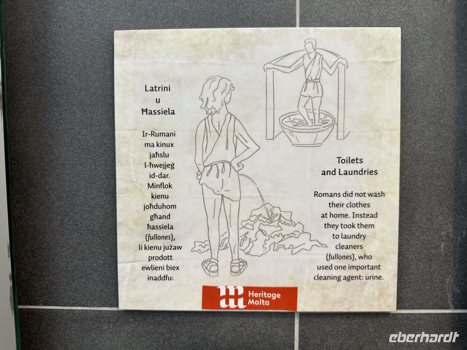 Eine interessante Nebeninformation bekommen wir beim Aufsuchen der Toiletten. Auf mehreren Informationstafeln wird darüber berichtet, dass Urin in der Römerzeit gesammelt und zum Wäschewaschen benutzt wurde. Auch über den Umgang mit öffentlichen Toiletten während der Römerzeit wird hier berichtet. Es gab keinerlei Trennwände, so dass man private Gespräche nicht unterbrechen musste und darüber hinaus auch mit seinen Geschäftspartner debattieren konnte. Die heilsame Wirkung des Verzehrs von Eigenurin war wohl auch bekannt, allerdings nicht sehr beliebt. (schaut euch mal die Fotos an, dann wisst ihr, was ich meine)