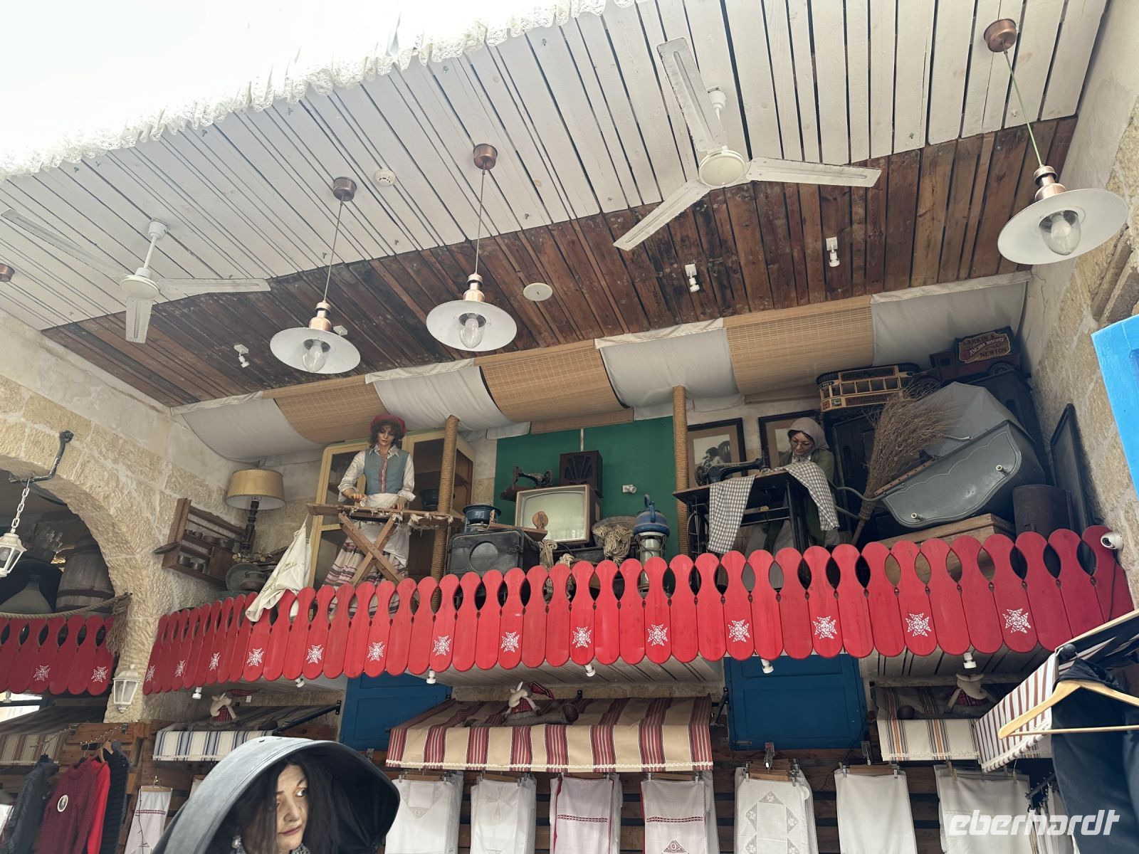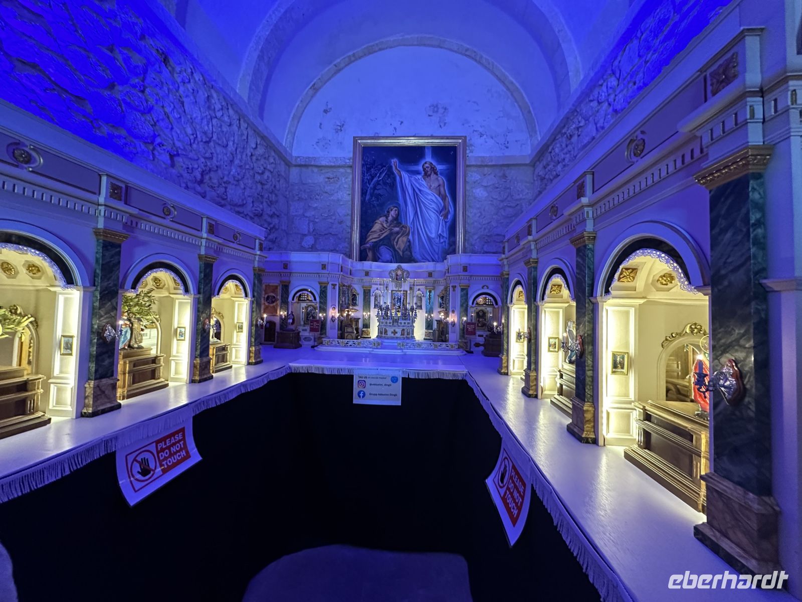 Wir setzen unseren Weg fort und fahren Richtung Dingli-Klippen. Vom Parkplatz bis zur kleinen Kapelle an den Klippen gehen wir zu Fuß. Hanna erklärt uns ein paar Pflanzen am Wegesrand und zeigt uns die sogenannten Karrenspuren, die vermutlich prähistorisch sind und die man bis heute nicht genau erklären kann. An den Cliffs haben wir eine fantastische Aussicht auf das Meer und auf Malta. In der kleinen Kapelle gibt es eine wunderschöne Ausstellung einer Miniaturkirche, geschaffen vom Künstler Paul Muscat und nur vorübergehend hier zu sehen. Bevor wir in den Bus einsteigen, können wir an einem kleinen Stand, maltesischen Kaffee trinken oder, was die meisten machen, Feigenkaktuslikör kaufen.