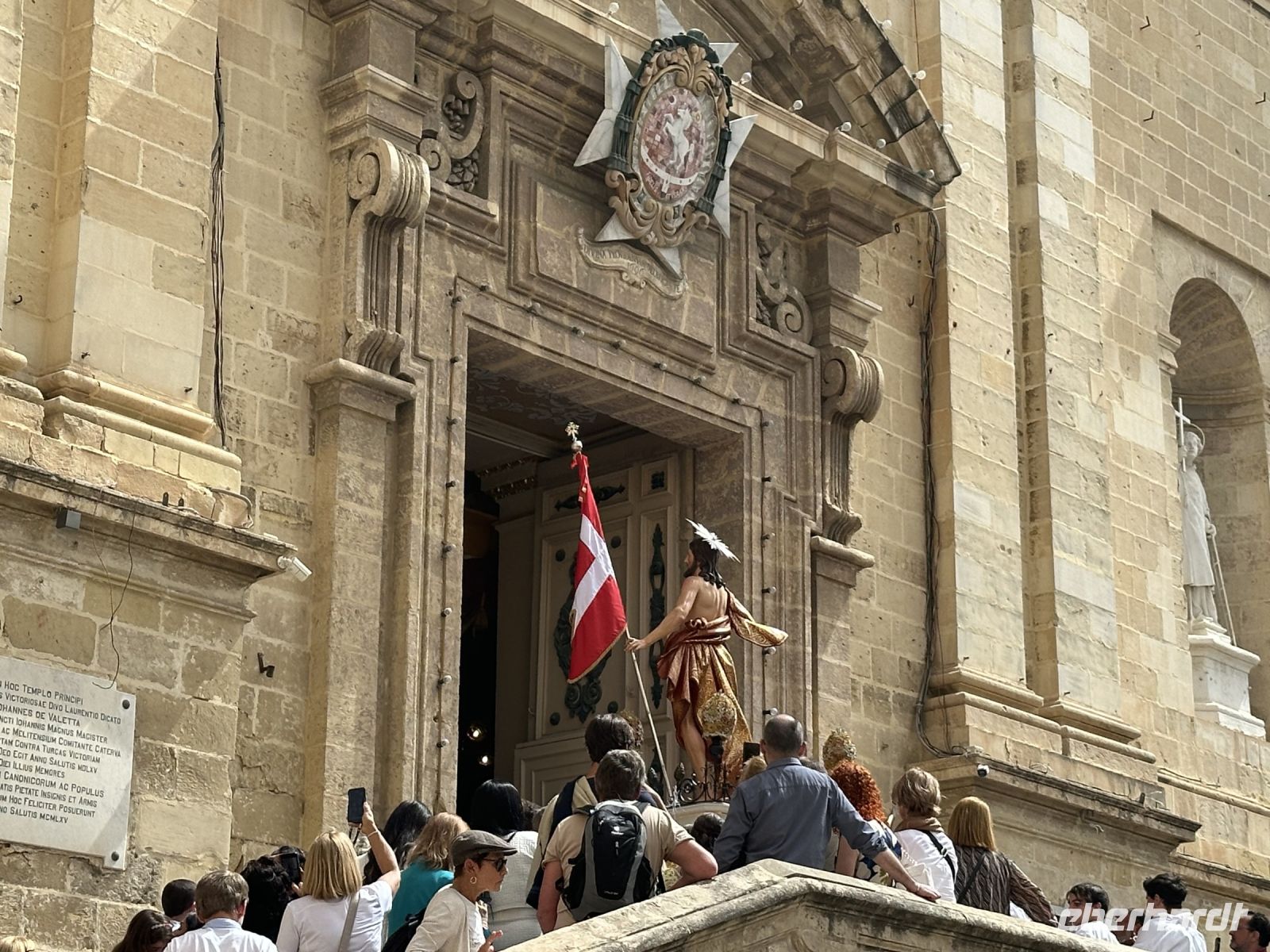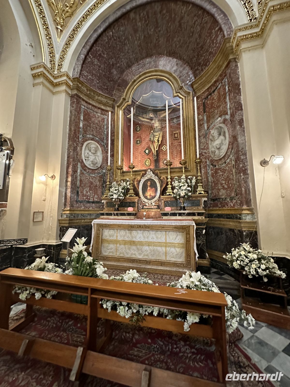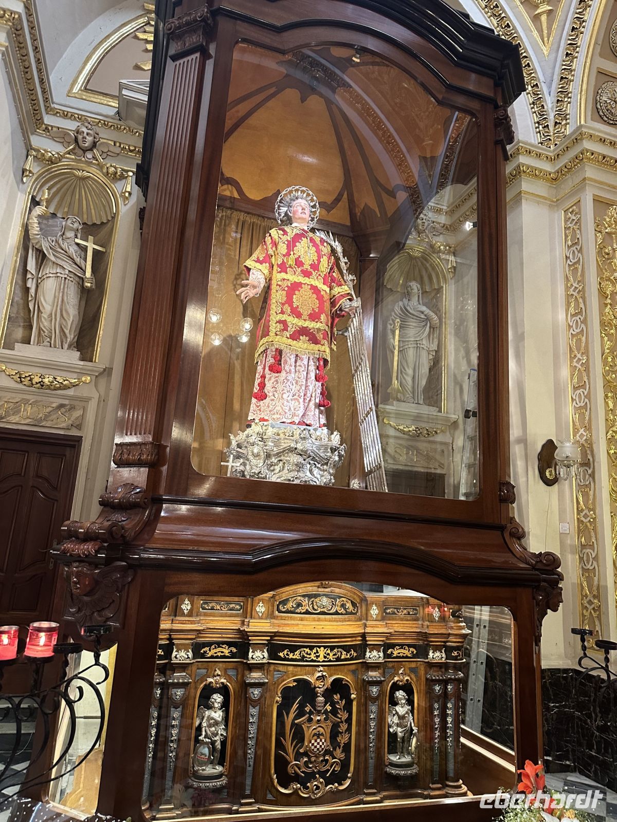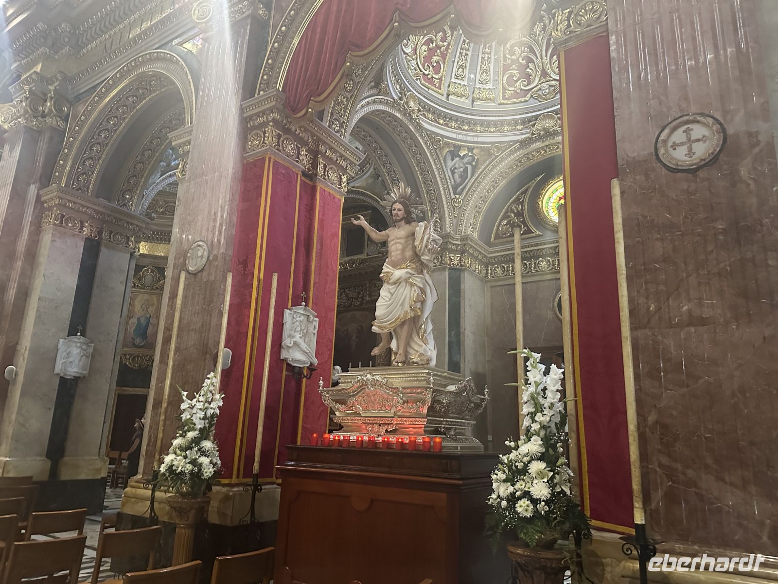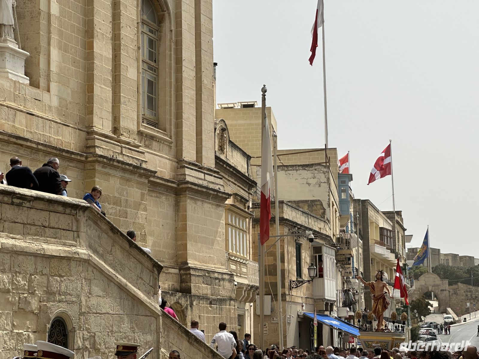 Auf dem Weg zu den drei alten Städten streifen wir St. Julian’s. Hier sehen wir zum ersten Mal Wolkenkratzer auf Malta. Unser Ziel ist Vittoriosa und die Ostersonntagprozession. Noch ist aber ein bisschen Zeit, durch die Gassen zu flanieren. Wir passieren den mittelalterlichen Eingang zur Stadt, ein monumentales Steintor. Eigentlich sind es drei Tore, die nicht hintereinander liegen, sondern versetzt, um so die Stadt besser vor Eindringlingen schützen zu können. Gegen halb elf beginnt nun das Spektakel. Eine Blaskapelle marschiert an uns vorbei und spielt fröhliche Musik. Kurz darauf folgt eine Christus-Statue, die wieder von starken Männerarmen getragen wird. Das Volk jubelt und feiert. Von den Balkonen der umliegenden Häuser wird Christus wie ein Held begrüßt und alle freuen sich, ihn zu sehen. Wir lösen uns von dem Spektakel und besuchen die wichtigste Kirche in Vittoriosa, die dem heiligen Laurentius gewidmet ist. Die Kirche gab es schon vor der Ankunft der Kreuzritter 1530, die diese dann übernahmen und zu ihrer Klosterkirche machten. Beim Betreten der Kirche fällt als Erstes ein Taufbecken aus Marmor auf, das mit dem Symbol des heiligen Laurentius geschmückt ist, einem eisernen Rost. Laurentius war ein römischer Diakon und für die Verwaltung des Vermögens seiner Kirche zuständig. Als er Kaiser Valerian die Herausgabe verweigerte und dieses unter den Armen verteilte, wurde er zum Tode verurteilt und starb den Märtyrertod. Der Sage nach soll er enthauptet worden sein, viele sprechen jedoch davon, dass er auf einem glühenden Rost zu Tode gequält wurde, weshalb er mit einem Rost in der Hand dargestellt wird. Sein Todestag ist überliefert der 10. August 258, dieser wird heute als sein Gedenktag begangen. Er gilt als Patron der Armen, Köche und Konditoren, Wirte, Winzer und Weinberge, Hirten und Herden, der armen Seelen und wird angerufen gegen Feuersbrunst, Brandwunden, Pest, Fieber und bei Augenleiden.