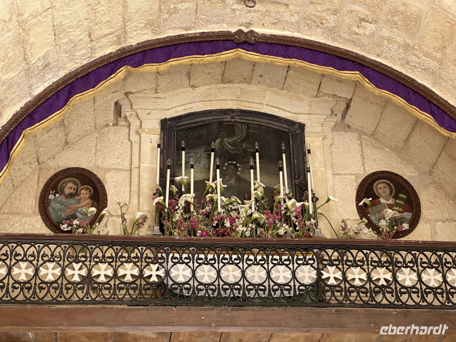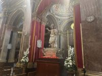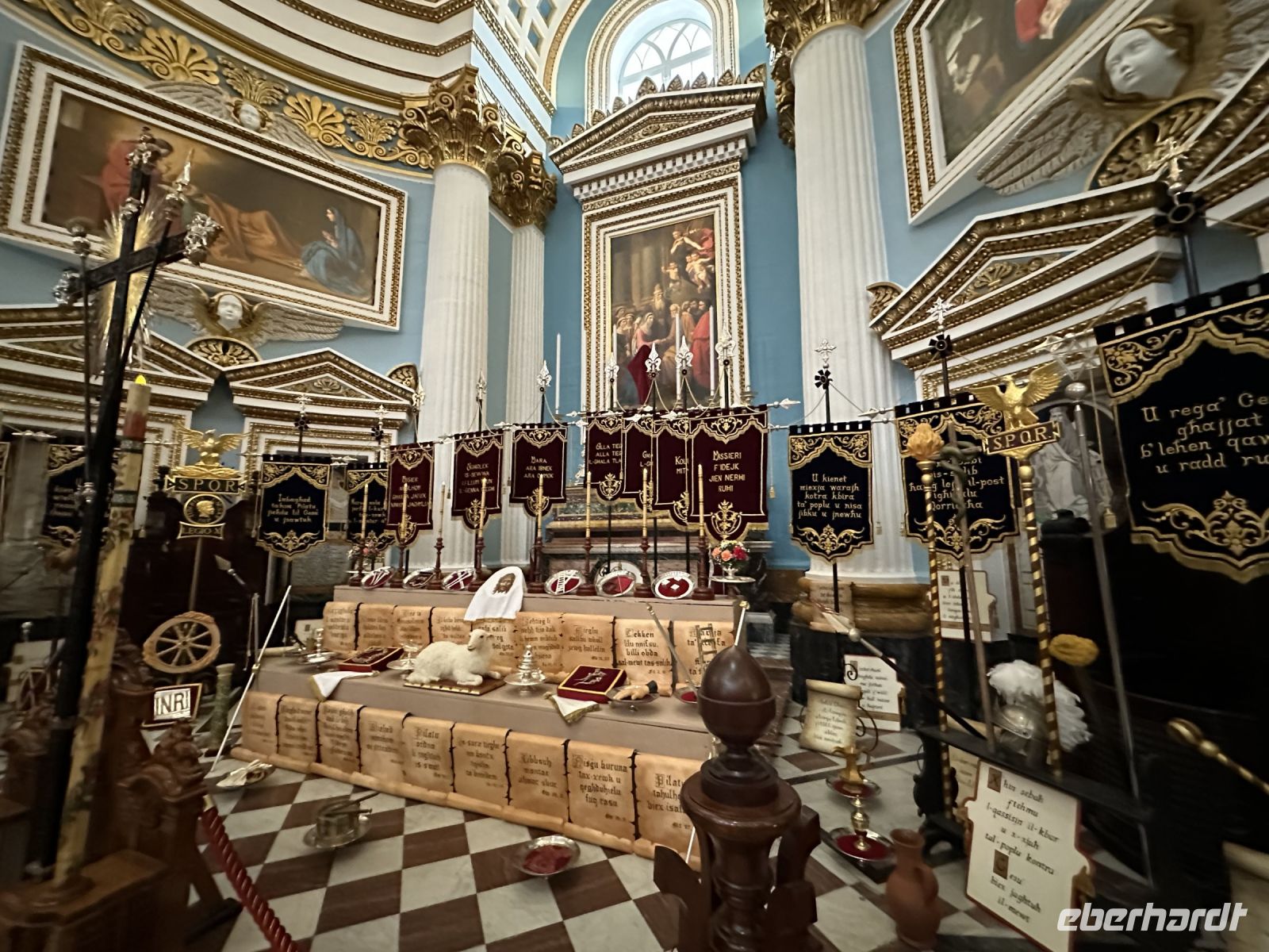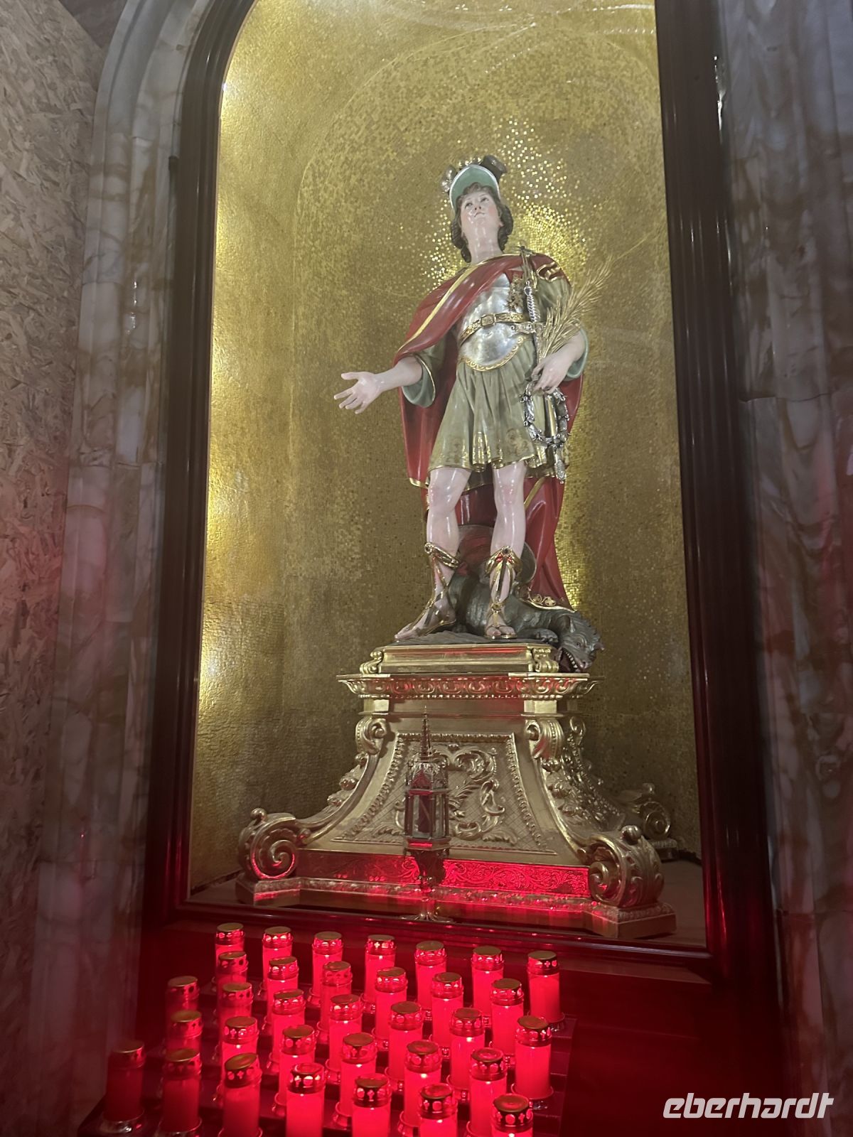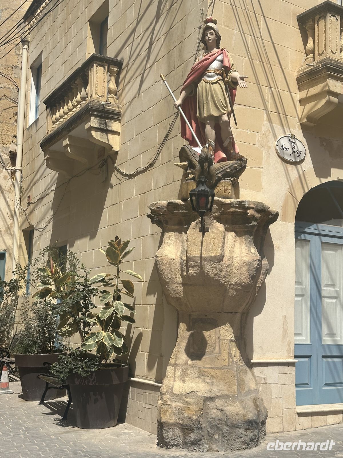 Auf dem Weg zu den drei alten Städten streifen wir St. Julian’s. Hier sehen wir zum ersten Mal Wolkenkratzer auf Malta. Unser Ziel ist Vittoriosa und die Ostersonntagprozession. Noch ist aber ein bisschen Zeit, durch die Gassen zu flanieren. Wir passieren den mittelalterlichen Eingang zur Stadt, ein monumentales Steintor. Eigentlich sind es drei Tore, die nicht hintereinander liegen, sondern versetzt, um so die Stadt besser vor Eindringlingen schützen zu können. Gegen halb elf beginnt nun das Spektakel. Eine Blaskapelle marschiert an uns vorbei und spielt fröhliche Musik. Kurz darauf folgt eine Christus-Statue, die wieder von starken Männerarmen getragen wird. Das Volk jubelt und feiert. Von den Balkonen der umliegenden Häuser wird Christus wie ein Held begrüßt und alle freuen sich, ihn zu sehen. Wir lösen uns von dem Spektakel und besuchen die wichtigste Kirche in Vittoriosa, die dem heiligen Laurentius gewidmet ist. Die Kirche gab es schon vor der Ankunft der Kreuzritter 1530, die diese dann übernahmen und zu ihrer Klosterkirche machten. Beim Betreten der Kirche fällt als Erstes ein Taufbecken aus Marmor auf, das mit dem Symbol des heiligen Laurentius geschmückt ist, einem eisernen Rost. Laurentius war ein römischer Diakon und für die Verwaltung des Vermögens seiner Kirche zuständig. Als er Kaiser Valerian die Herausgabe verweigerte und dieses unter den Armen verteilte, wurde er zum Tode verurteilt und starb den Märtyrertod. Der Sage nach soll er enthauptet worden sein, viele sprechen jedoch davon, dass er auf einem glühenden Rost zu Tode gequält wurde, weshalb er mit einem Rost in der Hand dargestellt wird. Sein Todestag ist überliefert der 10. August 258, dieser wird heute als sein Gedenktag begangen. Er gilt als Patron der Armen, Köche und Konditoren, Wirte, Winzer und Weinberge, Hirten und Herden, der armen Seelen und wird angerufen gegen Feuersbrunst, Brandwunden, Pest, Fieber und bei Augenleiden.