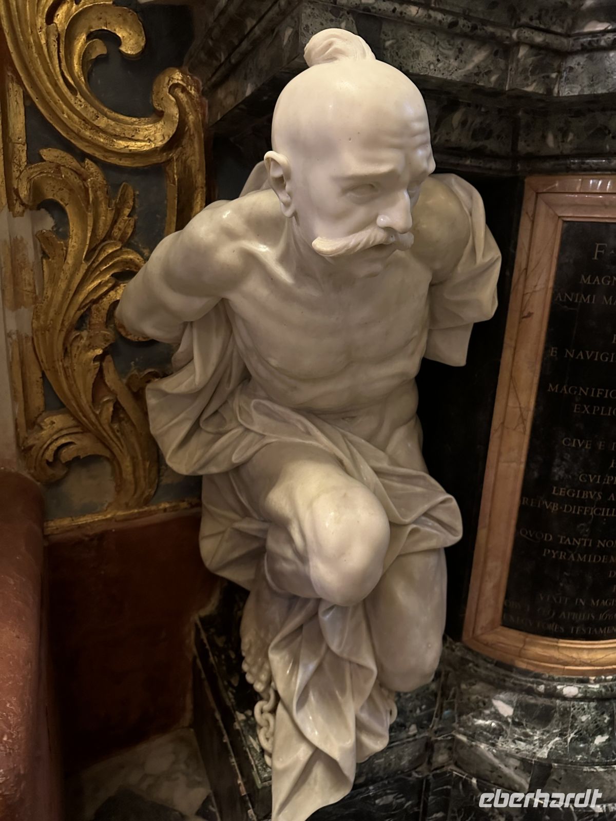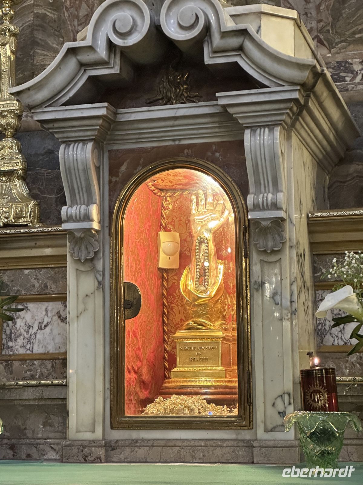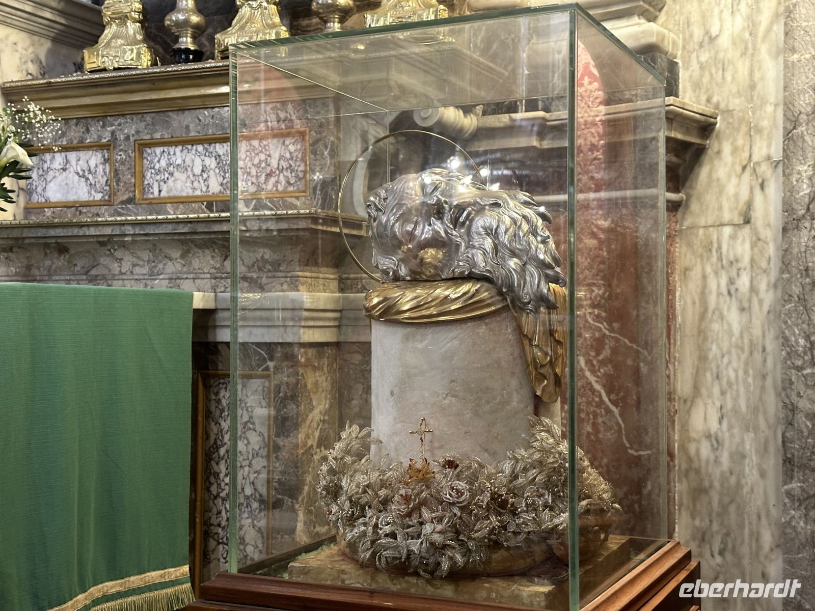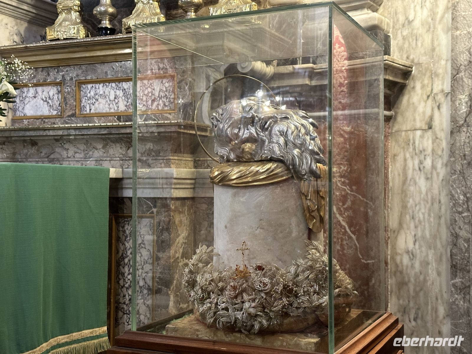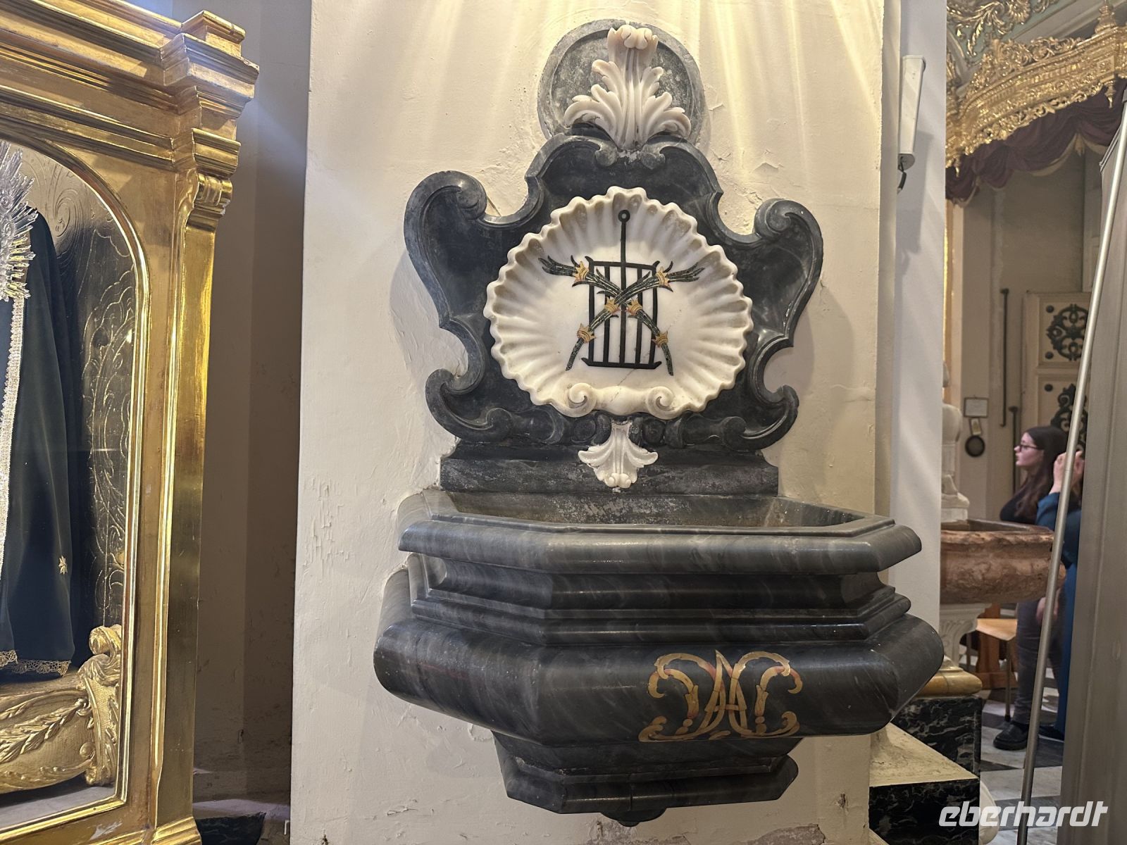 Auf dem Weg zu den drei alten Städten streifen wir St. Julian’s. Hier sehen wir zum ersten Mal Wolkenkratzer auf Malta. Unser Ziel ist Vittoriosa und die Ostersonntagprozession. Noch ist aber ein bisschen Zeit, durch die Gassen zu flanieren. Wir passieren den mittelalterlichen Eingang zur Stadt, ein monumentales Steintor. Eigentlich sind es drei Tore, die nicht hintereinander liegen, sondern versetzt, um so die Stadt besser vor Eindringlingen schützen zu können. Gegen halb elf beginnt nun das Spektakel. Eine Blaskapelle marschiert an uns vorbei und spielt fröhliche Musik. Kurz darauf folgt eine Christus-Statue, die wieder von starken Männerarmen getragen wird. Das Volk jubelt und feiert. Von den Balkonen der umliegenden Häuser wird Christus wie ein Held begrüßt und alle freuen sich, ihn zu sehen. Wir lösen uns von dem Spektakel und besuchen die wichtigste Kirche in Vittoriosa, die dem heiligen Laurentius gewidmet ist. Die Kirche gab es schon vor der Ankunft der Kreuzritter 1530, die diese dann übernahmen und zu ihrer Klosterkirche machten. Beim Betreten der Kirche fällt als Erstes ein Taufbecken aus Marmor auf, das mit dem Symbol des heiligen Laurentius geschmückt ist, einem eisernen Rost. Laurentius war ein römischer Diakon und für die Verwaltung des Vermögens seiner Kirche zuständig. Als er Kaiser Valerian die Herausgabe verweigerte und dieses unter den Armen verteilte, wurde er zum Tode verurteilt und starb den Märtyrertod. Der Sage nach soll er enthauptet worden sein, viele sprechen jedoch davon, dass er auf einem glühenden Rost zu Tode gequält wurde, weshalb er mit einem Rost in der Hand dargestellt wird. Sein Todestag ist überliefert der 10. August 258, dieser wird heute als sein Gedenktag begangen. Er gilt als Patron der Armen, Köche und Konditoren, Wirte, Winzer und Weinberge, Hirten und Herden, der armen Seelen und wird angerufen gegen Feuersbrunst, Brandwunden, Pest, Fieber und bei Augenleiden.