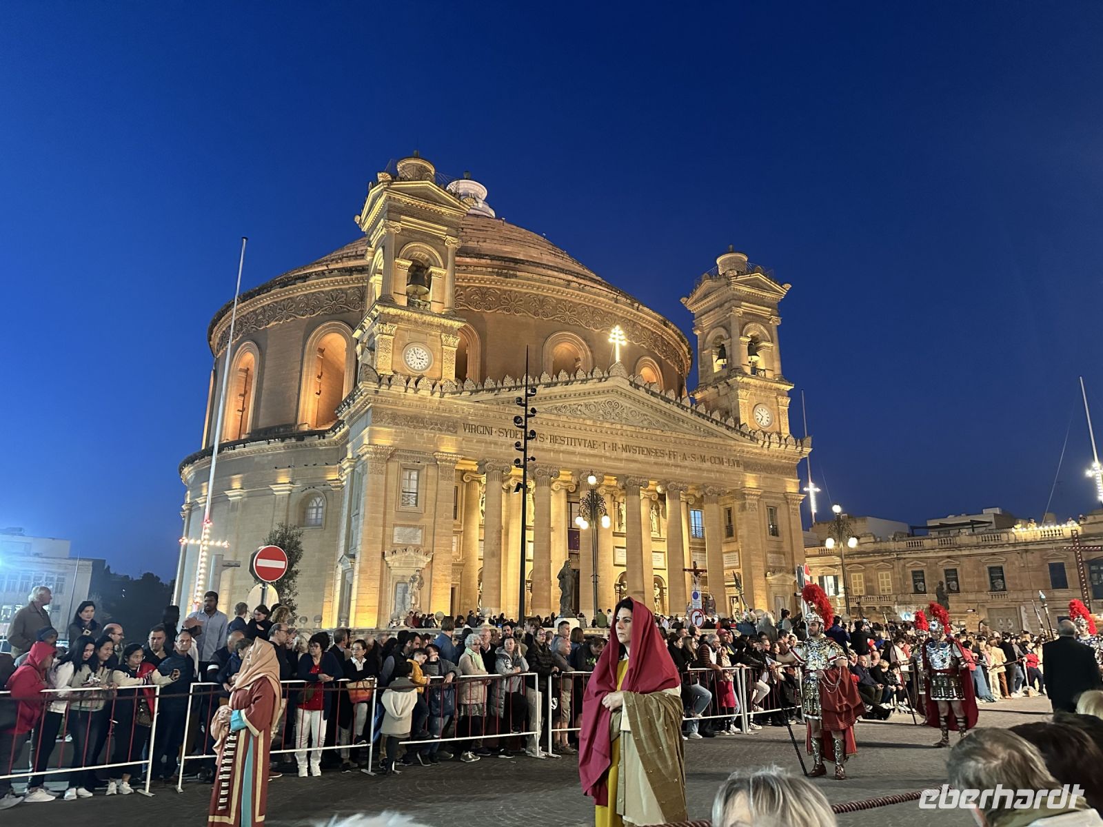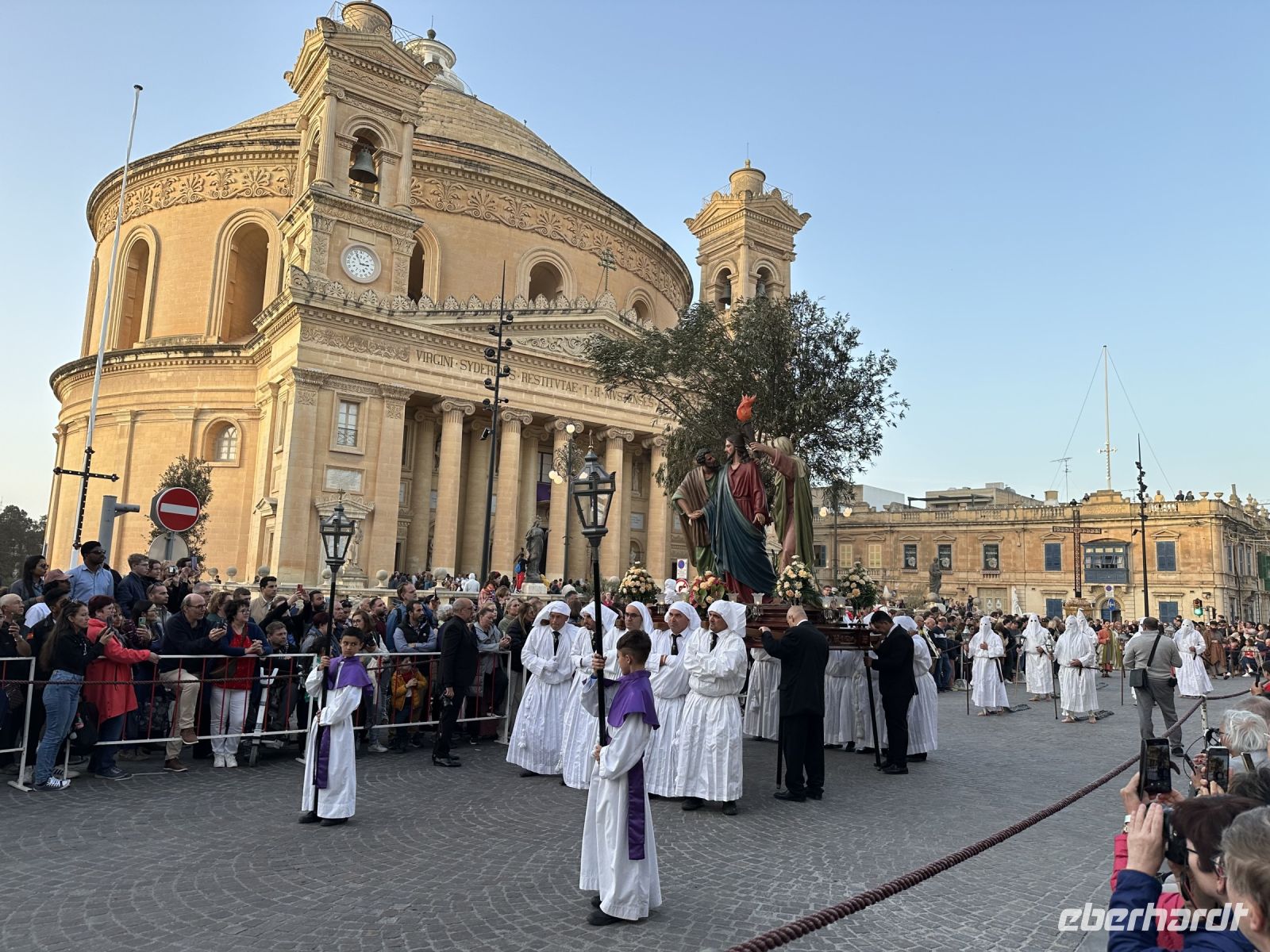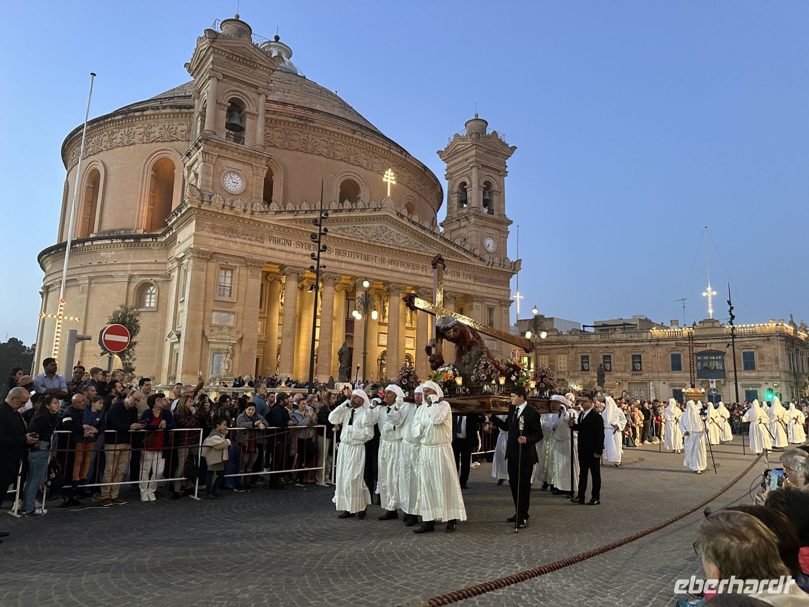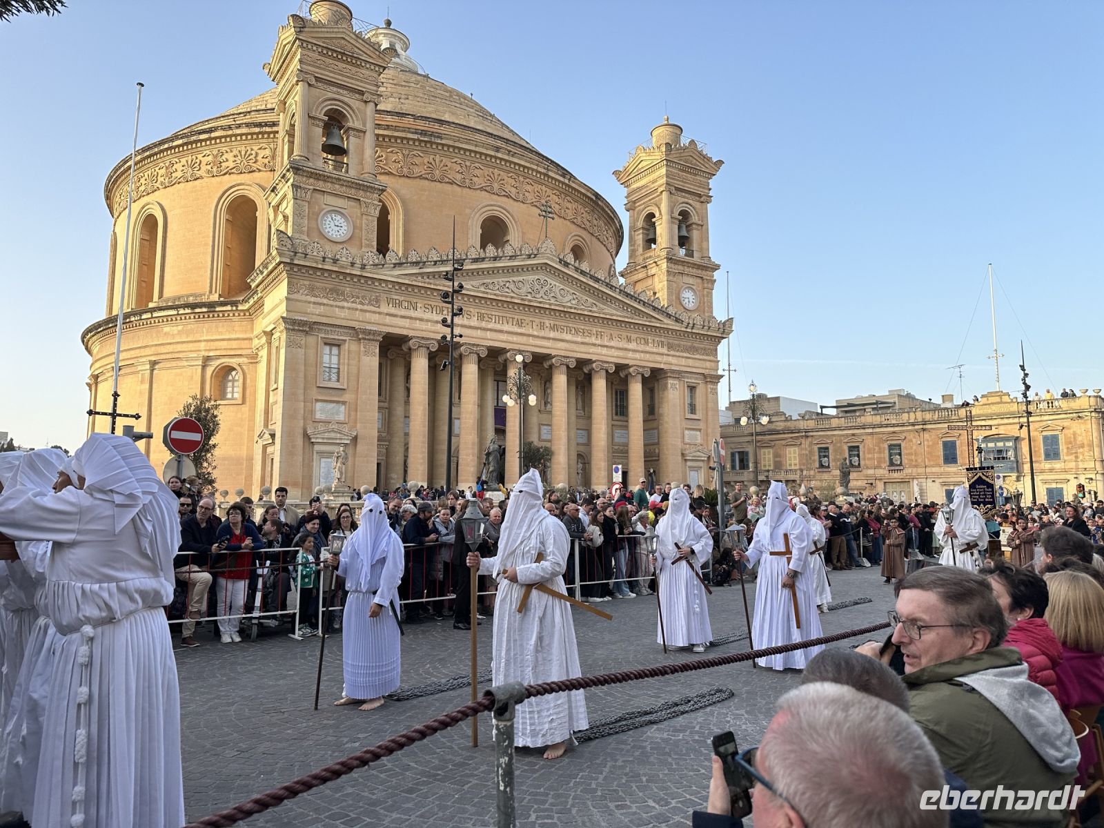 Der Höhepunkt des Tages und eigentlich der gesamten Reise findet heute Abend statt. Wir erleben die feierliche Osterprozession auf Malta. Wir fahren nach Mosta. Hier sind für uns Plätze reserviert (Stühle am Straßenrand), so dass es uns nicht schwerfällt, fast eine Stunde auf den Beginn der Prozession zu warten. Um 17.30 Uhr geht es los. Die Kapelle spielt tragende Musik und die Prozession wird von einem ganz in Weiß gekleideten Mann eröffnet. Es folgt ein Spielmannstrupp der Pfadfinder aus Malta. Sie tragen eine Fahne in lila, weil dies die Farbe der Buße ist. Das Banner Passio Domini Nostri Jesus Christ erinnert an die Passion von Jesus Christus. So folgt Symbol auf Symbol. Aus der Kirche werden neun Statuen an den Zuschauern vorbei getragen. Diese sind so schwer, dass sie von mindestens acht starken Männern getragen werden müssen. Immer wieder wird die Prozession unterbrochen, weil die Männer die schwere Last absetzen müssen. Dafür werden sie von weiteren Männern begleitet, die spezielle Stützen in den Händen halten, auf der die Statuen abgesetzt werden können. Hinter den Statuen folgen Männer mit weißen Kapuzen (die sehr stark an den KKK erinnern) und die Ketten an den Füßen tragen, ebenfalls ein Symbol der Buße. Weiterhin folgen zwischen den Statuen Repräsentanten der biblischen Geschichte wie die Apostel oder römische Offiziere und Soldaten. Auch Kinder und Jugendliche nehmen an der Prozession teil. Als die sechste Statue an uns vorbei getragen wird, dämmert es bereits. Die sechste Statue zeigt den unter der Last gefallenen Christus. Diese Statue hat besonders viele Verehrer und wird ebenfalls von weiß gekleideten Menschen mit Fußketten begleitet. Gegen 19 Uhr gleitet die prachtvollste Statue an uns vorbei. Diese, die achte, zeigt eine monumentale Urne, die den Leichnam Christi enthalten soll. Sie ist aus Holz geschnitzt, ganz und gar vergoldet und mit kostbarer bestickter Seide, Satin und Samt geschmückt. Die letzte und neunte Statue zeigt die Mutter Christi mit gebrochenem Herzen, die von Johannes dem Evangelisten getröstet wird.