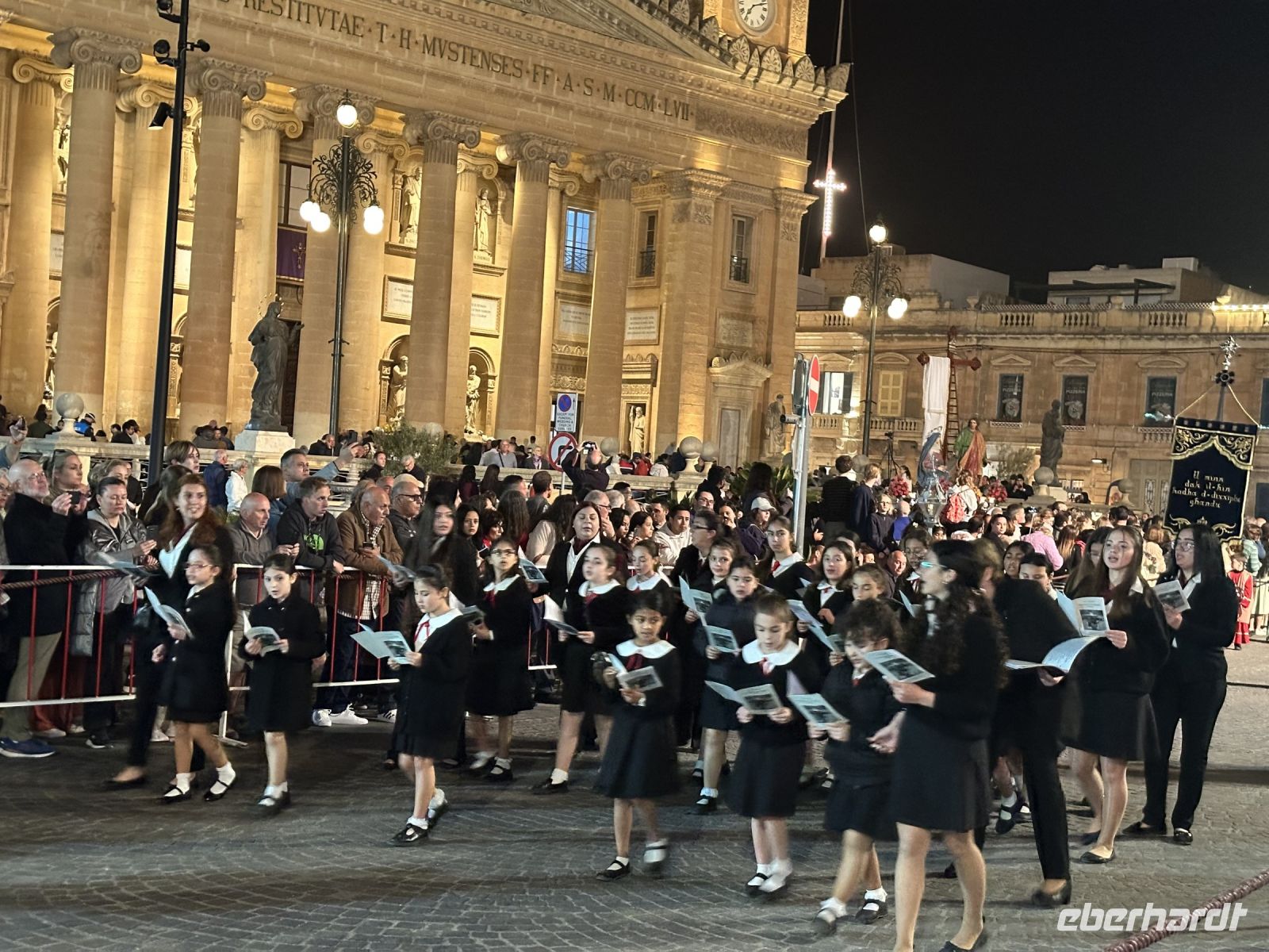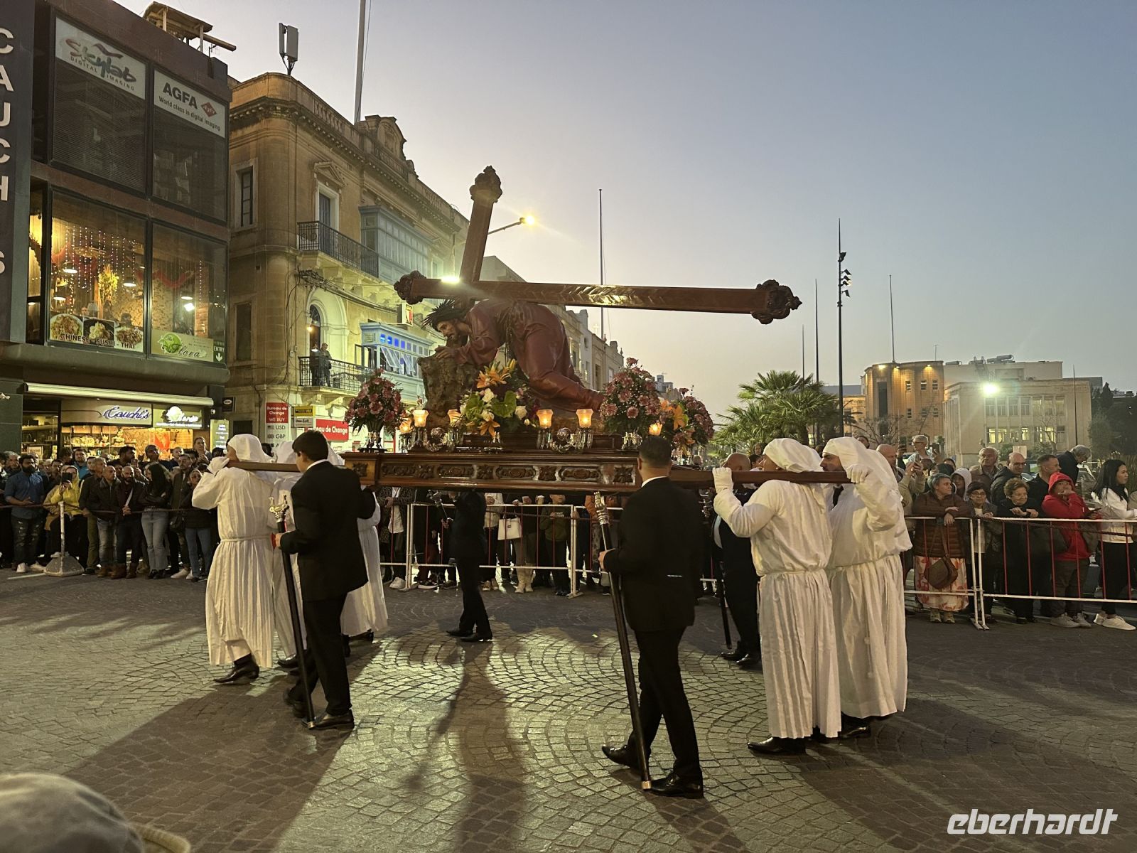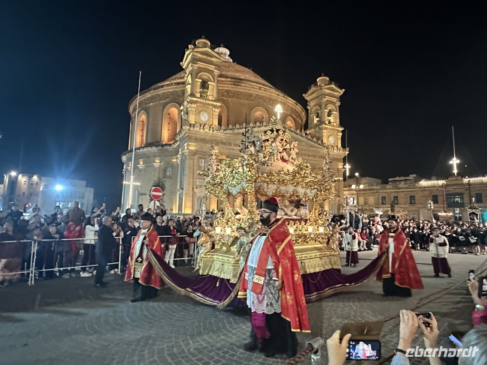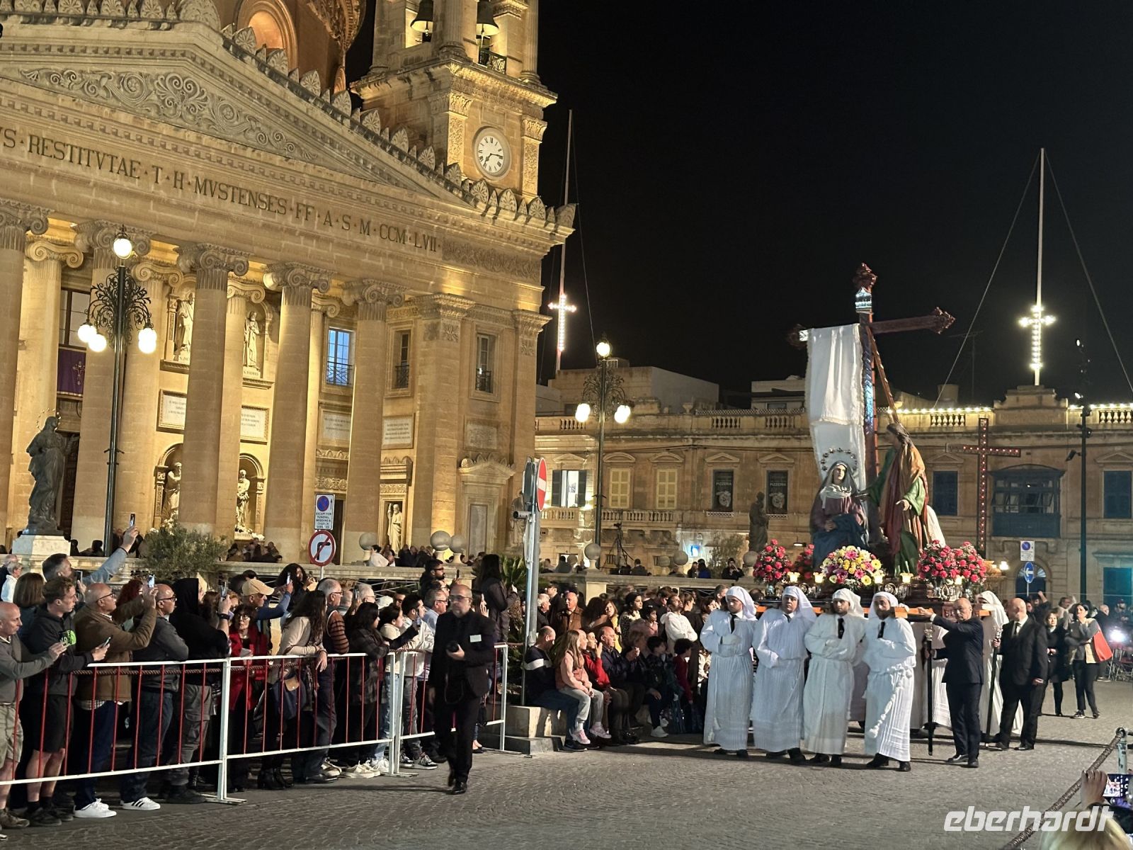 Der Höhepunkt des Tages und eigentlich der gesamten Reise findet heute Abend statt. Wir erleben die feierliche Osterprozession auf Malta. Wir fahren nach Mosta. Hier sind für uns Plätze reserviert (Stühle am Straßenrand), so dass es uns nicht schwerfällt, fast eine Stunde auf den Beginn der Prozession zu warten. Um 17.30 Uhr geht es los. Die Kapelle spielt tragende Musik und die Prozession wird von einem ganz in Weiß gekleideten Mann eröffnet. Es folgt ein Spielmannstrupp der Pfadfinder aus Malta. Sie tragen eine Fahne in lila, weil dies die Farbe der Buße ist. Das Banner Passio Domini Nostri Jesus Christ erinnert an die Passion von Jesus Christus. So folgt Symbol auf Symbol. Aus der Kirche werden neun Statuen an den Zuschauern vorbei getragen. Diese sind so schwer, dass sie von mindestens acht starken Männern getragen werden müssen. Immer wieder wird die Prozession unterbrochen, weil die Männer die schwere Last absetzen müssen. Dafür werden sie von weiteren Männern begleitet, die spezielle Stützen in den Händen halten, auf der die Statuen abgesetzt werden können. Hinter den Statuen folgen Männer mit weißen Kapuzen (die sehr stark an den KKK erinnern) und die Ketten an den Füßen tragen, ebenfalls ein Symbol der Buße. Weiterhin folgen zwischen den Statuen Repräsentanten der biblischen Geschichte wie die Apostel oder römische Offiziere und Soldaten. Auch Kinder und Jugendliche nehmen an der Prozession teil. Als die sechste Statue an uns vorbei getragen wird, dämmert es bereits. Die sechste Statue zeigt den unter der Last gefallenen Christus. Diese Statue hat besonders viele Verehrer und wird ebenfalls von weiß gekleideten Menschen mit Fußketten begleitet. Gegen 19 Uhr gleitet die prachtvollste Statue an uns vorbei. Diese, die achte, zeigt eine monumentale Urne, die den Leichnam Christi enthalten soll. Sie ist aus Holz geschnitzt, ganz und gar vergoldet und mit kostbarer bestickter Seide, Satin und Samt geschmückt. Die letzte und neunte Statue zeigt die Mutter Christi mit gebrochenem Herzen, die von Johannes dem Evangelisten getröstet wird.