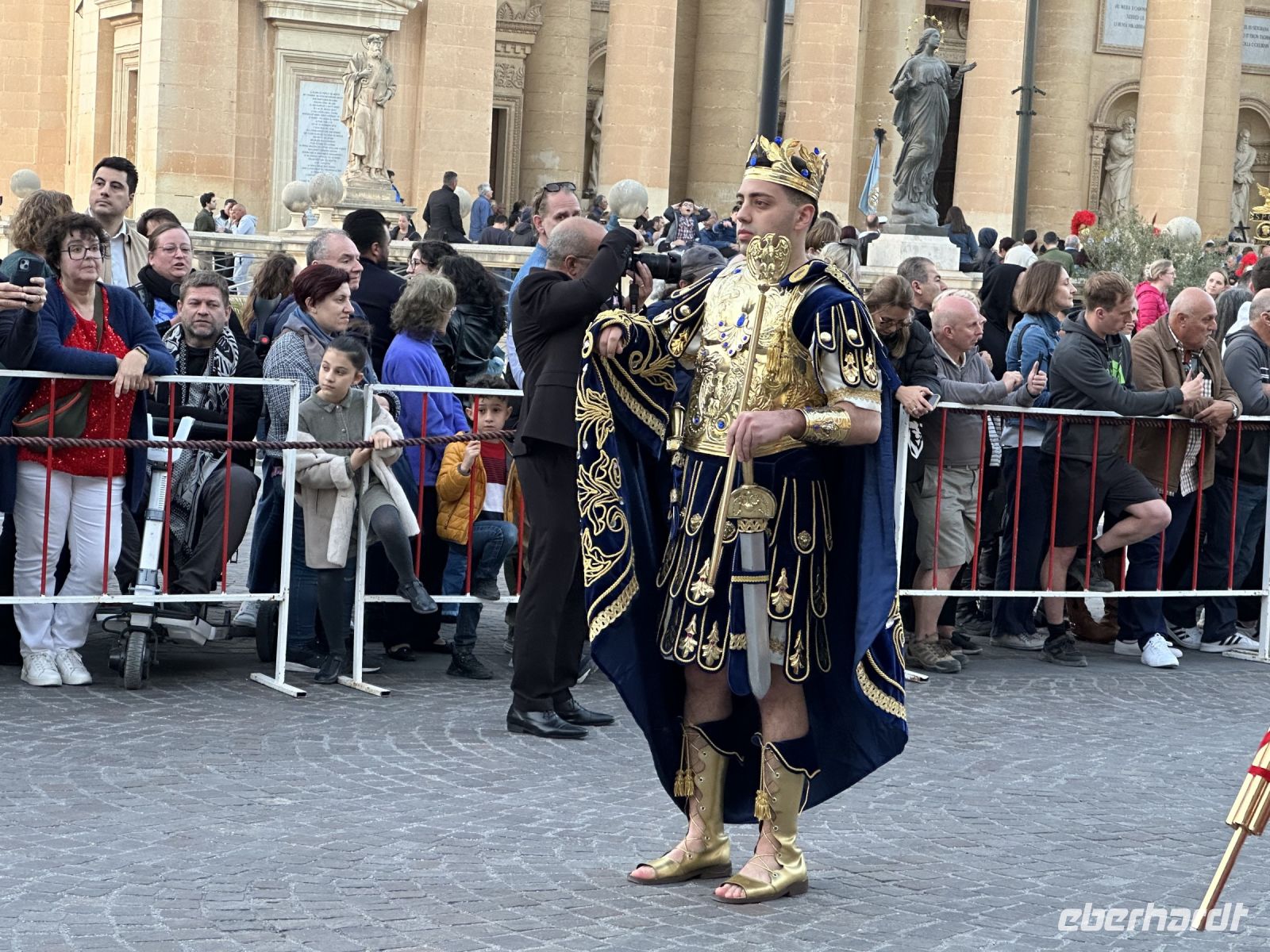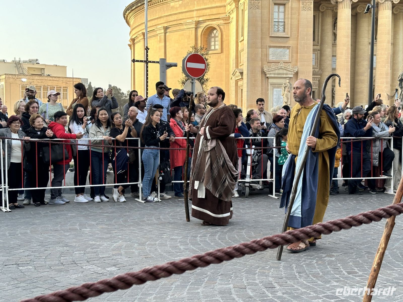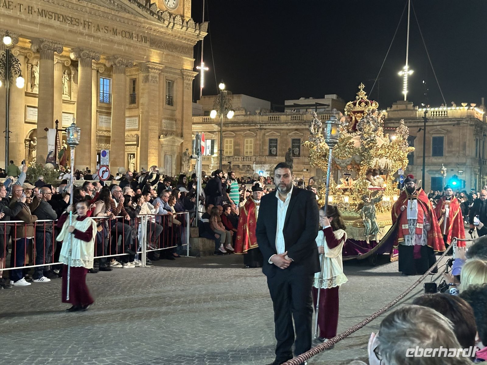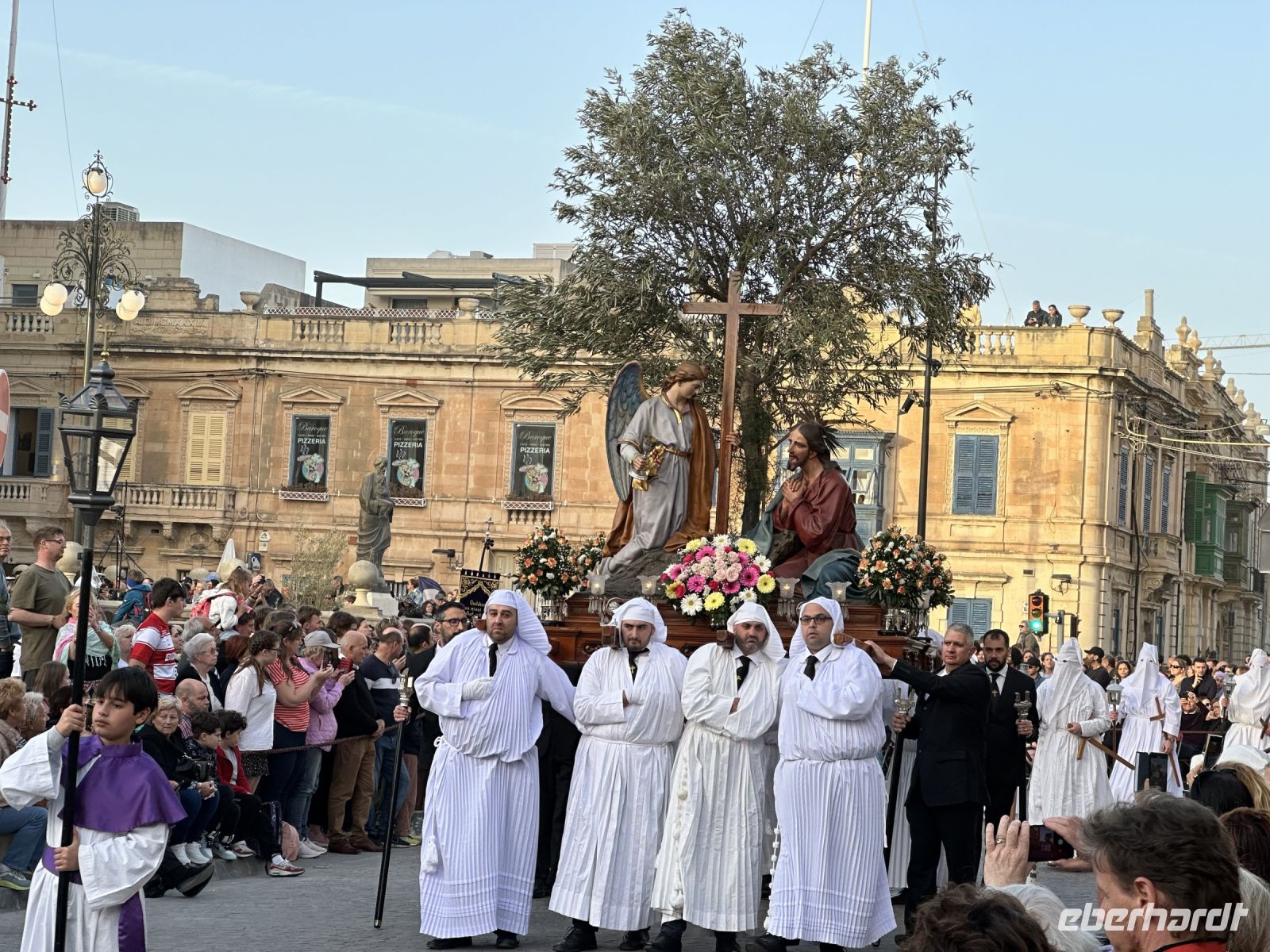 Der Höhepunkt des Tages und eigentlich der gesamten Reise findet heute Abend statt. Wir erleben die feierliche Osterprozession auf Malta. Wir fahren nach Mosta. Hier sind für uns Plätze reserviert (Stühle am Straßenrand), so dass es uns nicht schwerfällt, fast eine Stunde auf den Beginn der Prozession zu warten. Um 17.30 Uhr geht es los. Die Kapelle spielt tragende Musik und die Prozession wird von einem ganz in Weiß gekleideten Mann eröffnet. Es folgt ein Spielmannstrupp der Pfadfinder aus Malta. Sie tragen eine Fahne in lila, weil dies die Farbe der Buße ist. Das Banner Passio Domini Nostri Jesus Christ erinnert an die Passion von Jesus Christus. So folgt Symbol auf Symbol. Aus der Kirche werden neun Statuen an den Zuschauern vorbei getragen. Diese sind so schwer, dass sie von mindestens acht starken Männern getragen werden müssen. Immer wieder wird die Prozession unterbrochen, weil die Männer die schwere Last absetzen müssen. Dafür werden sie von weiteren Männern begleitet, die spezielle Stützen in den Händen halten, auf der die Statuen abgesetzt werden können. Hinter den Statuen folgen Männer mit weißen Kapuzen (die sehr stark an den KKK erinnern) und die Ketten an den Füßen tragen, ebenfalls ein Symbol der Buße. Weiterhin folgen zwischen den Statuen Repräsentanten der biblischen Geschichte wie die Apostel oder römische Offiziere und Soldaten. Auch Kinder und Jugendliche nehmen an der Prozession teil. Als die sechste Statue an uns vorbei getragen wird, dämmert es bereits. Die sechste Statue zeigt den unter der Last gefallenen Christus. Diese Statue hat besonders viele Verehrer und wird ebenfalls von weiß gekleideten Menschen mit Fußketten begleitet. Gegen 19 Uhr gleitet die prachtvollste Statue an uns vorbei. Diese, die achte, zeigt eine monumentale Urne, die den Leichnam Christi enthalten soll. Sie ist aus Holz geschnitzt, ganz und gar vergoldet und mit kostbarer bestickter Seide, Satin und Samt geschmückt. Die letzte und neunte Statue zeigt die Mutter Christi mit gebrochenem Herzen, die von Johannes dem Evangelisten getröstet wird.