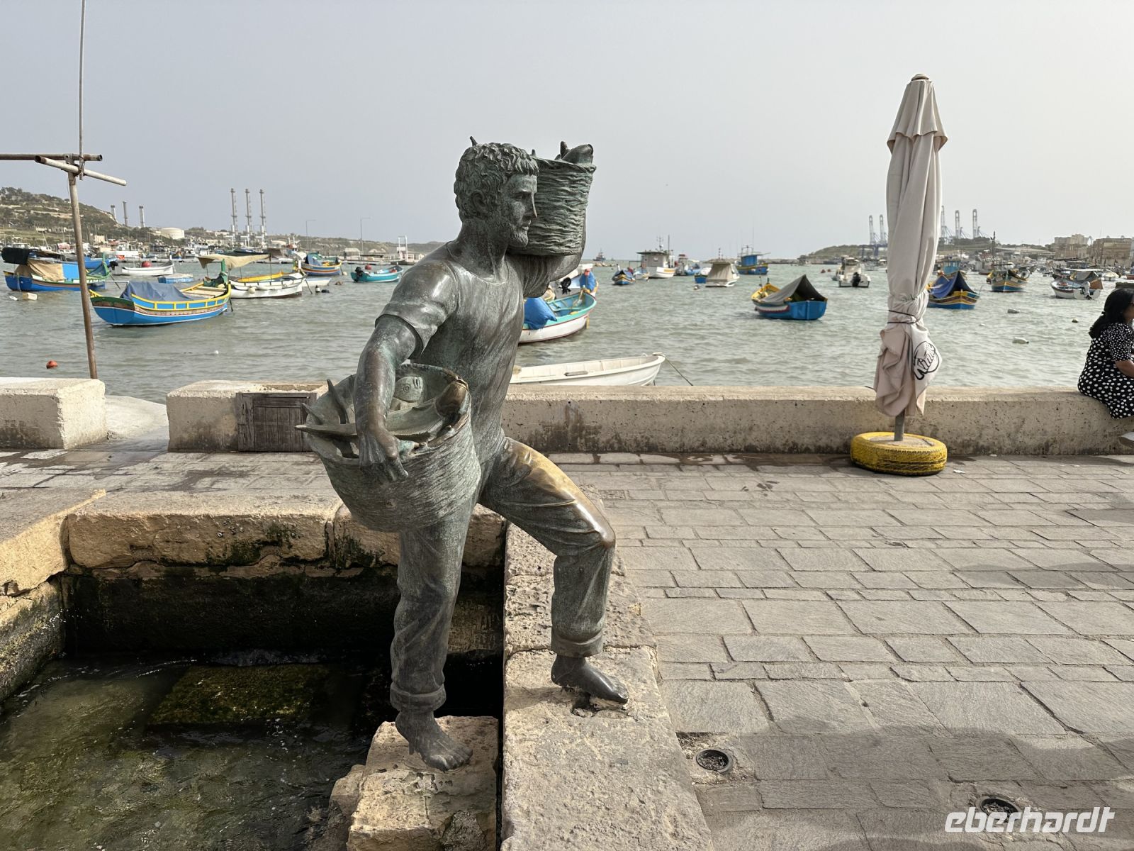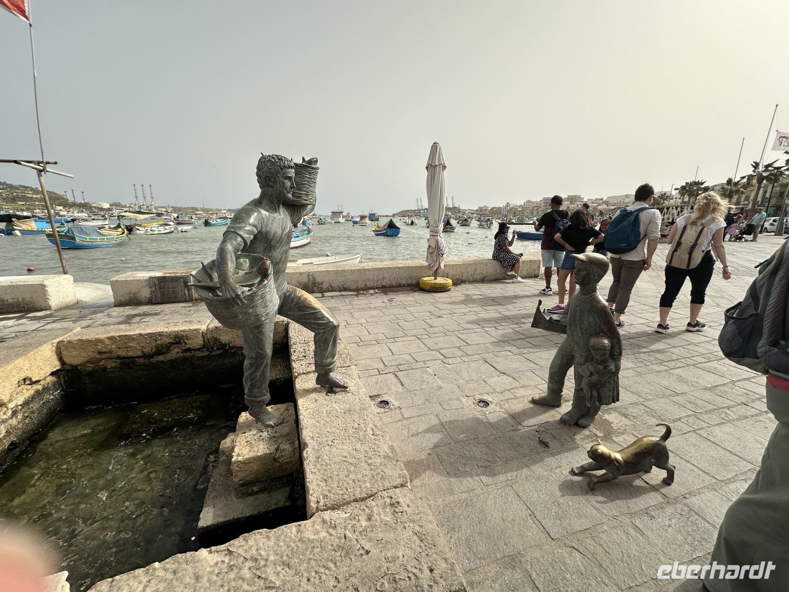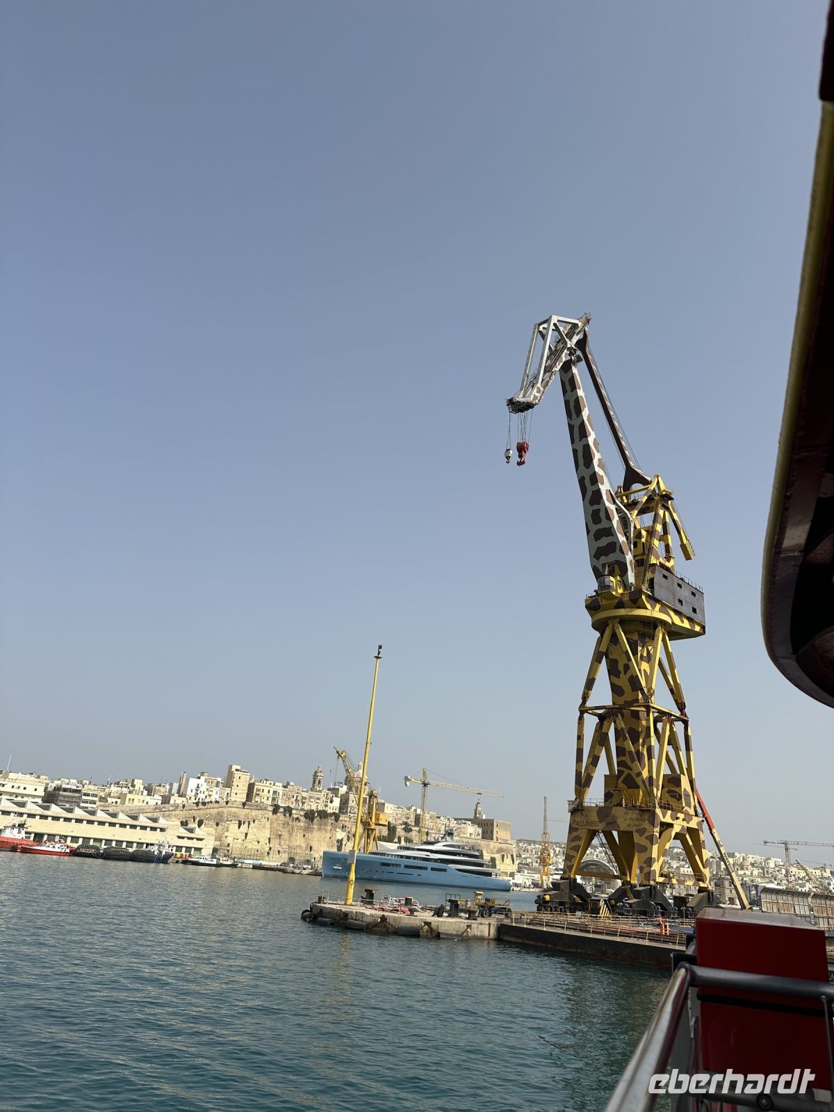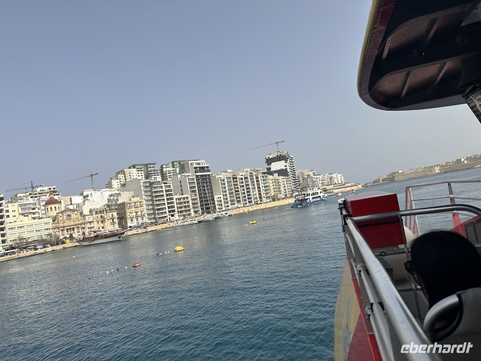 Wir ziehen weiter, spazieren am Hafen entlang und Hanne entlässt uns in die Mittagspause. Allerdings bekommen wir in den überwiegend leeren Restaurants keinen Platz, sondern überall die Antwort: fully booked. Tja, Pech gehabt. So nutzen wir die Mittagspause recht unterschiedlich. Einige gehen am Hafen entlang, genießen die Sonne und treiben irgendwo einen Kaffee auf, andere schaffen es doch noch in ein Restaurant und ein Teil der Gruppe entdeckt einen kleinen Laden, in dem wir zur Verkostung von einheimischem Gebäck und Käse eingeladen werden, den wir dann käuflich erwerben und auf der Treppe der Kirche verzehren. Etwas ungewöhnlich, aber sehr lustig. Nach der Mittagspause erleben wir den Einzug der Christusstatue in seine Kirche. Es ist erstaunlich, mit wieviel Geschick die Männer die schwere Statue durch die enge Treppe wieder in die Kirche zurück bugsieren. Jetzt fahren wir nach Sliema, wo wir mit einem Ausflugsboot eine Hafenrundfahrt unternehmen.