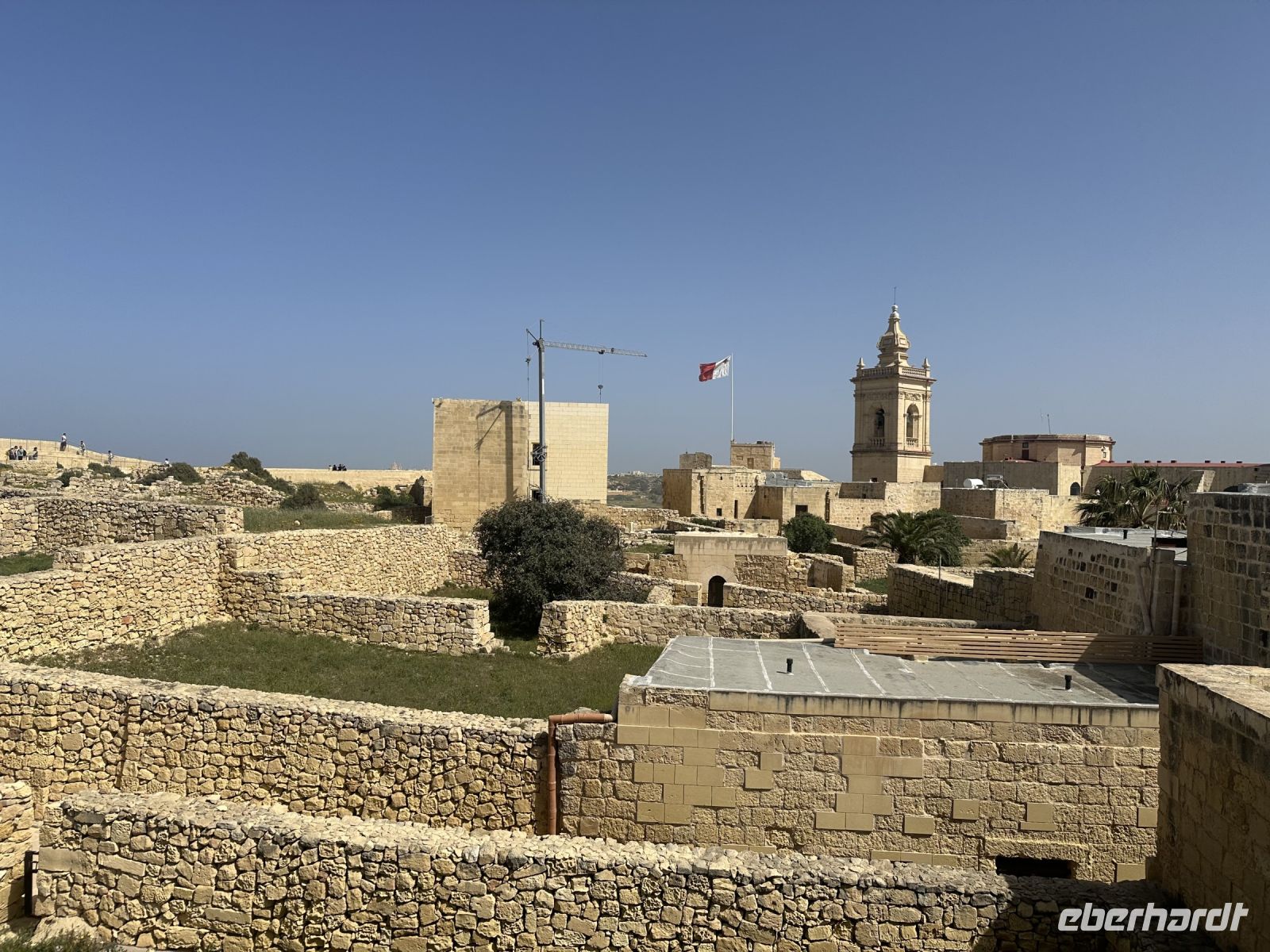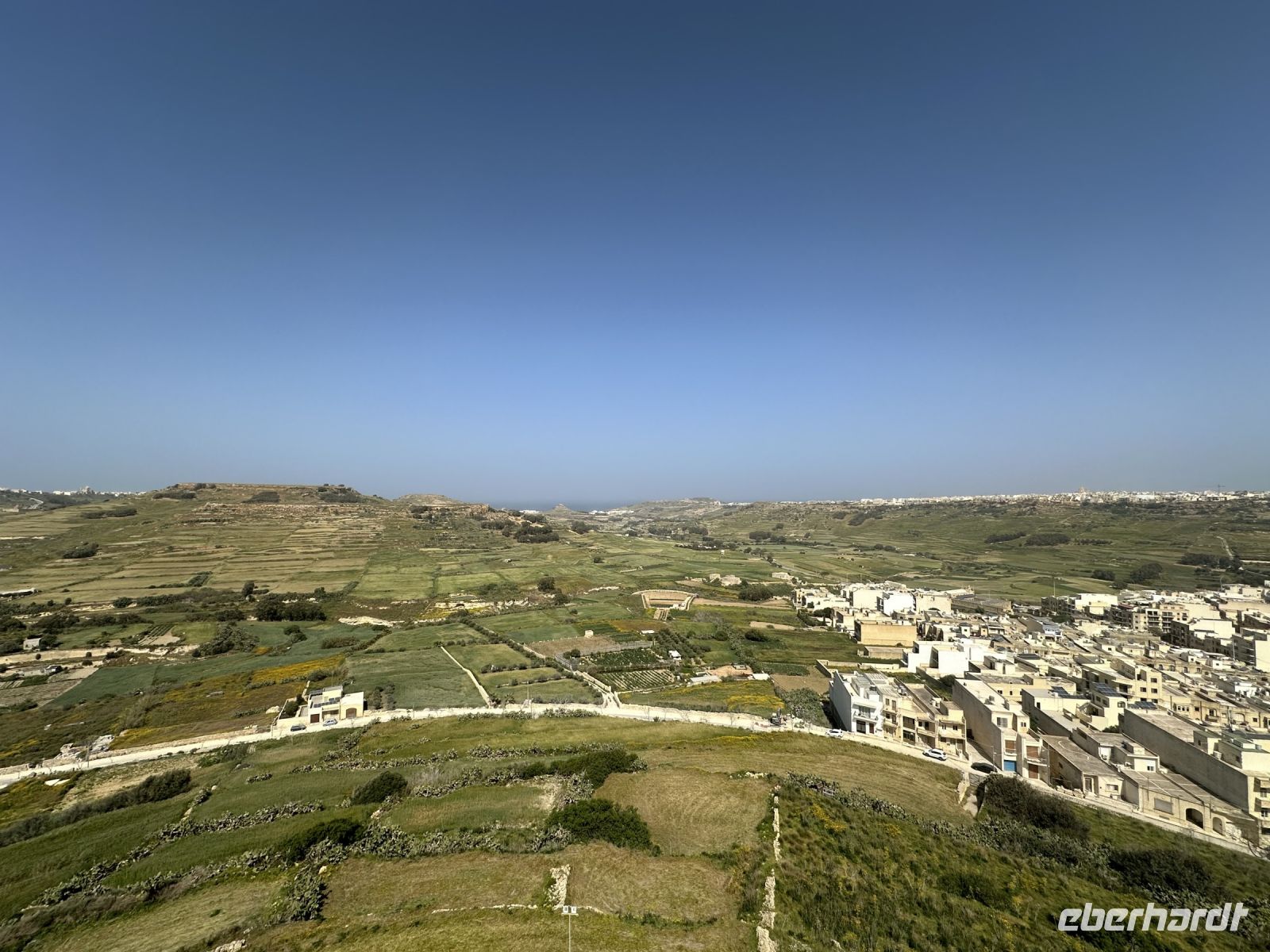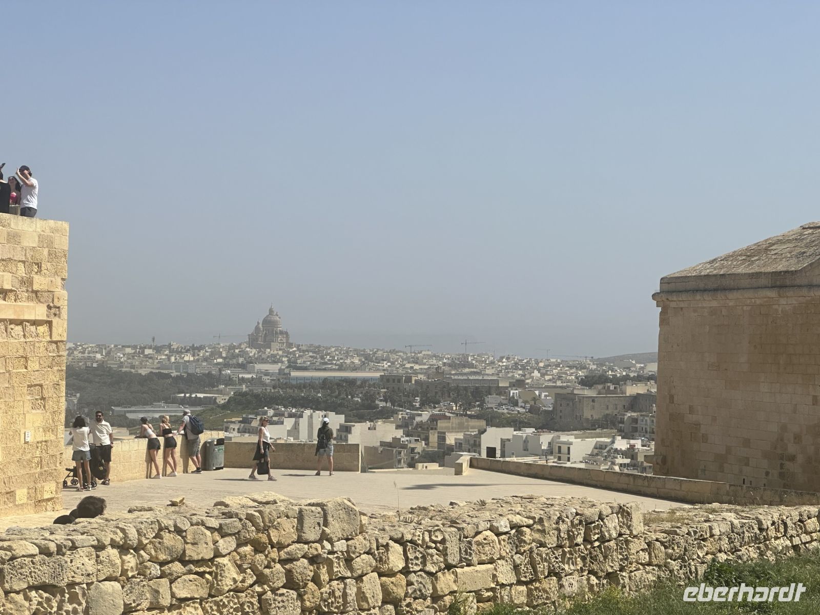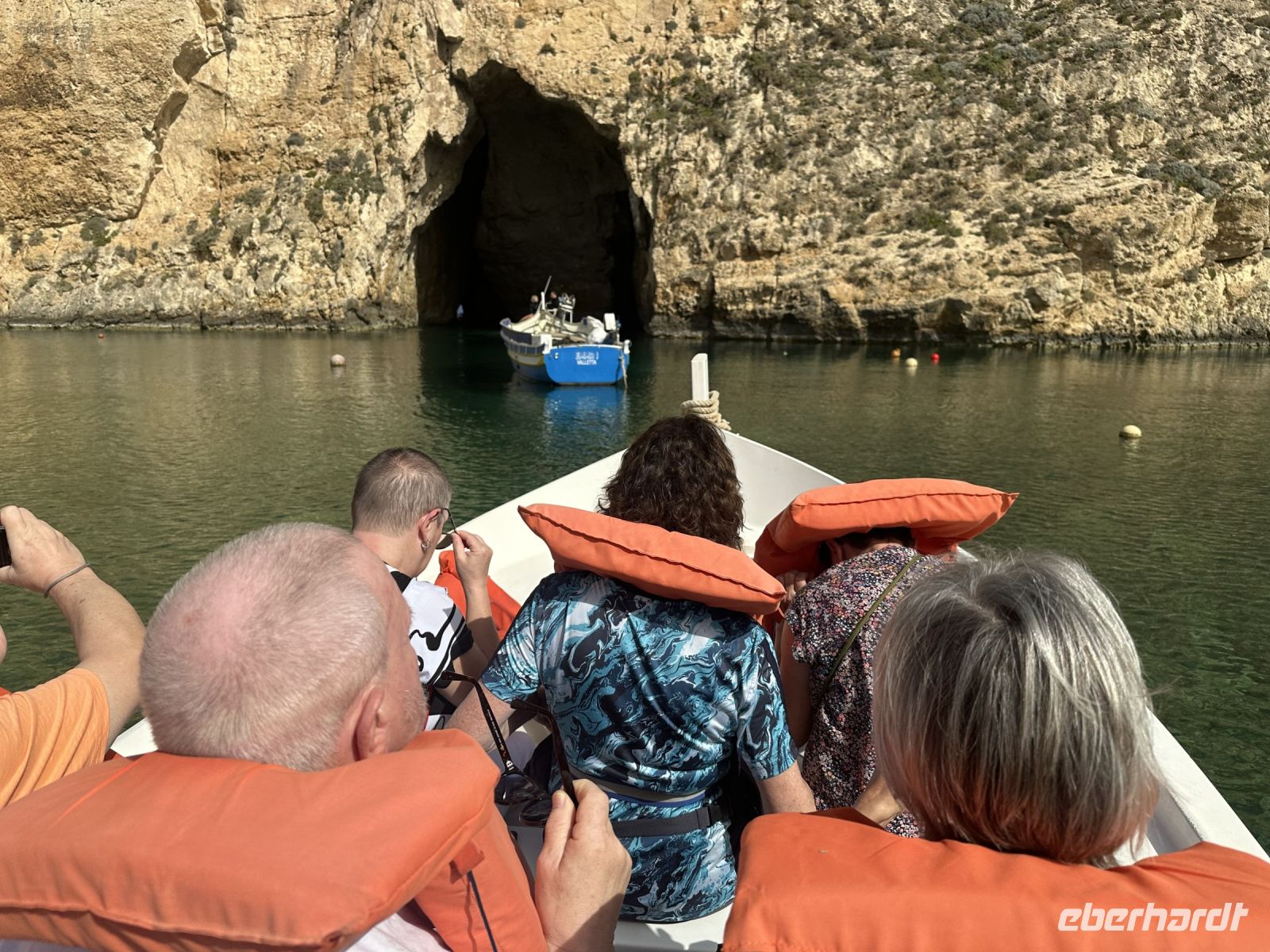 Wir haben heute Glück mit dem Wetter, es ist sonnig und warm und vor allem windstill. So gelingt es uns, doch noch eine Bootsfahrt in eine Blaue Grotte zu unternehmen. Unsere Bötchen durchqueren einen Felstunnel, fahren an beeindruckenden Felsformationen entlang und schließlich in eine Grotte, in der das Wasser tatsächlich eine tiefblaue Farbe hat. In Fontana locken zwei alte Waschhäuser zur Besichtigung ein, genauso interessant ist aber der Souvenirladen, wo vor allem Handarbeiten der Insel Gozo angeboten werden. Mangels Alternativen widmen sich viele Frauen der Insel in Heimarbeit der Herstellung von Tüchern, Tischdecken und Dekorationsartikeln, die hier verkauft werden. Nebenbei sind unter dem Dach des Geschäfts Szenen aus dem Leben der Gemeinschaft auf Gozo zu sehen. Wieder steht uns Zeit zum Erholen und Mittagessen zur Verfügung. Anschließend besuchen wir die Kirche des heiligen St. Georg. Sie wird wegen ihrer prächtigen Ausstattung oft als goldene Kirche bezeichnet. Nun geht es für Freiwillige noch hinauf bis zur Zitadelle, wer nicht mitgehen möchte, kann die Zeit zum Bummeln oder einkehren nutzen. Auf der Zitadelle bekommen wir einen Eindruck, wie gefährlich das Leben einst auf Gozo war. 1551 landete ein Heer von Piraten auf der Insel und verschleppte fast alle Bewohner in die Sklaverei. Eine ewige Flamme erinnert noch heute an dieses schlimme Ereignis. Unter der Kirche der Zitadelle befindet sich ein mysteriöser Steinkreis, dessen Bedeutung bis heute nicht erforscht ist. Wir spazieren entlang der Mauer und haben eine tolle Aussicht auf das umliegende Land, die Dörfer, die Hügel und die Hauptstadt Victoria.