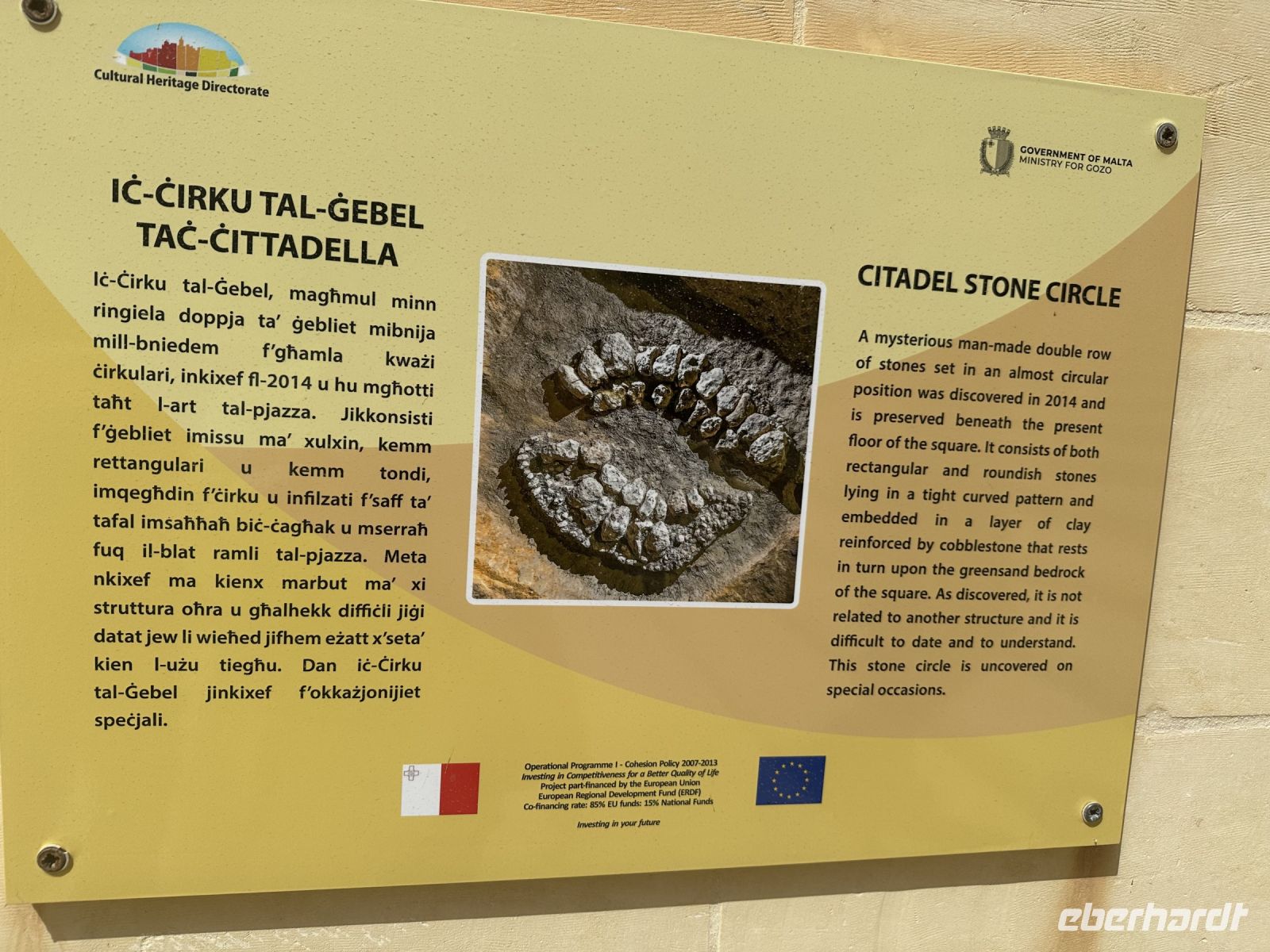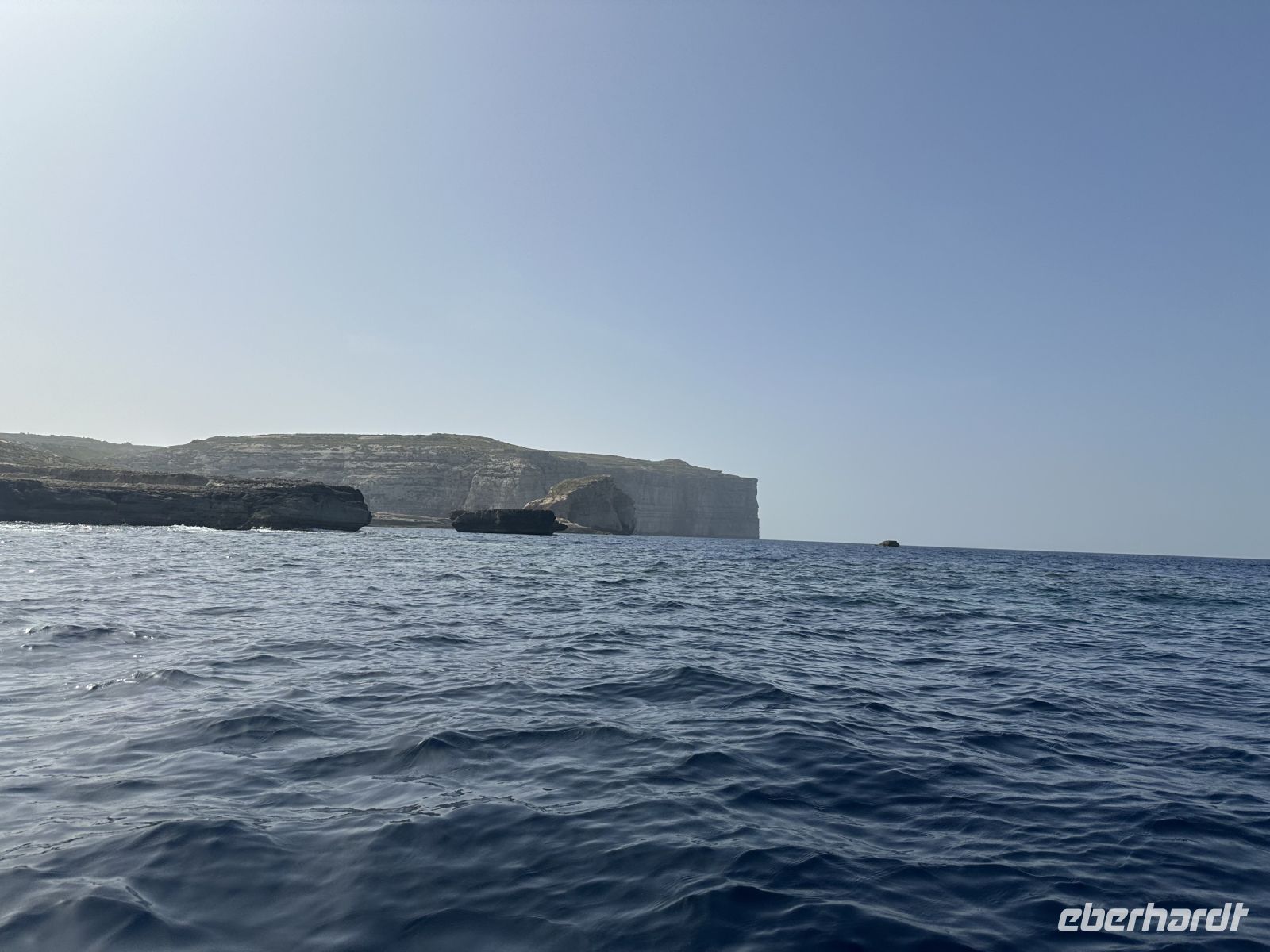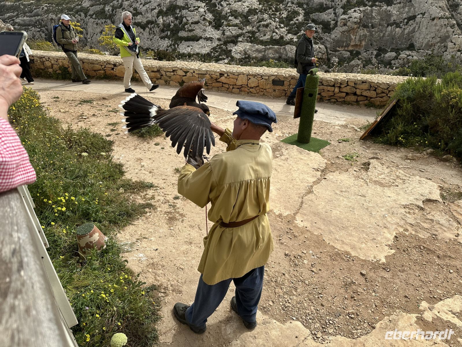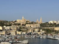 Wir haben heute Glück mit dem Wetter, es ist sonnig und warm und vor allem windstill. So gelingt es uns, doch noch eine Bootsfahrt in eine Blaue Grotte zu unternehmen. Unsere Bötchen durchqueren einen Felstunnel, fahren an beeindruckenden Felsformationen entlang und schließlich in eine Grotte, in der das Wasser tatsächlich eine tiefblaue Farbe hat. In Fontana locken zwei alte Waschhäuser zur Besichtigung ein, genauso interessant ist aber der Souvenirladen, wo vor allem Handarbeiten der Insel Gozo angeboten werden. Mangels Alternativen widmen sich viele Frauen der Insel in Heimarbeit der Herstellung von Tüchern, Tischdecken und Dekorationsartikeln, die hier verkauft werden. Nebenbei sind unter dem Dach des Geschäfts Szenen aus dem Leben der Gemeinschaft auf Gozo zu sehen. Wieder steht uns Zeit zum Erholen und Mittagessen zur Verfügung. Anschließend besuchen wir die Kirche des heiligen St. Georg. Sie wird wegen ihrer prächtigen Ausstattung oft als goldene Kirche bezeichnet. Nun geht es für Freiwillige noch hinauf bis zur Zitadelle, wer nicht mitgehen möchte, kann die Zeit zum Bummeln oder einkehren nutzen. Auf der Zitadelle bekommen wir einen Eindruck, wie gefährlich das Leben einst auf Gozo war. 1551 landete ein Heer von Piraten auf der Insel und verschleppte fast alle Bewohner in die Sklaverei. Eine ewige Flamme erinnert noch heute an dieses schlimme Ereignis. Unter der Kirche der Zitadelle befindet sich ein mysteriöser Steinkreis, dessen Bedeutung bis heute nicht erforscht ist. Wir spazieren entlang der Mauer und haben eine tolle Aussicht auf das umliegende Land, die Dörfer, die Hügel und die Hauptstadt Victoria.