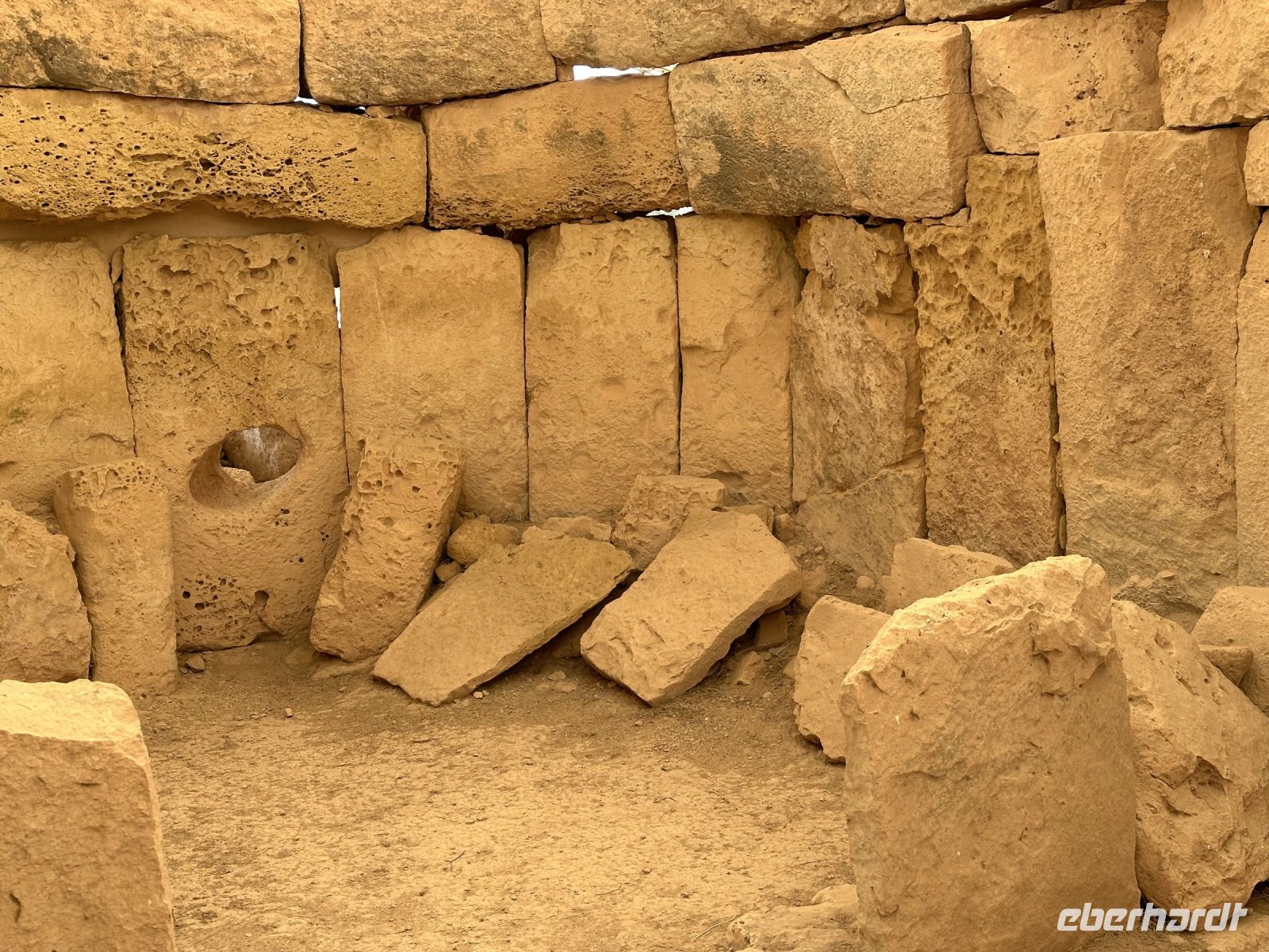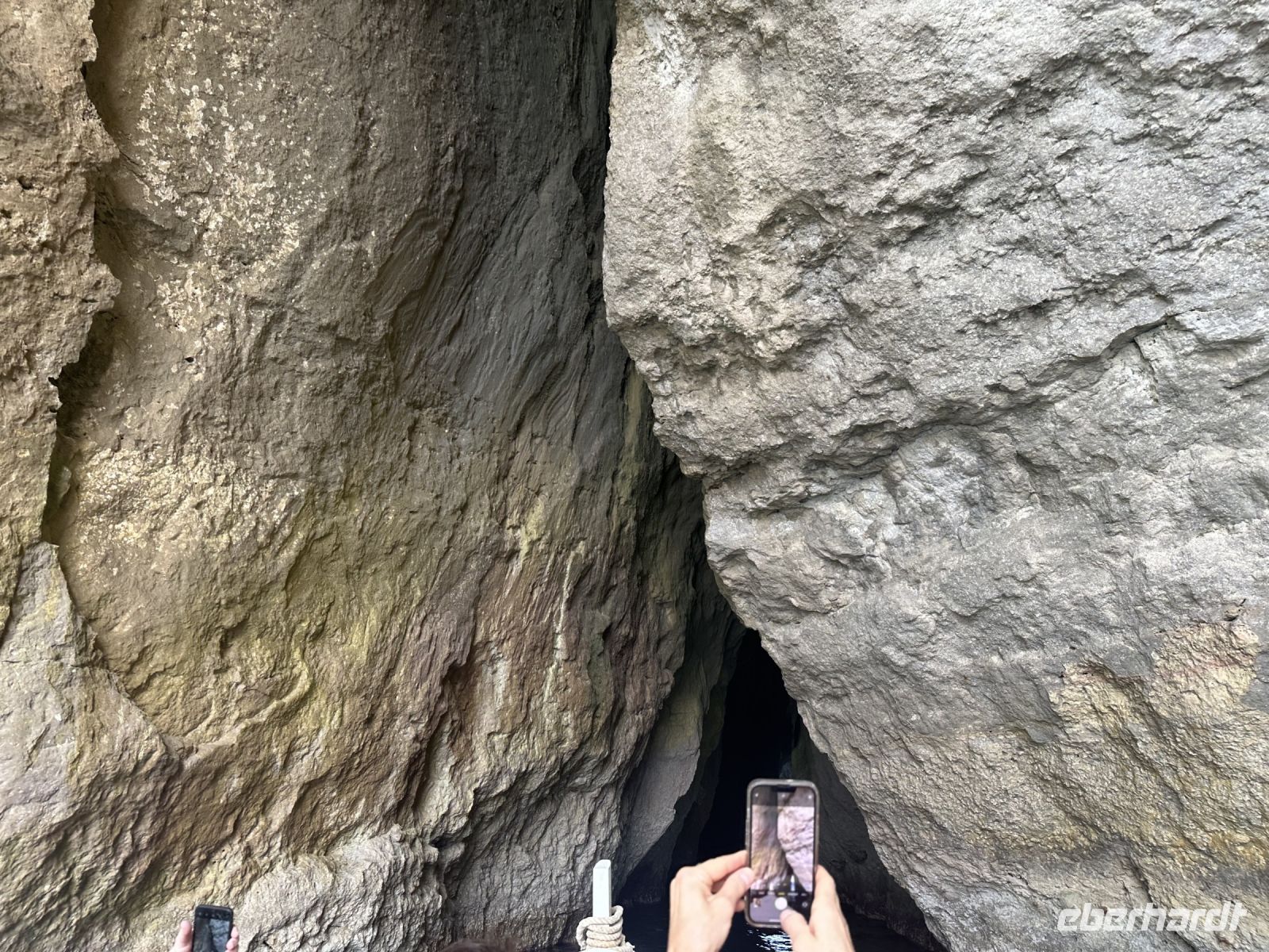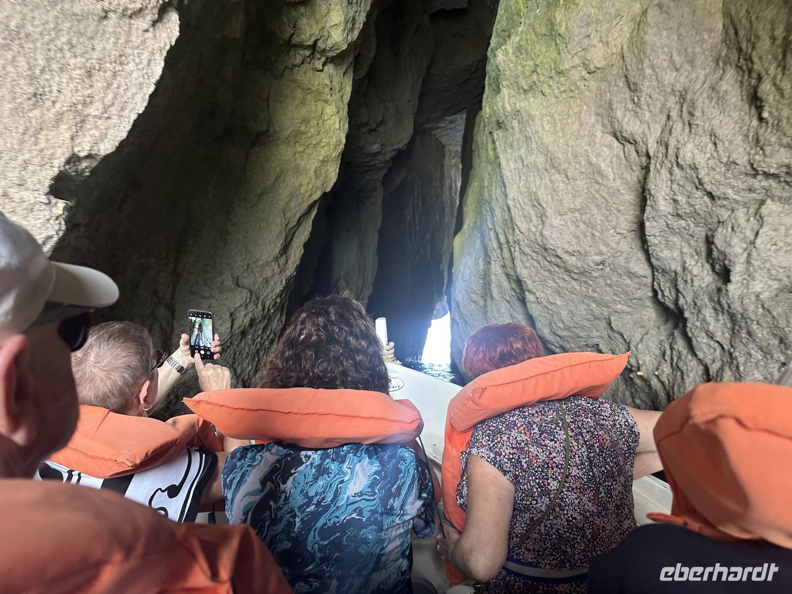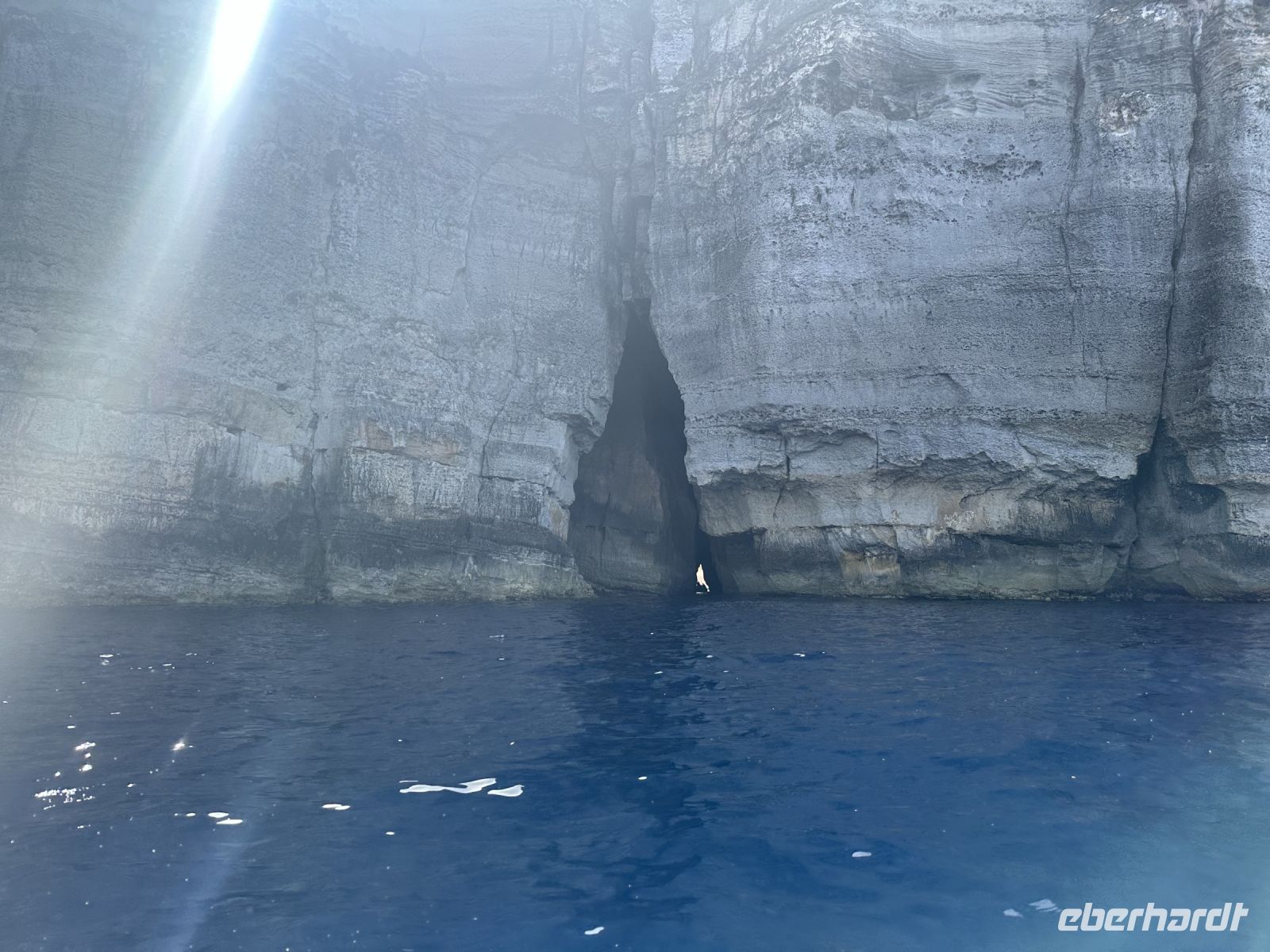 Wir haben heute Glück mit dem Wetter, es ist sonnig und warm und vor allem windstill. So gelingt es uns, doch noch eine Bootsfahrt in eine Blaue Grotte zu unternehmen. Unsere Bötchen durchqueren einen Felstunnel, fahren an beeindruckenden Felsformationen entlang und schließlich in eine Grotte, in der das Wasser tatsächlich eine tiefblaue Farbe hat. In Fontana locken zwei alte Waschhäuser zur Besichtigung ein, genauso interessant ist aber der Souvenirladen, wo vor allem Handarbeiten der Insel Gozo angeboten werden. Mangels Alternativen widmen sich viele Frauen der Insel in Heimarbeit der Herstellung von Tüchern, Tischdecken und Dekorationsartikeln, die hier verkauft werden. Nebenbei sind unter dem Dach des Geschäfts Szenen aus dem Leben der Gemeinschaft auf Gozo zu sehen. Wieder steht uns Zeit zum Erholen und Mittagessen zur Verfügung. Anschließend besuchen wir die Kirche des heiligen St. Georg. Sie wird wegen ihrer prächtigen Ausstattung oft als goldene Kirche bezeichnet. Nun geht es für Freiwillige noch hinauf bis zur Zitadelle, wer nicht mitgehen möchte, kann die Zeit zum Bummeln oder einkehren nutzen. Auf der Zitadelle bekommen wir einen Eindruck, wie gefährlich das Leben einst auf Gozo war. 1551 landete ein Heer von Piraten auf der Insel und verschleppte fast alle Bewohner in die Sklaverei. Eine ewige Flamme erinnert noch heute an dieses schlimme Ereignis. Unter der Kirche der Zitadelle befindet sich ein mysteriöser Steinkreis, dessen Bedeutung bis heute nicht erforscht ist. Wir spazieren entlang der Mauer und haben eine tolle Aussicht auf das umliegende Land, die Dörfer, die Hügel und die Hauptstadt Victoria.