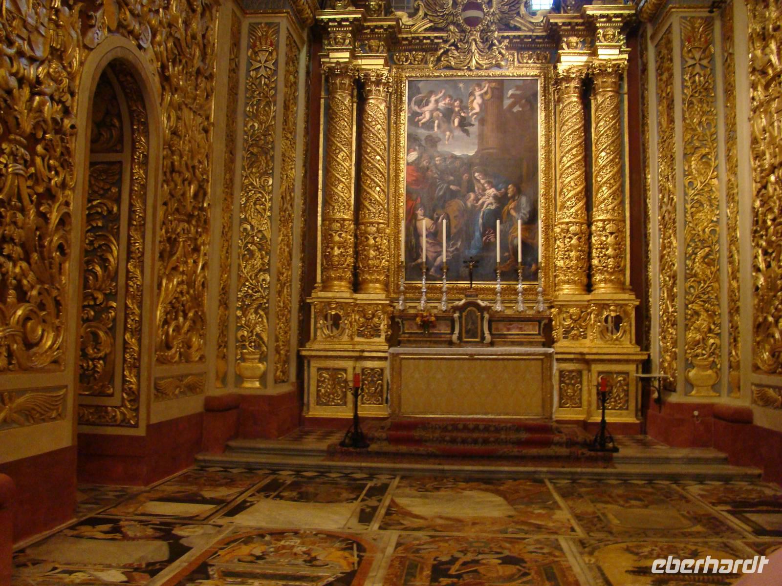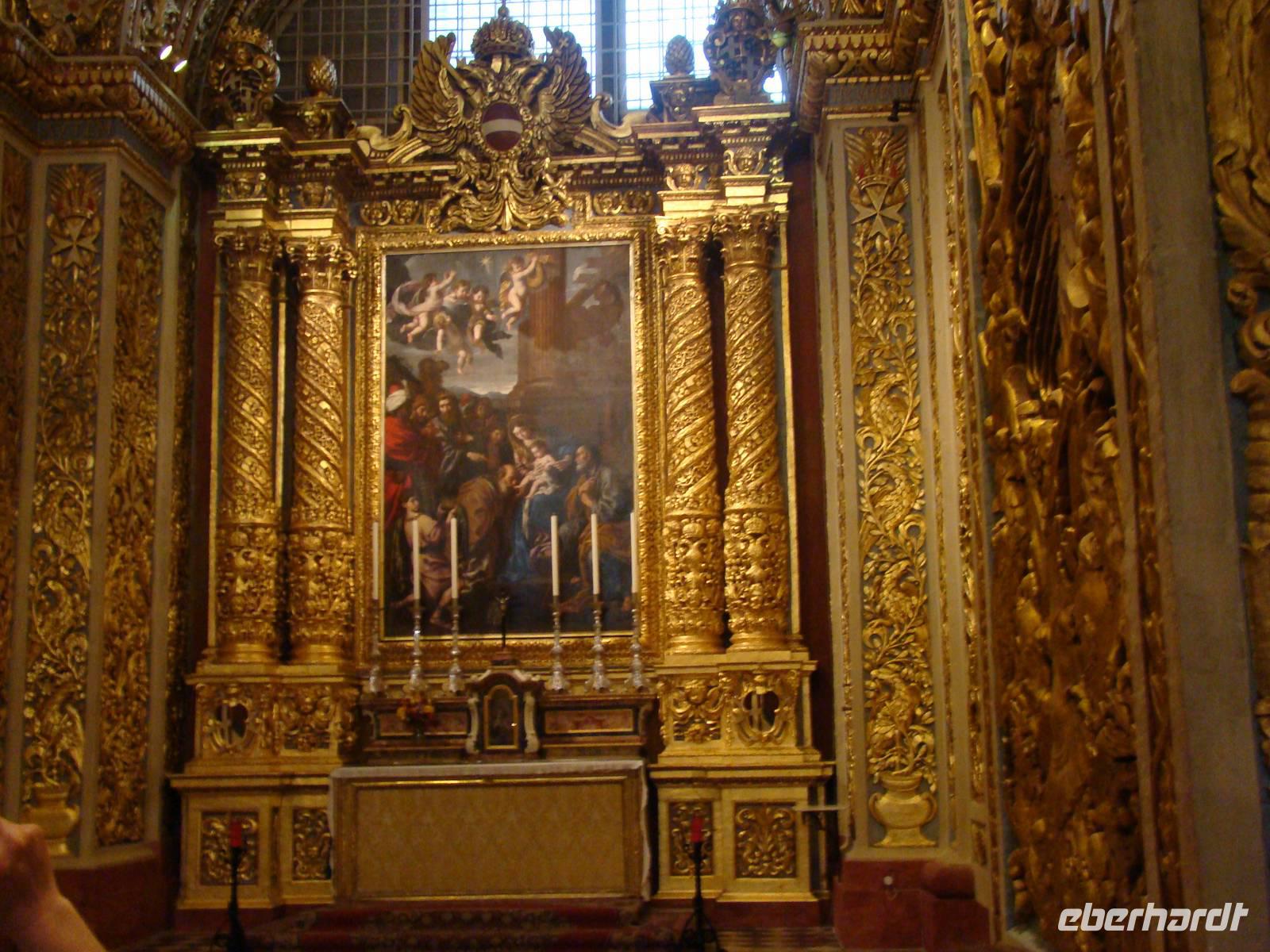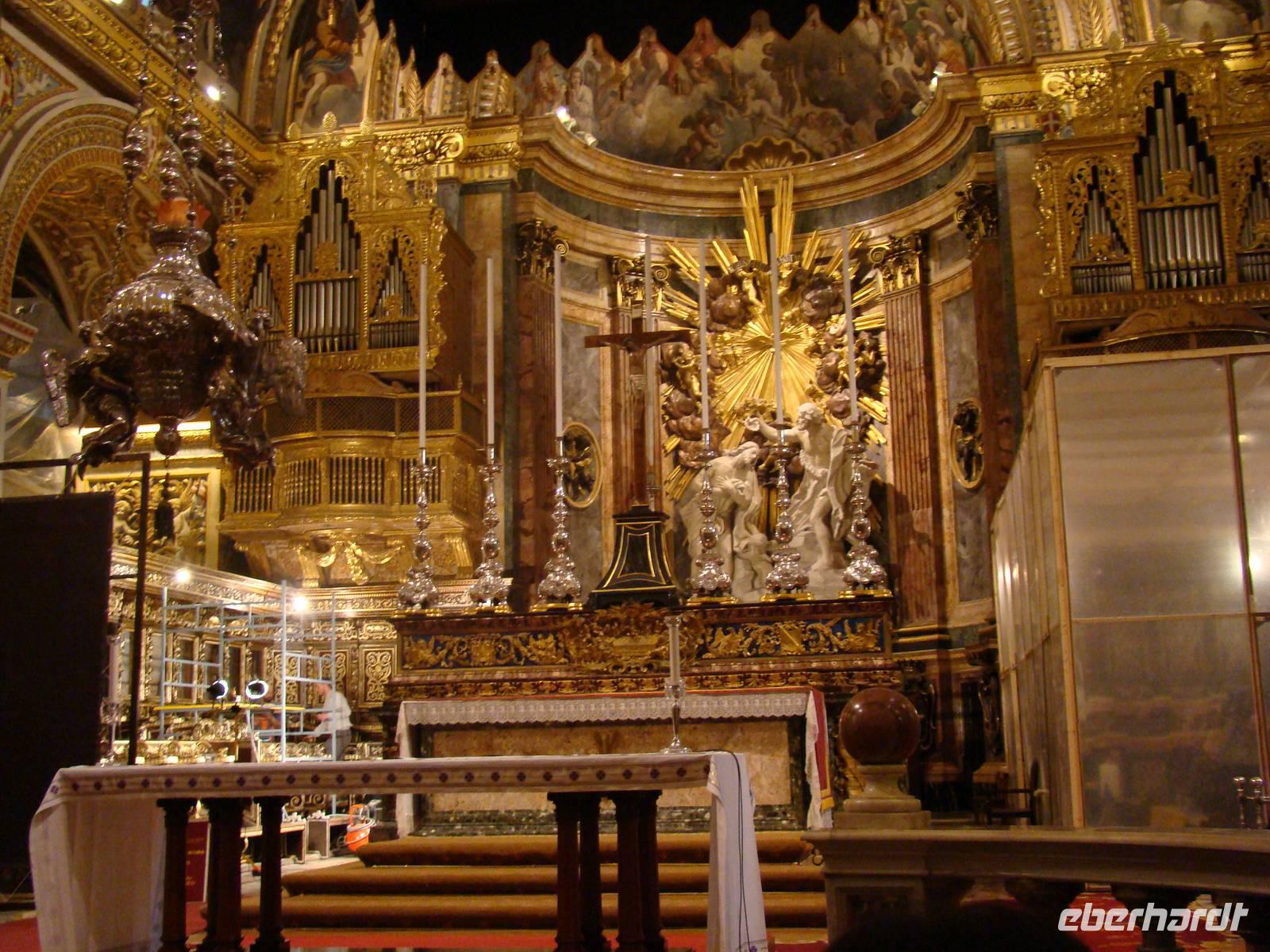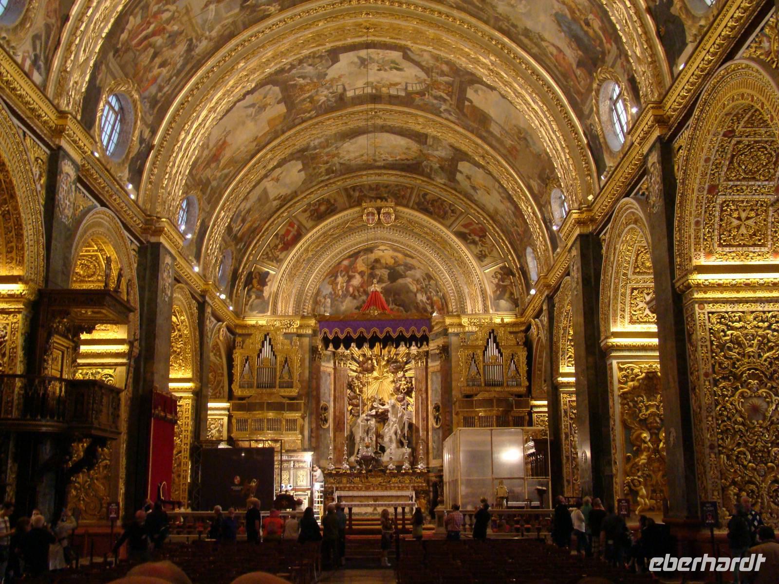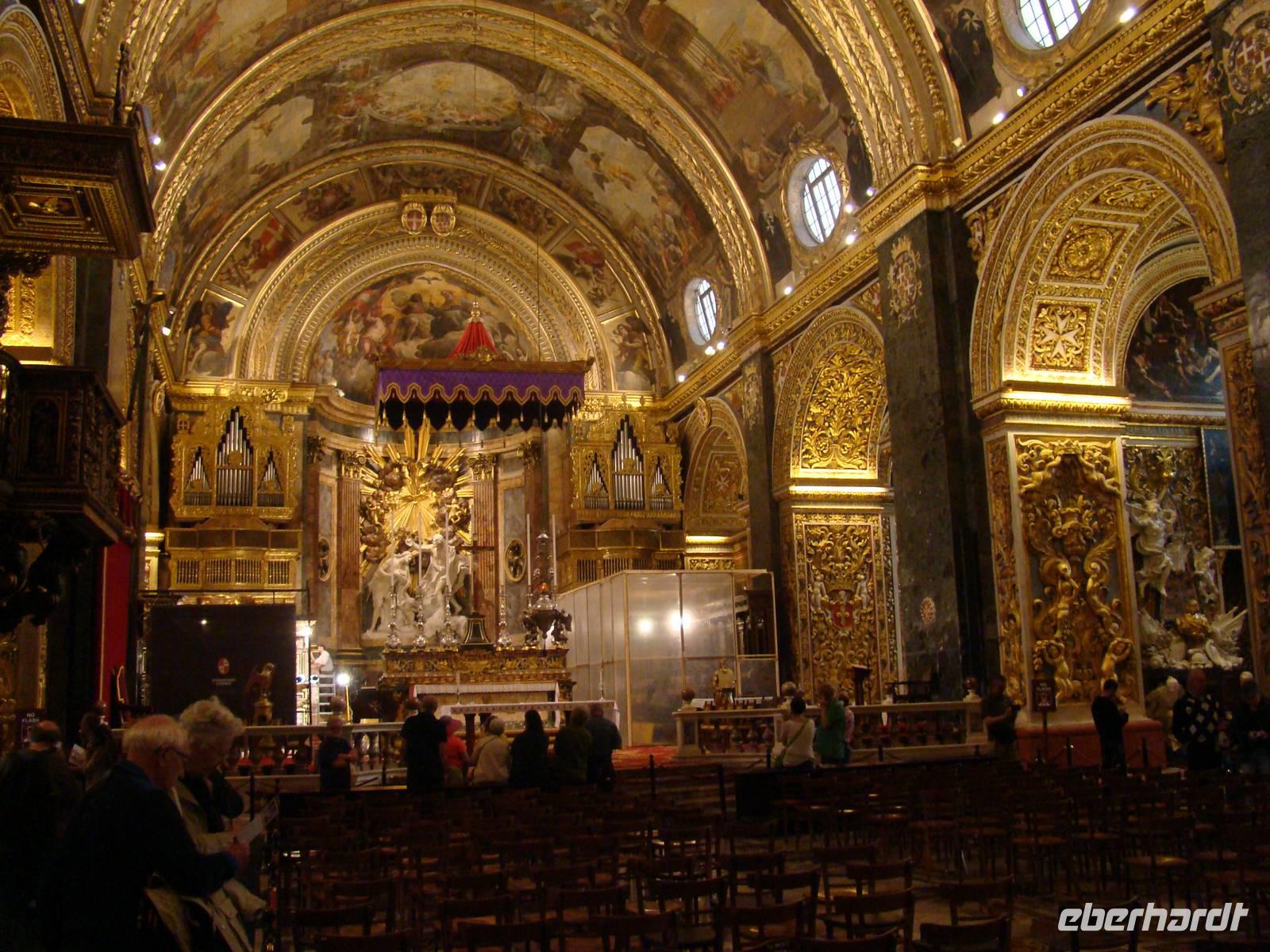 Zunächst führte uns Roswitha über eine Brücke in die Altstadt, vom Hastings Garden aus genossen wir die Aussicht zum Yachthafen von Valletta. Weiter ging es zum Upper Barraka Garden. Hier hatten wir einen tollen Blick auf den Großhafen von Valletta, hier legen auch die großen Kreuzfahrtsschiffe an. Ein Fahrstuhl fährt die Gäste dann nach oben in die Altstadt. Da die schön angelegte Gartenanlage mit seinen großen Bäumen, hübsch angelegten Blumenbeten und Bänken regelreicht zum Verweilen einlud, machten wir hier unsere erste kleine Pause. Weiter durch die Gassen der Altstadt gingen wir zur St. John´s Co. Kathedrale. Wir waren alle sehr beeindruckt von der Größe und Prächtigkeit dieser Kirche, deren Geschichte schon lange zurückreicht. Mit Rucksack auf den Bäuchen, Sprechfunkhörer, über den wir Roswithas Erklärungen lauschten, in der einen und Fotokamera in der anderen Hand liefen wir durch die Kathedrale.