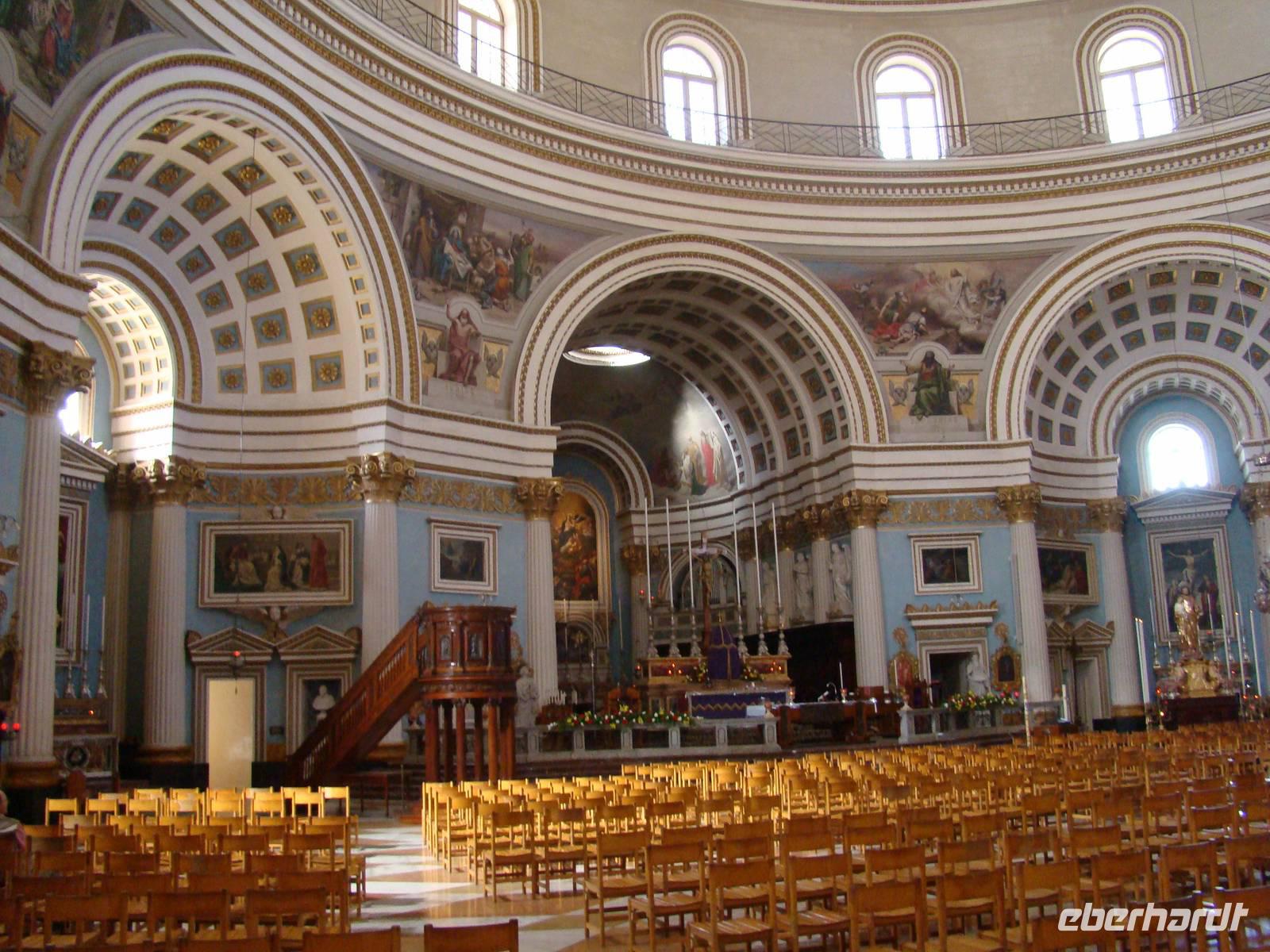 Am Dienstag ging es das erste Mal Wandern. Startpunkt war der Eingang zum Gnejna Tal. Entlang des Chadwick-Flusses, welcher für uns eher ein Bach war liefen wir einen sehr bequemen Weg und konnten uns den ersten Eindruck der Natur Maltas im Frühling verschaffen. Viele von uns hatten sich diese nicht so grün und farbenfroh vorgestellt. Roswitha zeigte uns Fenchel, Kakteen, Feigenbäume und Thymian am Wegesrand. Auch die erreichten Chadwick- Seen waren für unsere Verhältnisse eher ein Teich. Nachdem wir durch unwegsames Geländer über Wiesen und Felder, durch private Grundstücke, die auch gerne mal als Autofriedhof genutzt werden wanderten, erreichten wir nach einer kleinen Pause die Victoria Lines. Die um 1722 errichtete Mauer, die als Schutzwall gegen feindliche Übergriffe gedacht war, bot uns einen fantastischen Blick über Malta. Nach unserer Mittagspause an der „ Kapella tal-Madonna" ging es vorbei an Kakteen, die wie wir lernten oft als Wetterlinie am Feldrand dienen, Erdbeerfeldern, Tomatengewächshäusern, Kartoffel- und Brokkolifeldern unterhalb des Ortes Mgarr zur Gnejna Bucht. Dort wartete schon unser Minibus, der uns nach einem kleinen Fotostopp an der Kirche von Mgarr nach Mosta fuhr. Wir besichtigten die drittgrößte Kuppelkirche Europas; die Rotunda. Noch schnell vor einer dort geplanten Beerdigungszeremonie bestaunten wir das pompös ausgestaltete Innere der Kathedrale. Viel Gold und die Kopie einer nicht detonierte Bombe aus dem 2.Weltkrieg, die damals durch das Kuppeldach krachte und 302 Menschen verschonte, waren zu bestaunen.
