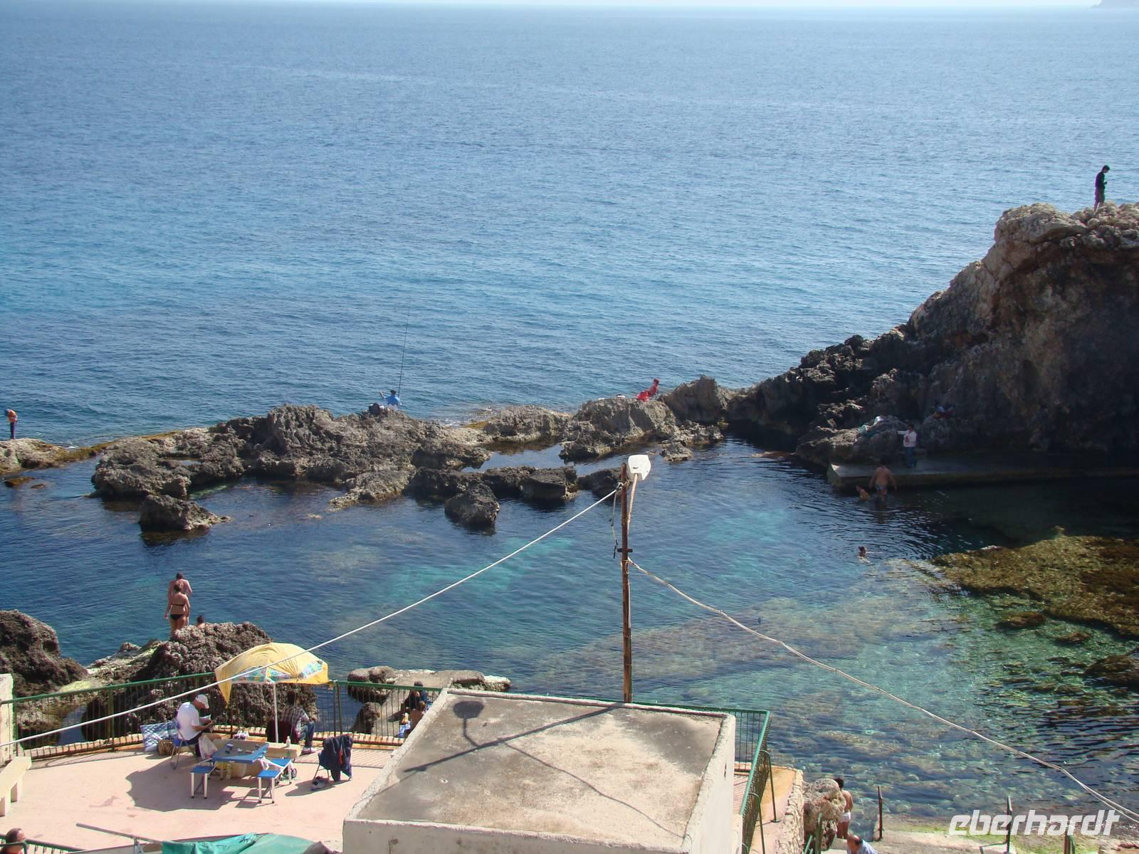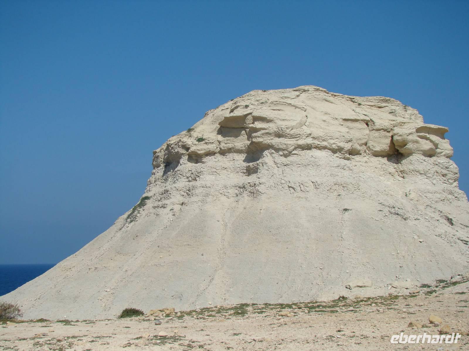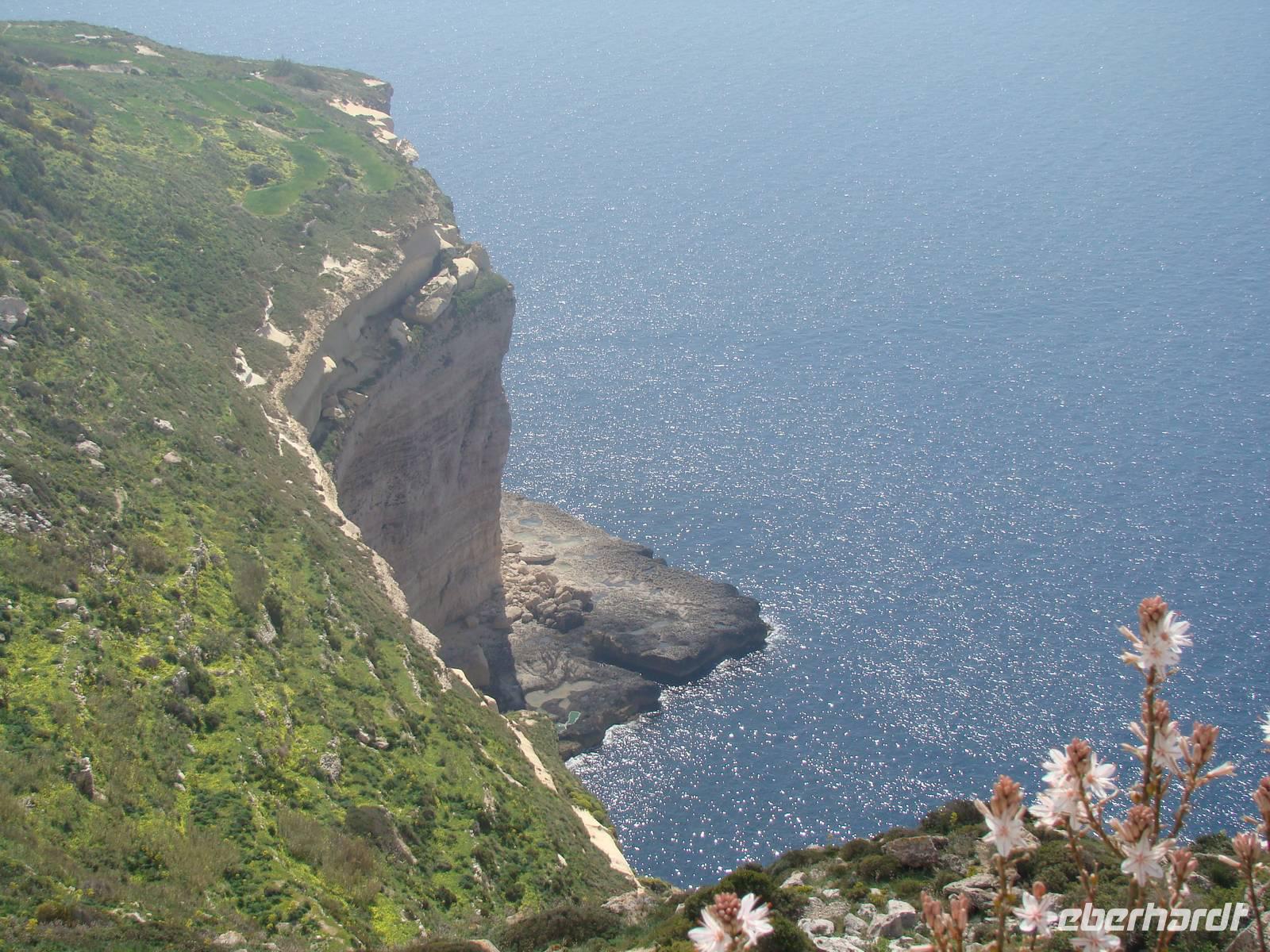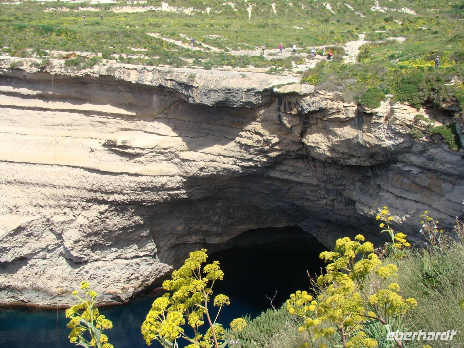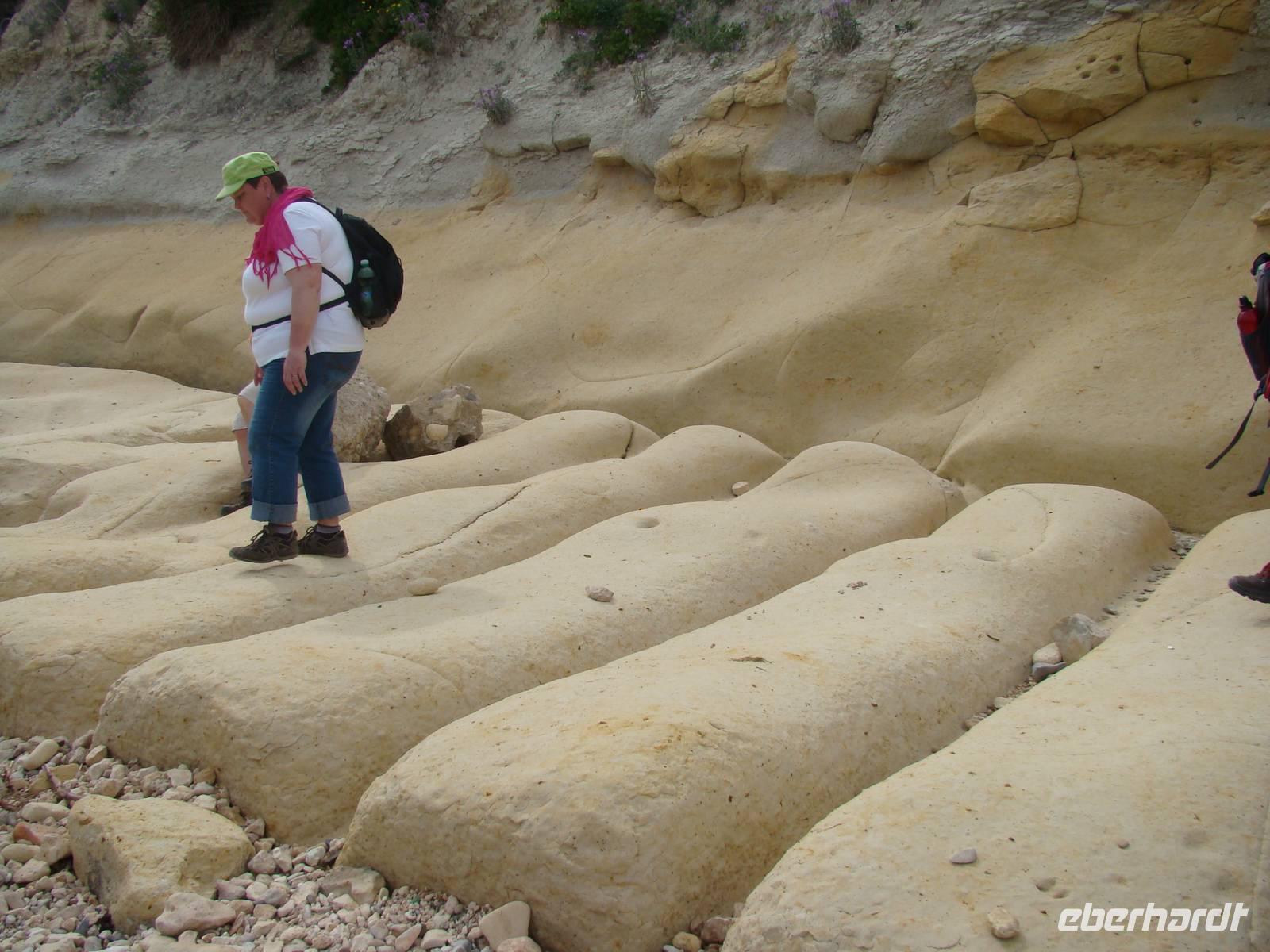 Bald gelangten wir an die Dingli-Klippen, an denen wir erst einmal erstaunt ob der beeindruckenden Tiefe dieser Steilklippen stehen blieben. Einige von uns trauten sich die sichere Straße zu verlassen und liefen an den Klippen entlang. Nach einem steilen Abstieg erreichten wir die Bucht Ghar Lapsi. Wir genossen kurz die Aussicht auf die schöne Badebucht, machten uns dann aber schnell mit dem Minibus auf den Weg zur „Blauen Grotte". Einige aus unserer Gruppe schipperten mit dem Boot nah an die Grotte heran, andere von uns wiederum schauten sie sich lieber alles von oben an. Ein weiterer Programmpunkt war die Besichtigung des Hagar Qim Tempel, Rowitha führte uns durch das Relikt jener längst vergangenen Zeiten und erklärte uns geduldig die „Stehenden Steine".