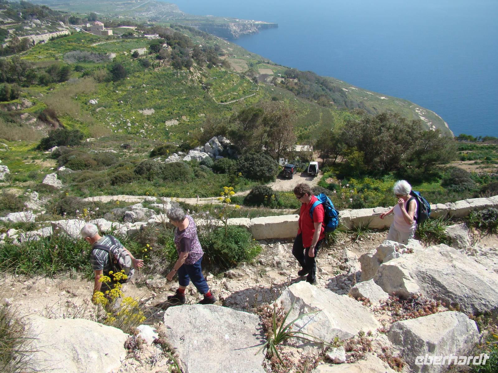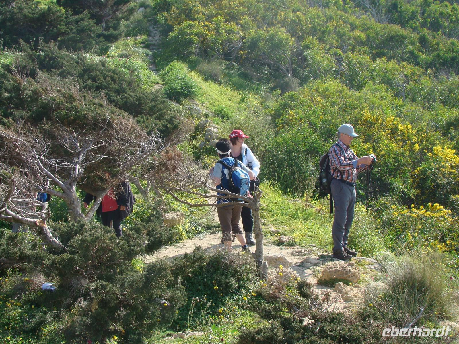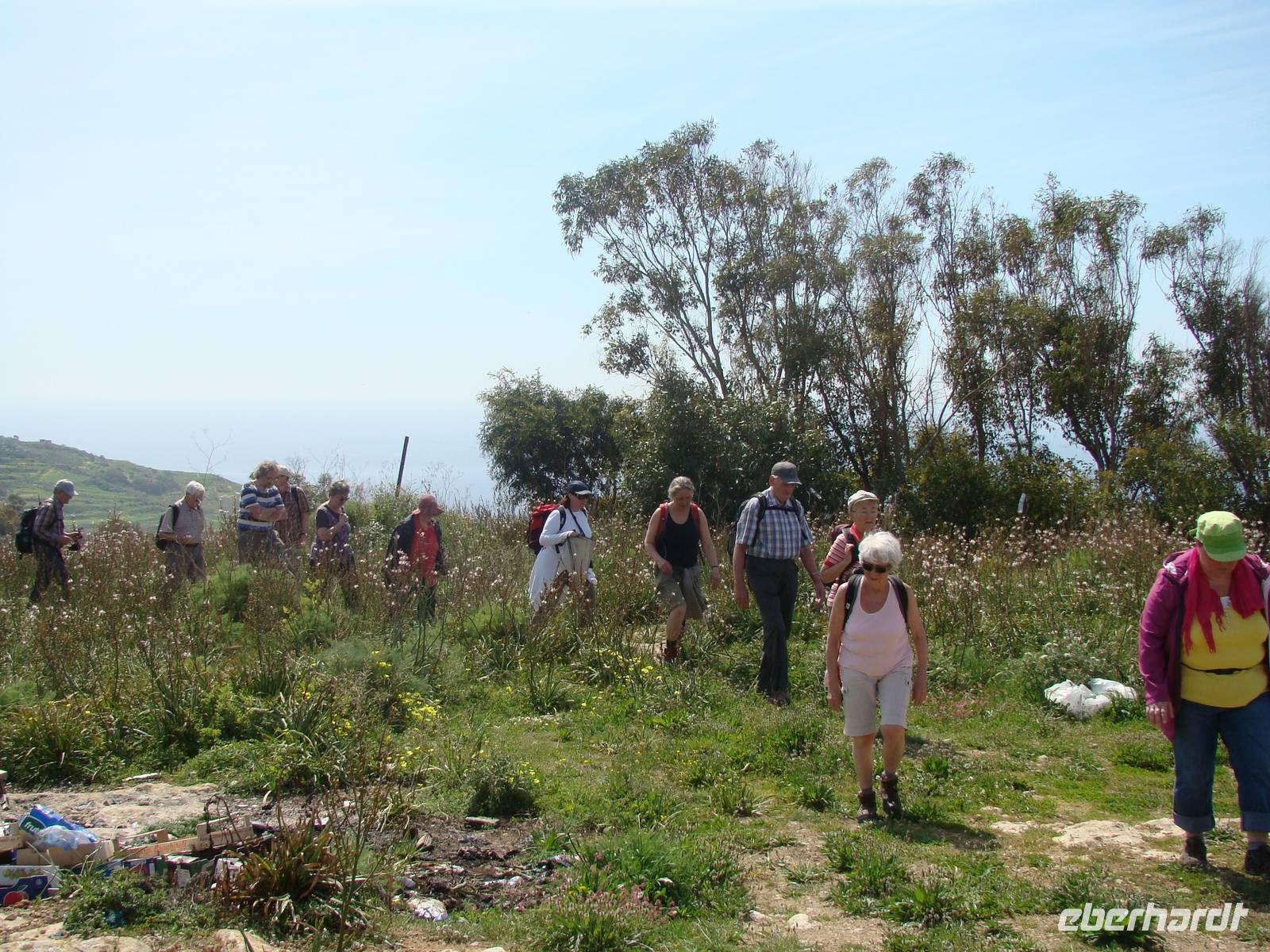 Am letzten Tag unternahmen wir noch einmal eine besonders schöne Wanderung. Unser Ausgangspunkt war der barocke Selmun Palace, von dort wanderten wir durch das fruchtbare Mgiebah Valley. Bald eröffnete sich uns ein großartiger Ausblick auf die St. Paul's Island, den wir bei einer kleinen Pause ausnutzten. Auf unserem weiteren Weg kamen wir an der Mistra Bucht vorbei und erklommen nach der Straßenunterführung die Steinwiesen um die Höhlengräber zu besichtigen. Nach der Mittagspause an den Überresten einer Tempel- oder Höhlenanlage führte uns Roswitha durch einen kleinen Wald. Wir genossen den wohltuenden und auf Malta seltenen Schatten und schauten den einigen fröhlichen Familien zu, die sich überall im Wald zum gesellschaftlichen Beisammensein und Grillen verabredet hatten. Über eine Straße gelangten wir schließlich zum „Majjistral Park", das größte Naturschutzgebiet Maltas. Entlang der Klippen durch blühende Wiesen ging es zur Golden Bay, einem wunderschönen Sandstrand, an dem wir unsere Freizeit in der Sonne genossen. Zum Baden war es uns jedoch noch eindeutig zu kalt, aber manch einer traute sich mit den Füßen ins Wasser.