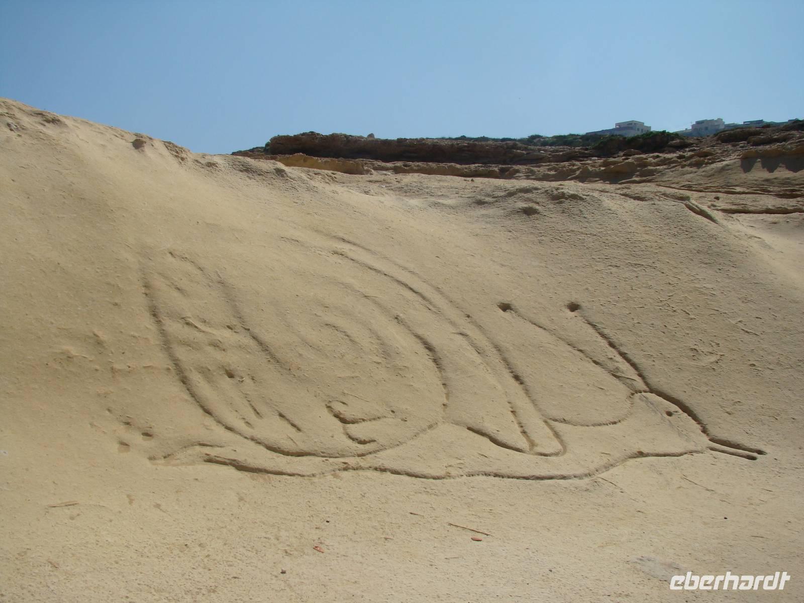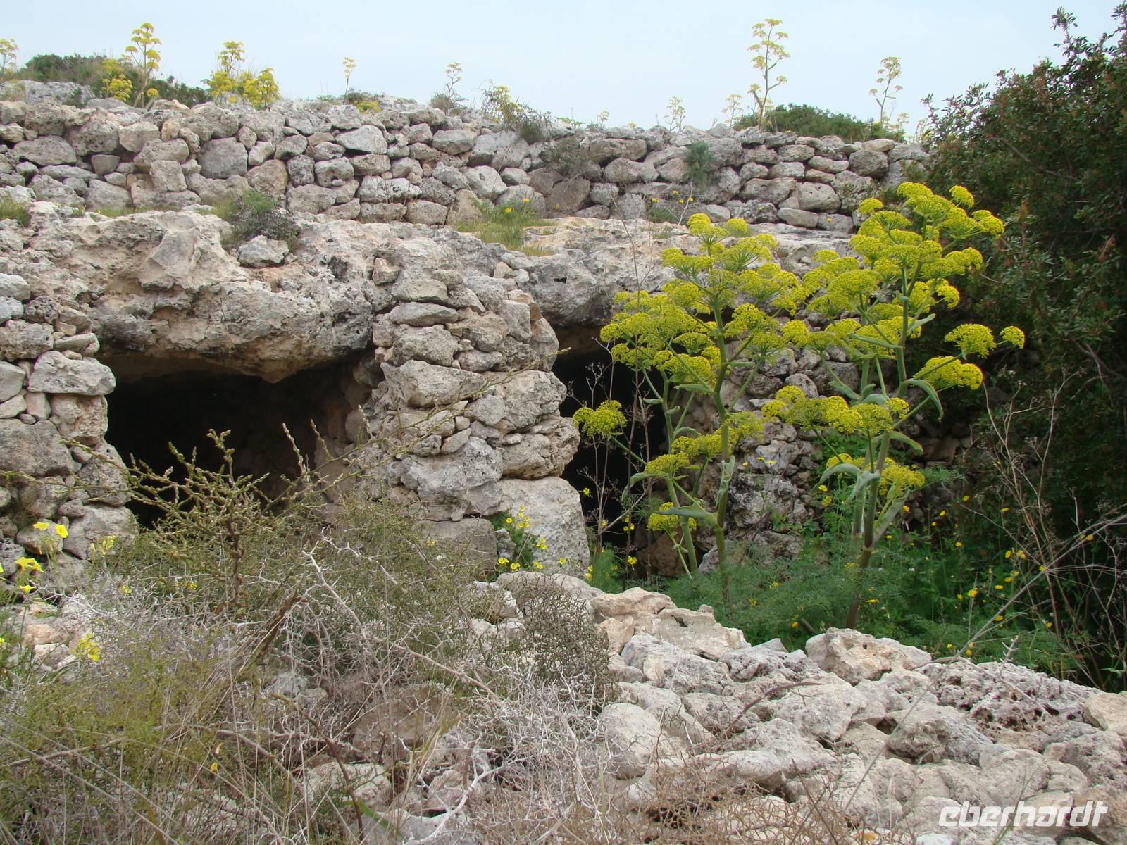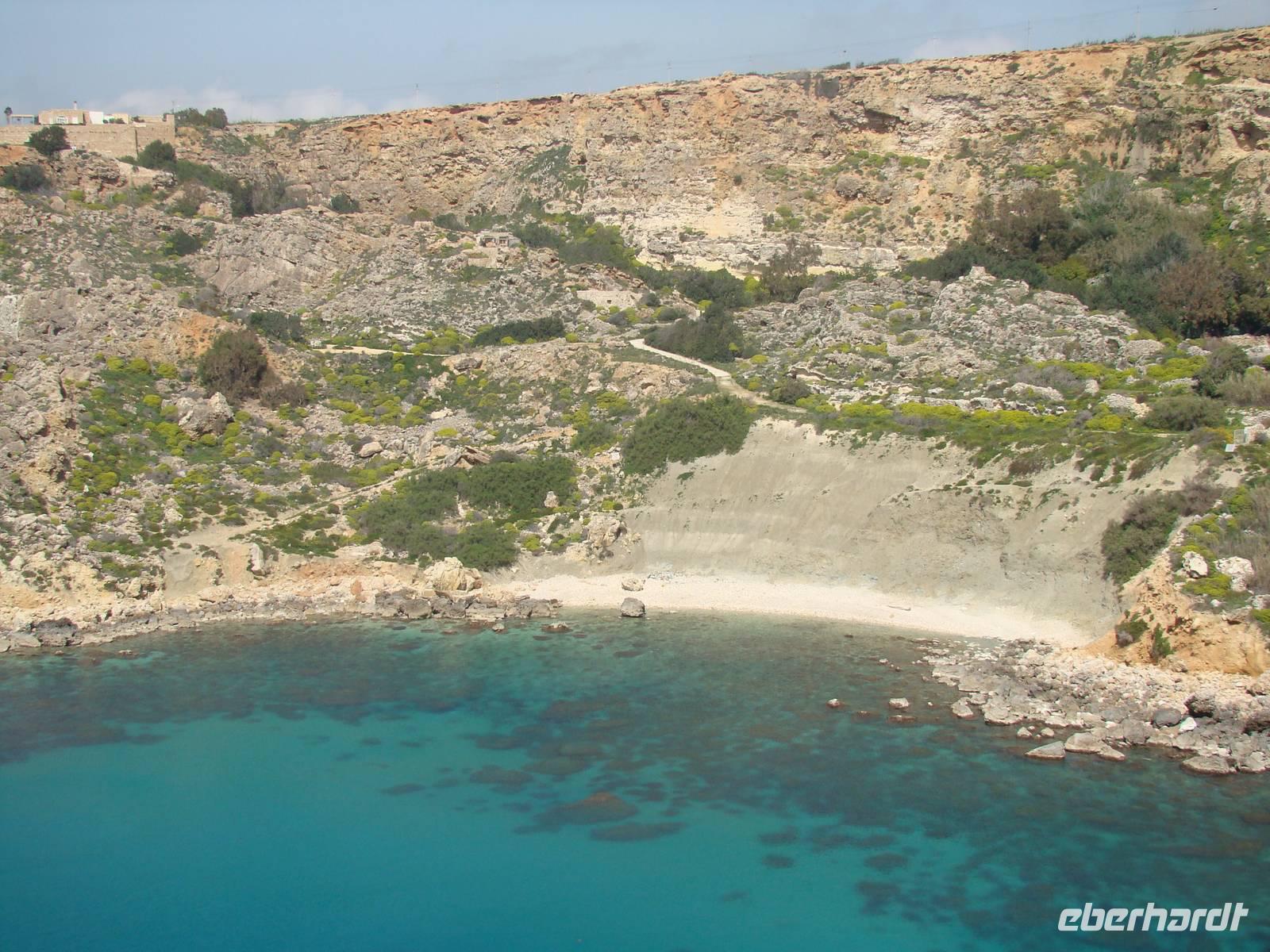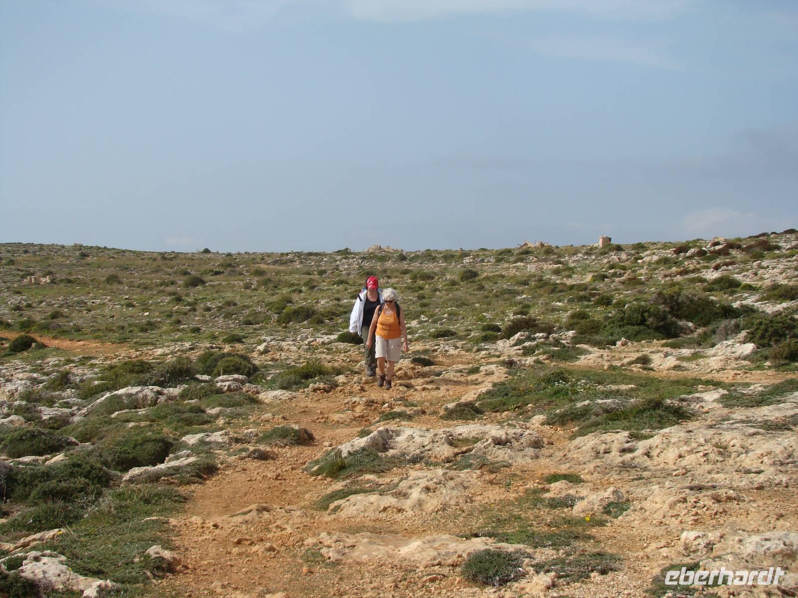 Am letzten Tag unternahmen wir noch einmal eine besonders schöne Wanderung. Unser Ausgangspunkt war der barocke Selmun Palace, von dort wanderten wir durch das fruchtbare Mgiebah Valley. Bald eröffnete sich uns ein großartiger Ausblick auf die St. Paul's Island, den wir bei einer kleinen Pause ausnutzten. Auf unserem weiteren Weg kamen wir an der Mistra Bucht vorbei und erklommen nach der Straßenunterführung die Steinwiesen um die Höhlengräber zu besichtigen. Nach der Mittagspause an den Überresten einer Tempel- oder Höhlenanlage führte uns Roswitha durch einen kleinen Wald. Wir genossen den wohltuenden und auf Malta seltenen Schatten und schauten den einigen fröhlichen Familien zu, die sich überall im Wald zum gesellschaftlichen Beisammensein und Grillen verabredet hatten. Über eine Straße gelangten wir schließlich zum „Majjistral Park", das größte Naturschutzgebiet Maltas. Entlang der Klippen durch blühende Wiesen ging es zur Golden Bay, einem wunderschönen Sandstrand, an dem wir unsere Freizeit in der Sonne genossen. Zum Baden war es uns jedoch noch eindeutig zu kalt, aber manch einer traute sich mit den Füßen ins Wasser.
