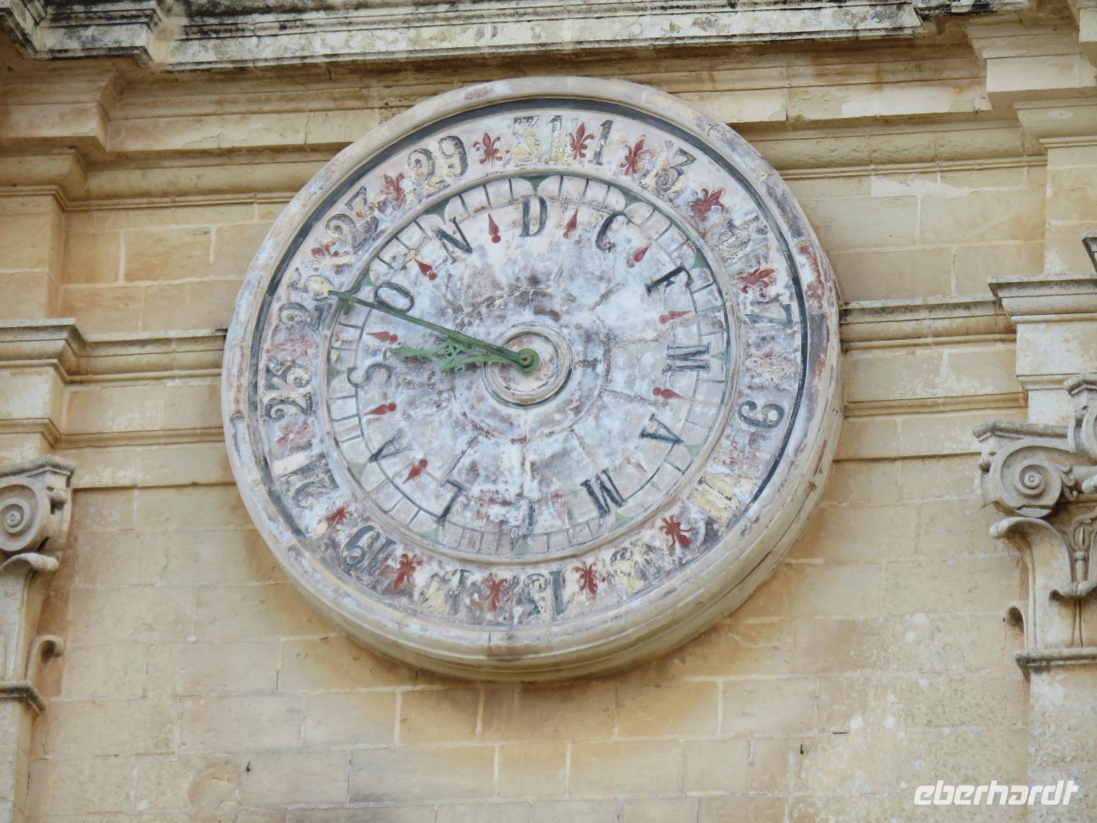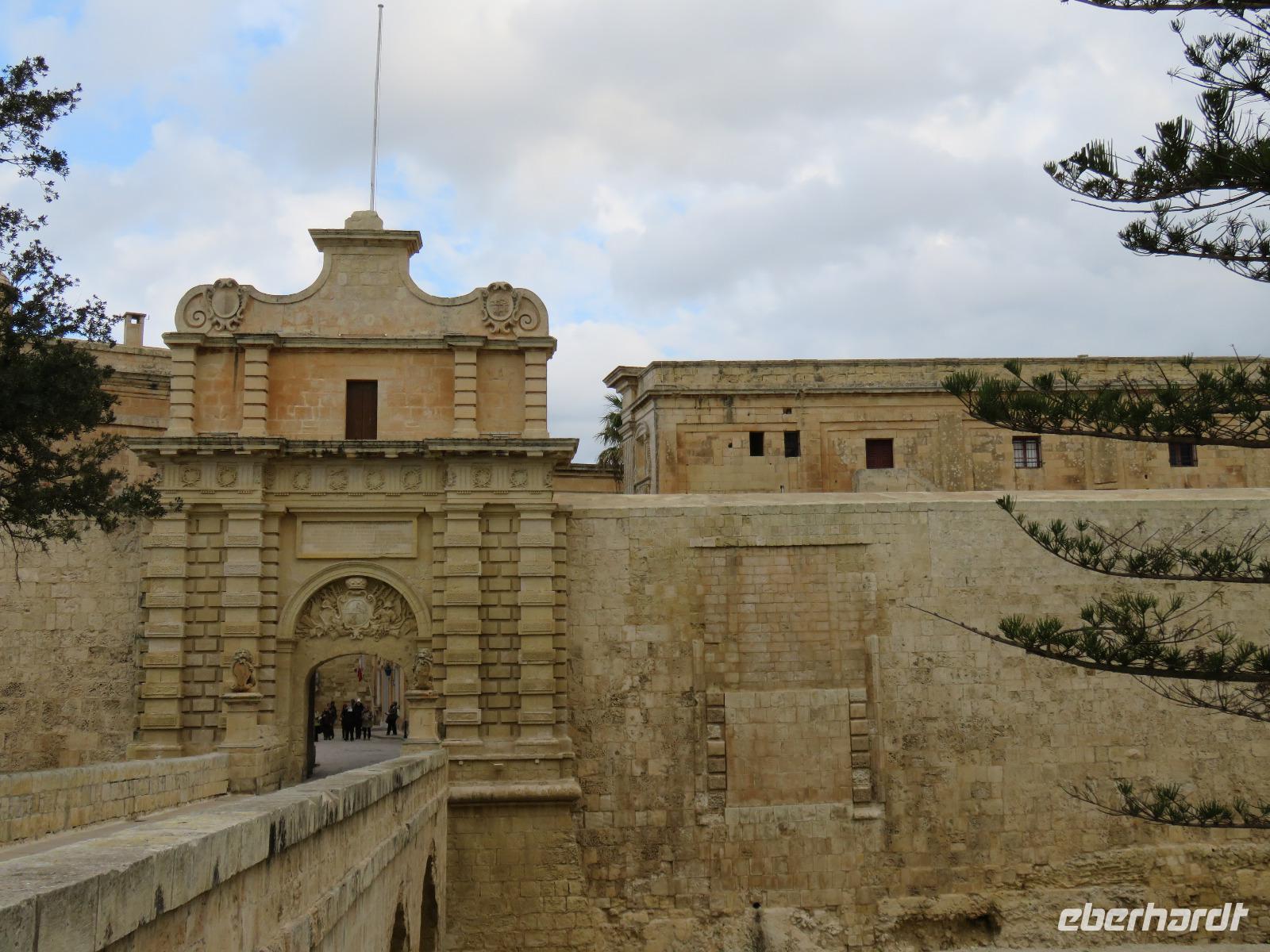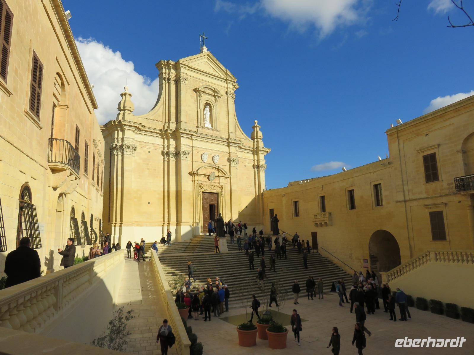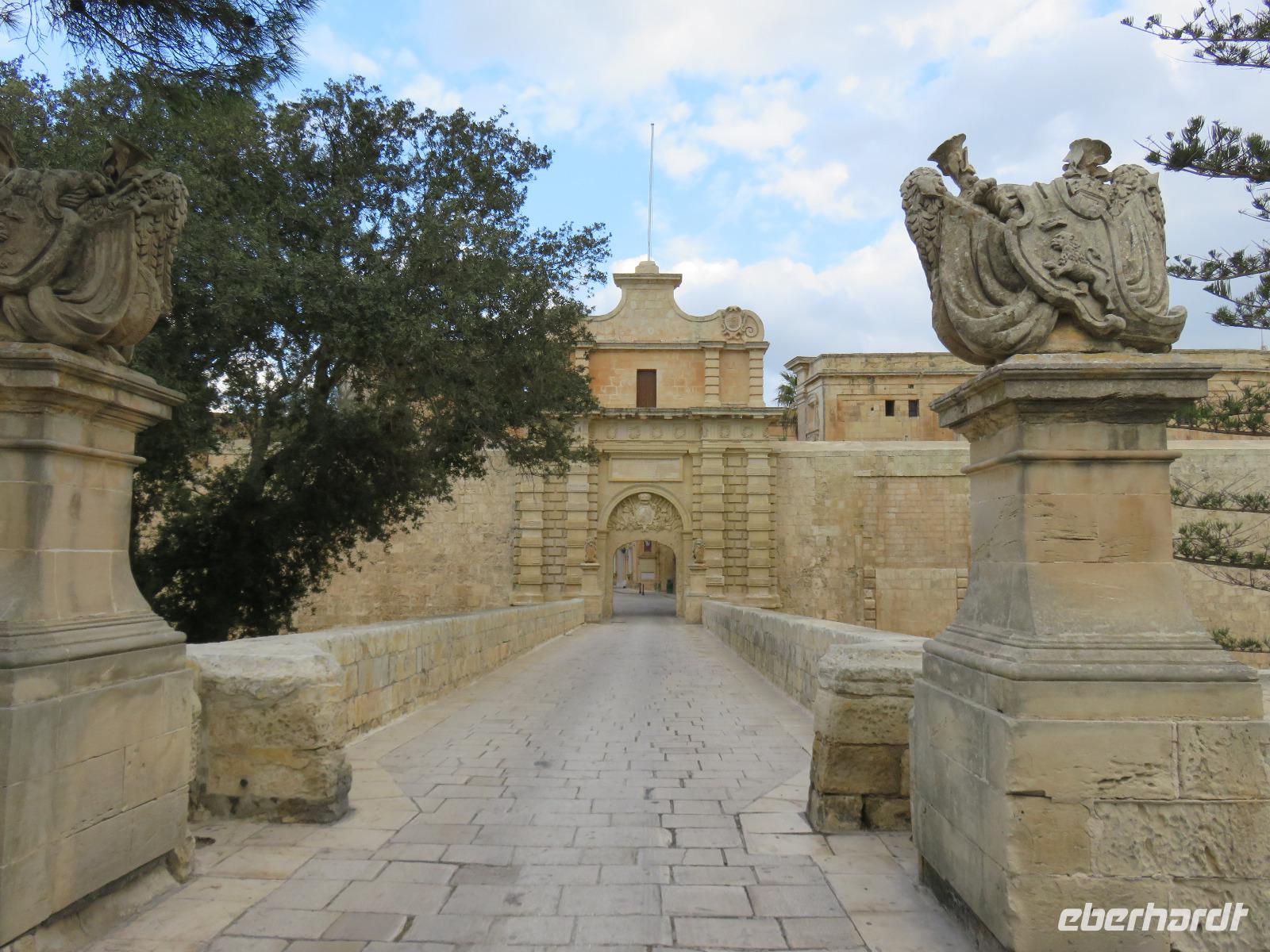 Packen wir halt auch den Regenschirm ein, besser ist besser. Gerlinde, unsere örtliche Reiseleiterin, lächelte uns entgegen. Sie lebt seit mehr als 35 Jahren auf Malta, sie fand hier ihr Lebensglück. Sie ist begeistert von der Insel und schwärmt von dem besonderen Licht. Nach kurzer Fahrt erreichten wir die alte Inselhauptstadt Mdina. Durch das gewaltige Main Gate, das Haupttor, das Großmeister Manuel de Vilhena 1724 erbauen ließ, betraten wir die mittelalterliche Stadt. Fast schien es, als sei die Zeit stehen geblieben. Wir blickten in den Howard Garden im Festungsgraben, bestaunten die Orangen-, Oliven-, Johannisbrot- und Granatapfelbäume, lauschten den Erläuterungen von Gerlinde und schlenderten anschließend durch die engen Gassen, vorbei an herrschaftlichen Palästen zur St. Peter und Paul-Kathedrale am St. Pauls-Platz. Dieses Meisterwerk von Lorenzo Gafà, Ende des 17. Jahrhunderts erbaut, zeigte sich in der prächtigen Vormittagssonne. An der imposanten Doppelturmfassade sahen wir das Wappen des Großmeisters Perellos y Roccaful, die rechte Turmuhr und am linken Turm, die Datumsuhr, die leider im Moment in Reparatur ist. Unser Weg führte uns nun durch kleine Gassen zur Festungsmauer. Da sich Mdina auf den Ausläufern des Dingli-Plateaus befindet und in einer Höhe von 185 Metern liegt, eröffnete sich uns ein äußerst imposanter Ausblick auf Valletta und seine Vororte. Man denkt, eine riesige Metropole vor sich zu haben. Bei einer Bevölkerungsdichte von 1.300 Menschen pro Quadratmeter in ganz Malta liegt dies nahe. Nach einem kurzen Spaziergang auf der wehrhaften Stadtmauer und später vorbei an weiteren prunkvollen Palästen verließen wir durch ein kleines Stadttor Mdina. Leider blieb keine Zeit für einen Museumsbesuch oder einen individuellen Bummel. Gern wären wir geblieben ... für ein Mehr in Malet oder Melita, wie die Phönizier und die Römer die Stadt nannten, sollten, müssen wir wieder kommen!