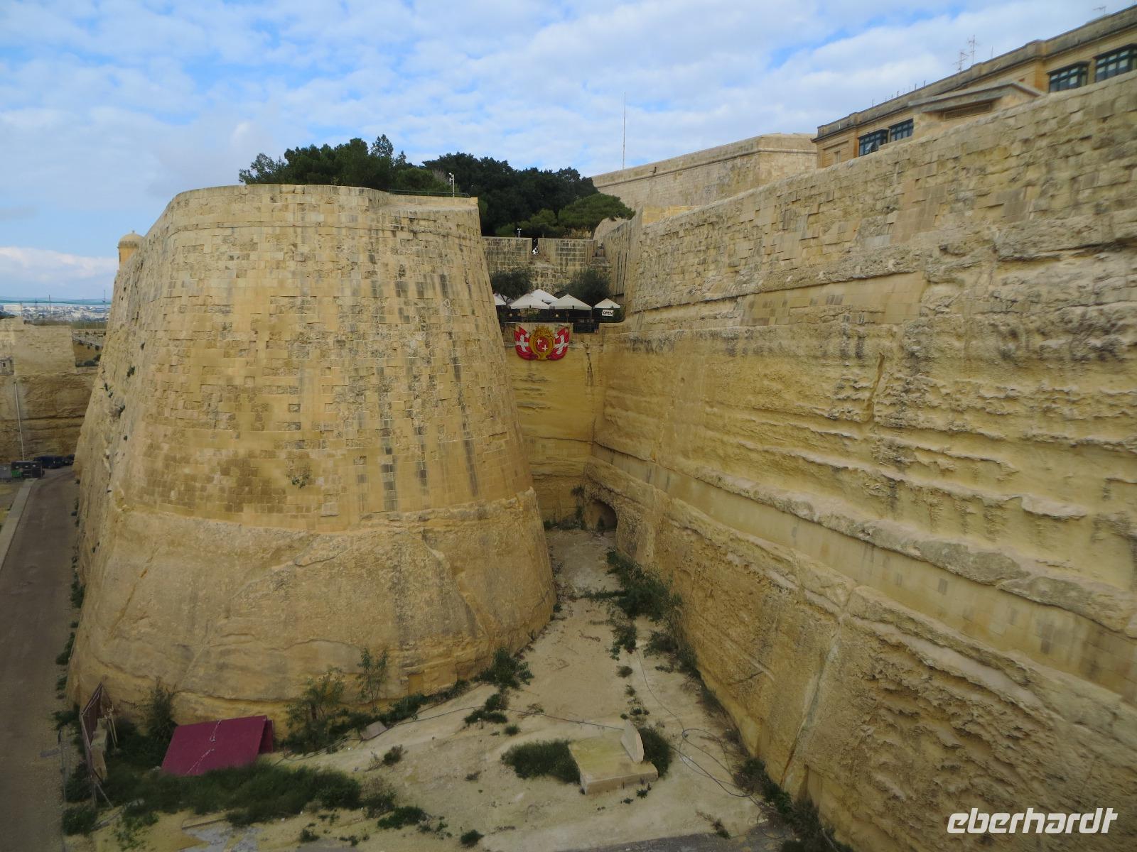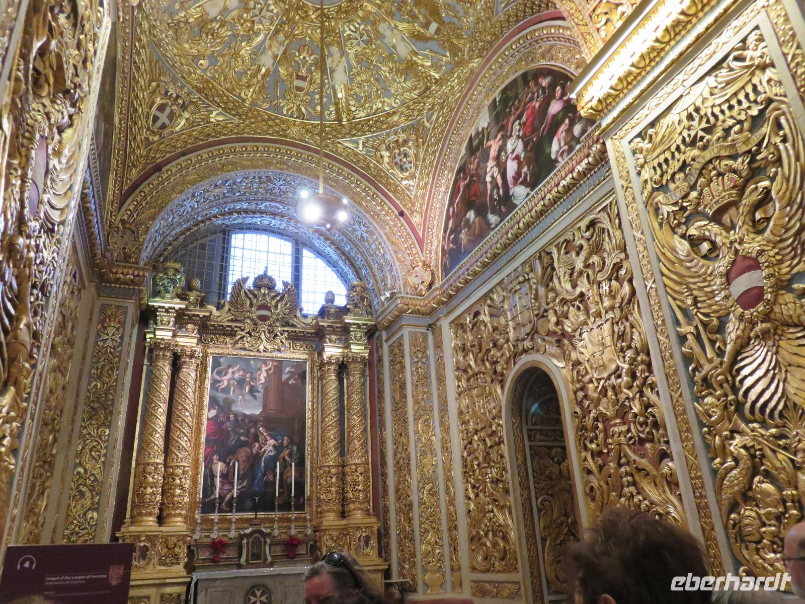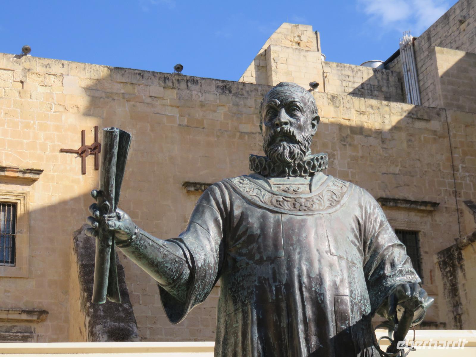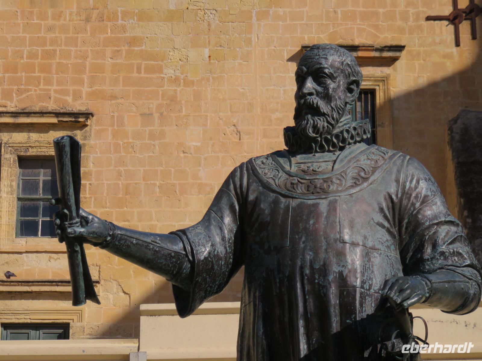 Unser nächstes Ziel ist die heutige Inselhauptstadt Valletta. Zunächst fuhren wir vorbei am Fußballstadion durch eine kleine Ebene in die Vororte und schließlich nach Floriana. An diesem Eingangstor zur Stadt der Ordensritter legten wir eine Pause der Harmonie ein. Nun stand unserem Erlebnis Valletta bei schönstem Wetter nichts mehr im Weg. Durch das City-Tor betraten wir die Stadt, die in nur fünf Jahren (!) errichtet wurde und auch heute durch gewaltige Mauern geschützt, einen äußerst wehrhaften Charakter besitzt. Schnell ein Blick in den gewaltigen Festungsgraben. Unsere Schritte lenkten wir zuerst zum neuen Parlamentsgebäude Maltas mit der wundervollen Fassade aus gelben Muschelkalk und zu den Ruinen des Royal Opera House, völlig ausgebombt 1942. Gerlinde führte uns mit eiligen Schritten über die Republic-Street zur St. Johns Co-Kathedrale. Mit dieser fast schlichten Fassade könnte man einen Palast vermuten, aber keine Kirche dieser Bedeutung. Wie heißt es doch: Auf Malta offenbart sich das Reizvolle erst auf den zweiten Blick. Der französisches Großmeister Jean l'Evêque de la Cassière hatte diesen Sakralbau den Johannitern gestiftet. Geweiht wurde sie dem Schutzpatron des Ordens, Johannes dem Täufer. Nach dem Betreten des Inneren stockte uns der Atem, unsere Augen mussten sich erst an die prunkvolle und äußerst üppige Ausstattung gewöhnen. Die Großmeister und die einzelnen Landsmannschaften haben die Ordenskirche mit kostbaren Kunstwerken ausgestattet. Gerlinde berichtete, dass ca. 4.000 Quadratmeter Blattgold verarbeitet wurden. Auch die 375 mit Marmorintarsien versehenen Grabplatten der Ritter des Johanniter- und des Malteserordens sind einmalig. Wir besichtigten die Sakristei und die Kapelle von Deutschland, flanierten an vielen weiteren Gästen vorbei durch das Kirchenschiff zum Chorraum mit dem prächtigen Hochaltar und der weißen Marmorgruppe der Taufe Christi. Abschließender Höhepunkt war der Besuch des Oratoriums der Kathedrale mit zwei Gemälden von Caravaggio: Hl. Hieronymus und Die Enthauptung Johannes des Täufers, sein Hauptwerk auf Malta. Caravaggio, sein bürgerlicher Name: Michelangelo da Merisi, war in Italien ein gefragter Altarmaler, aber auch oft mit dem Gesetz in Konflikt gekommen und auf die Insel Malta geflüchtet. Er beherrschte die Kunst des Licht- und Dunkelmalens im besonderen Maß. Schnell bekam er Aufträge der Ordensritter. So wurde er für ein Porträt des Großmeisters Alof de Wignacourt berühmt und wurde selbst zum Ritter geschlagen. Leider überwarf er sich mit den Rittern, kam erneut mit dem Gesetzt in Konflikt und floh schließlich auch von Malta. Mit nur 38 Jahren starb der Künstler in Italien.